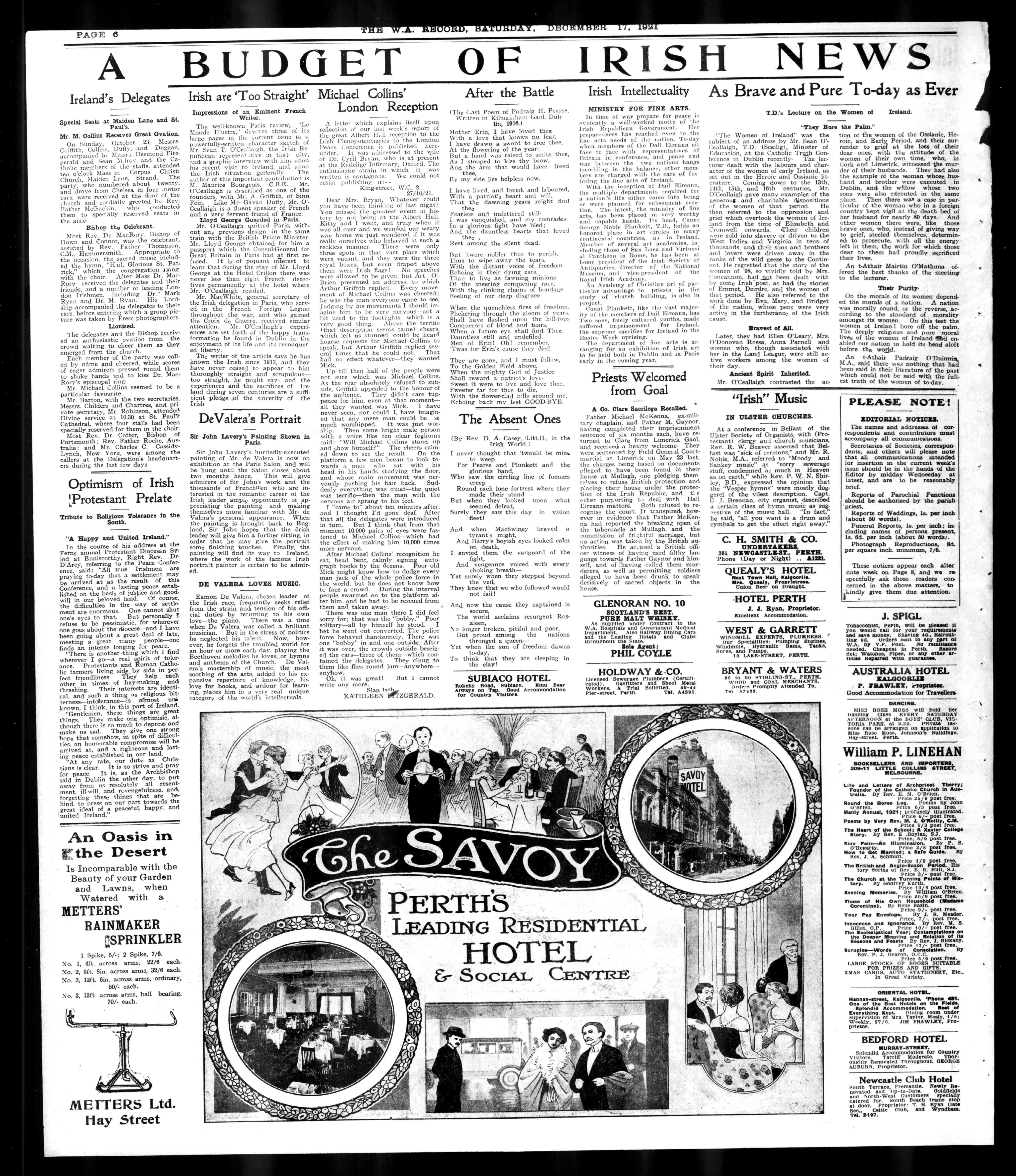 openof thetabernacleatMullagh,andthe commissionoffriOnfulsacrilege,but noactionwastakenbytheBritishauthorities.Heac,usedaBritishofficerwitnessofhavingusedfilthylanguagetowardsFatherGaynorandhimself,andof:havingcalledthemmurderers,aswellaspermittingsoldiers allegedtohavebeendrunktospeak derisivelyofsacredobjectsinthe house. GLENORANNO.10 SCOTLAND'SBEST. PUREMALTWHISKY. AssuppliedunderContracttothe W.A.HospitalsandGovernmentMedical Department.AlsoRailwayDiningCarsandtheLeadinghotelsandClubs throughoutthestate. SoleAgent: PHILCOYLE HOLDWAY&-CO. LicensedSeweragePlumbers(Certifi-cated).GasfIttersandSheetMetal Workers.ATrialSolicited.40-44 Pier-street-Perth. Tel.A4895 PERTH'S T;FADINGRESIDENTIAL HOTEL SOCYALCEw-ra_E PLEASENOTE! EDITORIALNOTICES. Thenamesandaddressesofcorrespondentsandcontributorsmust accompanyallcommunications. SecretariesofSocieties,correspon- dents,andotherswillpleasenote thatallcommunicationsintended forinsertioninthecurrentweek's issueshouldbeinthehandsofthe EditorbymiddayWednesdayat latest,andaretobereasonably brief. ReportsofParochialFunctions shouldbeautlionsedbytheparish priest. ReportsofWeddings,Is.perinch (about50words). FuneralReports,Is.perinch;in. eludingnamesofpersonspresent, Is.6d.perinch(about50words). PhotographReproduc.ions,8d. persquareinch.minimum,7/6. Thesenoticesappeareachalter nateweekonPage8,andwere spectfullyaskthosereaderscon. cernedintheabovematters,to 'kindlygivethemdueattention. J.SPIGL Tobacconist,Perth,willbepleasedIt youwouldcallforyourrequirementsandsavemoney.isneving40.,Haircuttingini. orderssmuttoanypartof W.A.eyV.P.Post. Noremittance needed.CheapestinPerth.Razors Set;Watelies,Pipes,oranyotherarticlesRepairedwithguarautee. AUSTRALIAHOTEL HALGOORLIB P.IBAWLEY,eroprletee. GoodAccommodationforTravellers DANCING. MISSROSEMOSSwillSaidher DancingClassEVERYSATURDAY Al."IERNOONattheBOYS'CLUB,VICTORIAPARK.at9.3U.Privatelessonscanbearrangedonapplicationto MissRoseMoss,Jonneon'sBuildings. Hay-street.Perth. WilliamP.LINEHAN BOOKSELLERSANDIMPORTERS, 309-11LITTLECOLLINSSTREET, MELBOURNE. LifeandLettersofArchpriestTherry; FounderoftheCatholicChurchinAustralia.ByRev.E.M.O'Brien. Price21/9postfree. RoundtheBoresLog. PoemsbyJohn Brien. Price6/3postfree. ManlyAnnual,1921;profuselyillustrated. Price4/-postfree. PoemsbyVeryRey.M.J.erstedie,C.M. Price6/3postfree. TheHeartoftheSchool;AXavierCollege Story.ByRev.E.Boylan,S.J.Price,6/9postfree. SinnFein--AnIllumination. ByP.S. O'llegartY. Price3/8postfree. HowtoGetMarried;aSafeGuide.By W.V.J.A.salmon. Price1/9postfree. TheBritishandAnglo-SaxonPeriod.His toryseriesorIle,E.R.Hull,Si. Price3/-postfree. TheChurchattheTurningPointeofHistory. ByGodfreyturtle. Price10/6postfree. EveningMemories.liyWilliamO'Brien. Price20/9postfree. ThoseofHisOwnHousehold(Madame Corentine).BYloneBaztn Price9/-postfree. YourPayEnvelope, ByJ.R.Meader. Price,7/-.postfree. InnocenceandIgnorenem.ByRev.M.S. 3.;,G.P. Price10/-postfree. TheEcclesiasticalYear;Contemplationson theDeeperMeaningandRelationofIts SeasonsandFeastsByRev.J.Rickaby.Price17/-posttree.Scruples-WordsofConsolation. By Rev.P.J.Gearon,O.C.C. Price5/9postfree. LARGESTOCKSOFBOOKSSUITABLE FORPRIZESANDGIFTS. XMASCARDS,AUTOSTATIONERY,Etc.. InGreatvariety. ORIENTALHOTEL. Hannan-street,Kalgoorlie.'Phone41111. OneoftheBestHotelsontheFields. SplendidAccommodation.Meetof EverythingKept. iiiiiingroomunder super,PlonofMrs.Irwin,Meals.1/6; .11MFRAWLEY,Proprietor. BEDFORDHOTEL auRRAY-STREET. Visitors.SplendidAccommodationforCountry Terrill'Moderate.ThoroughlyRenovatedThroughout.GEORGE AUBURN,Proprietor. NewcastleClubHotel SouthTerrace,Fremantle.NewlyRenovatedandUp-to-Date. 09nineld. andNorth-WestCustomersspecially cateredfor.SouthBeachtramsstop atdoor.Proprietor.T.H.Ryan(late Sec.,nettleClub,andWyndham. Tel.5197.