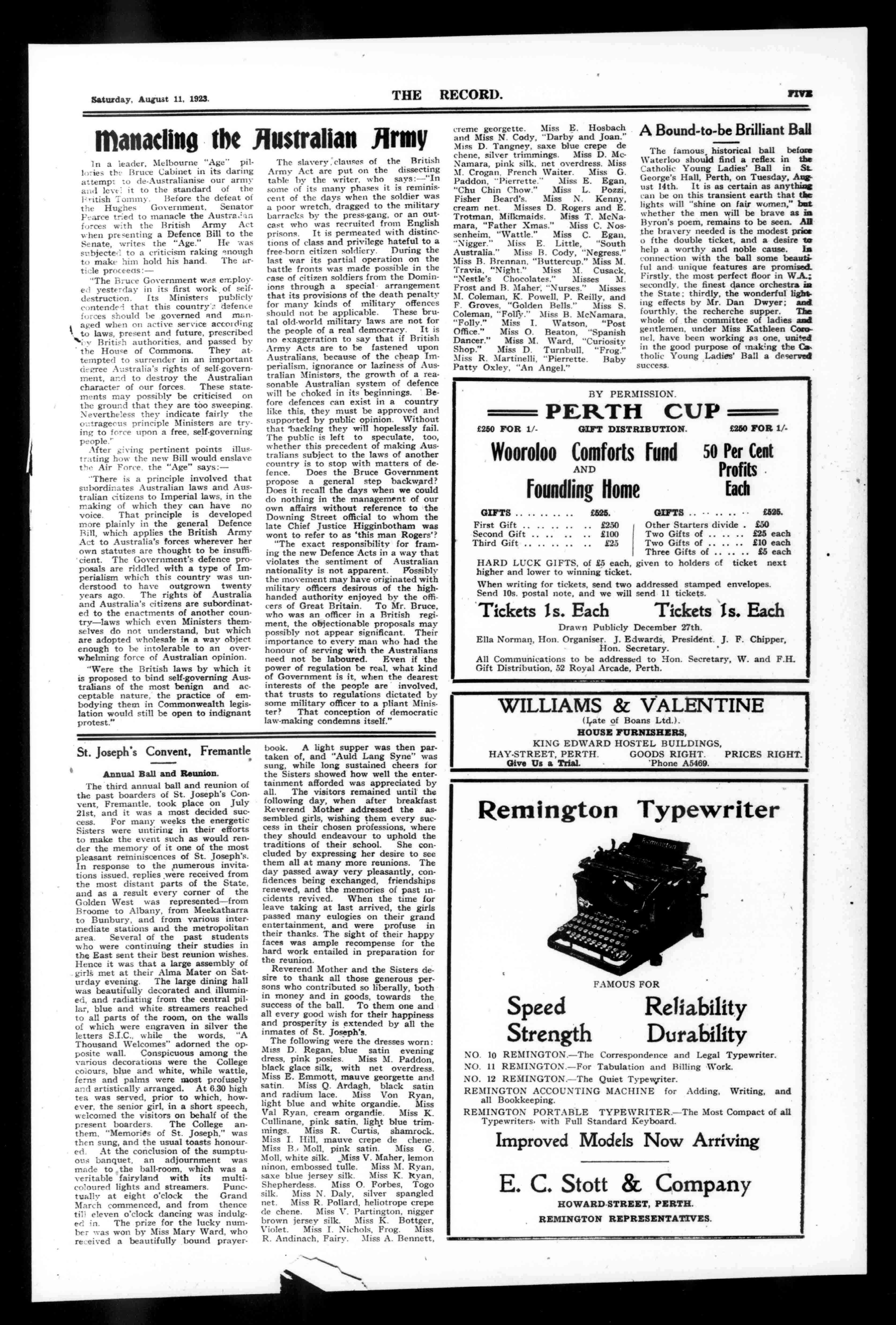IrishHornRosariesMotherofPearl.Weprocureandpostout.Literature,AveMaria,SacredHeartMessenger,AnnalsofOurLady, St. Joseph'sGarland,CatholicPress.The"Record,"Advocate,DublinFreeman. Wesupplyiinglish,AmericanandIrishLiterature. JOHNDYNON&CO. TheChinaHall, 915-917HayStreetPerth CHINA,GLASSWARE,ANDFANCYGOODS.EXCLUSIVEDESIGNSSUITABLEFORWEDDINGPRESENTS,ETC.,ATLOWESTPRICES.