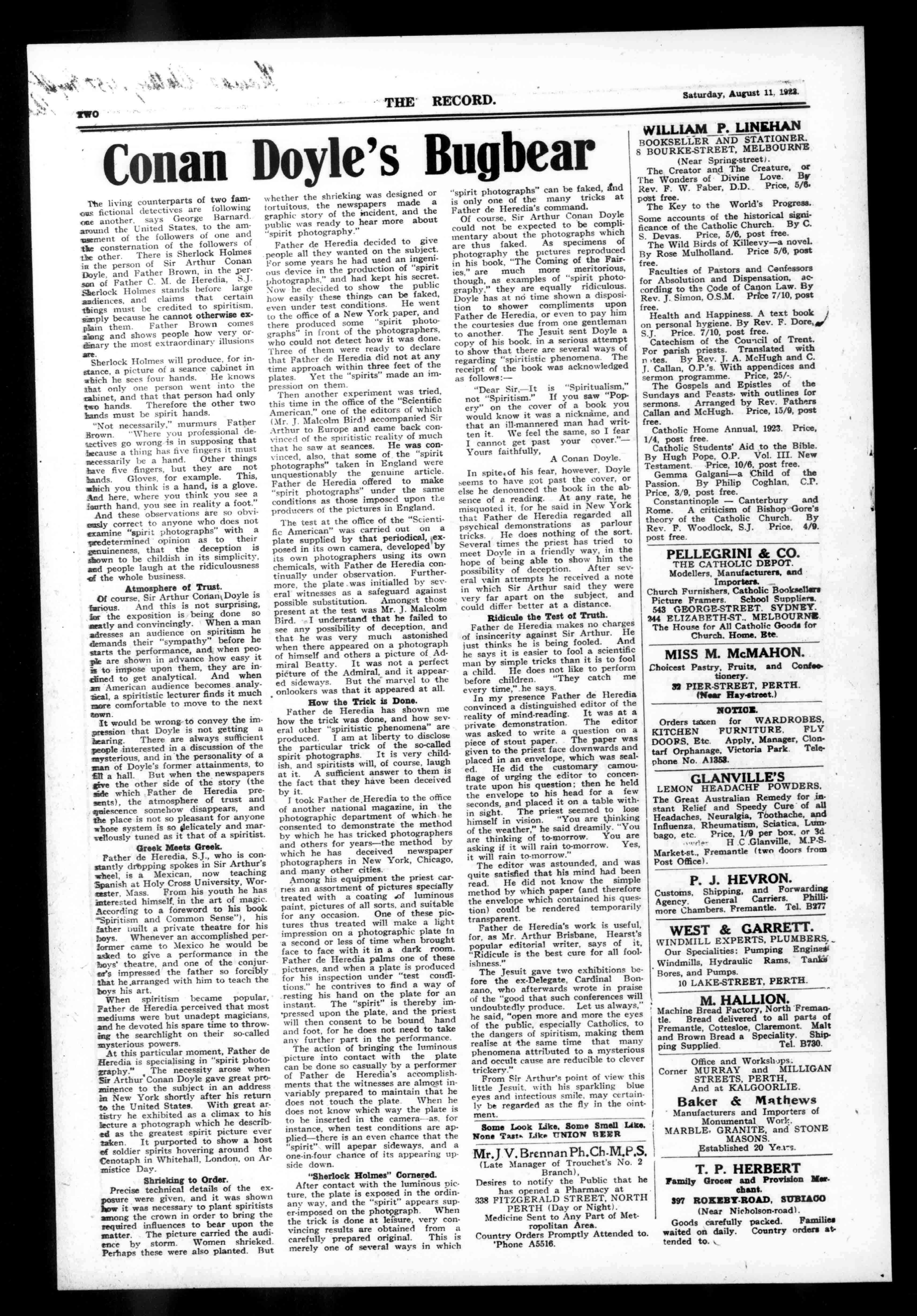 Ofcourse,SirArthurConantDoyleis tenons.Andthisisnotsurprising, fartheexpositionisbeingdoneso neatlyandconvincingly.Whenaman *dressesanaudienceonspiritismhe demandstheir"sympathy"beforehe startstheperformance,andwhenpeopleareshowninadvancehoweasyit istoimposeuponthem,theyareinclinedtogetanalytical.Andwhen anAmericanaudiencebecomesanalytical,aspiritisticlecturerfindsitmuch morecomfortabletomovetothenext sown. Itwouldbewrong-toconveytheimpressionthatDoyleisnotgettinga hearing.Therearealwayssufficient peopleinterestedinadiscussionofthe mysterious,andinthepersonalityofa manofDoyle'sformerattainments,to fillahall.Butwhenthenewspapers givetheothersideofthestory(the sidewhichFatherdeHerediaprescuts),theatmosphereoftrustand quiescencesomehowdisappears,and theplaceisnotsopleasantforanyone whosesystemissodelicatelyandmarvellouslytunedasitthatofaspiritist.