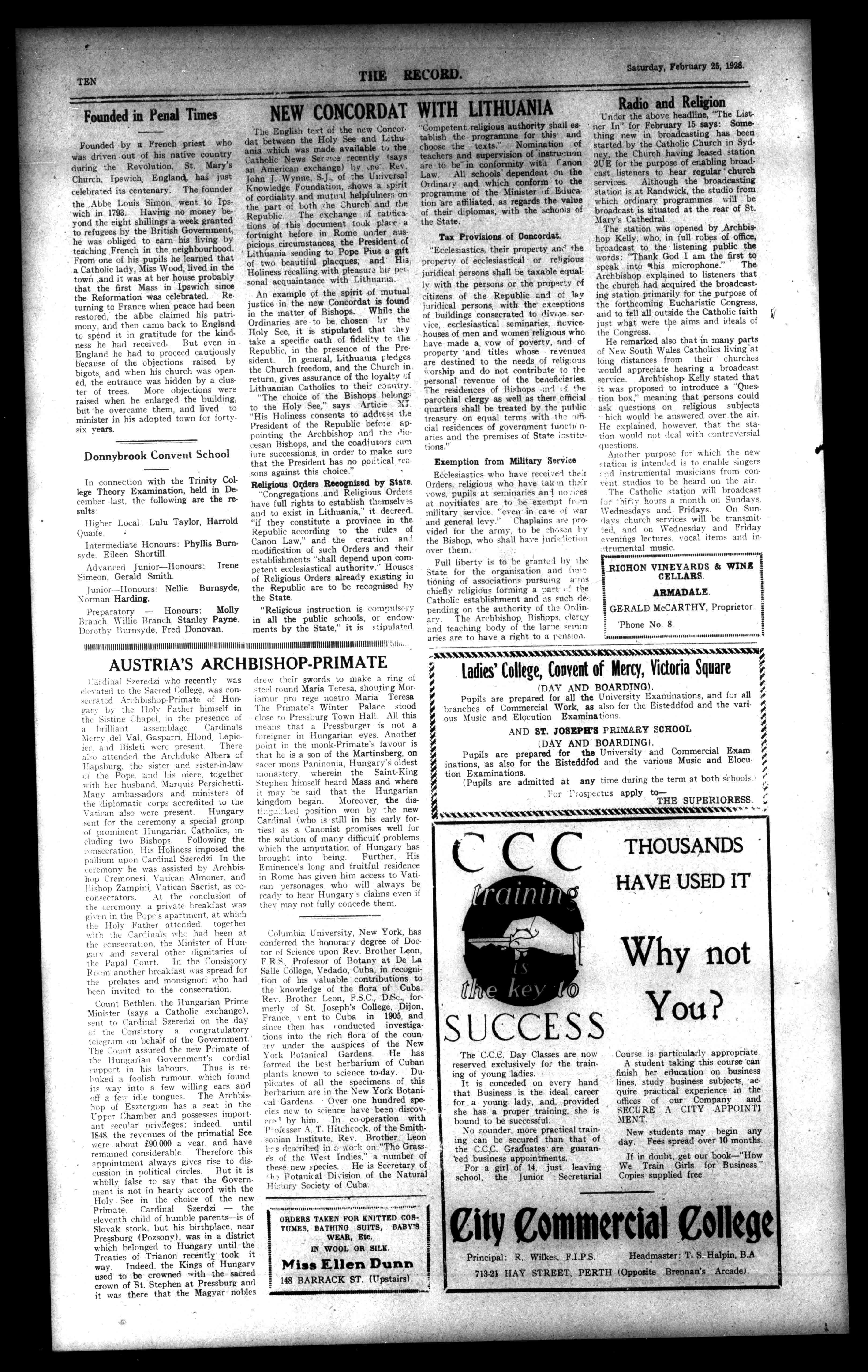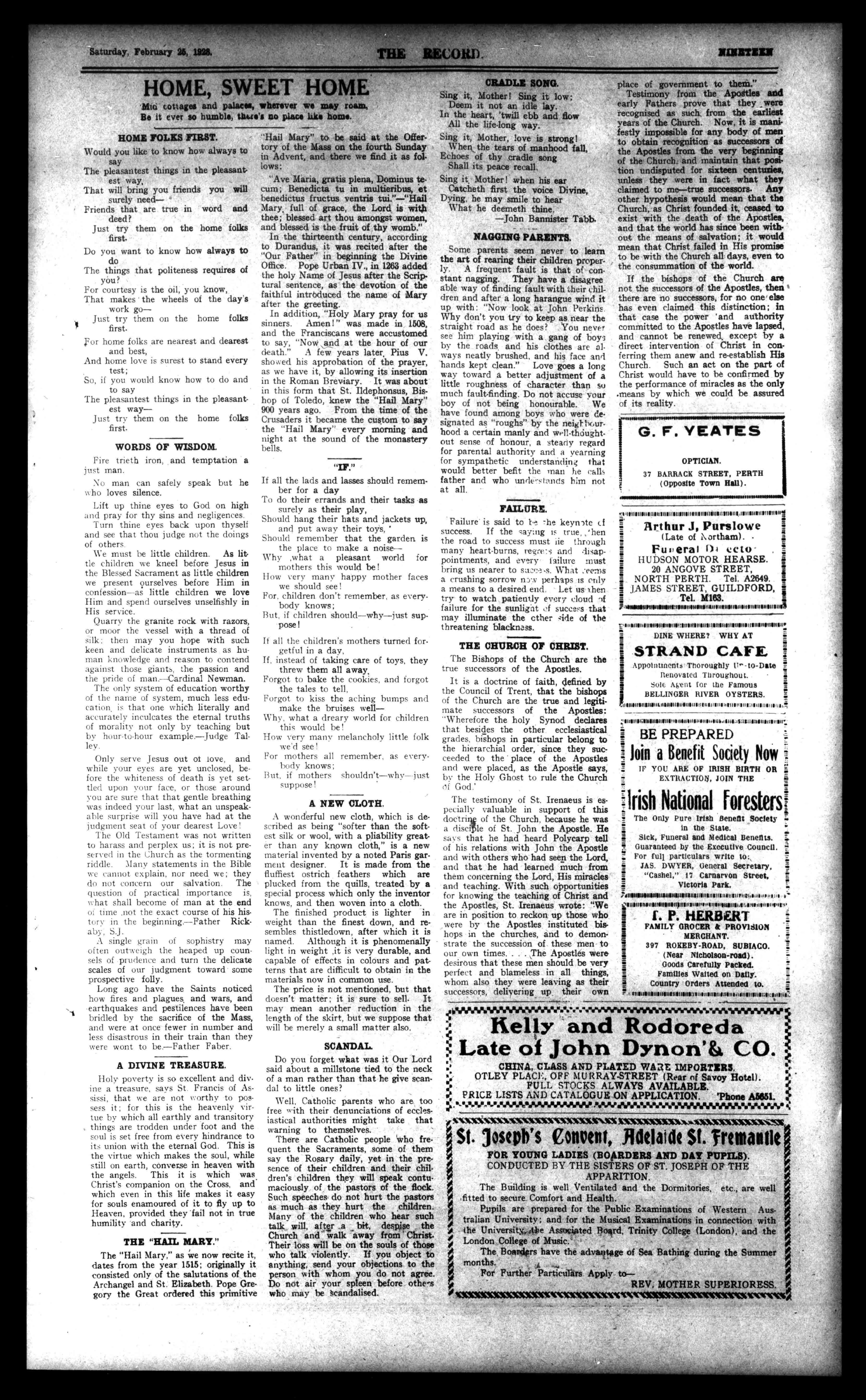 EXTRACTION,JOINTHE ilrishNationalforesterst TheOnlyPureIrishBenefitSociety a intheState. Sick,FuneralandMedicalBenefits. GuaranteedbytheExecutiveCouncil. Forfullparticularswriteto: JAS.DWYER,GeneralSecretary, "Cashel,"17CarnarvonStreet, VictoriaPark. 5.4IINUOMINIUSfing111111HVIllifill1.11.1117,...,.I gr.. V111014.01,1,11H1111111114.1.111,01fle.,,t,,,,,,,,,,,#. I.P.HERBERT it FAMILYGROCERdtPROVISION MERCHANT. ti 397ROKEBY-ROAD,SUBIACO. NearNicholson-road). GoodsCarefullyPacked. FamiliesWaitedonDaily. 5 CountryOrdersAttendedto. umariammaranisasairunimiamienc,,,,,,auigus,41,1:ii..7. iiMPAIMANSWAVW."."...WWWYWAVIIMANNW MellyandRodoreda LateofJohnDynon'&CO. CHINA,CLASSANDPLATEDWARE M ORTERS. OTLEYPLAC1:,OFFMURRAY-STREET((RearofSavoyHotel). PRICELISTSFl STOCKSALWAYS.AVAILABLE sr; ttNj'ilSLCATALOGU1$ONAPPLICATION.'PhoneA5651. 100000610010100:14.10MCMCWILWMMOVIMICWIZok.).14WIMCNIIMXiC St.]osepb'sConvent,AdelaideSt.Fremantlei FORYOUNGLADIES(BOARDERSANDDAYPUPILS). CONDUCTEDBYTHESISTERSOFST.JOSEPHOFTHE APPARITION. iR TheBuildingiswellVentilatedandtheDormitories,etc.,arewell fittedtosecureComfortandHealth. PupilsarepreparedforthePublicExaminationsofWesternAustralianUniversity;andfortheMusicalExaminationsinconnectionwith theUniversity,,theAssociatedBoard,TrinityCollege(London),andthe LondonCollegeofMusic.' TheBoeixiershavetheadvantageofSeaBathingduringtheSummer months. 5 ForFurtherParticularsApplytoREV.MOTHERSUPERIORESS. %WeIMCWOCSICICIVOCIMICWOMMACCIMICPCIMANIC4