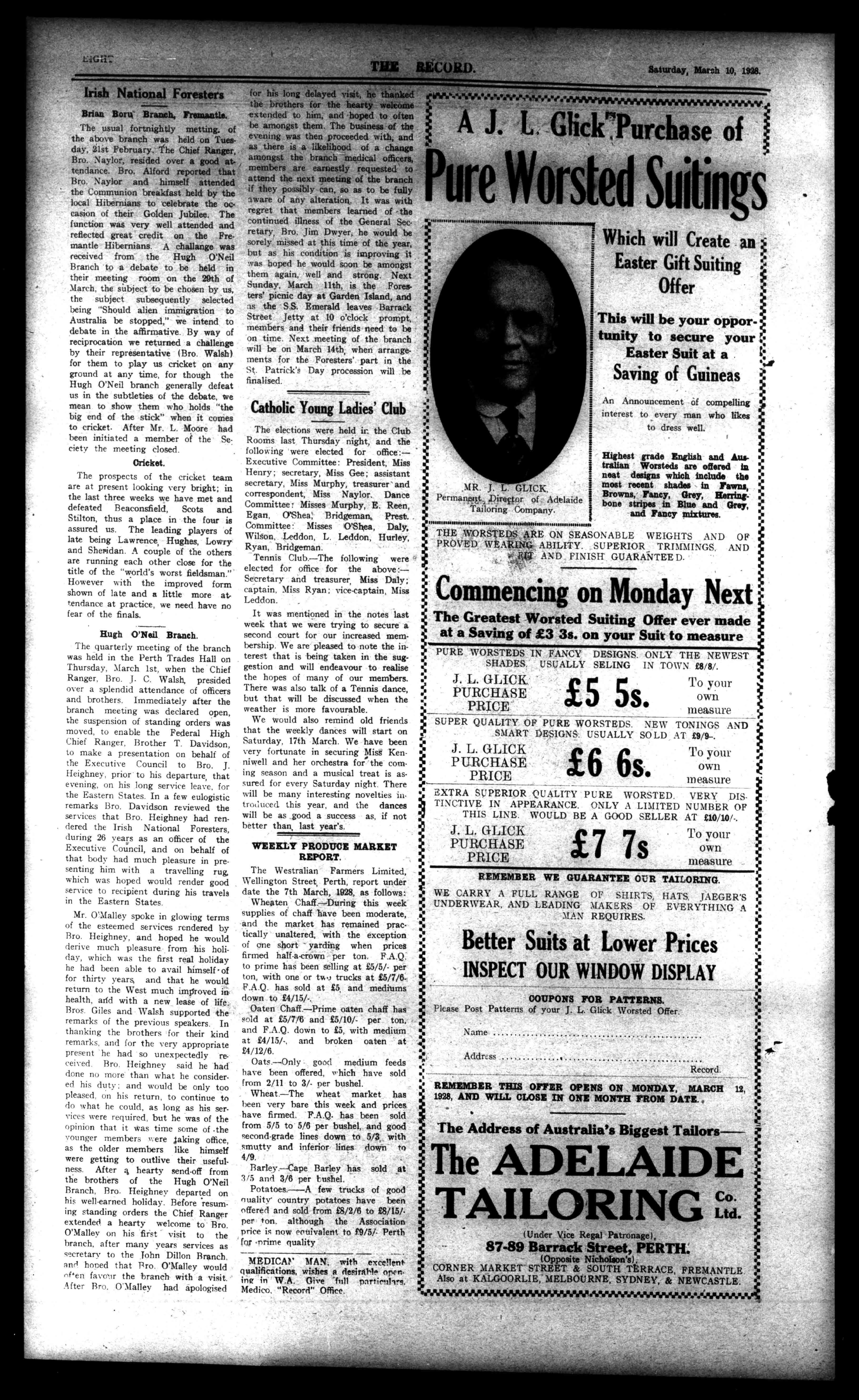 ATTAGITY$001 itEcuRD. Saturday,March10,1928. NewHospitalofSt.JohnofGod SUBLACO.SPLENDIDUP-TO-DATEACCOMMODATION. ChasetoSubiacoandLeedervilleRailwayStatism* PatientsMaySelectTheirOwnMedicalAdvisers. TERMSMODERATE. PRIVATEROOMSAVAILABLE.OPENTOALLDENOMINATIONS.ForTermsApplytoRev.Mother. TheSistersslagConductaS 'talat rlie. OurLadyofMercy'sCollege,VictoriaPark CONDUCTEDBYTHESISTERSOFMERCY. LocationUnsurpassedforConvenience,.Healthfulness,andBeauty. BoardingandDaySchoolforYoungLadiessadLittleOirk. ForParticularsApplytotheMotherAllPerior. TheColonialMutualFireInsurance COMPANYLIMITED FIRE,MARINE,ACCIDENT,WORKERS'COMPENSATION, EMPLOYERS'LIABILITY. HAYSTACKS,GROWINGCROPS,ANDLIVESTOCK ASPECIALTY. E.MIDWOOD,Manager.BARRACKSTREET.PERTH. ApplicationsinvitedforAgencnesinrepresented.Districtswhetsnotalready DEMAND `PENGUIN' STOUT BoxallandLynchDentists NewPremises MOANAMAIMS HayStreet,nearBarrackStreet Mr.W.BoxallCanbeConsultedPersonally WoodSonsNewTea IsDistinctiveinQuality.OrderTo-day BLENDEDANDP,!yrATINOURWAREHOUSE,FREMANTLE. BUYINGLARGELY FROMTHEWORLD'SFINESTSOURCESOFSUPPLY. SELLINGDIRECT THROUGHTHREEBIGSTORES. CharlieCarterLtd, CANANDDOESSELLTHEFINESTGROCERIESATTHE LOWESTRATESINWESTERNAUSTRALIA. NOMATTERWHEREYOUL'VE,JUSTSENDYOURORDER,AND ITWILLRECEIVEPROMPTANDCOURTEOUSATTENTION. THREEBIGSTORES 556HAYST,and111BARRACKST.,PERTH 41MARKETST.,FREIVIANTLE DENTISTMASSEYCROSSE FORBETTERDENTISTRY SUWilliamStreet(overC.andH.Locke'sandnearQueen'sHall) ChristianBrothers'College,Perth ABOARDINGANDDAYSCHOOL. BOYSAREADMITTEDATANYTIMEDURING THETERM. COMMERCIALWORKASPECIALTY. ForParticularsapplytoTHEPRINCIPAL. St.Ildephonsus'College NEWNORauk. CONDUCTEDBYTHEMARISTBROTHERS. FORTERMSAND.FULLPARTICULARS,APPLYTO THEBROTHERDIRECTOR. Mciadyen&Coy.(LATEOFMURRAY-STREET) nowoppositeG.P.Q.13firstfloor PADBURYBUILDINGS. 'PhoneMitt. TAILORS Printedandpublishedfortheproprietor,byThomasSlattery,atthe"Record"Office,450Hay-street,Perth,WesternAustralia.