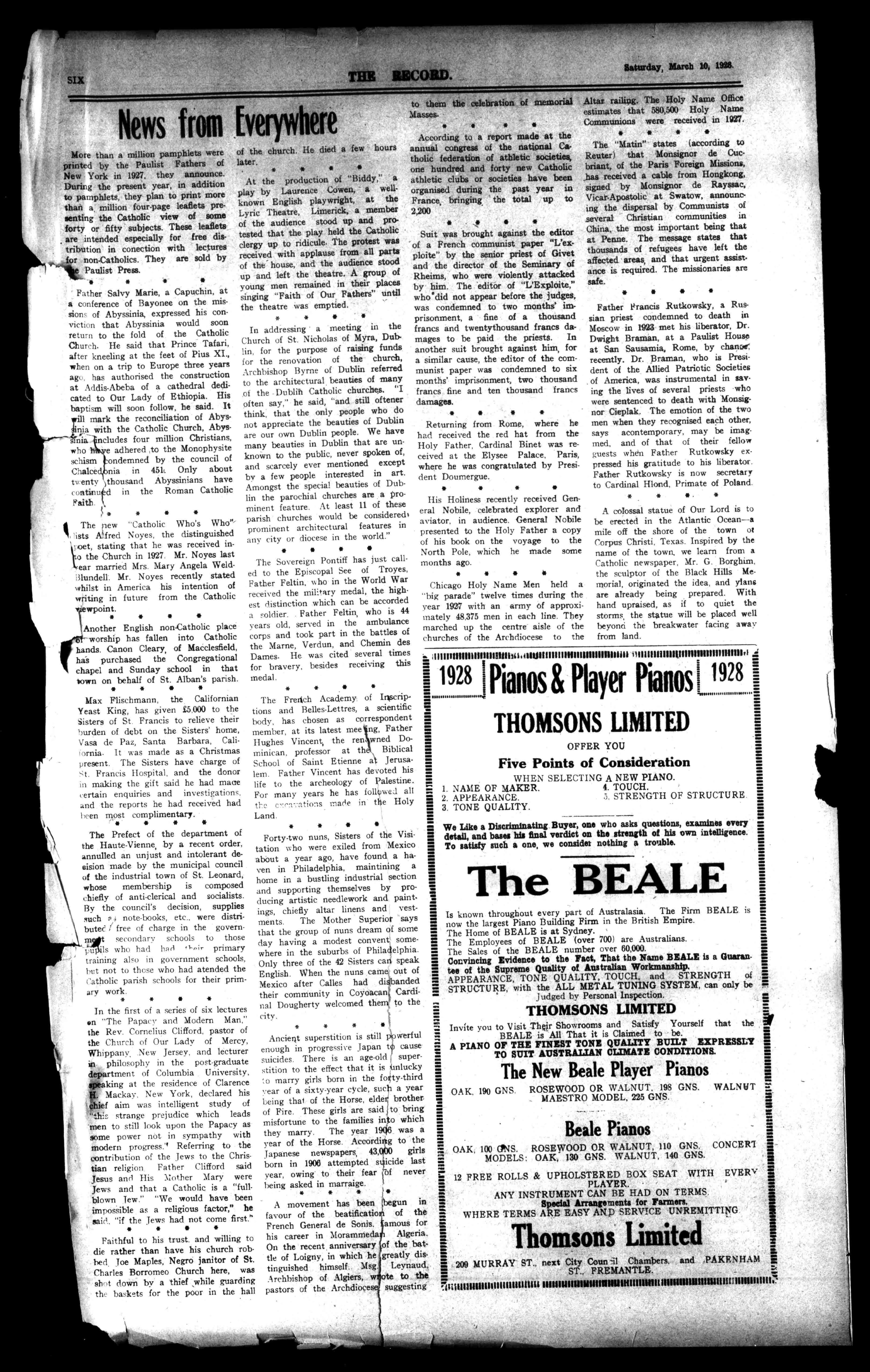 Le If5-e-ANT/t11--`11111111111111111.111111111101UMM1HRifilli rAPWPWWWW.M.WW%%W.P.WWWdYMMANV ,..,..A NyVVANYWARAWWW.WWWWVAIWW.M.W.W.P.WrP ..,... ..1 ii.E e ON PUBLISHEDWEEKLY. ADDRESS:BOXJUL,G.P.O. 'PHONEA6447 ACATHOLICWEEKLYCIRCULATINGTHROUGHOUTTHESTATEOFWESTERNAUSTRALIA. PRICETHREEPENCE. RegisteredattheG.P.O.,Perth,forTransmissionbyPostasaNewspaper. ESTABLISHED1874. No.2,501 NONNIN. PERTH,SATURDAY,MARCH10,1928 fieAustralasianCatholicAssurance COMPANYLIMITED. HJADOFFICE:OCEANHOUSE,34MARTINPLACE,SYDNEY. RegisteredundertheCompanies'Act,18w,ofNewSouthWales. BRANCHOFFICES:-VICTORIA:475Collins-street,Melbourne, SOUTHAUSTRALIA:29KingWilliam-street,Adelaide. HEADOFFICEFORWESTERNAUSTRALIA: WARWICKHOUSE,ST.GEORGE'STERRACE,PERTH. DistrictOffices:Newcastle,BallaratandGeelong.StateAfforacilm. 'ADULTLIFEANDENDOWMENTASSURANCESOFALL CLASSESEFFECTED. 0 SPECIALENDOWMENTASSURANCEFORCHILDREN. 'PhoneA6489. T.J.,McGRATH,ResidentSecretary. l000klooh.A. TENNISRACQUETS ASPECIALTY. G`eir:i:,tellGemmel'&McDougallMcDougall SPORTSSPECIALTYHOUSE gelWU..IBM-STREET(NealQueen'sBali TENNISREPAIRS! ThisDepartmentisinchargeogourEnglishExpert,andSaussactionisGuaranteed. 'PhoneA6501) 18 '%NAANN% DoYouKnow ALBERT&SONLTD. =.7 W.A.UniversityBooksellers 5'5 StockallTextBooksforStandardsSevenandupwards,fritJuniorandLeavingCertificateExaminations.Teachers' TextBooksandallsubjectsatTechnicalSchoolsandthe Universitiy. Sendtousfirstforanybookyourequire,andsavetime anddisappointment. IfyouhavenotseenourhugestockofBooks,Music, MusicalInstruments,NlagazinzsandPeriodicals,youare invitedtocallandmakeahabitof"droppingin"tosee whatisnew. FORALLBOOKSSENDTO ALBERT&SONLIMITED ByAppointmentBooksellerstoW.A.University 180MURRAYSTREET,PERTH,W.A. 'PhoneA-2899 GP.O.Box75 4xxxxxx...,vorcicwomoivoclomstvoc.wo.-vwcwmicionow.wc