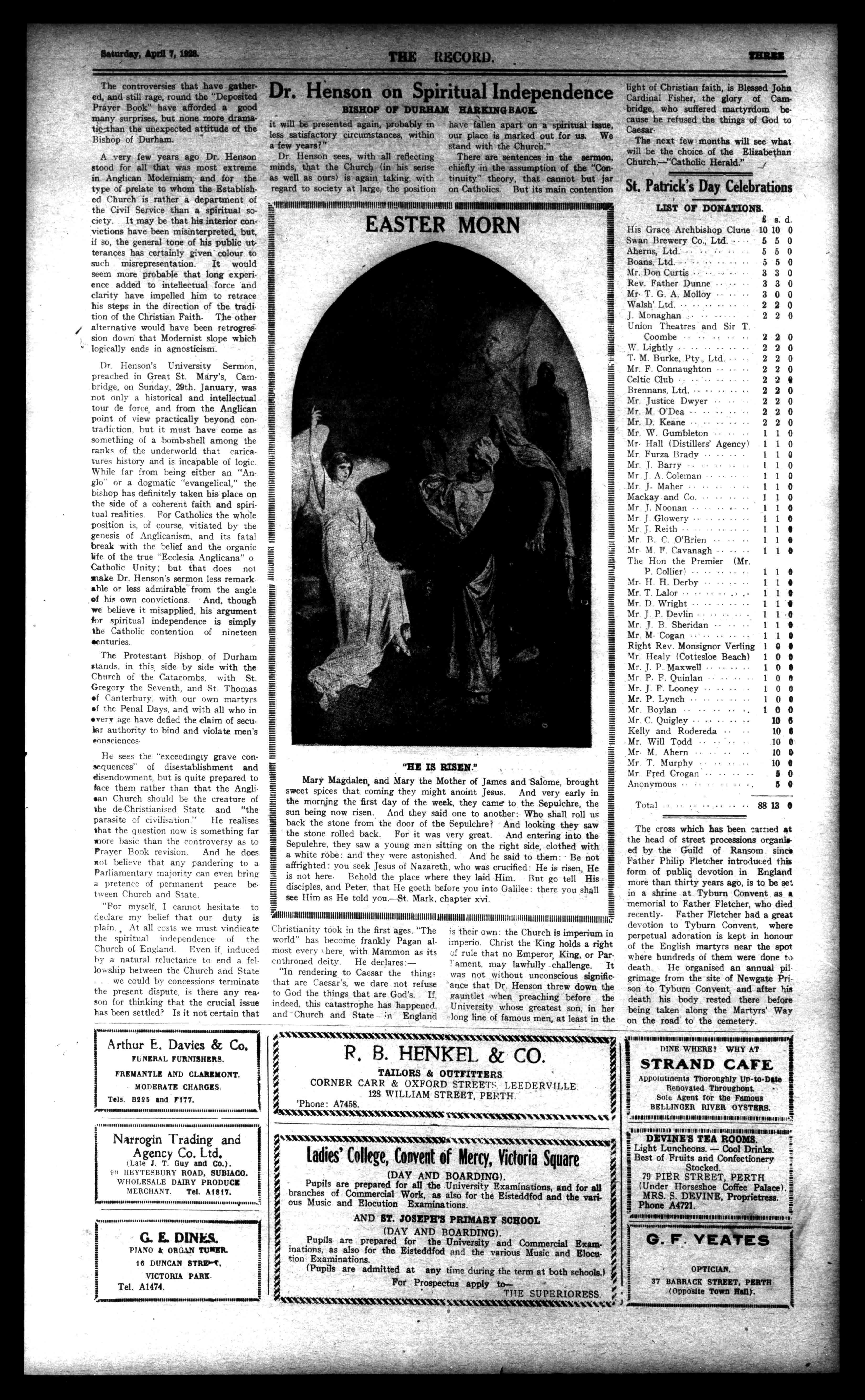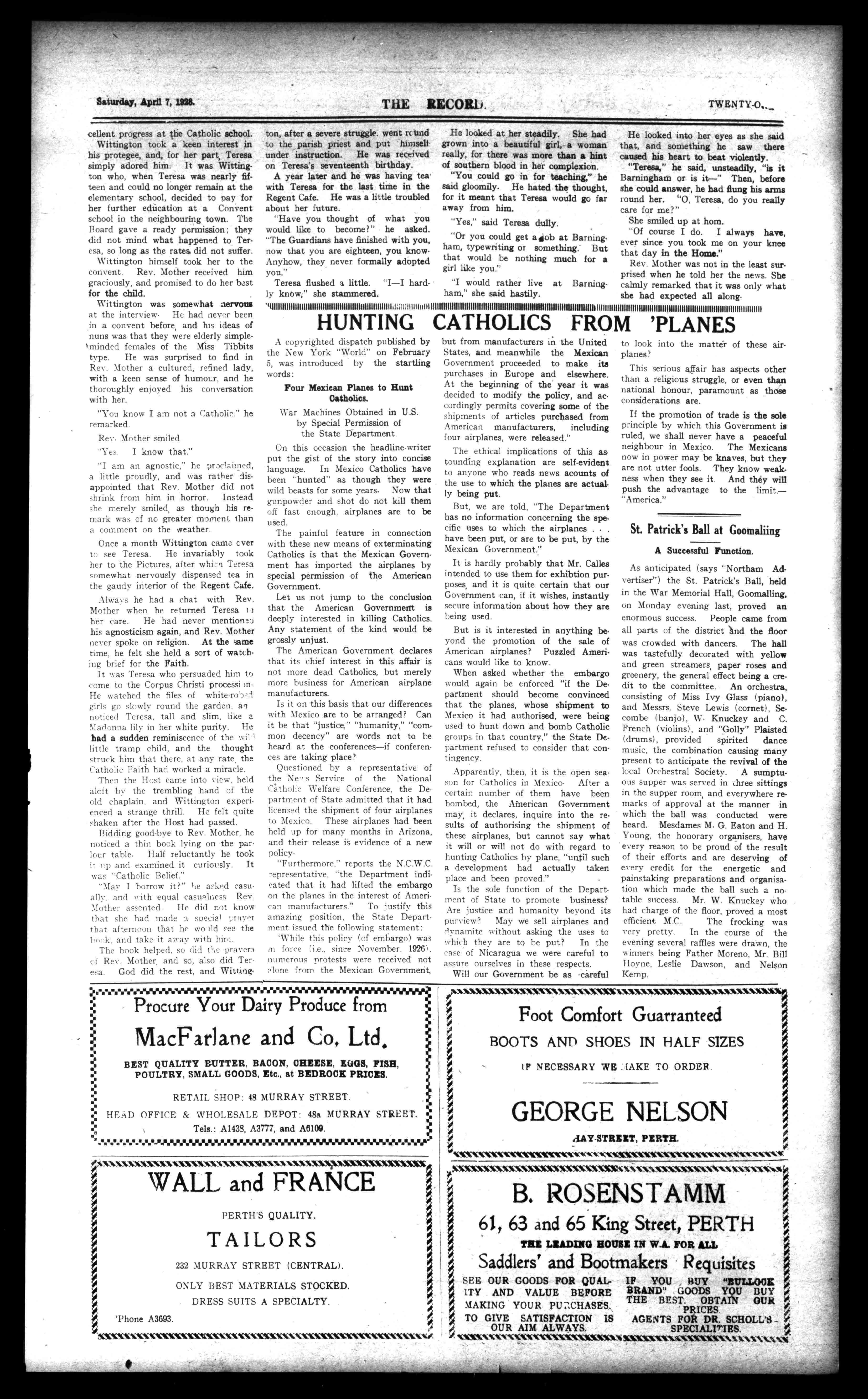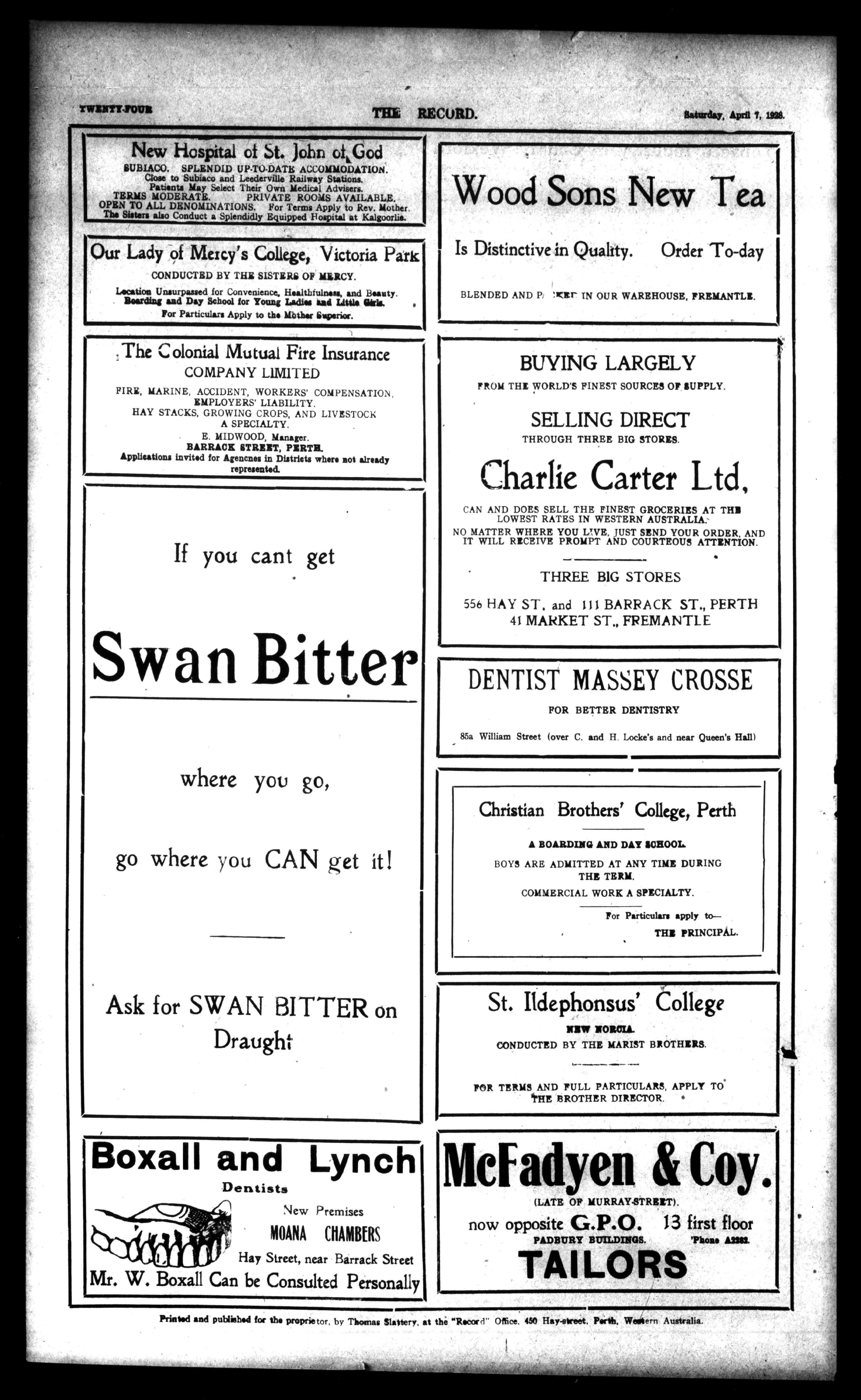 TWENTY-POUR TIMRECORD. Saturday,Apd1f,1928. NewHospitalofSt.Johnof,God SUBIACO.SPLENDIDUP-TO-DATEACCOMMODATION. ClosetoSubiacoandLeedervilleRailwayStations.PatientsMaySelectTheirOwnMedicalAdvisers. TERMSMODERATE. PRIVATEROOMSAVAILABLE. OPENTOALLDENOMINATIONS.ForTermsApplytoRev.Mother. TheSistersalsoConductaSplendidlyEquippedHospitalatKalgoorlie. OurLadyofMercy'sCollege,VictoriaPark CONDUCTEDBYTHESISTERSOFMERCY. LocationUnsurpassedforConvenience.Healthrulnass,andBeauty. BeardingaadDaySchoolforYoungLadiessadLittleGEM. ForParticularsApplytotheMotherSuperior. TheColonialMutualFireInsurance COMPANYLiMiTED FIRE,MARINE,ACCIDENT,WORKERS'COMPENSATION, EMPLOYERS'LIABILITY. HAYSTACKS,GROWINGCROPS,ANDLIVESTOCK ASPECIALTY. E.MIDWOOD,Manager. BARRACKSTREET,PERTH. ApplicationsinvitedforAgencnesinDistrictswheresotalready represented. Ifyoucantget SwanBitter whereyovgo, gowhereyouCANgetit! AskforSWANBITTERon Draught BoxallandLynchDentists NewPremises MOANA CHAMBERS HayStreet,nearBarrackStreet Mr.W.BoxallCanbeConsultedPersonally WoodSonsNewTea IsDistinctiveinQuality.OrderTo-day BLENDEDANDP.!KlirINOURWAREHOUSE,FREMANTLZ. BUYINGLARGELY FROMTHEWORLD'SFINESTSOURCESOFSUPPLY. SELLINGDIRECT THROUGHTHREEBIGSTORES. CharlieCarterLtd, CANANDDOESSELLTHEFINESTGROCERIESATTHE LOWESTRATESINWESTERNAUSTRALIA. NOMATTERWHEREYOULIVE,JUSTSENDYOURORDER,AND ITWILLRECEIVEPROMPTANDCOURTEOUSATTENTION. THREEBIGSTORES 556HAYST.and111BARRACKST.,PERTH 41MARKETST.,FREMANTLE DENTISTMASSEYCROSSE FORBETTERDENTISTRY 85aWilliamStreet(overC.andH.Locke'sandnearQueen'sHall) ChristianBrothers'College,Perth ABOARDINGANDDAYSCHOOL BOYSAREADMITTEDATANYTIMEDURING THETERM. COMMERCIALWORKASPECIALTY. ForParticularsapplytoTHEPRINCIPAL. St.Ildephonsus'College NEWNOROLL CONDUCTEDBYTHEMARISTBROTHERS. FORTERMSANDFULLPARTICULARS,APPLYTO it'HEBROTHERDIRECTOR. McFadyen&Coy. (LATEOFMURRAY-STREET). nowoppositeG.P.O.13firstfloor PADBURYBUILDINGS. 'PhoneA2282. TAILORS Printedandpublishedfortheproprietor,byThomasSlattery,atthe"Record"Office.450Hay-street.Perth,WesternAustralia. r