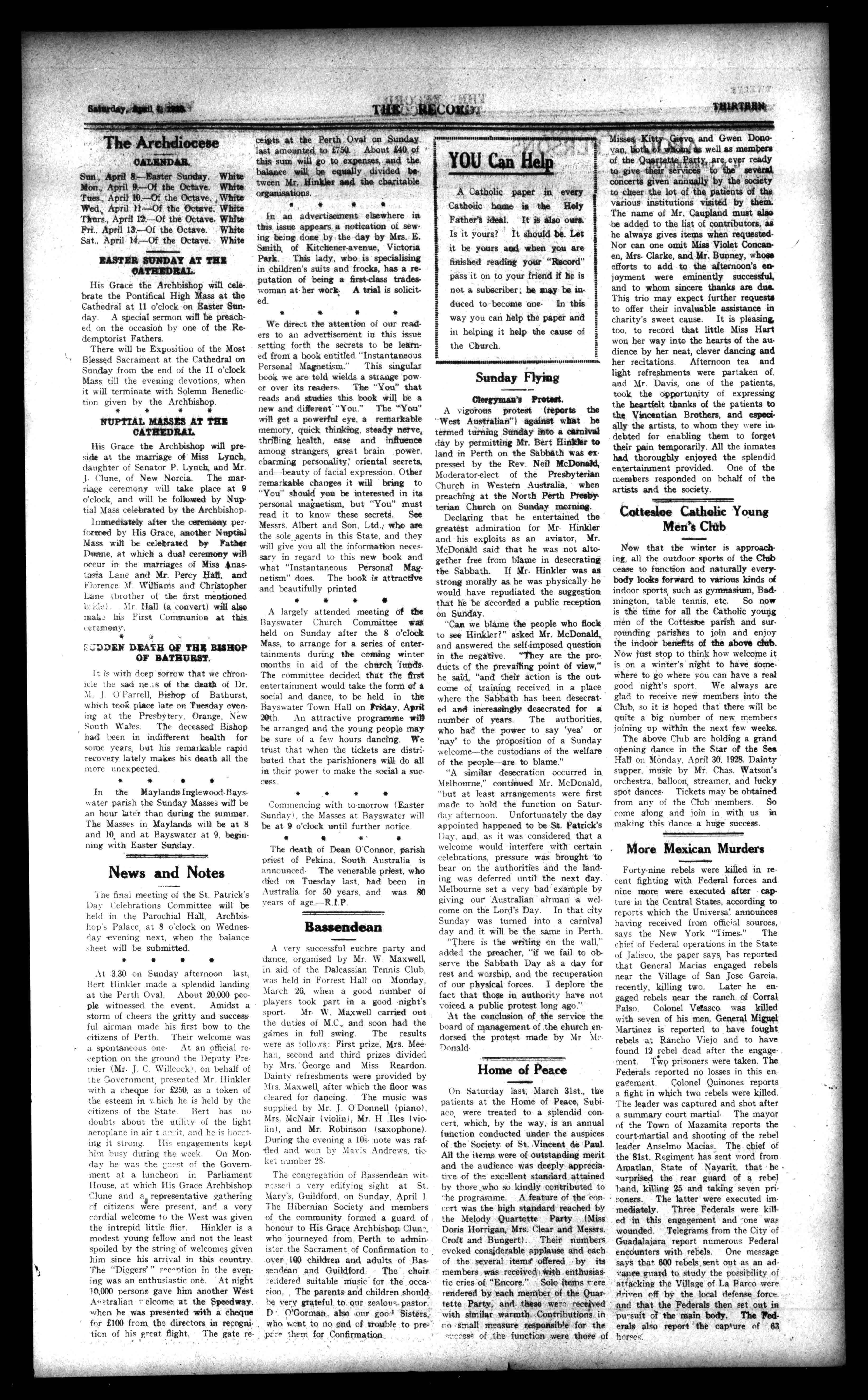 Isimumultillininiiiiiiiiiiiitimiillifilli13111111111111111111111110111111116111INIIMMI111111101)figymilippy99119yiAtkiplaialtinitisli111)'zi.r",,,..,~191115"W"WnwweinfonneiNr"""neeelnwarWAWAM.° "" PUBLISHED.WEEKLT. 3 2 3 INN =f1 ADDRESS:BOX1155,O.P.O. ACATHOLICWEEKLYCIRCULATINGTHROUGHOUTTHESTATEOFWESTERNAUSTRALIA. PRICETHREEPENCE. RegisteredattheG.P.O.,Perth,forTransmissionbyPoetasaNewspaper. No.2,504 ntlilintiONNON NOM IMIPOININNINONS14... PRONE£6447 PERTH,SATURDAY,APRIL7,1928 NINNINUIMISIN TheiistralasianCatholicAssurance COMPANYLIMITED. READOFFICE:OCEANHOUSE,34MARTINPLACE,SYDNZN. RegisteredundertheCompanies'Act,1899,ofNewSouthWales. BRANCHOFFICES:-VICTORIA:475Collins-street,Melbourne. SOUTHAUSTRALIA:.29KingWilliam-street,Adelaide. HEADOFFICEFORWESTERNAUSTRALIA: WARWICKHOUSE,ST.GEORGE'STERRACE,PERTH. DistrictOffices:Newcastle,BallaratandGeelong.StateAgenda. ADULTLIFEANDENDOWMENTASSURANCESOFALL CLASSESEFFECTED. SPECIALENDOWMENTASSURANCEFORCHILDREN. 'PhoneA6484. T.J.McGRATH,ResidentSecretary. "---"IcNAL-INC'cliCVIMICICWIMCMCICWCIMICXXXXXX% 0vik,"fooreVRIMWANI'vNNILVIOI:A.W.14100:141016316W00.100.WAII6N0 YOURAFTEREASTER SILK REQUIREMENTSarebestprocuredat COUR'S ITheySpecialiseinSILKS 0 0 OneQuality--TheHighest! OnePrice--TheLowest AutumnSilksandVelvets JUSTOPENED NowShowinginWonderfulArray Convents,Colleges,Institutionsand SchoolsspeciallyCateredfor 1574. ..1.111111110INNIN Vol.LII. THE FOY&GIBSON EMPORIUM IsaNotableShoppingCentre forManchesterandSoft Furnishings FABRICSTOBRIGHTENTHEHOME 1* TheNewestIdeas inNETS FADELESSCOTTONNETS,alloverdesigns,shadessuchasoldgold, champagne,saxeblue,ecru;40 incheswide,1/10peryd. SMALLMESHFISHERNETS, quitefadeless,beautifulrangeof shades50incheswide.SPECIAL DISCOUNTEDPRICE,1/11peryd. GORGEOUSARTSILKMADRASMUSLINS:Wordsfailtodescribethesplendourofeffectand richnessofcolourharmonythisenchantingmaterialpossesses;50inches wide.PRICE,9/6. CREAM"BANGALORE"MUSLIN:Thischoicefabricislightand daintyineffect,showingdeepcreamground;afinelinecheckv.ithsmall exquisitecolourdevicesdisplayedatfrequentintervals;48/50incheswide. PRICE,2/11,3/3. THEFAMOUS"GII3SONIA"ARTSERGES;50inch;insaxeblue, brown,red,orolive,green.5/9per