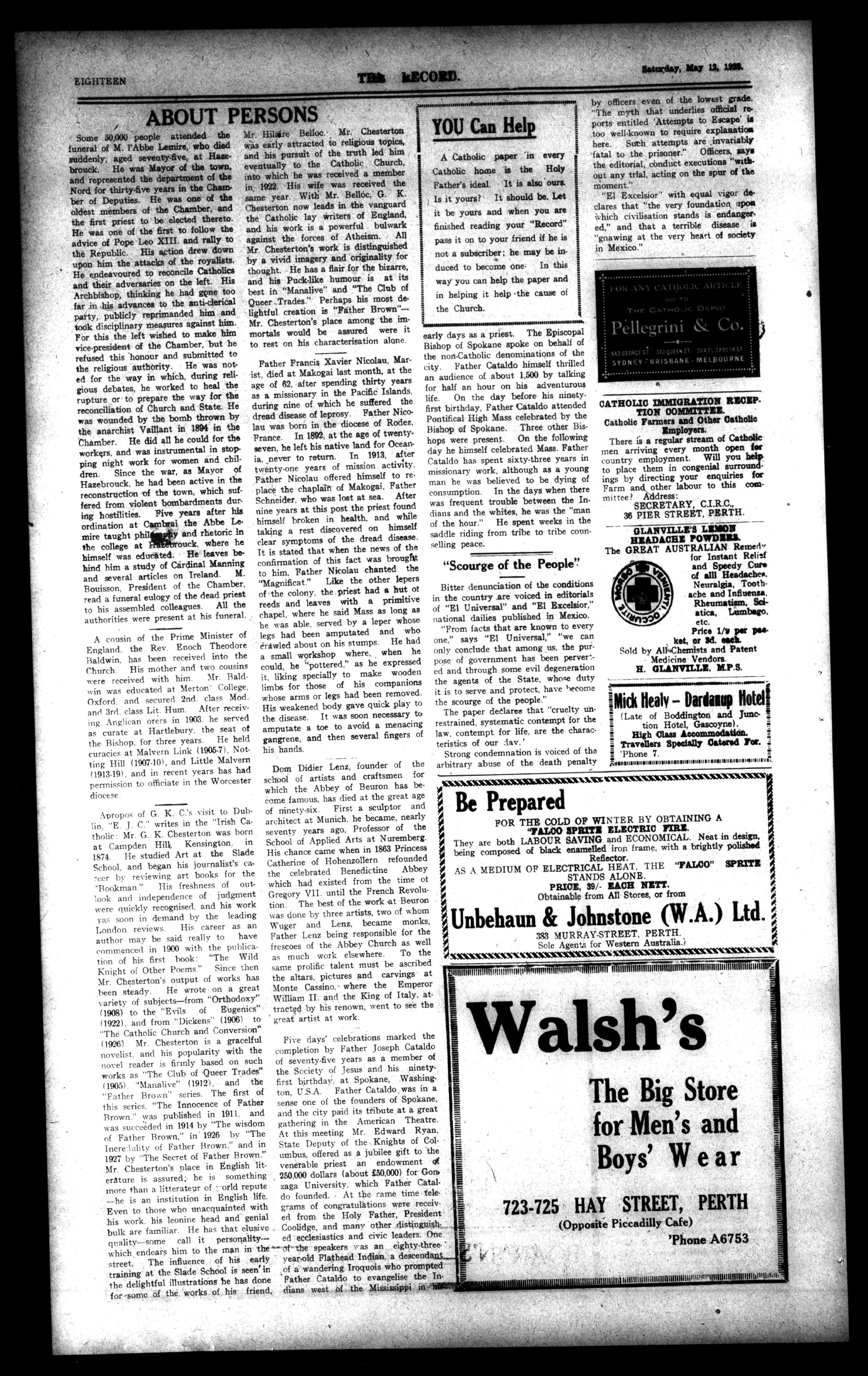 LIMEANDSTONEMERCHANTS T.J.BRIGGS:.76KINGST.,PERTH IquoteforBuilders'Lime,GroundLimestone,SpecialSprayingLime, AgriculturalLime,ontrucksattheworks,ordeliveredinanypartofthe State.AlsosuppiyCowHair,Cement,Gravel,etc.Ifyouwantthevery beatmaterialsandlowestpossibleprices,writeforparticulars.Forty Years'ExperienceintheTrade.IamtheLimeMan.Notetheaddress. Telephones:A1684;Private,F547;Works,F853. roa..1a..S.W4Wg5CILIZIMMIZIMICIMICiLIM.IMLICILICWVENNXIIZILli EVERYONE ISASKINGFOR EmuNewBitter HAVEYOUTRIEDTT? HIBERNIANSOCIETY TheOnlyCatholicBenefitSocietyintheState JOINNOW FullparticularsastoBranchSecretaries'Addresses,RatesofContribution,etc.,from W.A.BROWN,DistrictSecretaryandOrganiser, HibernianHall,Murray-street,Perth. -VW 5.