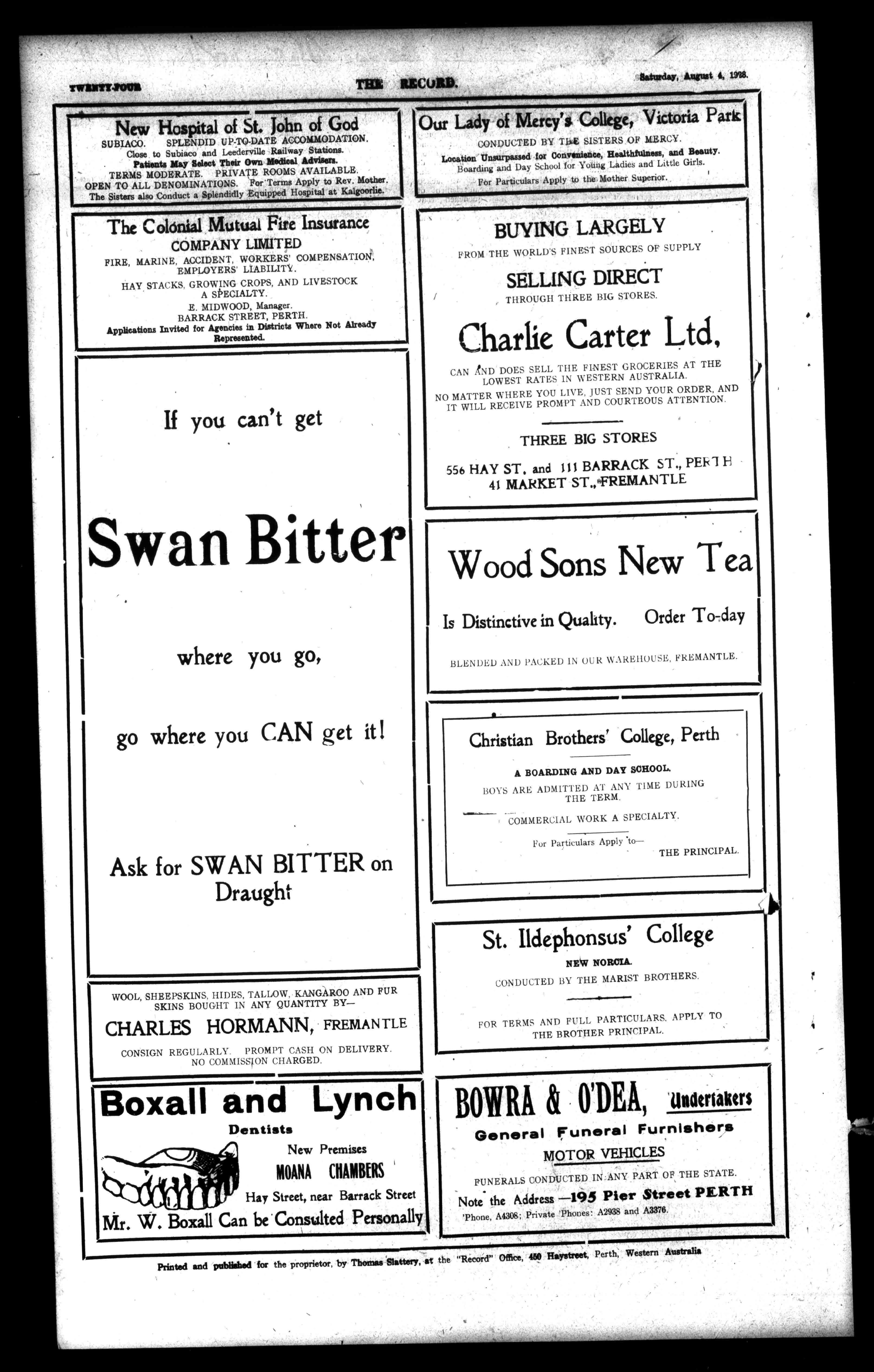 TW11117400111 tatMCCORD. Saturday,August4,1918. '1111O11111111MIPM1111. NewHospitalofSt.JohnofGod SUBIACO. SPLENDIDUP-TO-DATEACCOMMODATION. ClosetoSubiacoandLeedervilleRailwayStations. PatientsMaySelectTheirOwnMedicalAdvisers. TERMSMODERATE.PRIVATEROOMSAVAILABLE. OPENTOALLDENOMINATIONS.ForTermsApplytoRev.Mother. TheSistersalsoConductaSplendidlyEquippedHospitalatKalgoorlie. TheColOnialMutualFireInsurance COMPANYLIMITED FIRE,MARINE,ACCIDENT,WORKERS'COMPENSATION, EMPLOYERS'LIABILITY. HAYSTACKS,GROWINGCROPS,ANDLIVESTOCK ASPECIALTY. E.MIDWOOD,Manager. BARRACKSTREET,PERTH. ApplicationsInvitedforAgenciesinDiatrictsWhereNotAlready Represented. Ifyoucan'tget SwanBitter whereyougo, gowhereyouCANgetit! AskforSWANBITTERon Draught WOOL,SHEEPSKINS,HIDES,TALLOW,KANGAROOANDFUR SKINSBOUGHTINANYQUANTITYBYCHARLESHORMANN,FREMANTLE CONSIGNREGULARLY.PROMPTCASHONDELIVERY. NOCOMMISSIONCHARGED. BoxallandLynch Dentists NewPremises MOANACHAMBERS HayStreet,nearBarrackStreet Mr.W.BoxallCanbeConsultedPersonally OurLadyofMercy'sCollege,VictoriaPark (IONDlikTEL)LCTIDESISTERSOFMERCY. LocationUnsurpassedforConvenience,Realthfulaea,andBeauty. HoardinganalDay h,rYoungLath,,.andLittleGirls. ForParticularsApplytotheMotherSuperior., BUYINGLARGELY FROMTHEWORLD'SFINESTSOURCESOFSUPPLY SELLINGDIRECT THROUGHTHREEBIGSTORES.