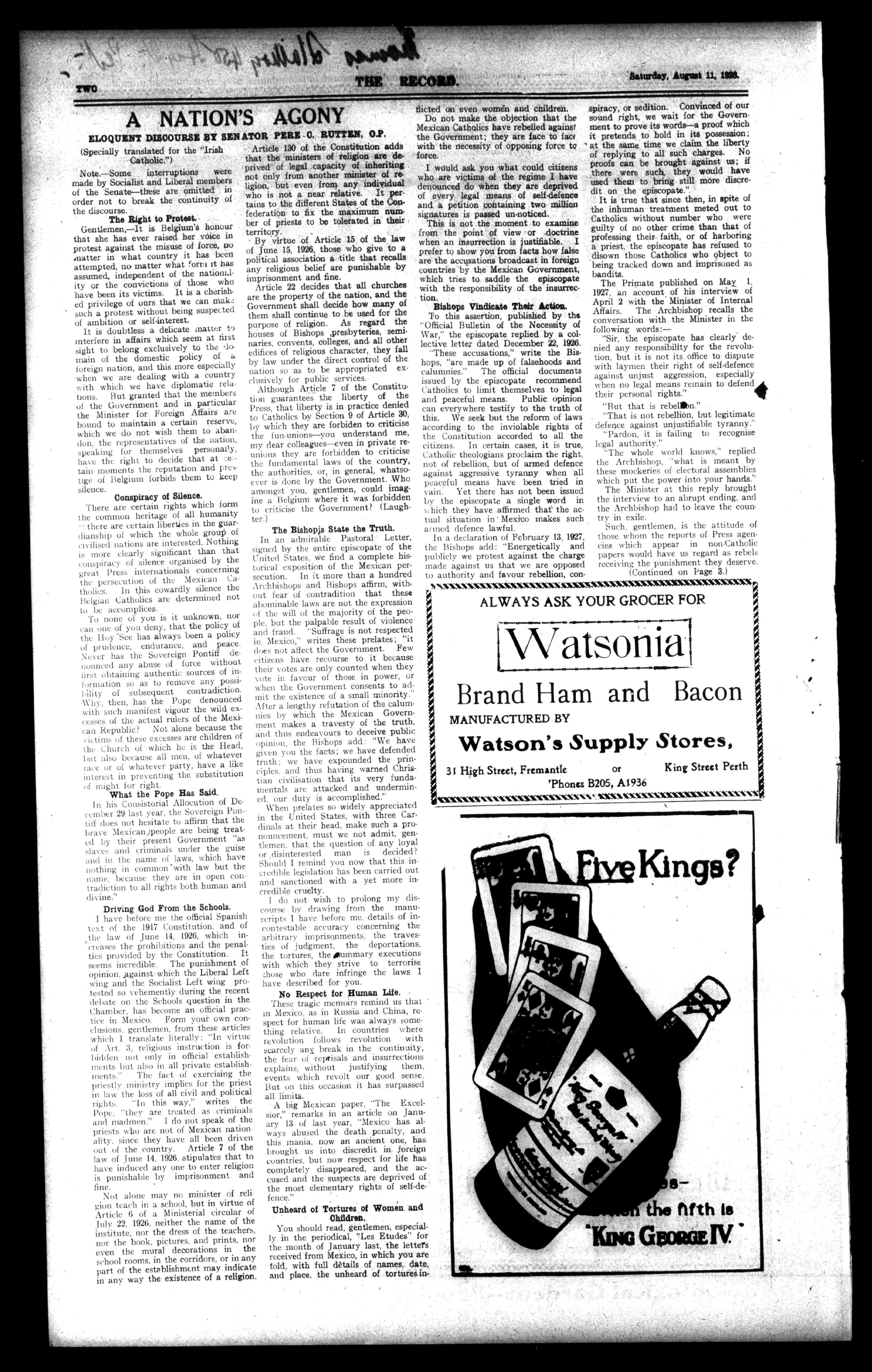 Therewasatimewhenpeoplebelievedinahierarchyofvalues,andthe greatnationsofEuropewouldhave feltthemselvesdishonouredifthey dicknotmaintainthesupremacyof thesemoralandcivilisingvalueswhich are:therespectoftheideal,ofconscience.ofliberty,andofweakness. Canitbetrue,then,gentlemen,that to-daythesethingsarecountedless thananoilwellandthattheonly valuesworthbotheringaboutarethose thatarequotedintheExchange?And isitnotsadtoseethat,withvery rareexceptions,theCatholicPresshas beenaloneinitsprotestagainstthe crueltreatmentofourMexicanbrethren'