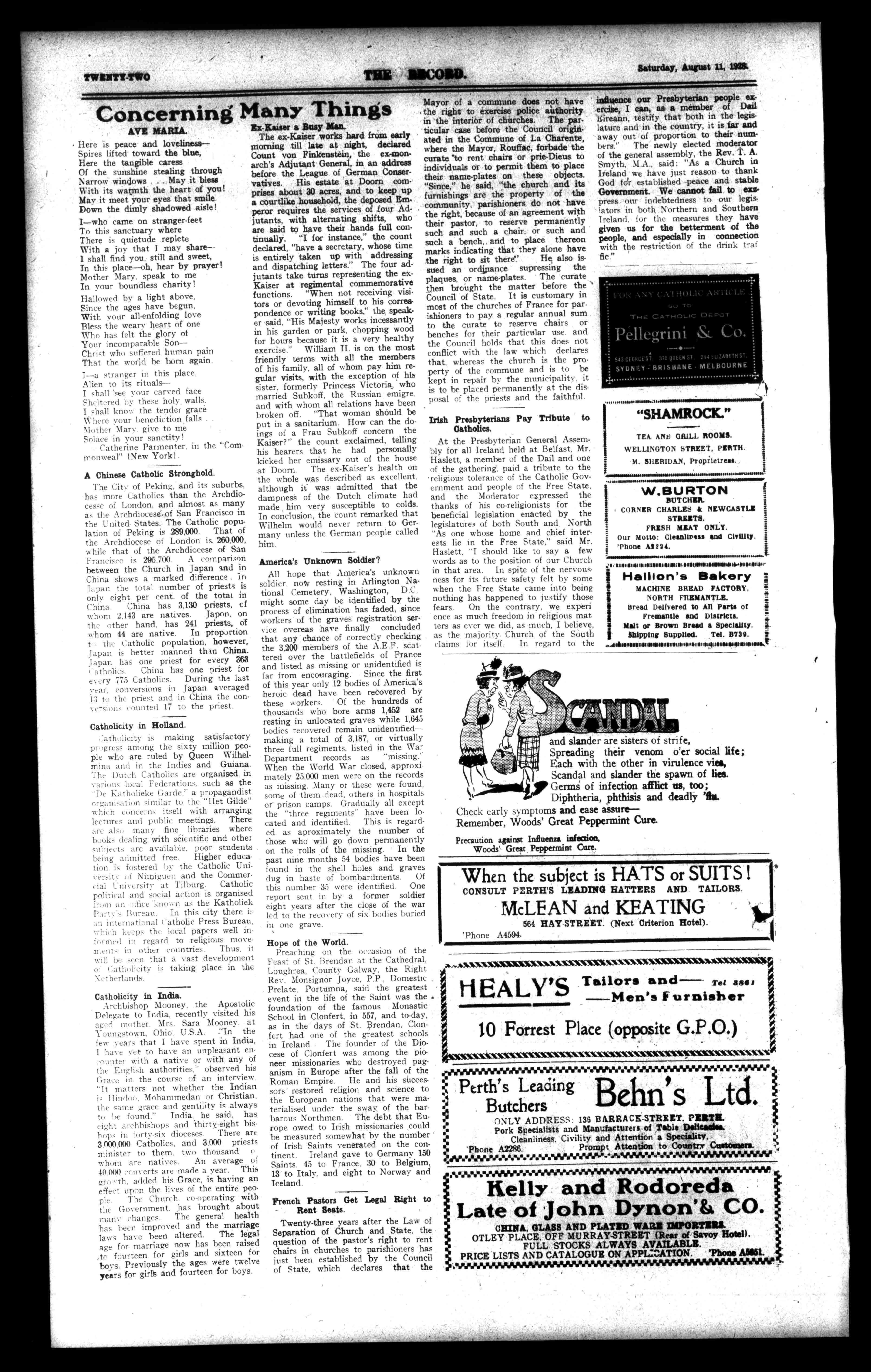 Eachwiththeotherinvirulencevies, Scandalandslanderthespawnoflies. (Germsofinfectionafflictus,too; Diphtheria,phthisisanddeadlyla. Checkeach,;mptumsandeaseassure-Remember,Woods'GreatPeppermintCure. PrecautionagainstInfluenzainfection, Woods'GreatPeppermintCure. WhenthesubjectisHATSorSUITS! CONSULTPERTH'SLEADINGHATTERSANDTAILORS. IVIcLEANandKEATING 564HAYSTREET.(NextCriterionHotel). 'PhoneA1594. HEALY'STailorsand-Tel3551 -Men'sFurnisher 10ForrestPlace(oppositeG.P.O.) ,,,,,,woomocsmwsvigswoommi deteedWANYWAVANYMAIWINVAWANWAMANWWWWV i ...z. Perth'sLeadingT1I DLcf, 4") Butchers ensnt : e nNLYADDRESS.136BARRACE-STREET.PISTIL PorkSpecialistsandManufacturersofTableDeludes. i Cleanliness.CivilityandAttentionaSpeciality. 7,e 'PhoneA2286. PromptAttentiontoCountryCustomers. KellyandRodoreda LateofJohnDynon%).CO. CHINA,GLASSANDPLATEDteamsWORTHSti OTLEYPLACE.OFFMURRAY-STREET(RearofSavoyHotel). FULLSTOCKSALWAYSAVAILABLE. PRICELISTSANDCATALOGUEONAPPLMATION.'PhoneAS1151. AWANYvviNWMAPWWWANVINWYWAWAVANVAWAN