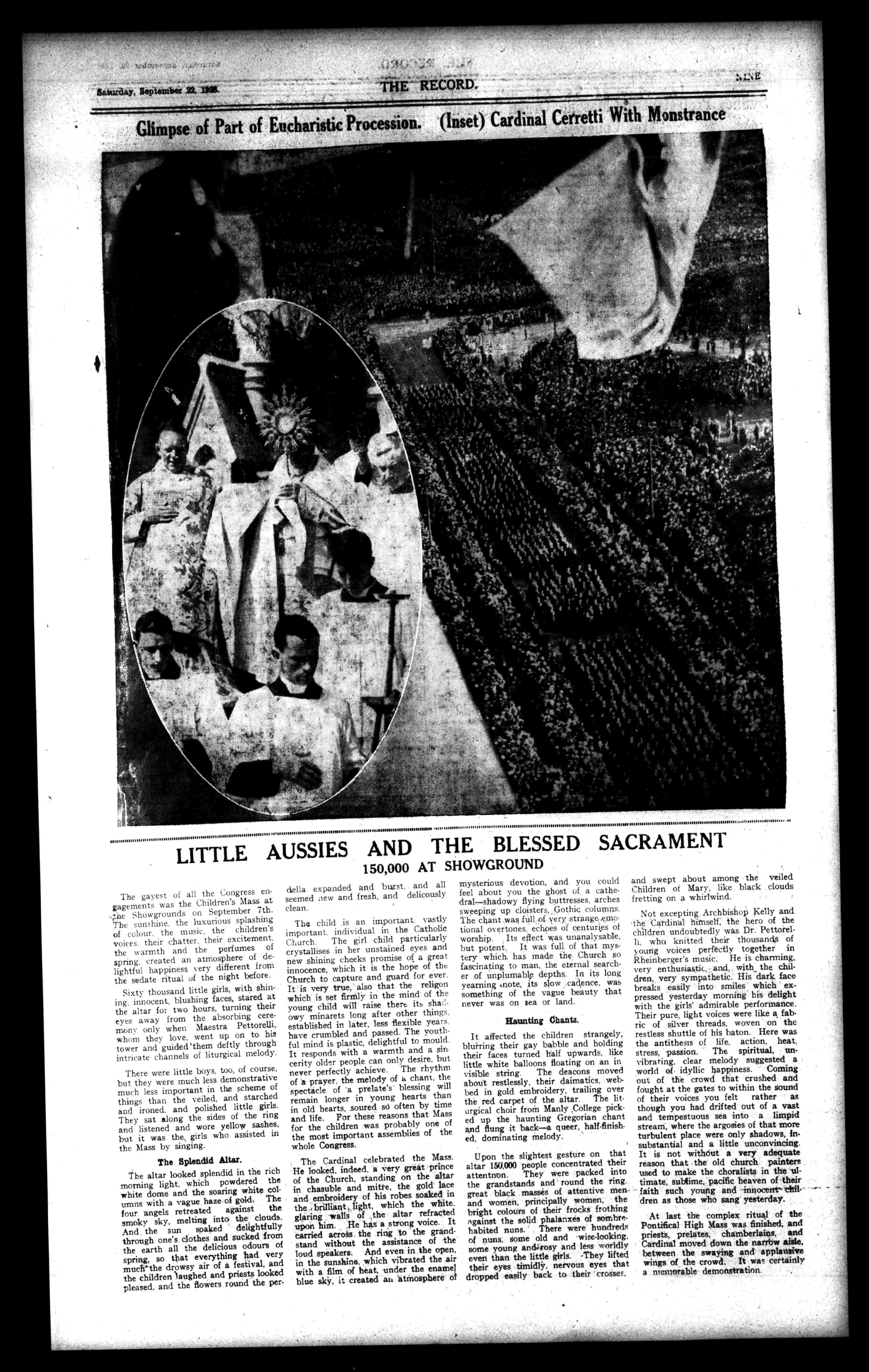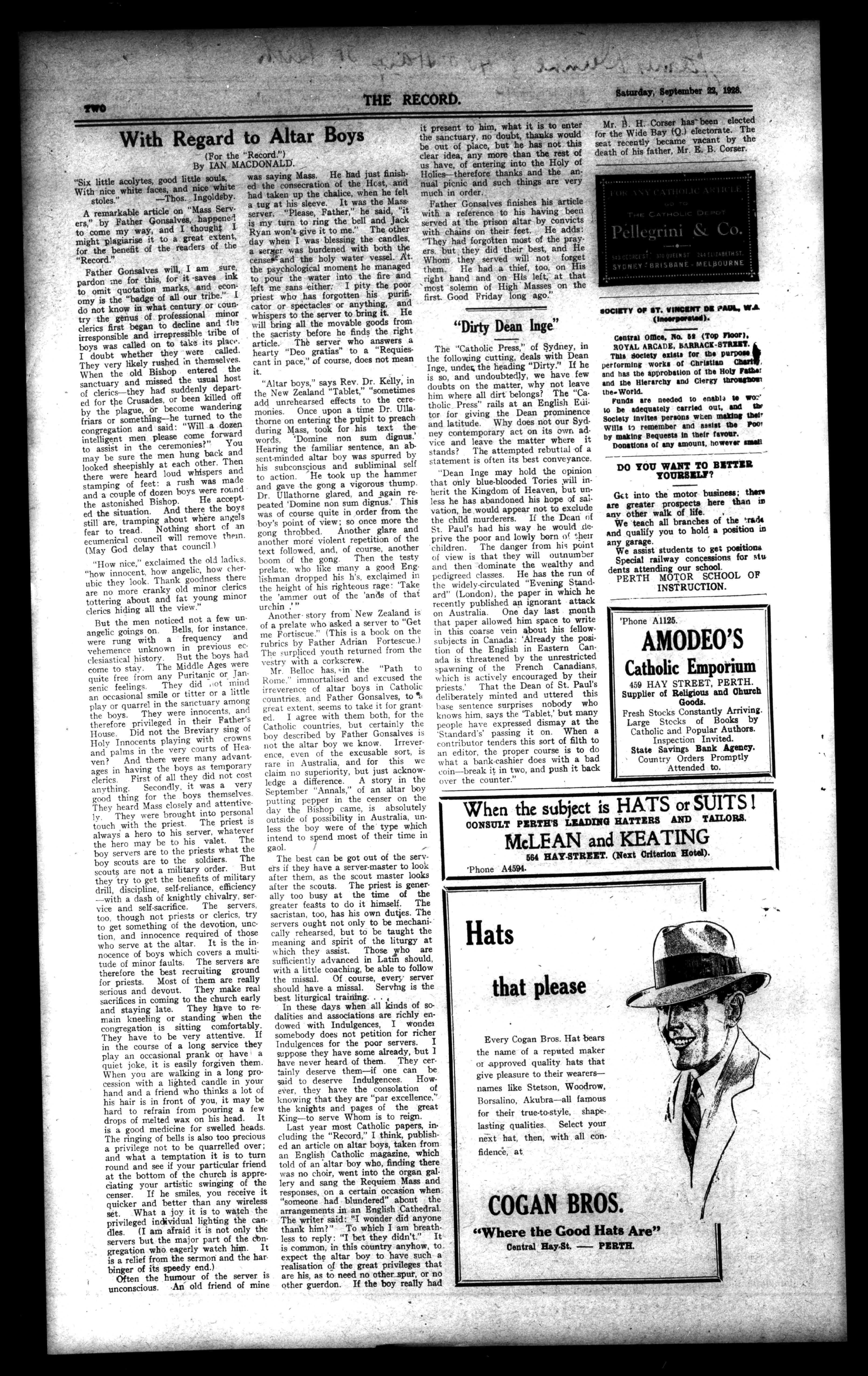 LastyearmostCatholicpapers,includingthe"Record,"Ithink,publish. edanarticleonaltarboys,takenfrom anEnglishCatholicmagazine,which toldofanaltarboywho,findingthere wasnochoir,wentintotheorgangalleryandsangtheRequiemMassand responses,onacertainoccasionwhen "someonehadblundered"aboutthe arrangementsinanEnglishCathedral. Thewritersaid:"Iwonderdidanyone thankhim?"TowhichIambreathlesstoreply:"Ibettheydidn't."It iscommon,inthiscountryanyhow,to expectthealtarboytohavesucha realisationofthegreatprivilegesthat arehis,astoneednootherspur,orno otherguerdon.Iftheboyreallyhad