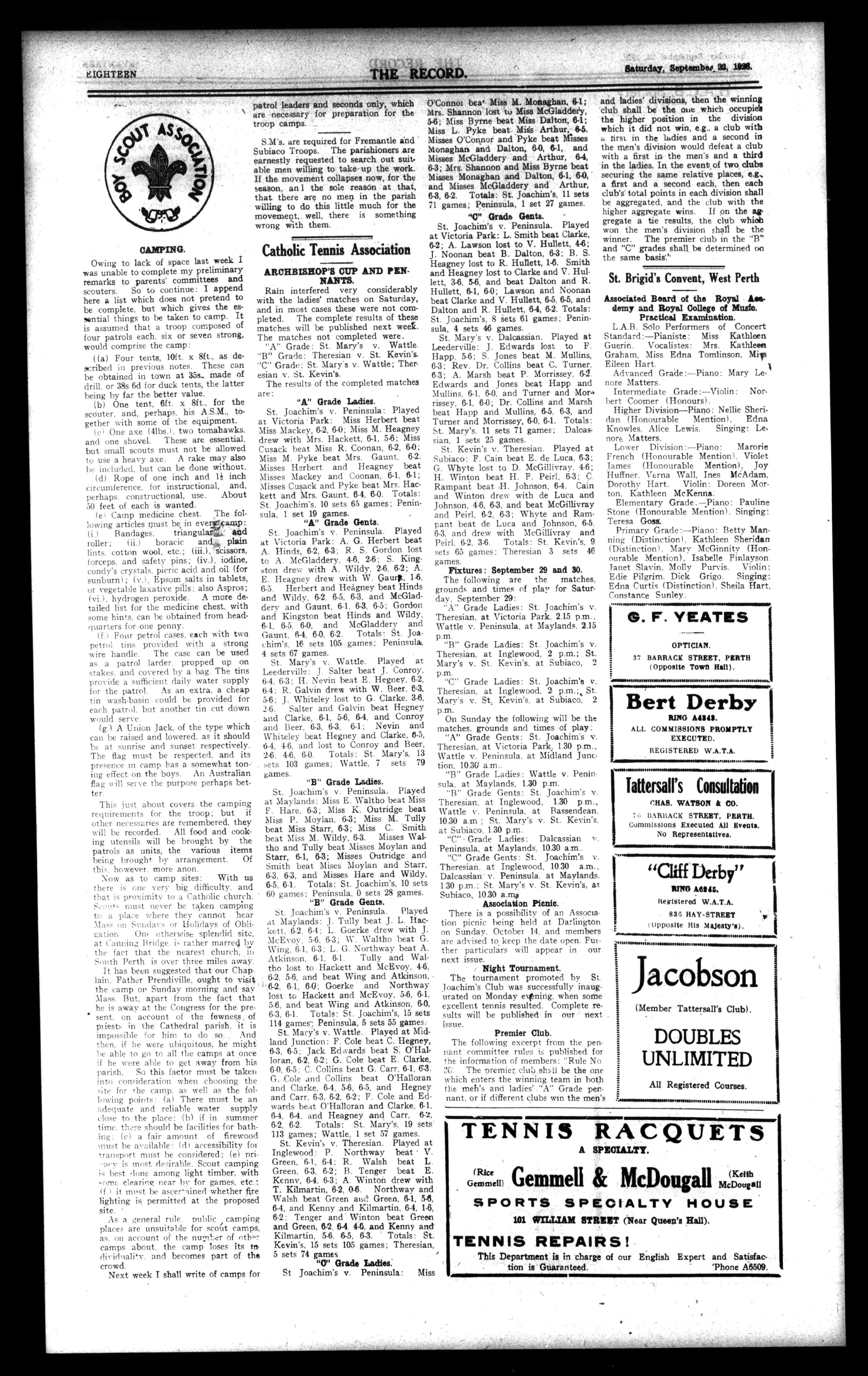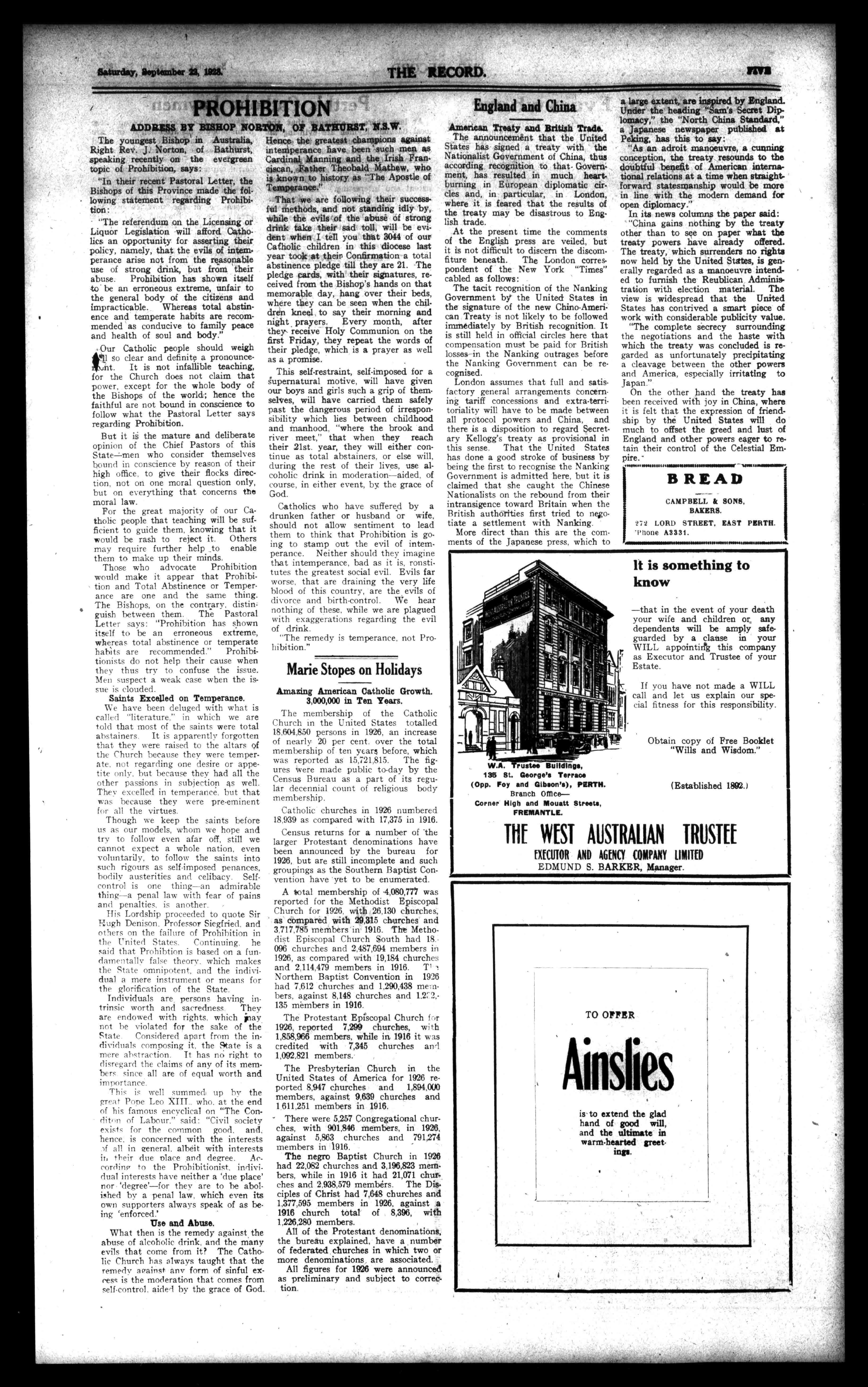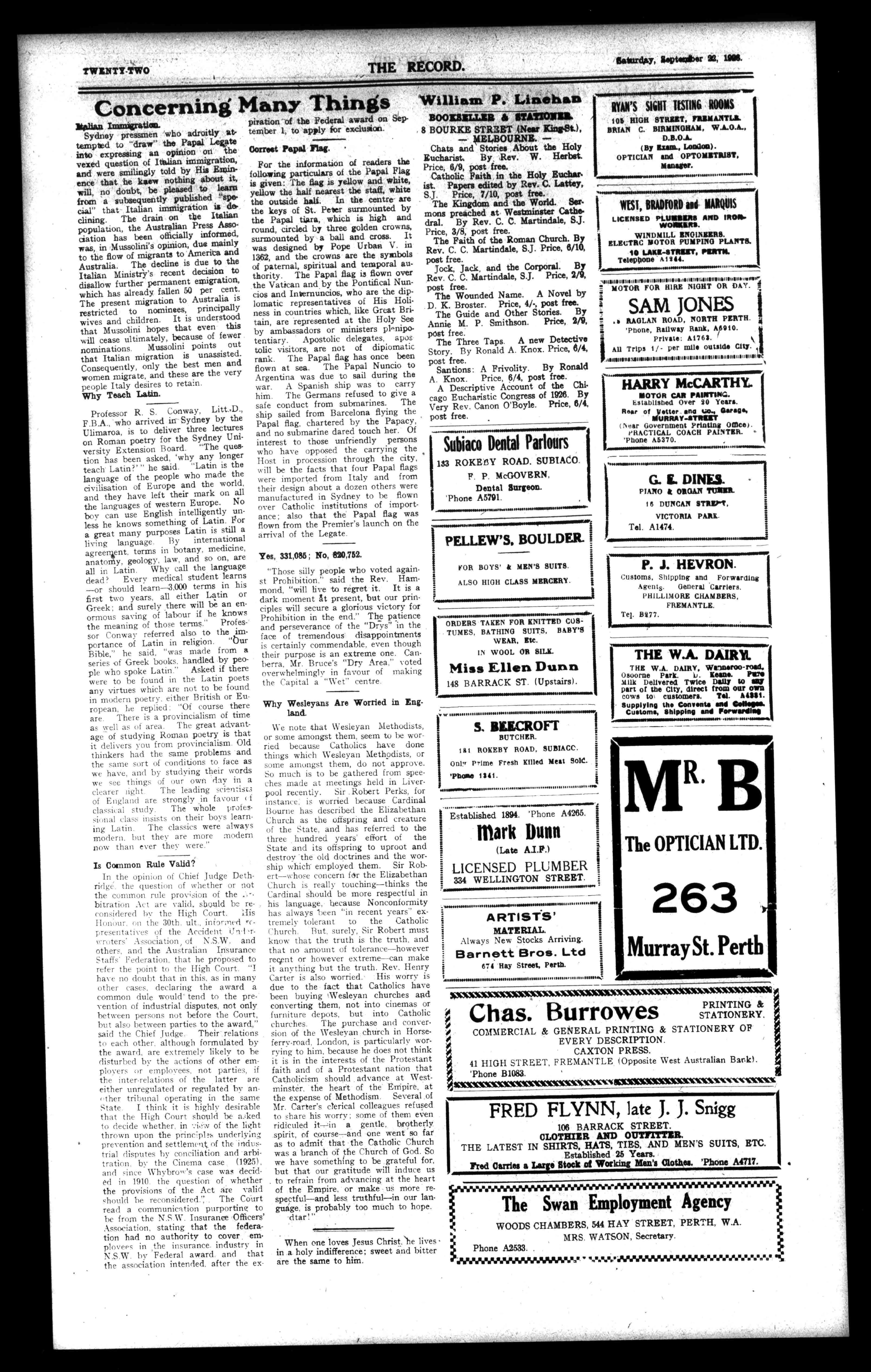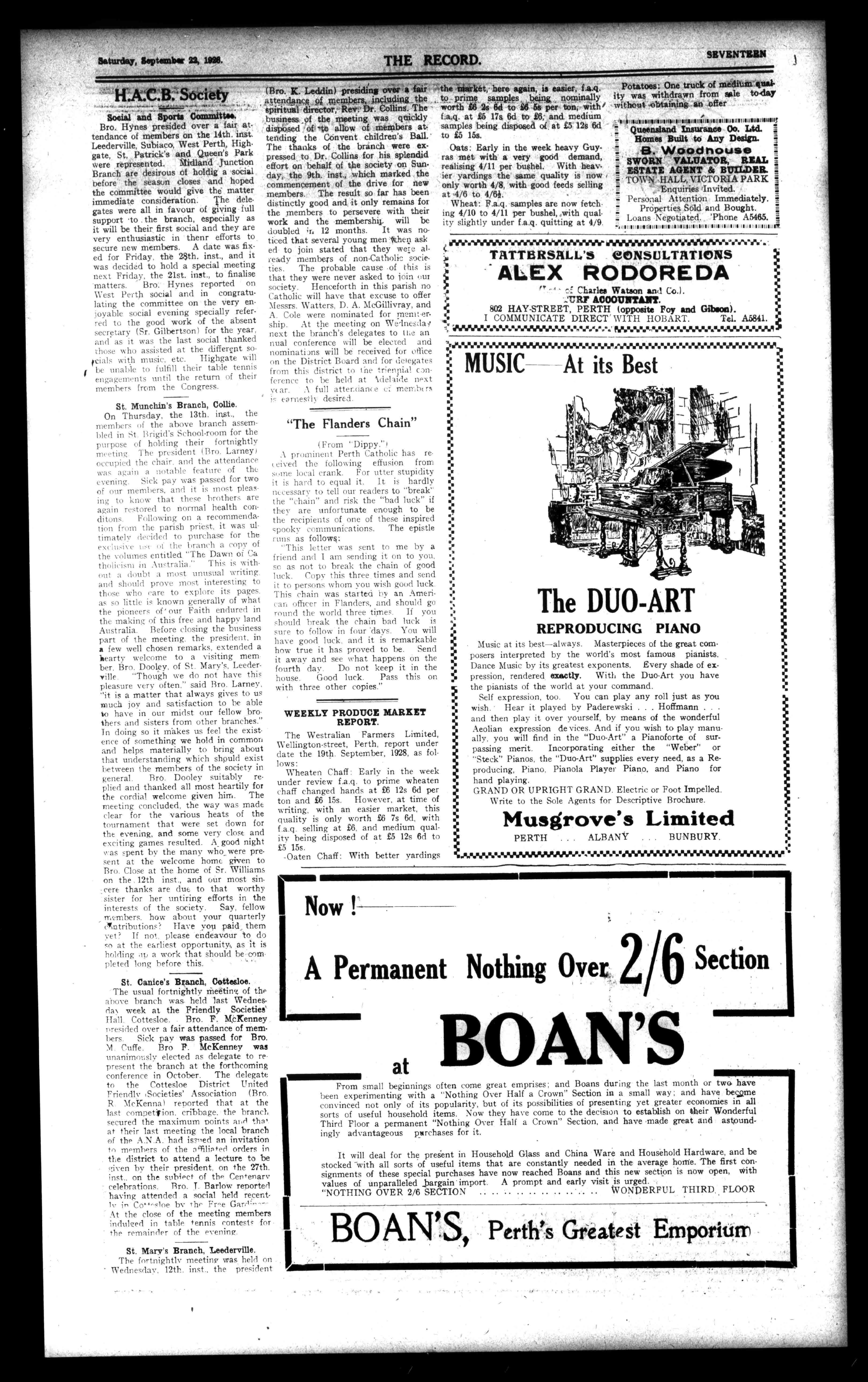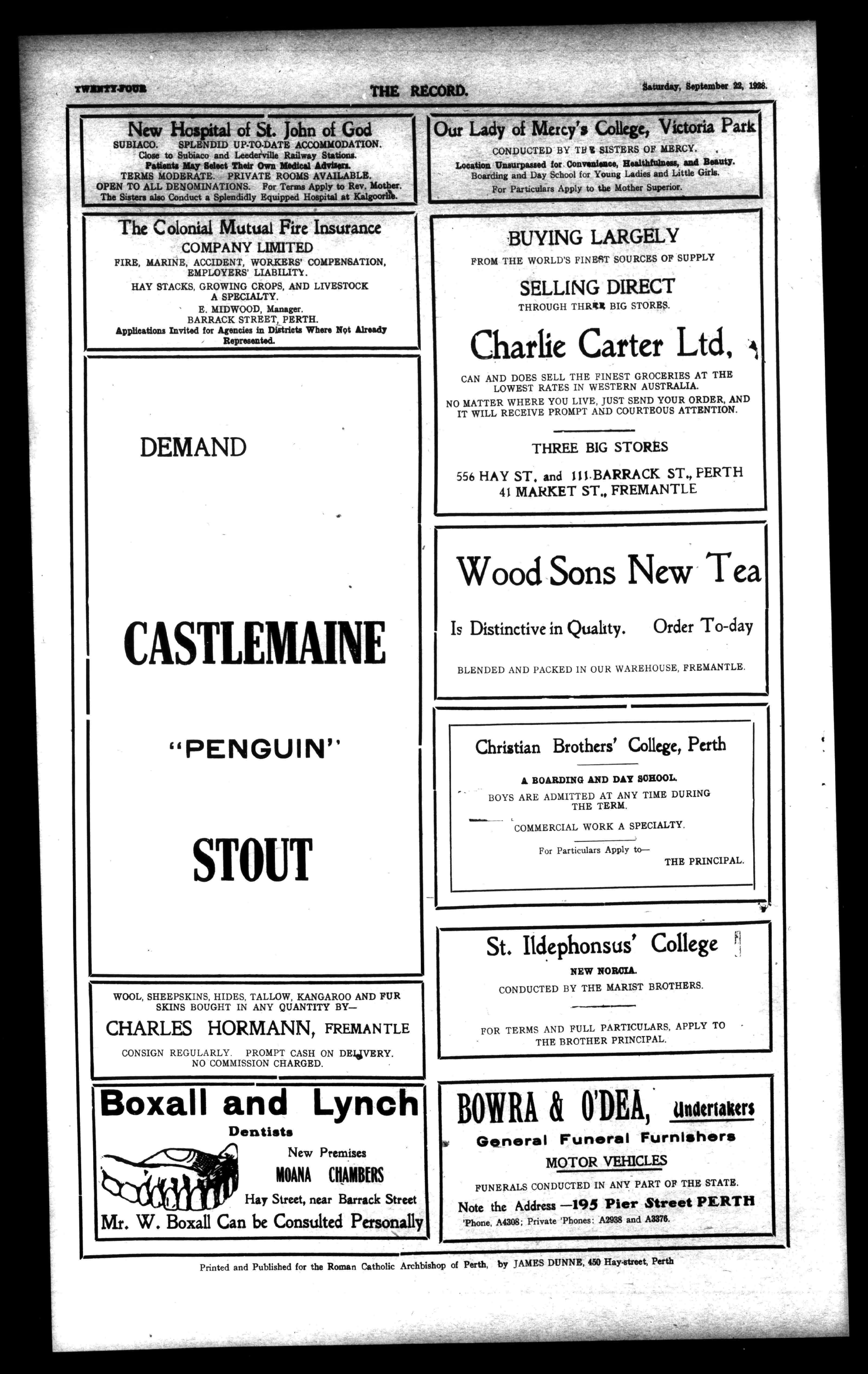 TwErrnrous THERECORD. Saturday,September22,115. NewHospitalofSt.JohnofGod SUBIACO. SPLENDIDUPTODATEACCOMMODATION. ClosetoSubiacoandLeedervilleRailwayStations. PatientsMaySelectTheirOwnMedicalAdvisers. TERMSMODERATE.PRIVATEROOMSAVAILABLE. OPENTOALLDENOMINATIONS.ForTermsApplytoRev.Mother. TheSistersalsoConductaSplendidlyEquippedHospitalatKalgoorN. TheColonialMutualFireInsurance COMPANYLIMITED FIRE,MARINE,ACCIDENT,WORKERS'COMPENSATION, EMPLOYERS'LIABILITY. HAYSTACKS,GROWINGCROPS,ANDLIVESTOCK ASPECIALTY. E.MIDWOOD,Manager. BARRACKSTREET,PERTH. ApplicationsInvitedforAgenciesinDistrictsWhereNotAlready Represented. DEMAND CASTLEMAINE "PENGUIN" STOUT WOOL,SHEEPSKINS,HIDES,TALLOW,KANGAROOANDFUR SKINSBOUGHTINANYQUANTITYBYCHARLESHORMANN,FREMANTLE CONSIGNREGULARLY.PROMPTCASHONDEII1VERY. NOCOMMISSIONCHARGED. BoxallandLynch Dentists NewPremises MOANACHAMBERS HayStreet,nearBarrackStreet Mr.W.BoxallCanbeConsultedPersonally OurLadyofMercy'sCollege,VictoriaPark CONDUCTEDBYTHYSISTERSOFMERCY. LocationUnsurpassedforConvenience,Healthfulness,andBeauty. BoardingandDaySchoolforYoungLadiesandLittleGirls. ForParticularsApplytotheMotherSuperior. BUYINGLARGELY FROMTHEWORLD'SFINESTSOURCESOFSUPPLY SELLINGDIRECT THROUGHTHRKIBIGSTORES. CharlieCarterLtd, CANANDDOESSELLTHEFINESTGROCERIESATTHE LOWESTRATESINWESTERNAUSTRALIA. NOMATTERWHEREYOULIVE,JUSTSENDYOURORDER,AND ITWILLRECEIVEPROMPTANDCOURTEOUSATTENTION. THREEBIGSTORES 556HAYST.and11IBARRACKST.,PERTH 41MARKETST.,FREMANTLE WoodSonsNewTea IsDistinctiveinQuality.OrderTo-day BLENDEDANDPACKEDINOURWAREHOUSE,FREMANTLE. ChristianBrothers'College,Perth 1 ABOARDINGANDDAYSCHOOL. BOYSAREADMITTEDATANYTIMEDURING THETERM. COMMERCIALWORKASPECIALTY. ForParticularsApplytoTHEPRINCIPAL. p St.Ildephonsus'College NEWNORMA. CONDUCTEDBYTHEMARISTBROTHERS. FORTERMSANDFULLPARTICULARS,APPLYTO THEBROTHERPRINCIPAL. BOWRA&O'DEA)Undertakers GeneralFuneralFurnishers MOTORVEHICLES FUNERALSCONDUCTEDINANYPARTOFTHESTATE. NotetheAddress-195PierStreetPERTH 'Phone,A4308;Private'Phones:A2938andA3376. PrintedandPublishedfortheRomanCatholicArchbishopofPerth,byJAMESDUNNE,450Hay-street,Perth