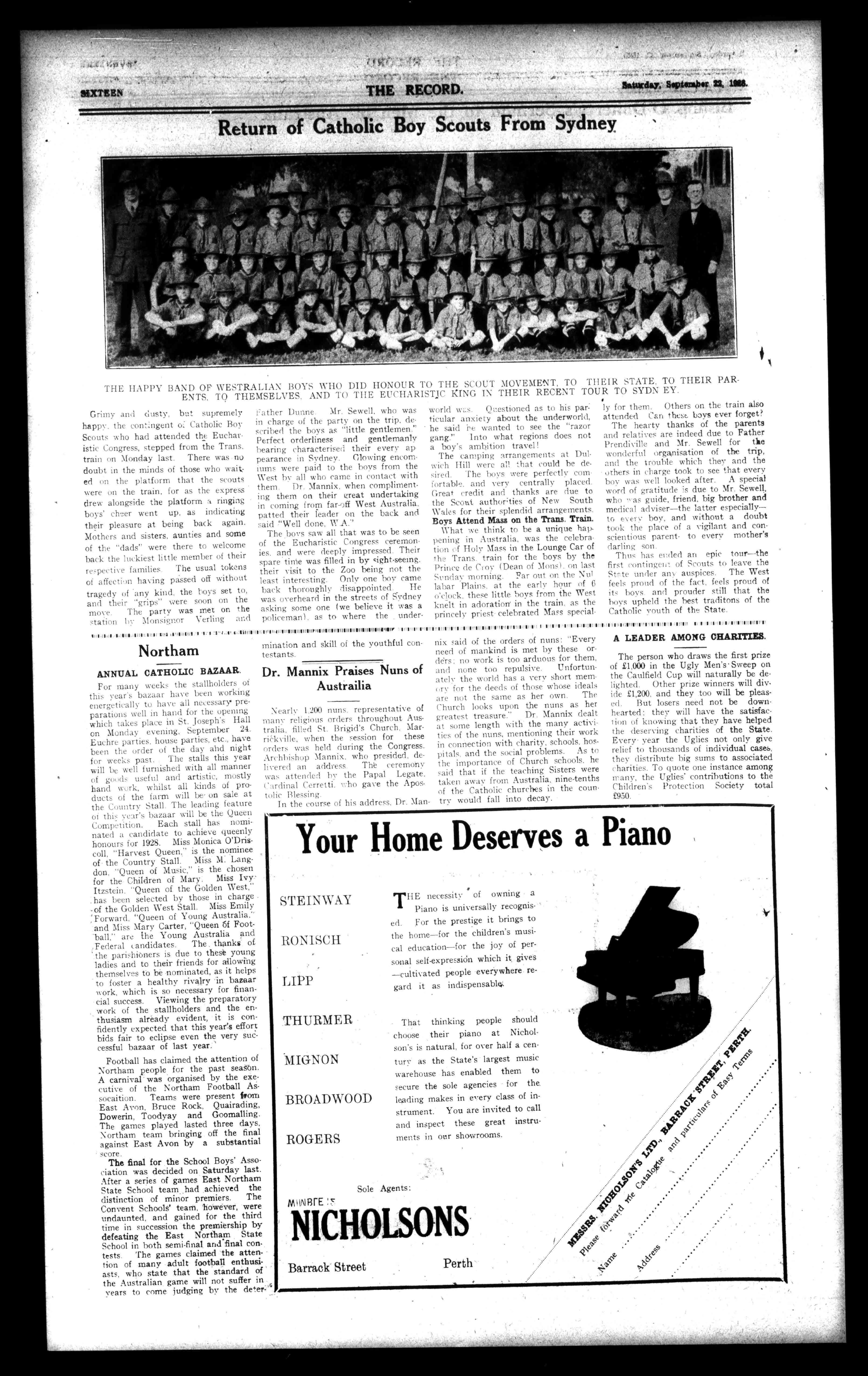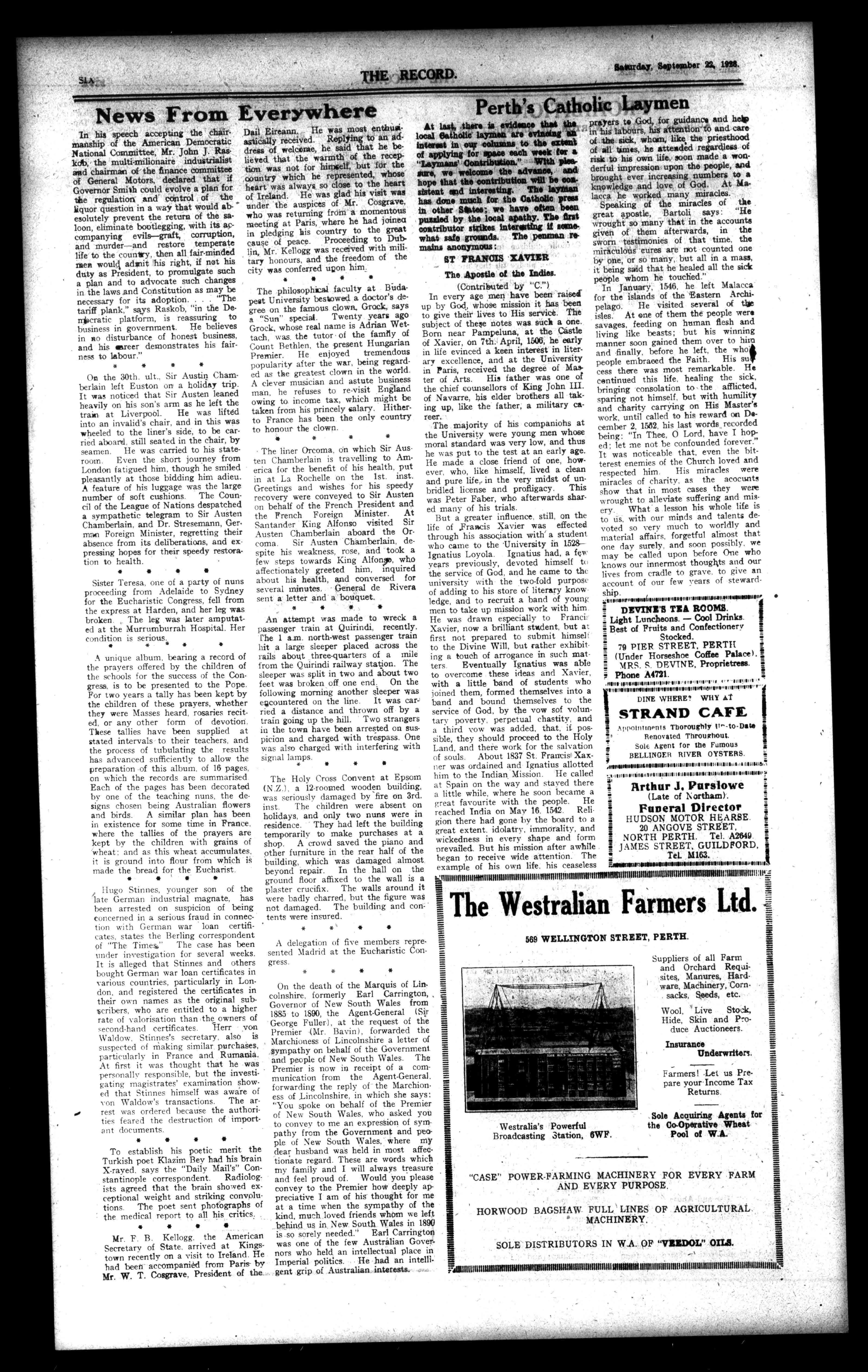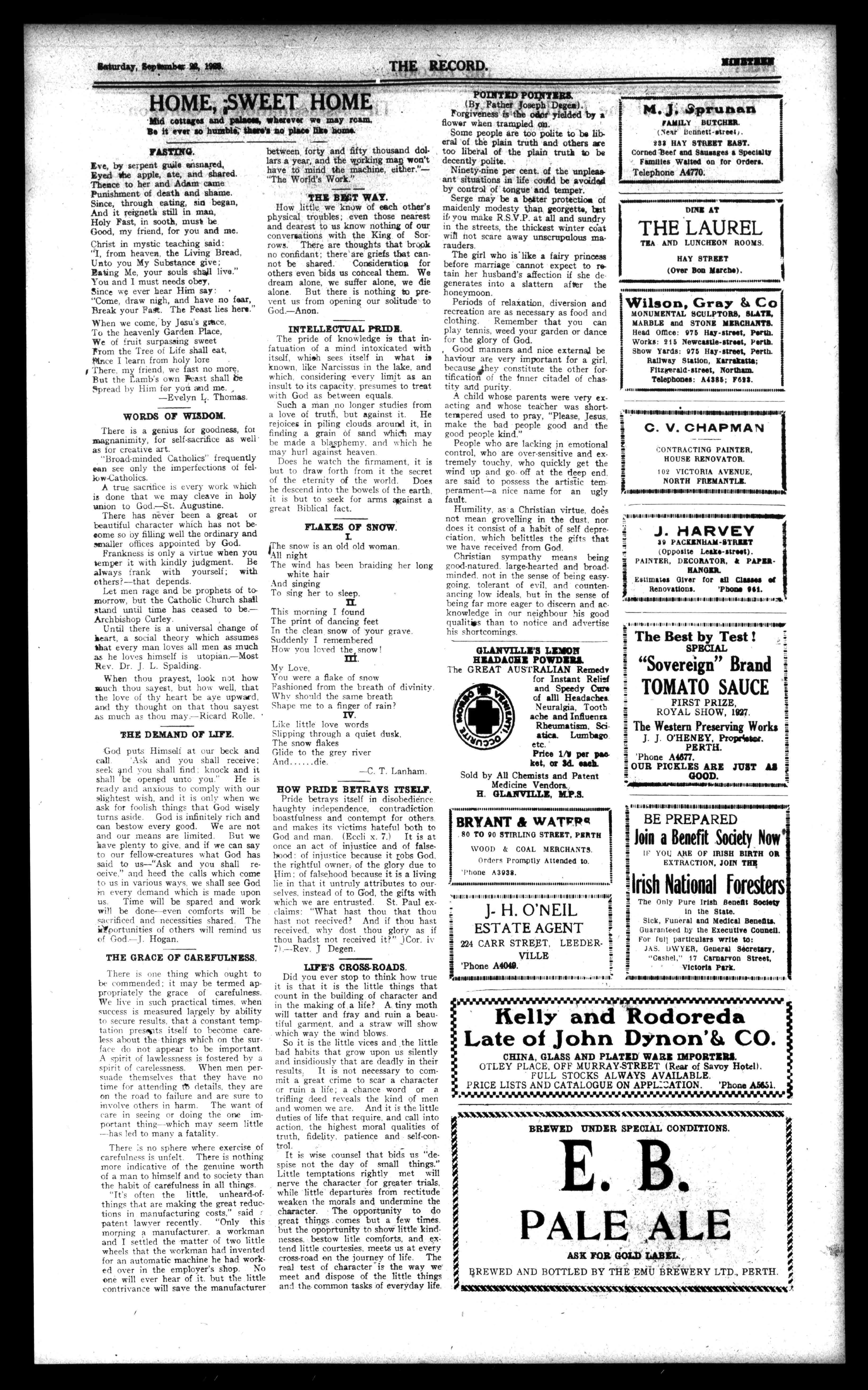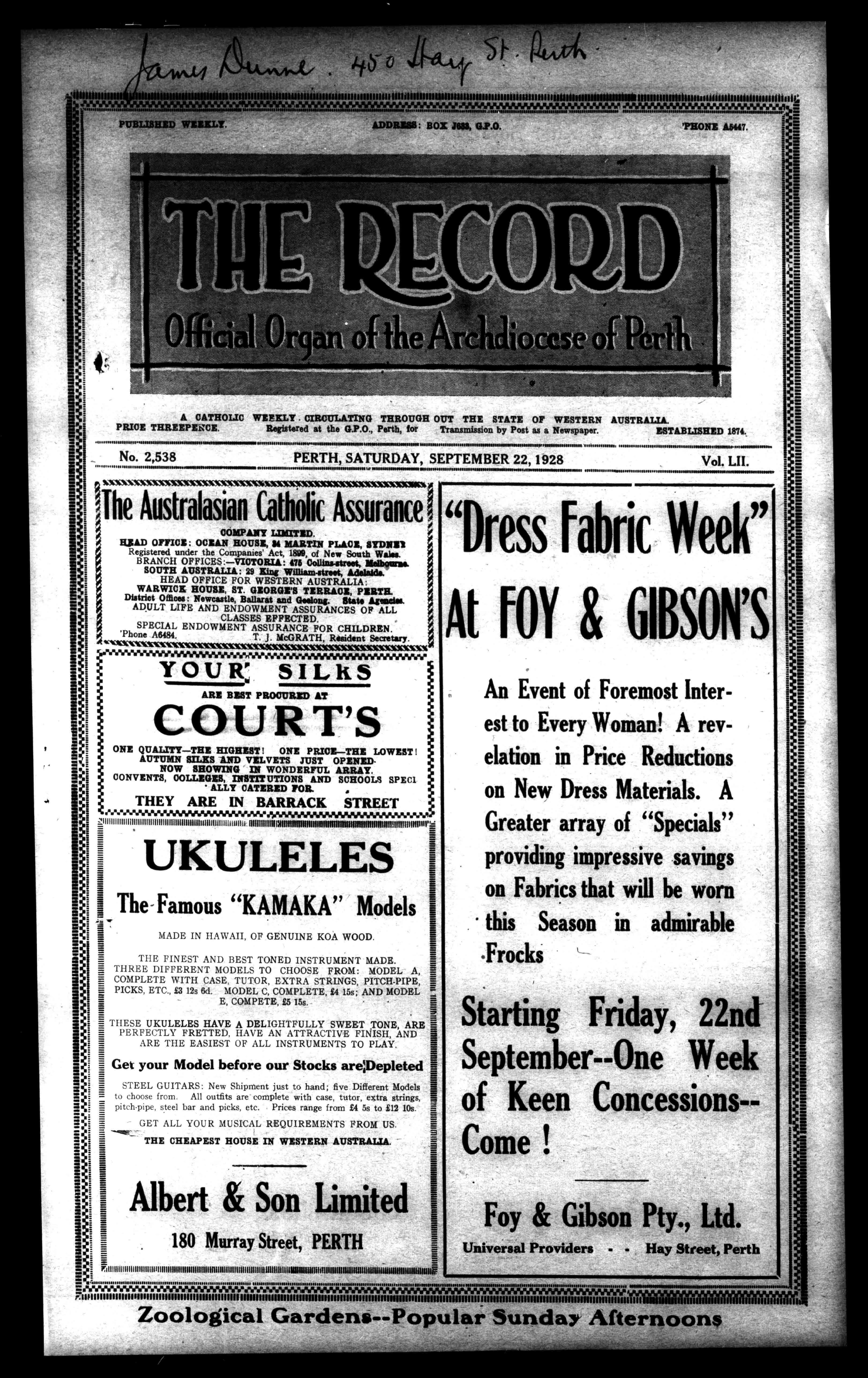 11= Inn UM ale ain tn 3 NMI 3 2 al ADDRESS:BOXMI,G.P.O. 'PHONEW6447. PUBLISHEDWEEKLY J 1141111MIININNOMMINN *newre,..a...,,$.1.fM,.+M1/01,14/IANior.....P., ACATHOLICWEEKLYCIRCULATINGTHROUGHOUTTHESTATEOFWESTERNAUSTRALIA. PRICETHREEPENCE. RegisteredattheG.P.O.,Perth,for TransmissionbyPostasaNewspaper. ESTABLISHED1874. No.2,538 111111111111111111=1,111110 MMIINIIMINI111111111MBNIPMION211111111111 INN PERTH,SATURDAY,SEPTEMBER22,1928 M.****Int11111 PIO 011111108510111 ,TheAustralasianCatholicAssurance COMPANYLIMITED. WADOFFICE:OCEANHOUSE,$4MARTINPLACE,SYDNI1 RegisteredundertheCompanies'Act,1899,ofNewSouthWales. BRANCHOFFICES:-VIOTORIA:476Oallina-street,Melbourne. SOUTHAUSTRALIA:29KingWilliam-street,Adelaide. HEADOFFICEFORWESTERNAUSTRALIA: WARWICKHOUSE,ST.GEORGE'STERRACE,PERTH. DistrictOffices:Newcastle,BallaratandGeelong.StateWeds& ADULTLIFEANDENDOWMENTASSURANCESOFALL CLASSESEFFECTED. SPECIALENDOWMENTASSURANCEFORCHILDREN. 'PhoneA6484, T.J.McGRATH,ResidentSecretary. `.".%.WWWWWWWW.W.WAIS.W.W.WilMile YOUR:SILKS AREBESTPROCUREDAT COURT'S ONEQUALITY-THEHIGHEST!ONEPRICE-THELOWEST! AUTUMNSILKSANDVELVETSJUSTOPENEDNOWSHOWINGINWONDERFULARRAY. CONVENTS,COLLEGES,INSTITUTIONSANDSCHOOLSSPEC1 'ALLYCATEREDFOR. THEYAREINBARRACKSTREET reemeeeedvviremoe.ww...5r.w.ww.r.ww.wpm.w 111111111111111111111111111111111111111111111111ii11131111111iiiilhnummenomminommummommnnummitomm"-7: "; UKULELES a F_ __.I1111111. Vol.LII. 11 TheFamous"KAMAKA"ModelsI = = A = MADEINHAWAII,OFGENUINEKOAWOOD = = = THEFINESTANDBESTTONEDINSTRUMENTMADE. THREEDIFFERENTMODELSTOCHOOSEFROM:MODELA,E =COMPLETEWITHCASE,TUTOR,EXTRASTRINGS,PITCH-PIPE,E -PICKS,ETC.,£312s6d.MODELC,COMPLETE,£415s;ANDMODEL Ei E,COMPETE,£515s. = i 5 = -ATIIESEUKULELESHAVEADELIGHTFULLYSWEETTONE,AREE EPERFECTLYFRETTED,HAVEANATTRACTIVEFINISH,ANDA ARETHEEASIESTOFALLINSTRUMENTSTOPLAY. E = = = a GetyourModelbeforeourStocksare:DepletedE if.-. = ESTEELGUITARS:NewShipmentjusttohand;fiveDifferentModels tr.! E--- tochoosefrom.Alloutfitsarecompletewithcase,tutor,extrastrings,E. Epitch-pipe,steelbarandpicks,etc.Pricesrangefrom£45sto£1210s.= = = -1: GETALLYOURMUSICALREQUIREMENTSFROMUS. = = 3--THECHEAPESTHOUSEINWESTERNAUSTRALIA. a Albert&SonLimitedI 180MurrayStreet,PERTH T,iIIIIIII1111111111111 "DressfabricWeek" AtFOY&GIBSON'S AnEventofForemostInteresttoEveryWoman!ArevelationinPriceReductions onNewDressMaterials.A Greaterarrayof"Specials" providingimpressivesavings onFabricsthatwillbeworn thisSeasoninadmirable Frocks StartingFriday,22nd September--OneWeek ofKeenConcessions-Come! Foy&GibsonPty.,Ltd. UniversalProviders--HayStreet,Perth IMP keremerree.wwwwwwwwweeedweerewererwv.wrimeewwwver ZoologicalGardens--PopularSundayAfternoons ISISISIONN.11111111N0111111111M111.111101111141.11.....1