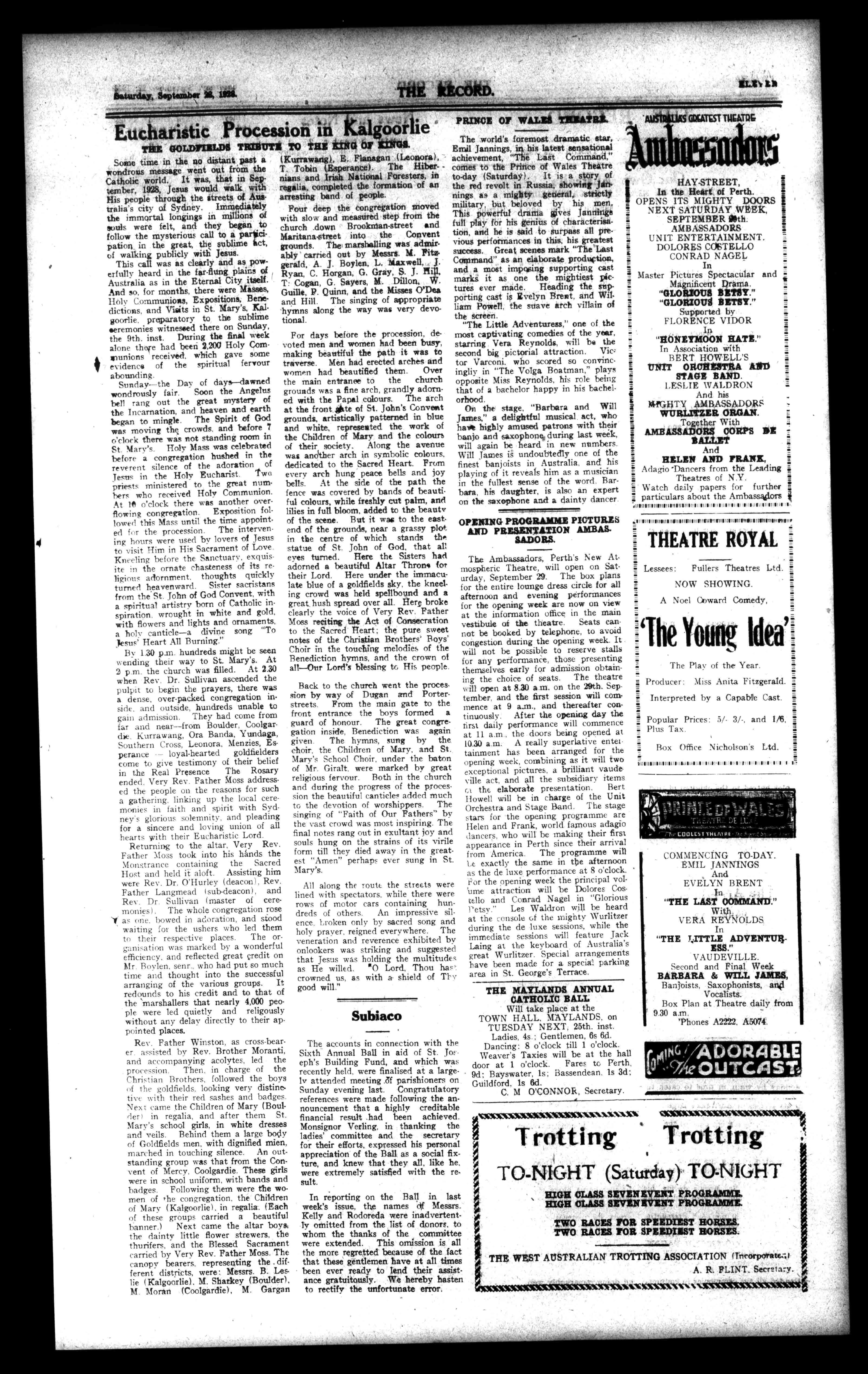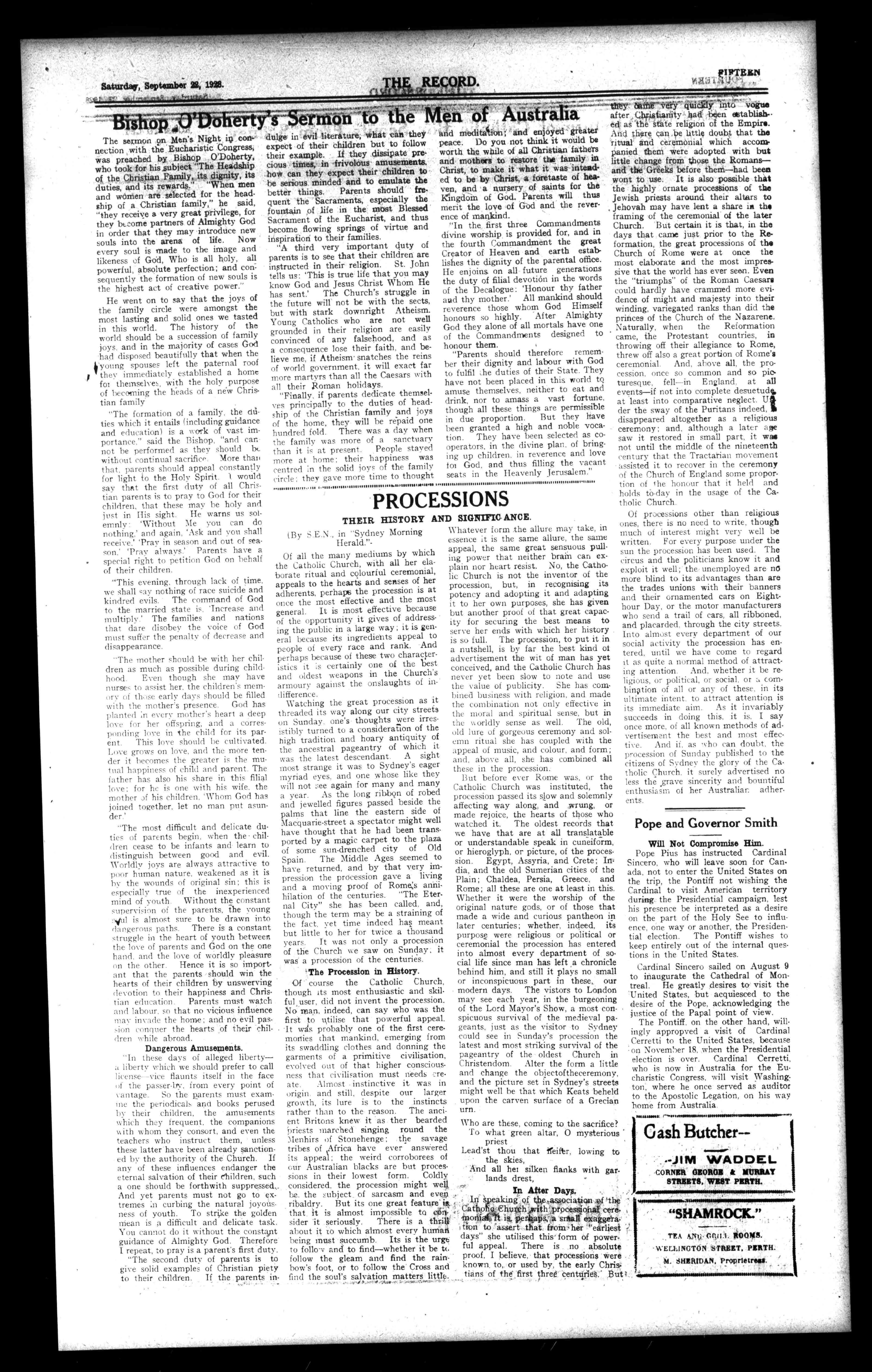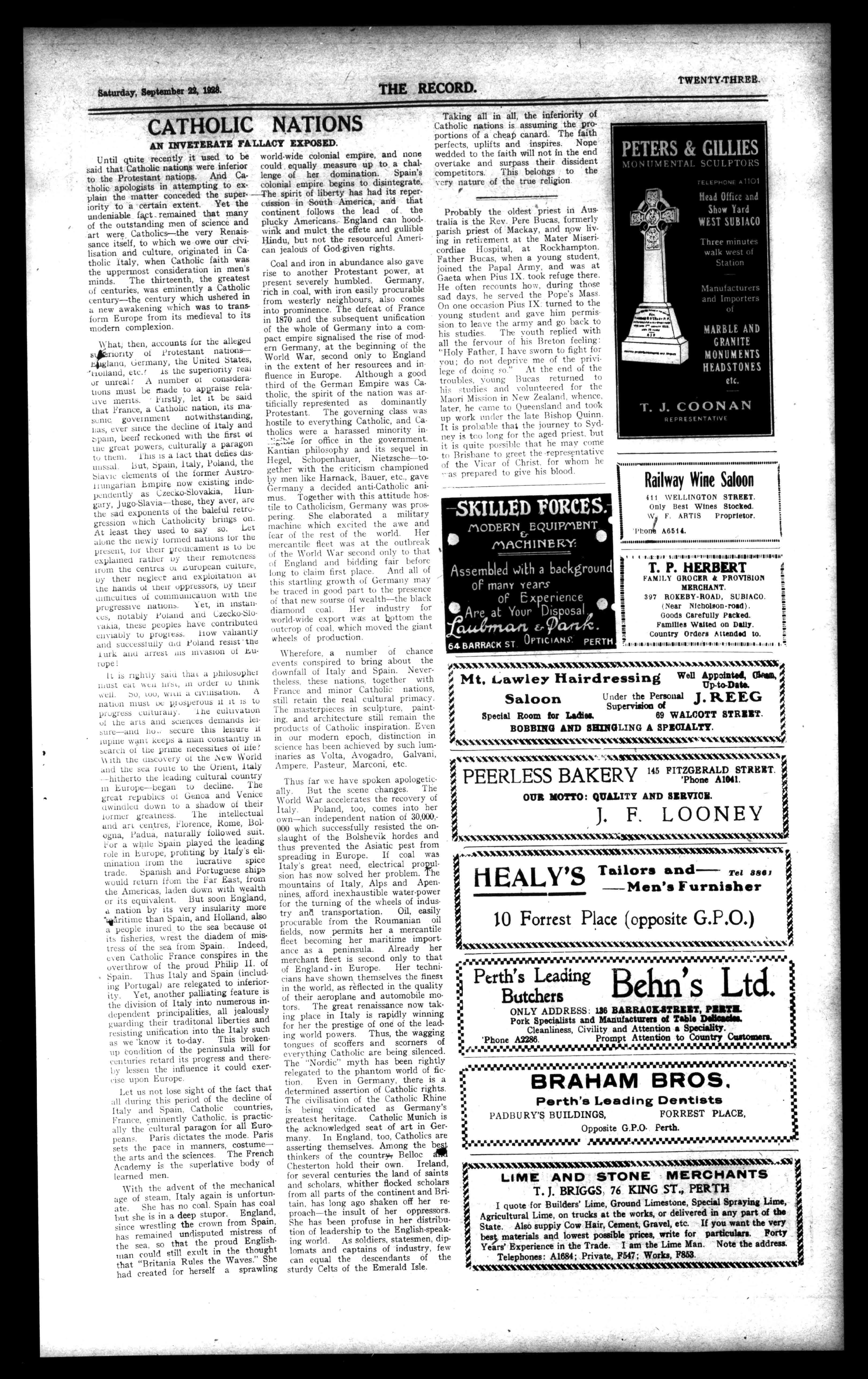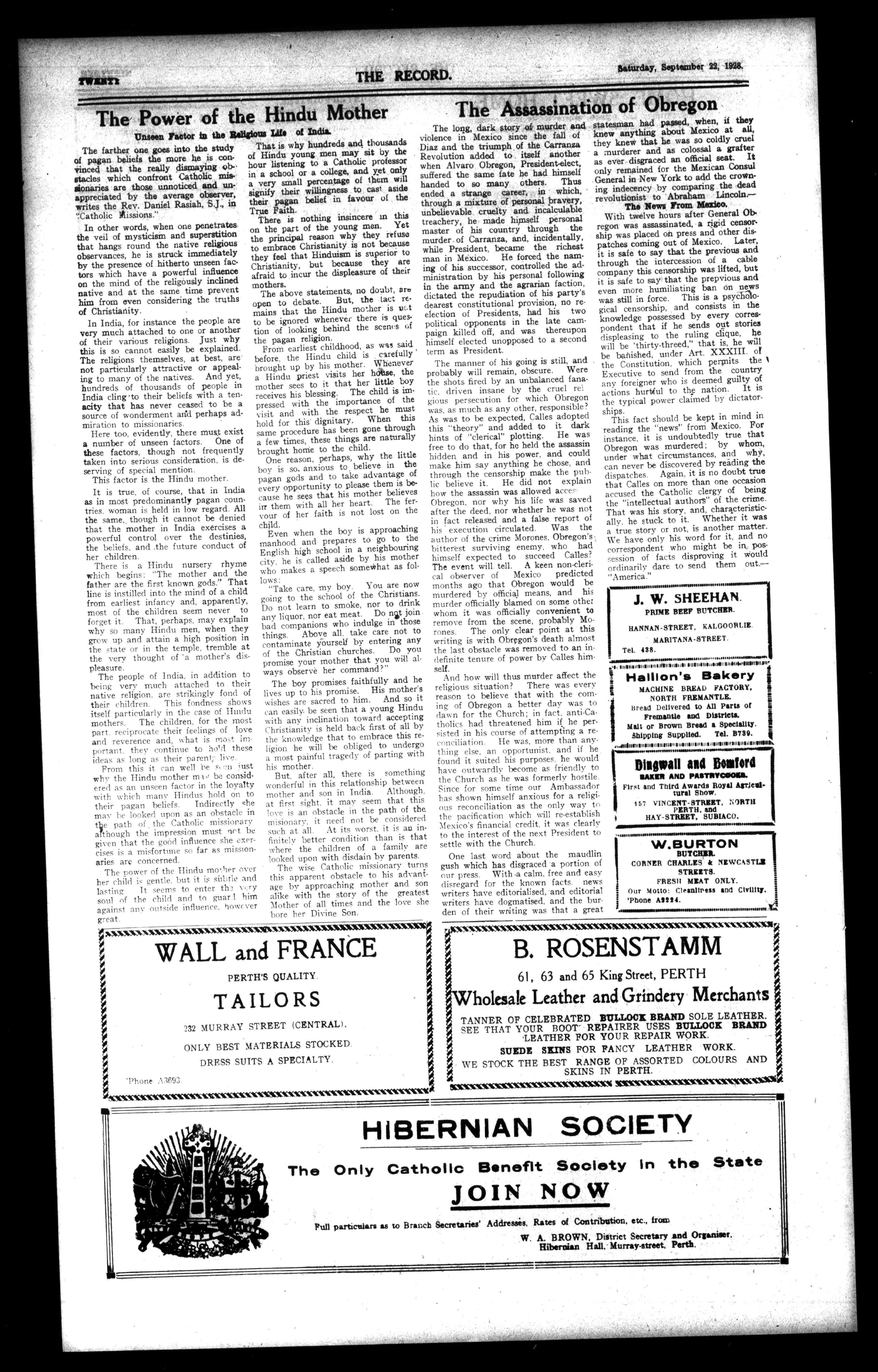 11= Inn UM ale ain tn 3 NMI 3 2 al ADDRESS:BOXMI,G.P.O. 'PHONEW6447. PUBLISHEDWEEKLY J 1141111MIININNOMMINN *newre,..a...,,$.1.fM,.+M1/01,14/IANior.....P., ACATHOLICWEEKLYCIRCULATINGTHROUGHOUTTHESTATEOFWESTERNAUSTRALIA. PRICETHREEPENCE. RegisteredattheG.P.O.,Perth,for TransmissionbyPostasaNewspaper. ESTABLISHED1874. No.2,538 111111111111111111=1,111110 MMIINIIMINI111111111MBNIPMION211111111111 INN PERTH,SATURDAY,SEPTEMBER22,1928 M.****Int11111 PIO 011111108510111 ,TheAustralasianCatholicAssurance COMPANYLIMITED. WADOFFICE:OCEANHOUSE,$4MARTINPLACE,SYDNI1 RegisteredundertheCompanies'Act,1899,ofNewSouthWales. BRANCHOFFICES:-VIOTORIA:476Oallina-street,Melbourne. SOUTHAUSTRALIA:29KingWilliam-street,Adelaide. HEADOFFICEFORWESTERNAUSTRALIA: WARWICKHOUSE,ST.GEORGE'STERRACE,PERTH. DistrictOffices:Newcastle,BallaratandGeelong.StateWeds& ADULTLIFEANDENDOWMENTASSURANCESOFALL CLASSESEFFECTED. SPECIALENDOWMENTASSURANCEFORCHILDREN. 'PhoneA6484, T.J.McGRATH,ResidentSecretary. `.".%.WWWWWWWW.W.WAIS.W.W.WilMile YOUR:SILKS AREBESTPROCUREDAT COURT'S ONEQUALITY-THEHIGHEST!ONEPRICE-THELOWEST! AUTUMNSILKSANDVELVETSJUSTOPENEDNOWSHOWINGINWONDERFULARRAY. CONVENTS,COLLEGES,INSTITUTIONSANDSCHOOLSSPEC1 'ALLYCATEREDFOR. THEYAREINBARRACKSTREET reemeeeedvviremoe.ww...5r.w.ww.r.ww.wpm.w 111111111111111111111111111111111111111111111111ii11131111111iiiilhnummenomminommummommnnummitomm"-7: "; UKULELES a F_ __.I1111111. Vol.LII. 11 TheFamous"KAMAKA"ModelsI = = A = MADEINHAWAII,OFGENUINEKOAWOOD = = = THEFINESTANDBESTTONEDINSTRUMENTMADE. THREEDIFFERENTMODELSTOCHOOSEFROM:MODELA,E =COMPLETEWITHCASE,TUTOR,EXTRASTRINGS,PITCH-PIPE,E -PICKS,ETC.,£312s6d.MODELC,COMPLETE,£415s;ANDMODEL Ei E,COMPETE,£515s. = i 5 = -ATIIESEUKULELESHAVEADELIGHTFULLYSWEETTONE,AREE EPERFECTLYFRETTED,HAVEANATTRACTIVEFINISH,ANDA ARETHEEASIESTOFALLINSTRUMENTSTOPLAY. E = = = a GetyourModelbeforeourStocksare:DepletedE if.-. = ESTEELGUITARS:NewShipmentjusttohand;fiveDifferentModels tr.! E--- tochoosefrom.Alloutfitsarecompletewithcase,tutor,extrastrings,E. Epitch-pipe,steelbarandpicks,etc.Pricesrangefrom£45sto£1210s.= = = -1: GETALLYOURMUSICALREQUIREMENTSFROMUS. = = 3--THECHEAPESTHOUSEINWESTERNAUSTRALIA. a Albert&SonLimitedI 180MurrayStreet,PERTH T,iIIIIIII1111111111111 "DressfabricWeek" AtFOY&GIBSON'S AnEventofForemostInteresttoEveryWoman!ArevelationinPriceReductions onNewDressMaterials.A Greaterarrayof"Specials" providingimpressivesavings onFabricsthatwillbeworn thisSeasoninadmirable Frocks StartingFriday,22nd September--OneWeek ofKeenConcessions-Come! Foy&GibsonPty.,Ltd. UniversalProviders--HayStreet,Perth IMP keremerree.wwwwwwwwweeedweerewererwv.wrimeewwwver ZoologicalGardens--PopularSundayAfternoons ISISISIONN.11111111N0111111111M111.111101111141.11.....1