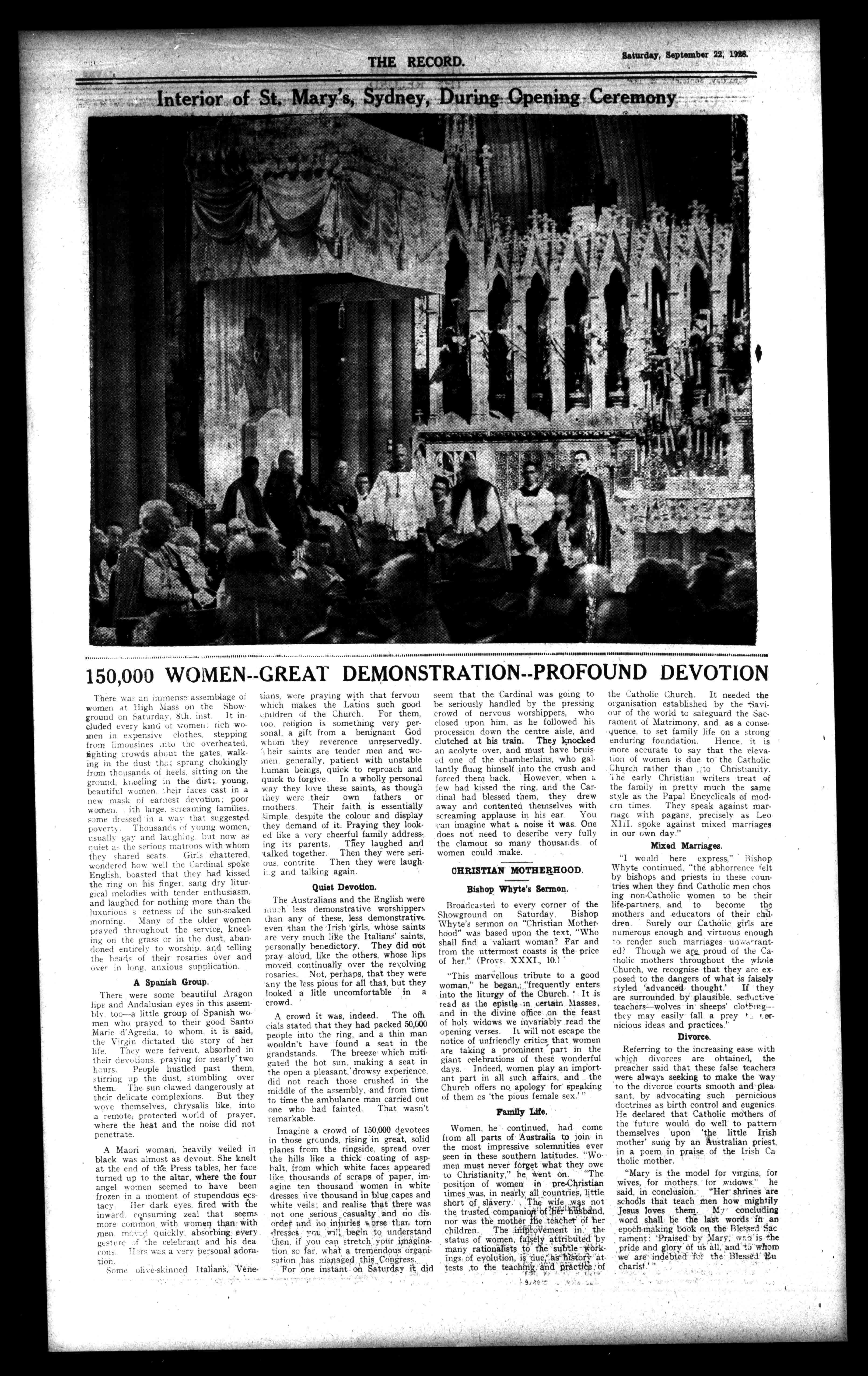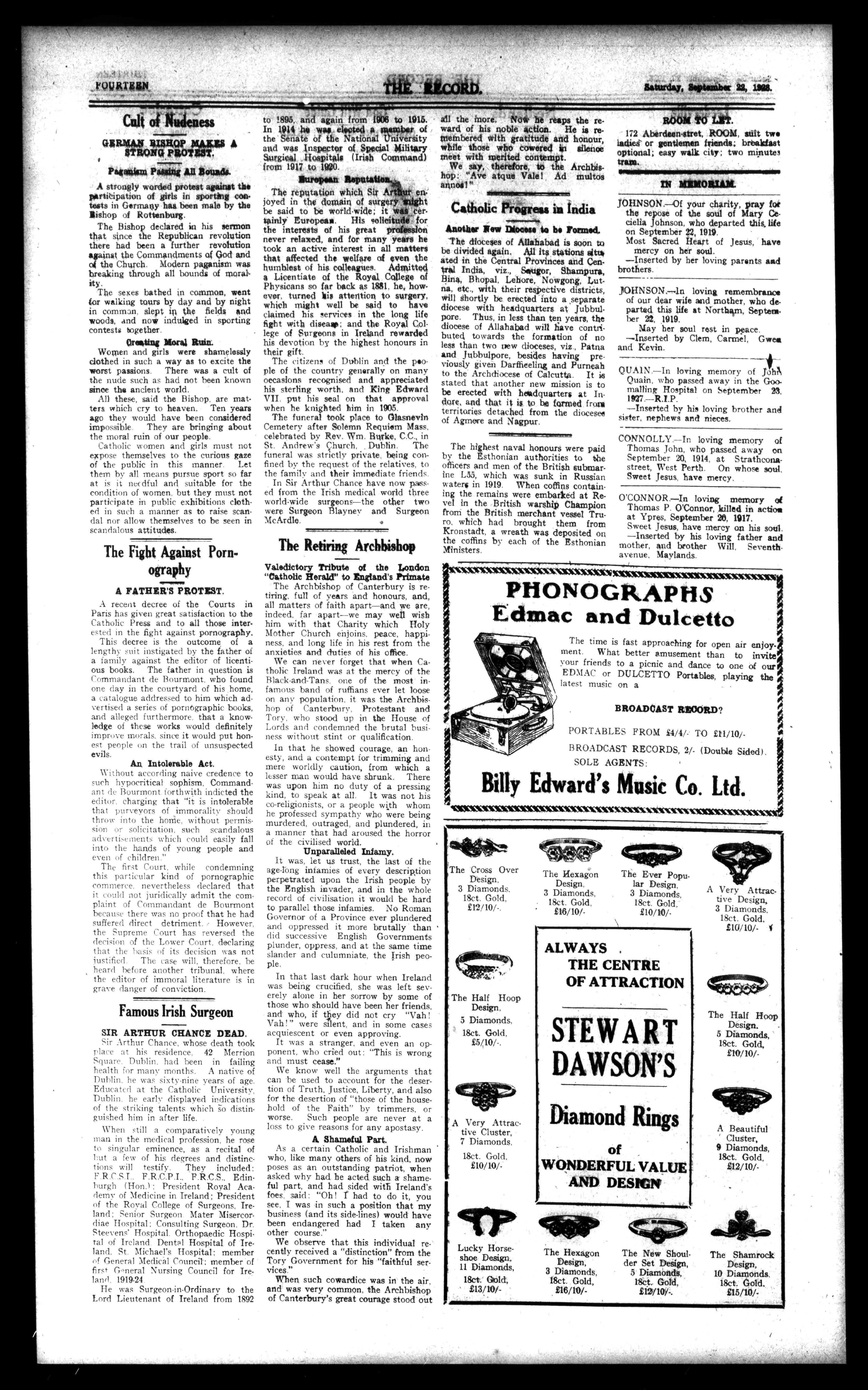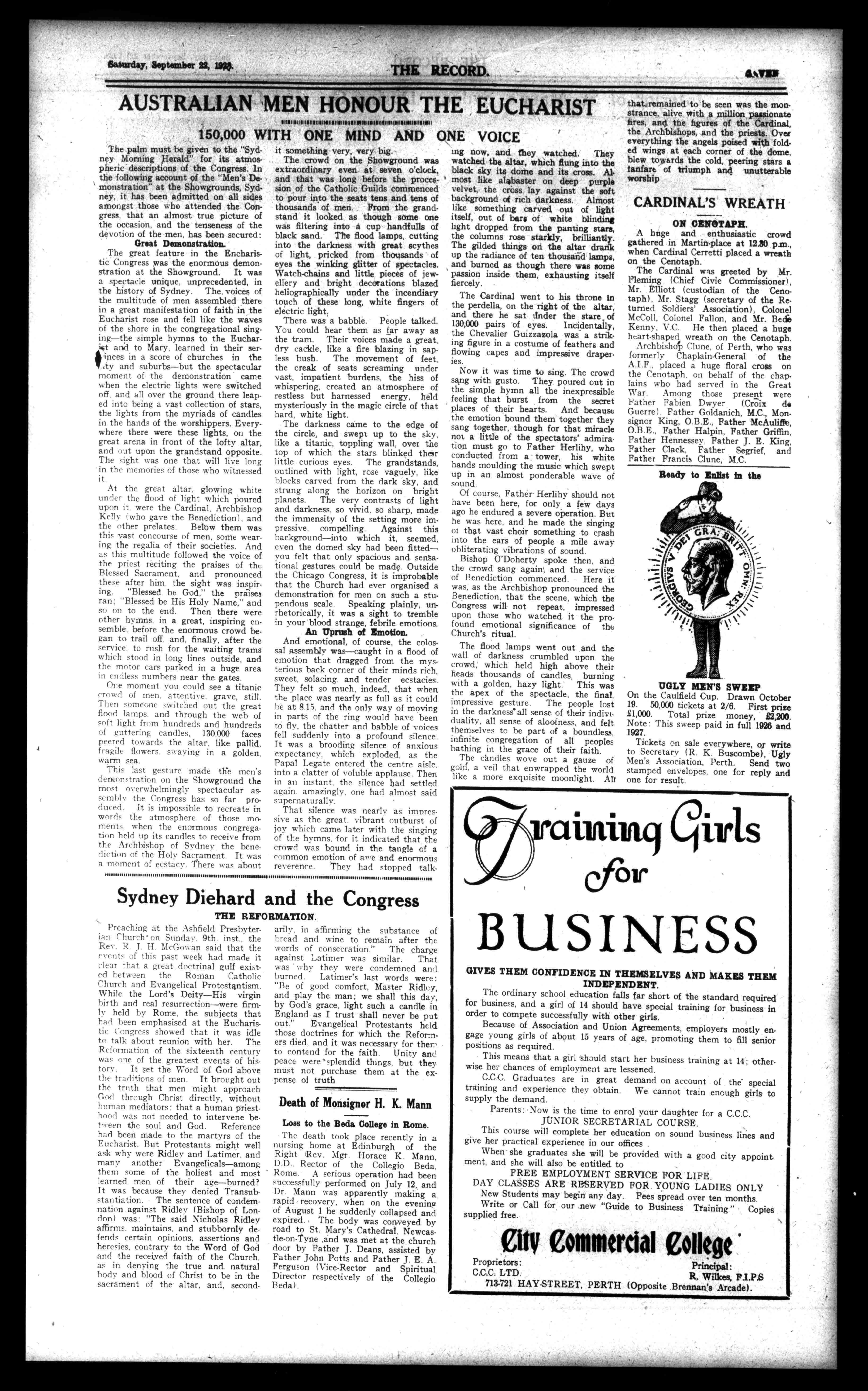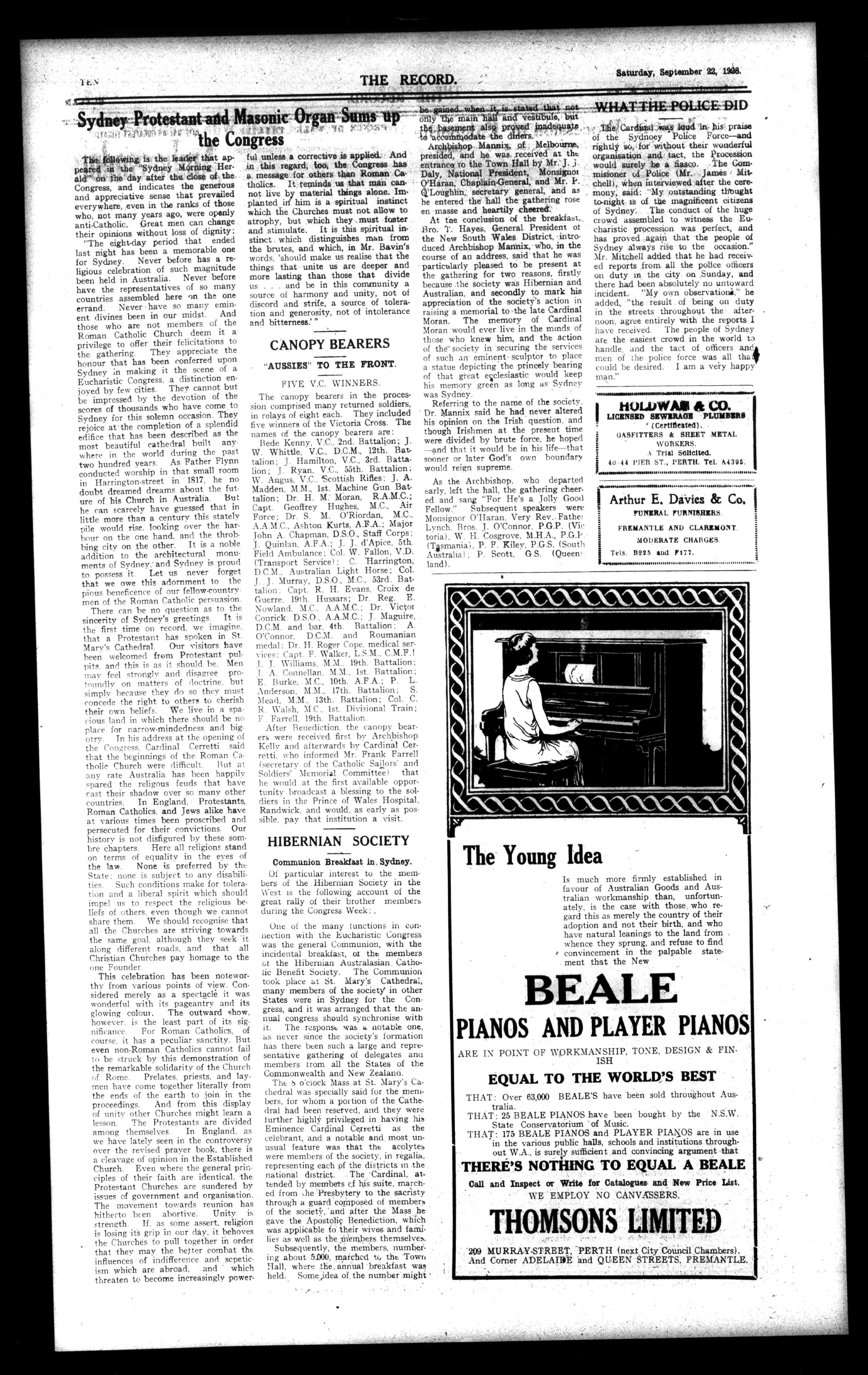 11= Inn UM ale ain tn 3 NMI 3 2 al ADDRESS:BOXMI,G.P.O. 'PHONEW6447. PUBLISHEDWEEKLY J 1141111MIININNOMMINN *newre,..a...,,$.1.fM,.+M1/01,14/IANior.....P., ACATHOLICWEEKLYCIRCULATINGTHROUGHOUTTHESTATEOFWESTERNAUSTRALIA. PRICETHREEPENCE. RegisteredattheG.P.O.,Perth,for TransmissionbyPostasaNewspaper. ESTABLISHED1874. No.2,538 111111111111111111=1,111110 MMIINIIMINI111111111MBNIPMION211111111111 INN PERTH,SATURDAY,SEPTEMBER22,1928 M.****Int11111 PIO 011111108510111 ,TheAustralasianCatholicAssurance COMPANYLIMITED. WADOFFICE:OCEANHOUSE,$4MARTINPLACE,SYDNI1 RegisteredundertheCompanies'Act,1899,ofNewSouthWales. BRANCHOFFICES:-VIOTORIA:476Oallina-street,Melbourne. SOUTHAUSTRALIA:29KingWilliam-street,Adelaide. HEADOFFICEFORWESTERNAUSTRALIA: WARWICKHOUSE,ST.GEORGE'STERRACE,PERTH. DistrictOffices:Newcastle,BallaratandGeelong.StateWeds& ADULTLIFEANDENDOWMENTASSURANCESOFALL CLASSESEFFECTED. SPECIALENDOWMENTASSURANCEFORCHILDREN. 'PhoneA6484, T.J.McGRATH,ResidentSecretary. `.".%.WWWWWWWW.W.WAIS.W.W.WilMile YOUR:SILKS AREBESTPROCUREDAT COURT'S ONEQUALITY-THEHIGHEST!ONEPRICE-THELOWEST! AUTUMNSILKSANDVELVETSJUSTOPENEDNOWSHOWINGINWONDERFULARRAY. CONVENTS,COLLEGES,INSTITUTIONSANDSCHOOLSSPEC1 'ALLYCATEREDFOR. THEYAREINBARRACKSTREET reemeeeedvviremoe.ww...5r.w.ww.r.ww.wpm.w 111111111111111111111111111111111111111111111111ii11131111111iiiilhnummenomminommummommnnummitomm"-7: "; UKULELES a F_ __.I1111111. Vol.LII. 11 TheFamous"KAMAKA"ModelsI = = A = MADEINHAWAII,OFGENUINEKOAWOOD = = = THEFINESTANDBESTTONEDINSTRUMENTMADE. THREEDIFFERENTMODELSTOCHOOSEFROM:MODELA,E =COMPLETEWITHCASE,TUTOR,EXTRASTRINGS,PITCH-PIPE,E -PICKS,ETC.,£312s6d.MODELC,COMPLETE,£415s;ANDMODEL Ei E,COMPETE,£515s. = i 5 = -ATIIESEUKULELESHAVEADELIGHTFULLYSWEETTONE,AREE EPERFECTLYFRETTED,HAVEANATTRACTIVEFINISH,ANDA ARETHEEASIESTOFALLINSTRUMENTSTOPLAY. E = = = a GetyourModelbeforeourStocksare:DepletedE if.-. = ESTEELGUITARS:NewShipmentjusttohand;fiveDifferentModels tr.! E--- tochoosefrom.Alloutfitsarecompletewithcase,tutor,extrastrings,E. Epitch-pipe,steelbarandpicks,etc.Pricesrangefrom£45sto£1210s.= = = -1: GETALLYOURMUSICALREQUIREMENTSFROMUS. = = 3--THECHEAPESTHOUSEINWESTERNAUSTRALIA. a Albert&SonLimitedI 180MurrayStreet,PERTH T,iIIIIIII1111111111111 "DressfabricWeek" AtFOY&GIBSON'S AnEventofForemostInteresttoEveryWoman!ArevelationinPriceReductions onNewDressMaterials.A Greaterarrayof"Specials" providingimpressivesavings onFabricsthatwillbeworn thisSeasoninadmirable Frocks StartingFriday,22nd September--OneWeek ofKeenConcessions-Come! Foy&GibsonPty.,Ltd. UniversalProviders--HayStreet,Perth IMP keremerree.wwwwwwwwweeedweerewererwv.wrimeewwwver ZoologicalGardens--PopularSundayAfternoons ISISISIONN.11111111N0111111111M111.111101111141.11.....1