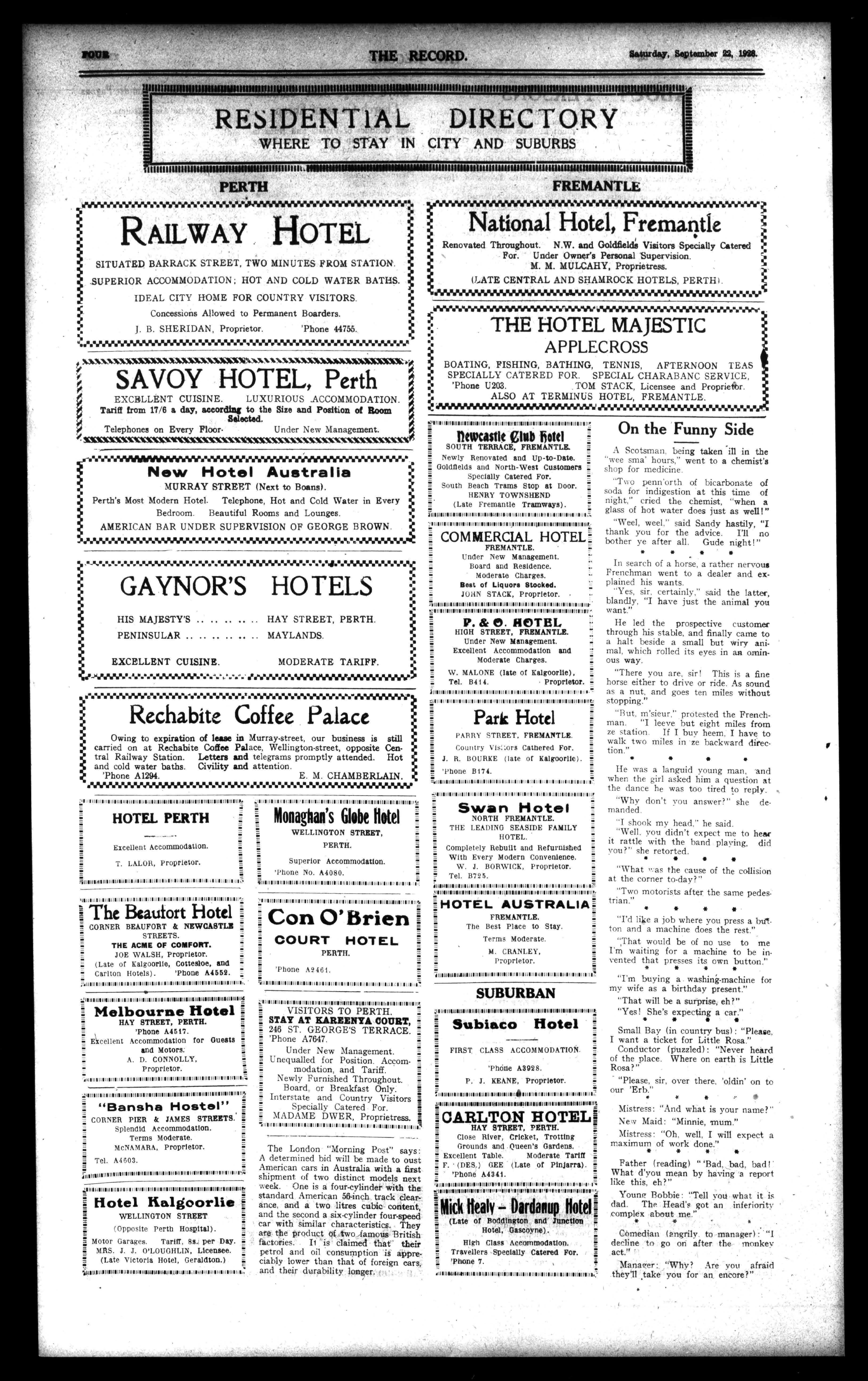CRACTICALCOACHPAINTER. 'PhoneA5370. ..161111111.111181111.1111111114.1. .epeinieessone G.LDINES. PIANOkORGANTIMM 16DUNCANSTRIPY, VICTORIAPARE Tel.A1474. ..MMOND1111 P.J.HEVRON. customs.SloppingandForwarding Agents.GeneralCarriers. l'HILLIMORECHAMBERS, FREMANTLE. Tel.5177. ailabc1111411111111m.., THEW.A.DAIRYL THEW.A.DAIRY,Warineroo-road. osoornePark.t,.Keane.Piro MilkDeliveredTwiceGailytosay partoftheCity,directfromourown cowstocustomers.Tel.24E11. SupplyingtheConsentssadComer. Customs,ShippingandPore/area. ...MMIMEMIMMIIMONIMMI..4.1111.4441MIon R TheOPTICIANLTD. 263 MurraySt.Perth ,04%%%,000..0k go.\\%...\\ .1,% % Chas.Burrowes PRINTING& STATIONERY. COMMERCIAL&GENERALPRINTING&STATIONERYOF EVERYDESCRIPTION. CAXTONPRESS. 41HIGHSTREET,FREMANTLE(OppositeWestAustralianBank). 'PhoneB1083. IINCISWCICINIVICISISICIIMILWEIMENSINCIHNSIIIMICILWorerocioma FREDFLYNN,lateJ.J.Snigg 106BARRACKSTREET. CLOTHIERANDOUTFITTER. THELATESTINSHIRTS,HATS,TIES,ANDMEN'SSUITS,ETC. Established25Years. FredCarriesaLargeStockofWorkingMen'sClothes.'PhoneA4717. TheSwanEmploymentAgency WOODSCHAMBERS,544HAYSTREET,PERTH,W.A. MRS.WATSON,Secretary. PhoneA2533. sPARAWWWWANAPAW'-,."..WOMANYWOMMAY.W.'145: