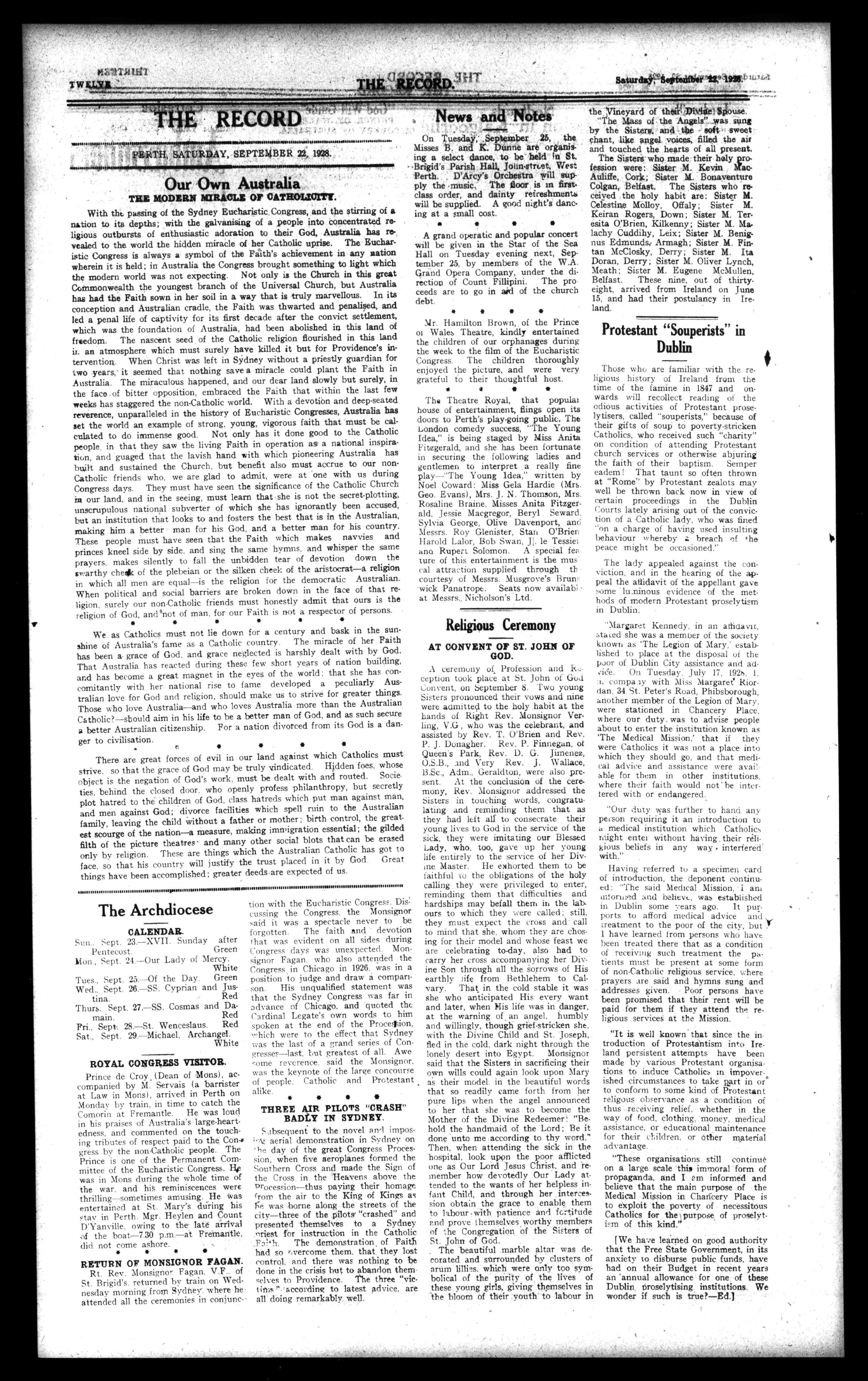 WhenArchbishopRedwood,then bishop,waspayinga:pastoralvisitto Taranaki,aportionofhisvastNew Zealanddiocese,'anIrishmoper broughtherchildtotheprelatetobe blessed.Little(saystheSydney "MorningHerald")didthenowaged Metropolitanthenrealisethatthebabe wouldonedaybehiscoadjutor. ThoughSanFranciscoborn,Dr. O'Shea,CoadjutorArchbishopofWellington,NewZealand,canclaimtobe agoodNewZealander,andhedoesso quiteproudly.OnarrivalbytheMakurainSydneyrecentlytojoinhisecclesiasticalheadfortheCongress,he wasaccompaniedbythreebishopsof theNewZealandsisterChurchanda largepartyofpriests.TheDominion'sdelegation,heannounced,would exceed1,000persons,manyofwhom havealreadyarrivedinSydney.The factthathetravelledtoAustrqliawith ArchbishopHanna,ofSanFrancisco, wasanadditionalpleasuretoArchbishopO'Shea.NotonlyistheAmericanprelateArchbishopofDr.O'Shea's nativecity,butheisalsoafriendof manyyears'standing,andisheldin affectionateregardbytheNewZealandArchbishop.Dr.O'Shea,as.a matteroffact,waspresentatDr.Hanna'sinstallationatSanFranciscoCathedral13yearsago.Itisfouryears sincehe,waslastinSydney.AccompanyinghimwasoneAustralian-born Bishop,Dr.Whyte,ofDunedin.Others wereBishopBrodie,ofChristchurch, andBishopListon,CoadjutorBishop ofAuckland.Dr.Cleary,Bishopof Auckland,wasunabletocome,the Archbishopexplained,owingtothe factthathehasnotyetrecovered fromtheeffectsofhisrecentserious motoraccident,whichtookplacewhen hewastravellingrecentlywithFather Martindale,thedistinguishedEnglish priestandscholar,nowinSydneyfor theCongress.ArchbishopO'Sheawas delightedtolearn,however.thatthe SouthernCrosswastocarryonits flighttoNewZealandanautograph letterandphotographfromhisEminencetheCardinalLegate(Dr.Cerretti) fortheinjuredbishop