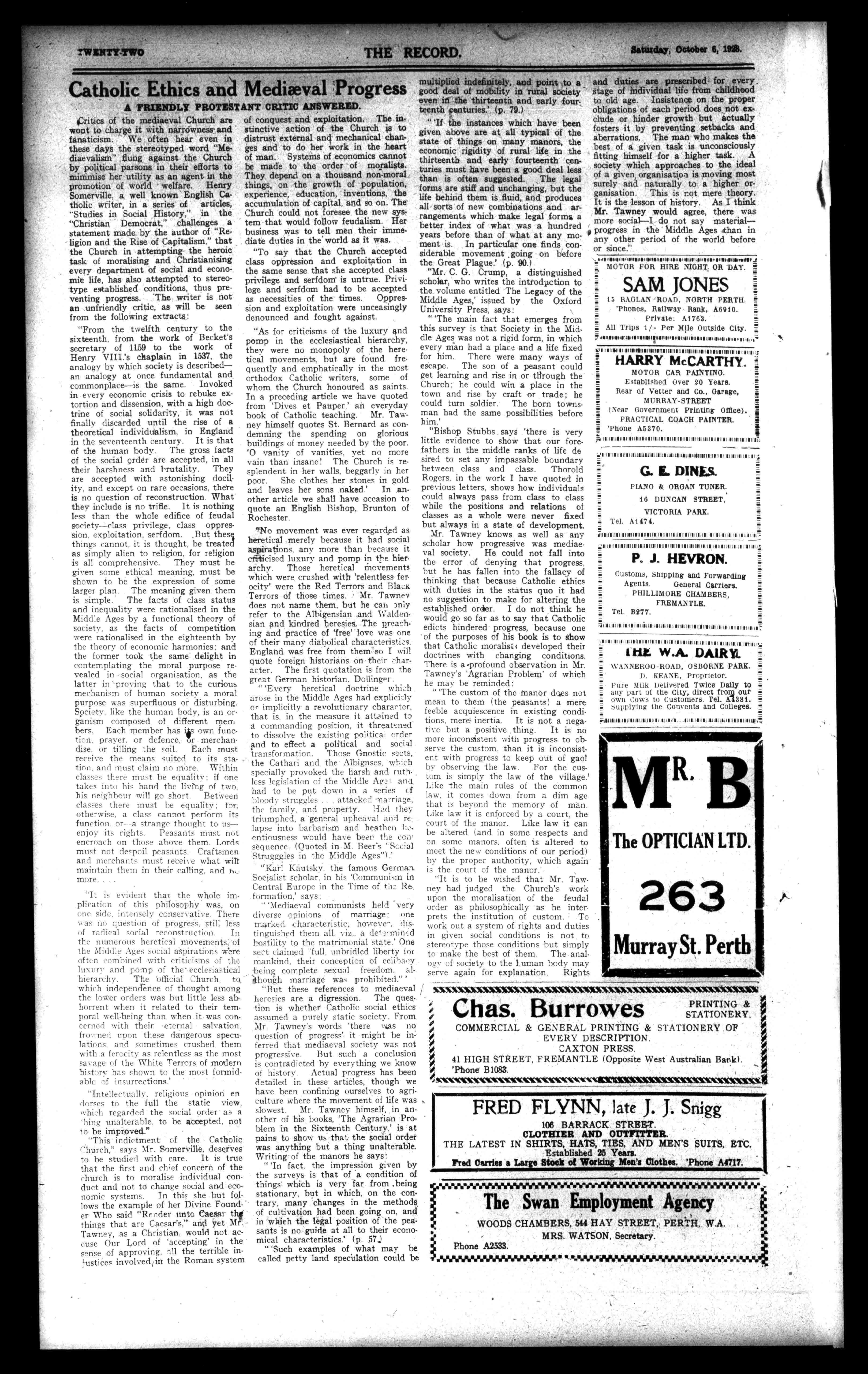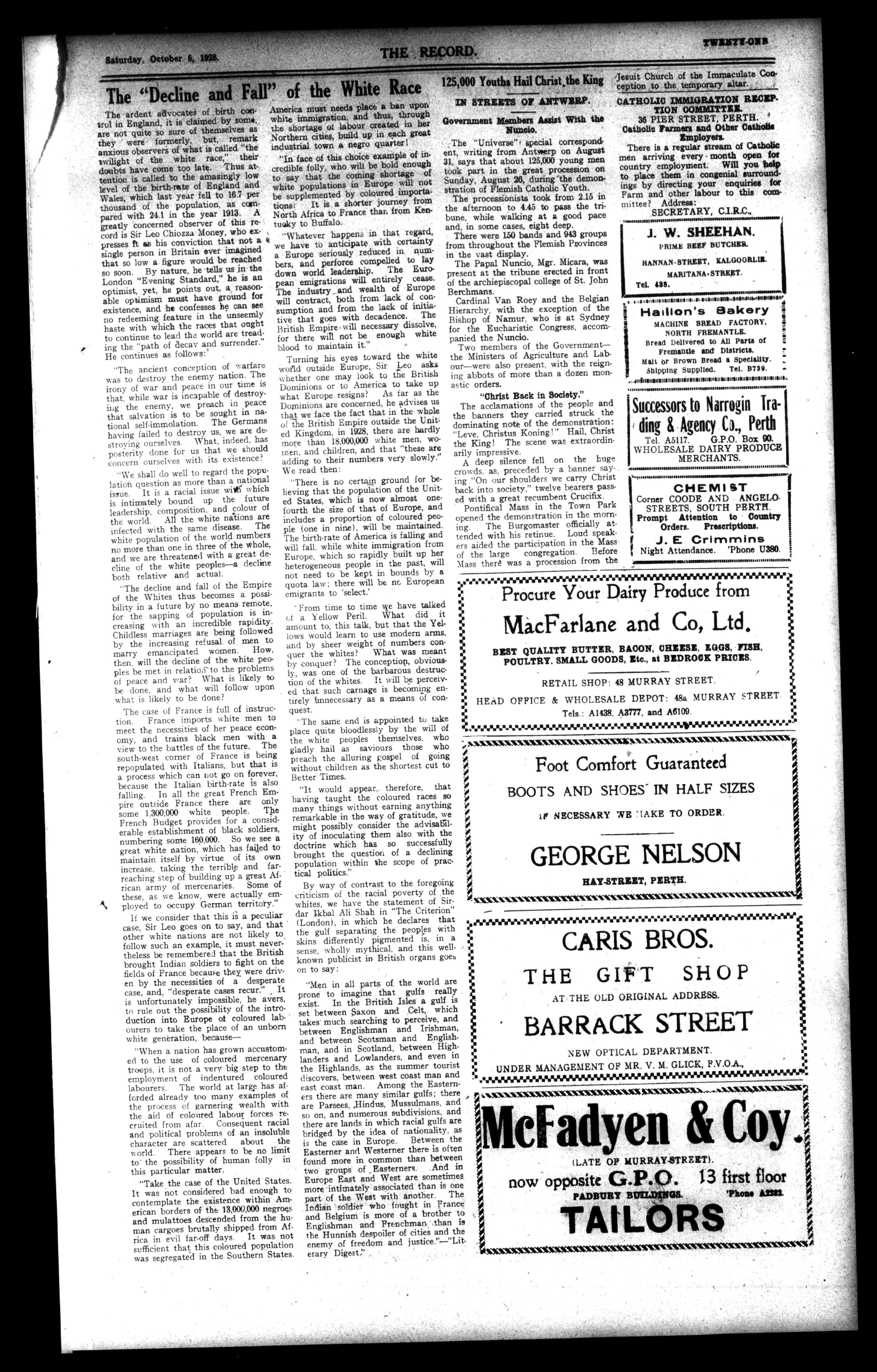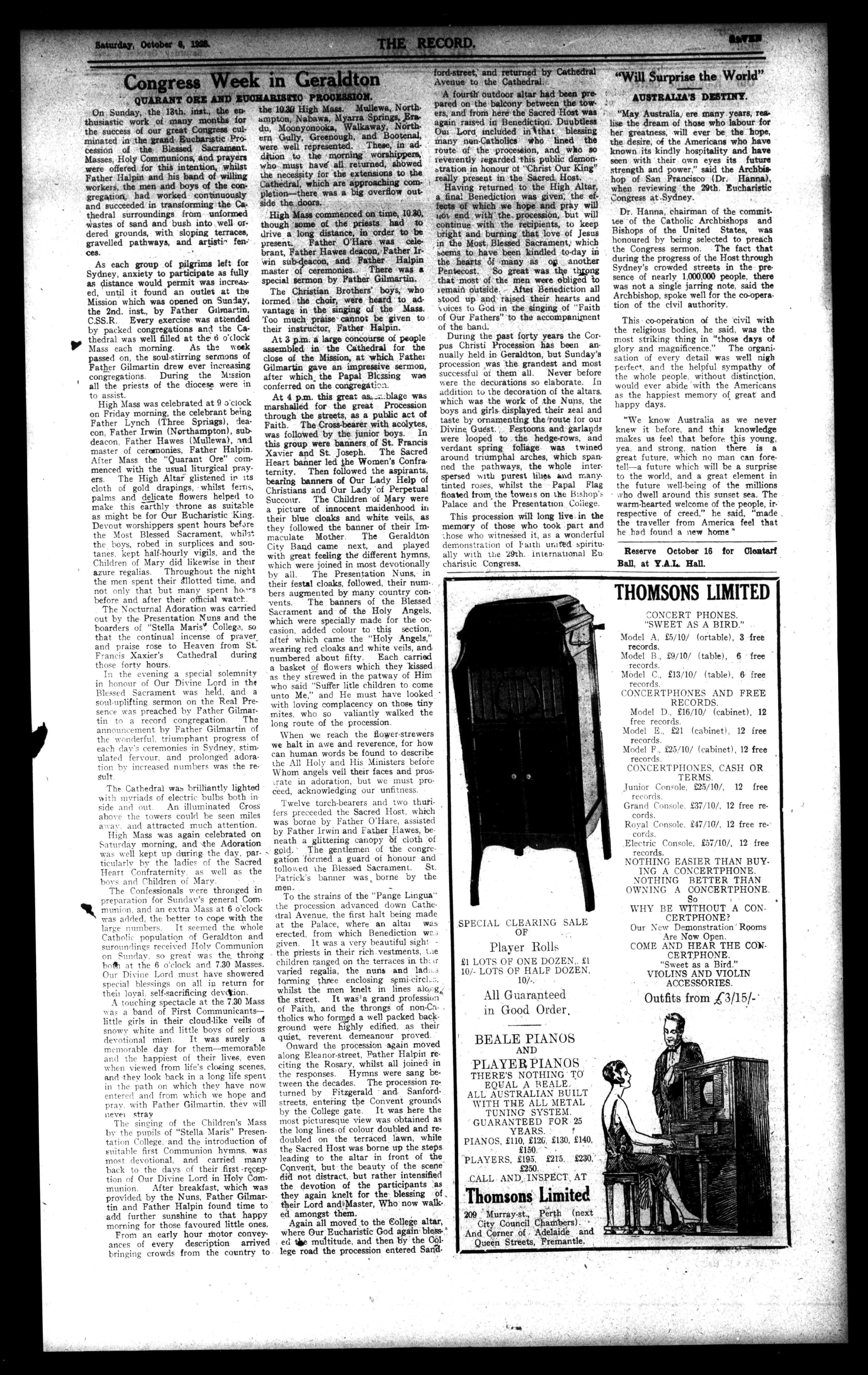 THERECORD. Saturday,October6,1928. NewHospitalofSt.JohnofGod SUBIACO. SPLENDIDUP-TODATEACCOMMODATION. ClosetoSubiacoandLeedervilleRailwayStations. PatientsMaySelectThedrOwnMedicalAdvisers. TERMSMODERATE.PRIVATEROOMSAVAILABLE. OPENTOALLDENOMINATIONS.ForTermsApplytoRev.Mother. TheSistersalsoConductaSplendidlyEquippedHospitalatKalgoorlie. TheColonialMutualFireInsurance COMPANYLINIITED FIRE,MARINE,ACCIDENT,WORKERS'COMPENSATION, EMPLOYERS'LIABILITY. HAYSTACKS,GROWINGCROPS,ANDLIVESTOCK ASPECIALTY. E.MIDWOOD,Manager. BARRACKSTREET,PERTH. ApplicationsInvitedforAgenciesinDistrictsWhereNotAlready Represented. Ifyoucan'tget SwanBitter whereyougo, gowhereyouCANgetit! AskforSWANBITTERon Draught WOOL,SHEEPSKINS,HIDES,TALLOW,KANGAROOANDFUR SKINSBOUGHTINANYQUANTITYBYCHARLESHORMANNtFREMANTLE CONSIGNREGULARLY.PROMPTCASHONDELIVERY. NOCOMMISSIONCHARGED. BoxallandLynch Dentists NewPremises MOANACHAMBERS HayStreet,nearBarrackStreet Mr.W.BoxallCanbeConsultedPersonally OurLadyofMercy'sCollege,VictoriaPark CONDUCTEDBYTBILSISTERSOFMERCY. LocationUnsurpassedforConvenience,Healthfulness,andBeauty. BoardingandDaySchoolforYoungLadiesandLittleGirls. ForParticularsApply.totheMotherSuperior. I BUYINGLARGELY FROMTHEWORLD'SFINESTSOURCESOFSUPPLY SELLINGDIRECT THROUGHTHRMAIBIGSTORES. CharlieCarterLtd, CANANDDOESSELLTHEFINESTGROCERIESATTHE LOWESTRATESINWESTERNAUSTRALIA. NOMATTERWHEREYOULIVE,JUSTSENDYOURORDER,AND ITWILLRECEIVEPROMPTANDCOURTEOUSATTENTION. THREEBIGSTORES 556HAYST.and111BARRACKST.,PERTH 41MARKETST.,FREMANTLE WoodSonsNewTea IsDistinctiveinQuality.OrderTo-day BLENDEDANDPACKEDINOURWAREHOUSE,FREMANTLE. ChristianBrothers'College,Perth BOARDINGANDDAYSCHOOL. BOYSAREADMITTEDATANYTIMEDURING THETERM. COMMERCIALWORKASPECIALTY. ForParticularsApplytoTHEPRINCIPAL. St.Ildephonsus'College NEWNORMA. CONDUCTEDBYTHEMARISTBROTHERS. FORTERMSANDFULLPARTICULARS,APPLYTO THEBROTHERPRINCIPAL. BOWRA&O'DEA,Undertakers GeneralFuneralFurnishers MOTORVEHICLES FUNERALSCONDUCTEDINANYPARTOFTHESTATE. NotetheAddress-195PierStreetPERTH 'Phone,A4308;Private'Phones:A2938andA3376. PrintedandPublishedfortheRomanCatholicArchbishopofPerth,byTHOMASSLATTERY,450Hay-street,Perth.