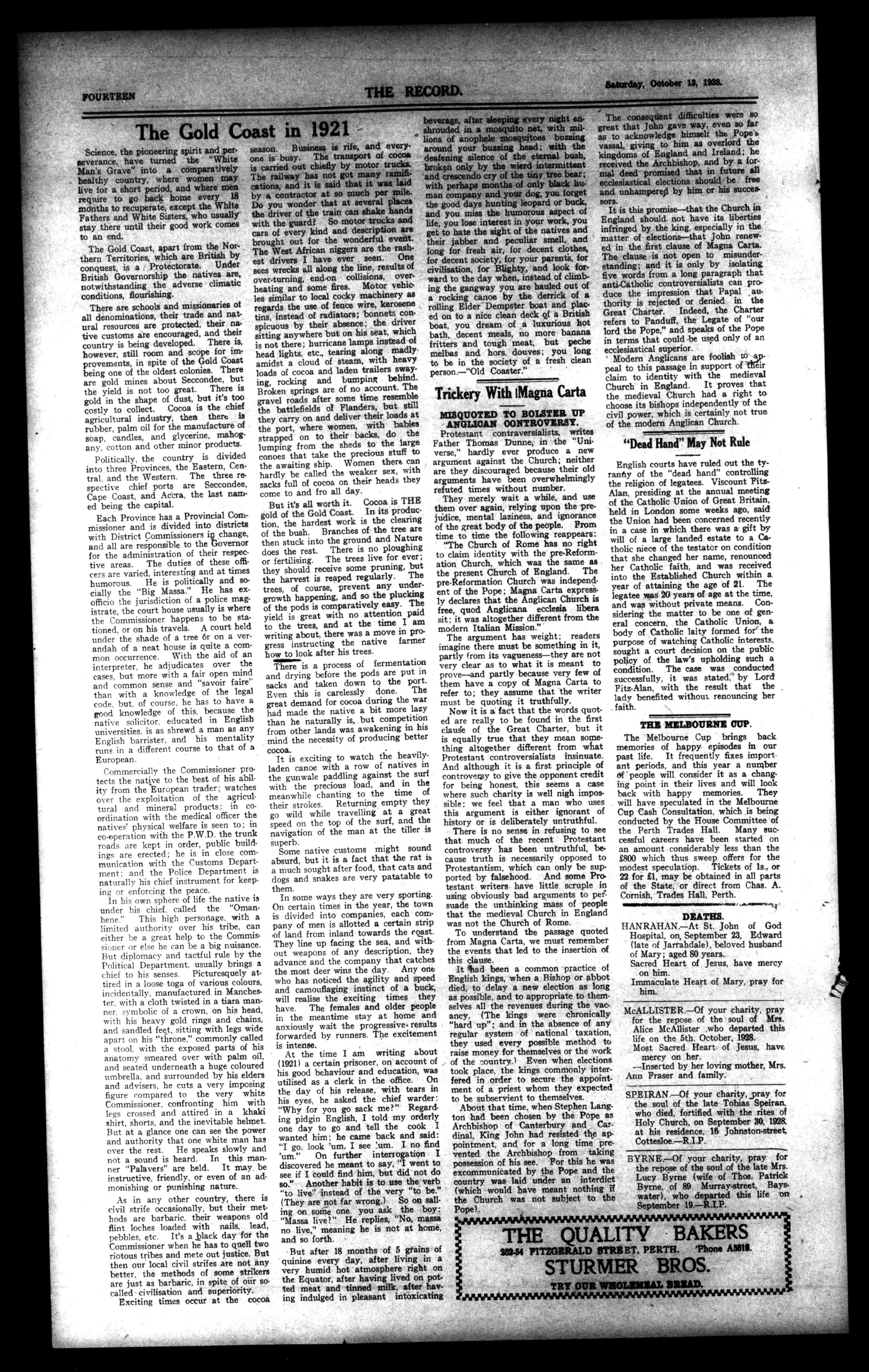,(Aktk goi wl "Y.V.."1"44011:12.1.168"MelageilinnWid"Vinnnon......nnnnnaltlllltlttnnw.nnamnunnnonnnnonnsinn "e6WAWMANIMMAririnnuweinur 2 2 eme, PUBLISHED.WEEKLY. ADDRESS:BOXJ6$$G.P.O. 'PHONEA5447. ,...e.eleGoto..A.Meeemadulemo.:01111.1111....,10Mtor. PRICETHREEPERCE. RegisteredattheG.P.O.,Perth,for issionbyPostasaNewspaper. ACATHOLICWEEKLYCIRCULATINGTHROUGHOUTTHESTATEOFWESTERNAUSTRALIA. ESTABLISHED1874. No.2,541oles$1111.11.Mellon mononomeromonoolonovamommosoi MOMS. moll. PERTH,SATURDAY,OCTOBER13,1928 inemeemoll 11111tNllMOOMPOIMPINMONIMINnl .111.111erierteMont XXXXXXIMS,W1006.1011010M heAustralasianiatholicAssurance 0031PANY-UNITED. RIADOFFICE:OCEANHOUSE,34MARTINPLACE,SYDNEY RegisteredundertheCompanies'Act,1899,ofNewSouthWales. BRANCHOFFICES:-VICTORIA:4750oUineotreet,Melbeamee. SOUTHAUSTRALIA29KingWilliam-street,Adelaide. HEADOFFICEFORWESTERNAUSTRALIA: WARWICKHOUSE,ST.GEORGE'STERRACE,PERTH. DistrictOffices:Newcastle,BallaratandGeelong.StateAglataila ADULTLIFEANDENDOWMENTASSURANCESOFALL CLASSESEFFECTED. SPECIALENDOWMENTASSURANCEFORCHILDREN. 'PhoneA6484. T.J.McGRATH,ResidentSecretary. YOURSILKS AREBESTPROCUREDAT COURT'S ONEQUALITY-THEHIGHEST!ONEPRICE-THELOWEST! AUTUMNSILKSANDVELVETSJUSTOPENEDNOWSHOWINGINWONDERFULARRAY. CONVENTS,COLLEGES,INSTITUTIONSANDSCHOOLSSPECIALLYCATEREDFOR. THEYAREINBARRACKSTREET mum!mmilmmminnummminnimmimnimminimintr, IfitisEATABLE then E. JOHNWILLS Grocery,DairyProduce,Fruit,Vegetable,Cake, Confectionery,HandyFoods to OMINeneilinovo Vol.LII. 1111 nomoneenommonmeneennnuninenno sInd= B B 419WellingtonStreet,City niIIIIIIIIIIIIMIIIIIIIII11111111111111111111111111111111111111111111111111111M1111111 1N111111141111111111111111111111011111111111111111111111111aYouareinvitedtovisit WILLSGOOD HOUSE.' ThislargeWarehouseoffourfloors-comprisingover23,000feetofg floorspace-isespeciallyadaptedtohandleyourprovisionOrders. E Convenientlysituated-oppositeCentralRailwayStation. LeaveyourShoppingCases-Yourorderwillbepackedreadyfor.you -A IfunabletoShopPersonallyPOST YOUR ORDER. FullValuetoEveryCustomer. MoreEveryHundredthOrderreceivedbyPostissuppliedFREE CountryOrdersareDespatchedPromptly. POST,'PHONE,ORLEAVEYOURNEXTORDER YouwillbePleased! JohnWillsandCo.Ltd. AnAnnouncementofExtraordinaryInterest AlFOY&GIBSON'S StartingFriday,October12,1928 "Anniversary Celebration Week" The33rdAnniversaryofWestern Australia'sGreatestBusinesswith AstoundingPriceReductions-worthyofthisuniqueevent. WATCHDAILYPAPERS Foy&GibsonPty.,Ltd. UniversalProviders -HayStreet,Perth 3 = fin E.:....-Arehmerewwwwwwwwreee -edwineedirmwrAmmreem rmiliammanomanammammammunanamannannanammammanannemmensaamanammaanammanamaname= ZoologicalGardens--PopularSundayAfternoons