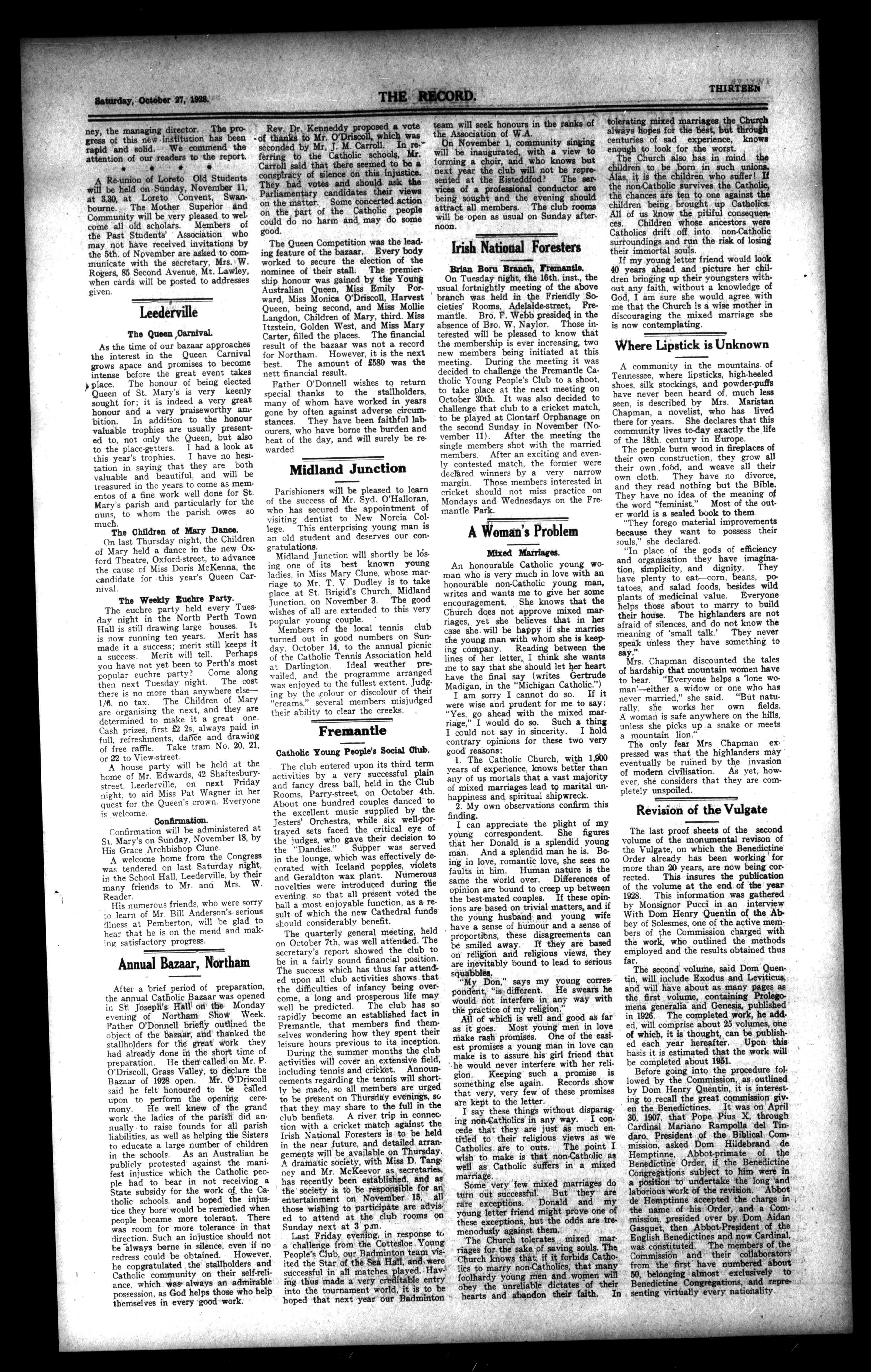 AsthesplendidCatholicpeopleof America,springingfromvariousCatholicpeoplesofEurope,havegraduallyevolvedadistinct,thoughtruly Catholictype,sotheCatholicpeopleof Australia,descendingchieflyfromIrish stock,havegraduallystampedacharacteristicimpressontheCatholicism theycherishsodearly.Speakingon thismatterontheoccasionofthe Month'sMindforthevenerableArchbishopCarr,HisGraceArchbishop Mannixsaid: