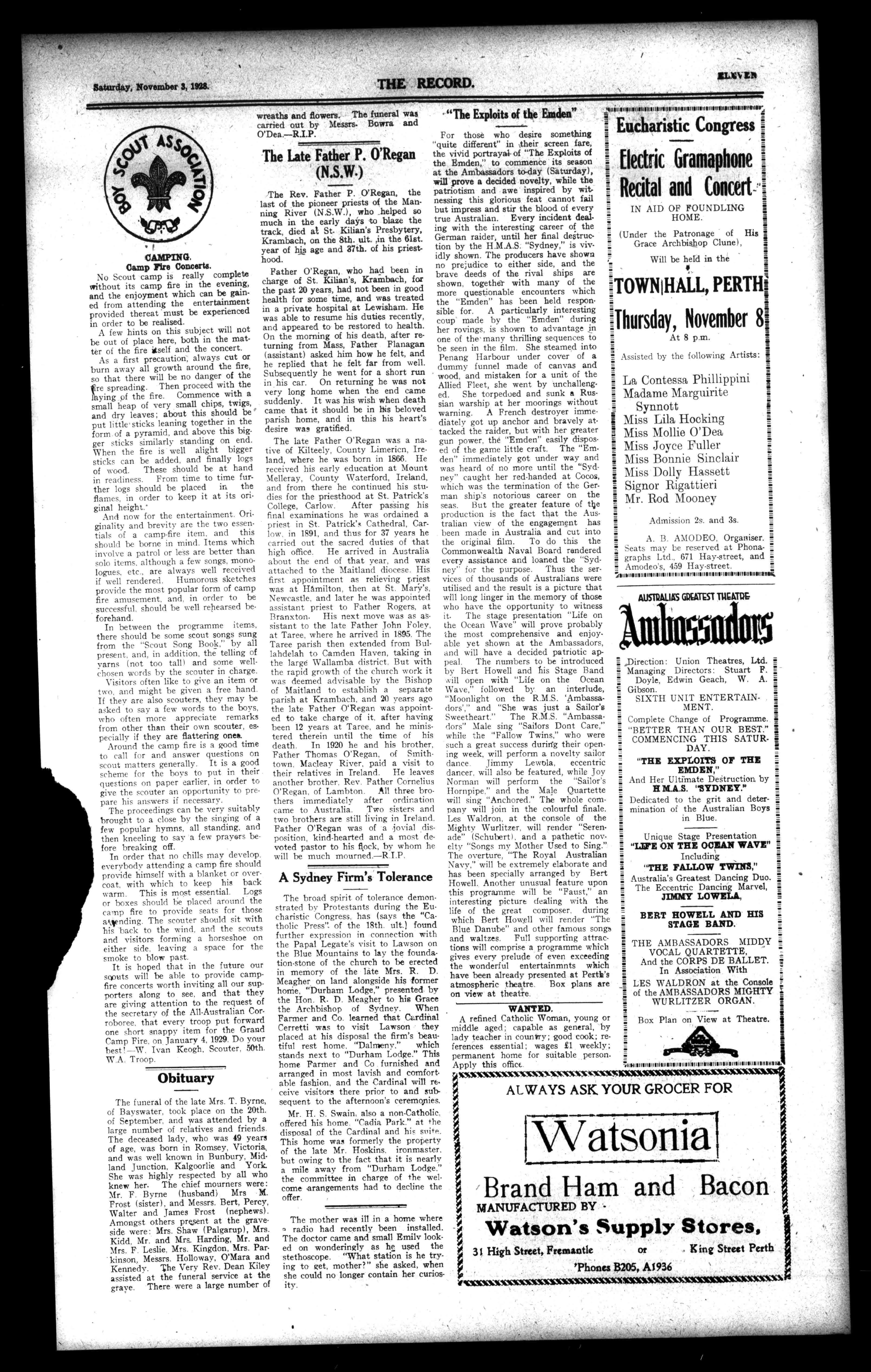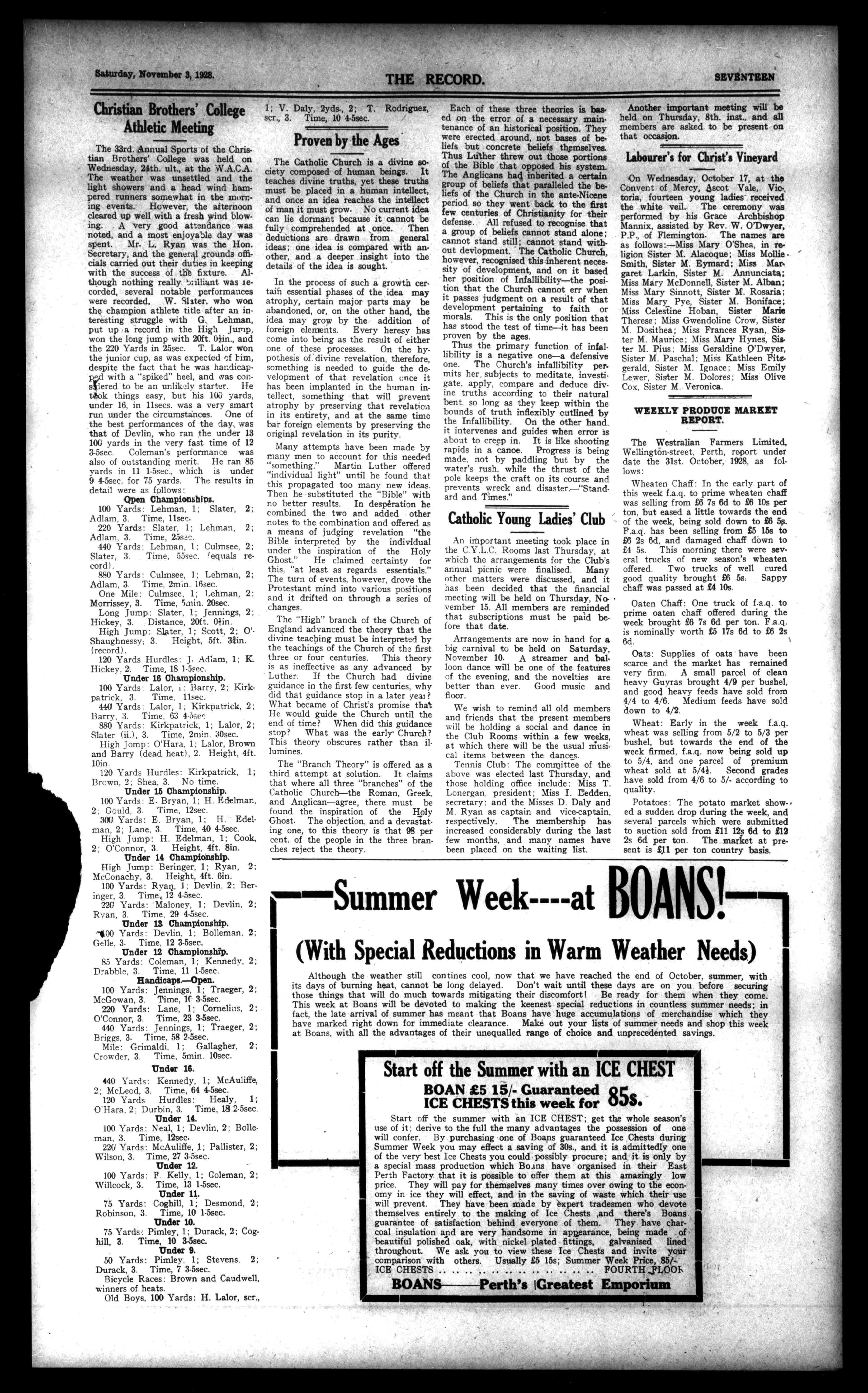 rwsin-rova THERECORD. Saturday,November9,1928. NewHospital,ofSt.,JohnofGod SUBLACO. SPLENDIDUP-TO-DATEACCOMMODATION. ClosetoSubiacoandLeedervilleRailwayStations. PatientsMaySelectTheirOwnMedicalAdvisers. TERMSMODERATE.PRIVATEROOMSAVAILABLE. OPENTOALLDENOMINATIONS.ForTermsApplytoRev.Mother. TheSistersalsoConductaSplendidlyEquippedHospitalatKalgoorlie. TheColonialMutualFireInsurance COMPANYLIMITED FIRE,MARINE,ACCIDENT,WORKERS'COMPENSATION, EMPLOYERS'LIABILITY. HAYSTACKS,GROWINGCROPS,ANDLIVESTOCK ASPECIALTY. E.MIDWOOD,Manager. BARRACKSTREET,PERTH. ApplicationsInvitedforAgenciesinDistrictsWhereNotAlready Represented. DEMAND CASTLEMAINE STOUT WOOL,SHEEPSKINS,HIDES,TALLOW,KANGAROOANDFUR SKINSBOUGHTINANYQUANTITYBYCHARLESHORMANN,FREMANTLE CONSIGNREGULARLY.PROMPTCASHONDELIVERY. NOCOMMISSIONCHARGED. BoxallandLynch Dentists: NewPremises MOANACHAMBERS HayStreet,nearBarrackStreet Mr.W.BoxallCanbeConsultedPersonally OurLadyofMercy'sCollege,VictoriaPark CONDUCTEDBYTS*SISTERSOFMERCY. LocationUnsurpassedforConvenience,Healthfulness,andBeauty. BoardintandDaySchoolforYoungLadiesandLittleGirls. ForParticularsApplytotheMotherSuperior. BUYINGLARGELY FROMTHEWORLD'SFINESTSOURCESOFSUPPLY SELLINGDIRECT. THROUGHTHB$,B16STORES. CharlieCarterLtd, CANANDDOESSELLTHEFINESTGROCERIESATTHE LOWESTRATESINWESTERNAUSTRALIA. NOMATTERWHEREYOULIVE,JUSTSENDYOURORDER,AND ITWILLRECEIVEPROMPTANDCOURTEOUSATTENTION. THREEBIGSTORES 556HAYST.and111BARRACKST.,PERTH 41MARKETST.,FREMANTLE WoodSonsNewTea IsDistinctiveinQuality.OrderTo-day BLENDEDAND FREMANTLE. ChristianBrothers'College,Perth ABOARDINGANDDAYSCHOOL. BOYSAREADMITTEDATANYTIMEDURING THETERM. COMMERCIALWORKASPECIALTY. ForParticularsApplytoTHEPRINCIPAL. St.Ildephonsus'College NEWNOROIA. CONDUCTED13YTHEMARISTBROTHERS. FORTERMSANDFULLPARTICULARS,APPLYTO THEBROTHERPRINCIPAL. BOWRA&O'DEA,Undertakers GeneralFuneralFurnishers MOTORVEHICLES FUNERALSCONDUCTEDINANYPARTOFTHESTATE. NotetheAddress-195PierStreetPERTH 'Phone,A4308;Private'Phones:A2938andA3376. PrintedandPublishedfortheRomanCatholicArchbishopofPerth,byTHOMASSLATTERY,450Hay-ptreet,