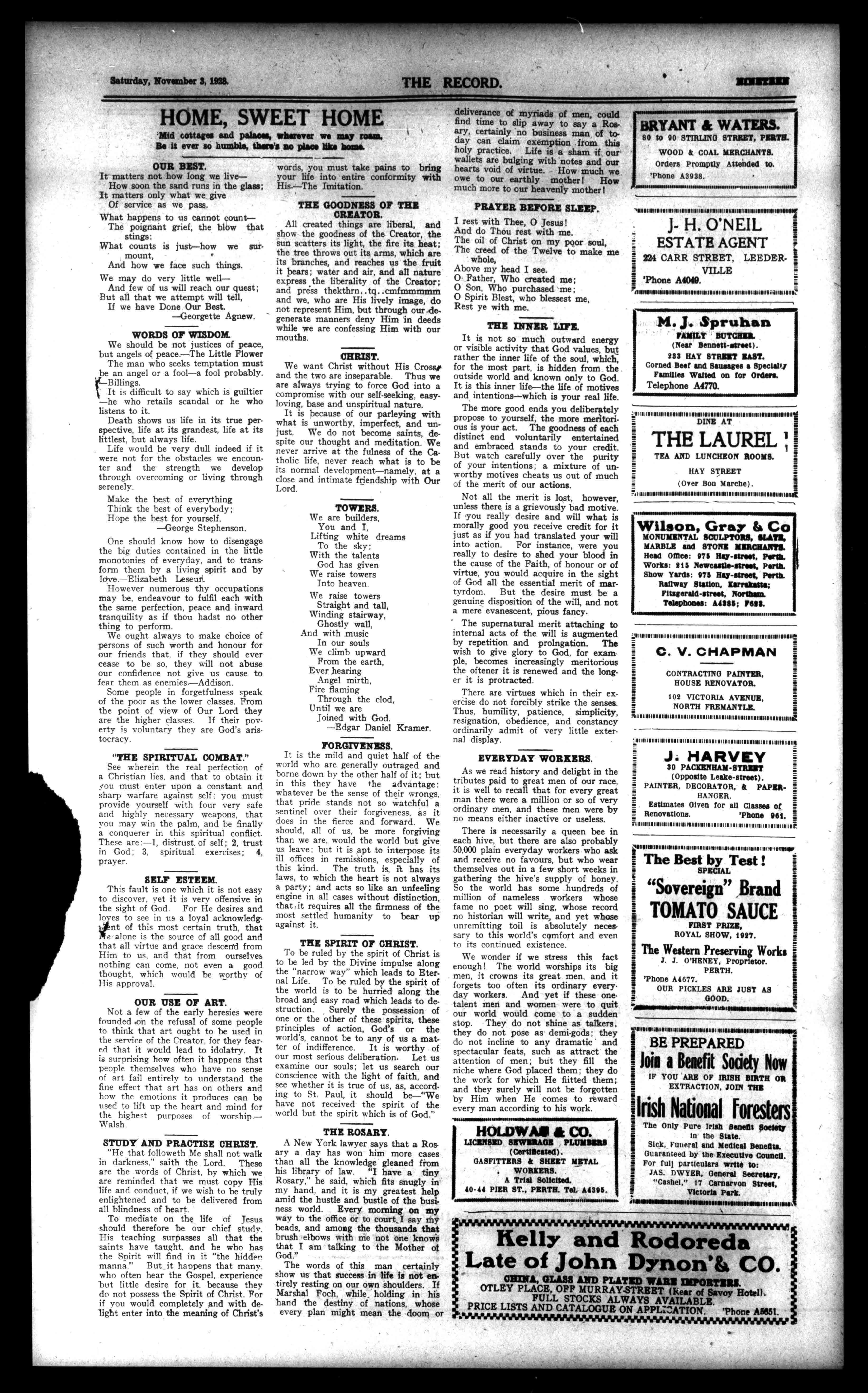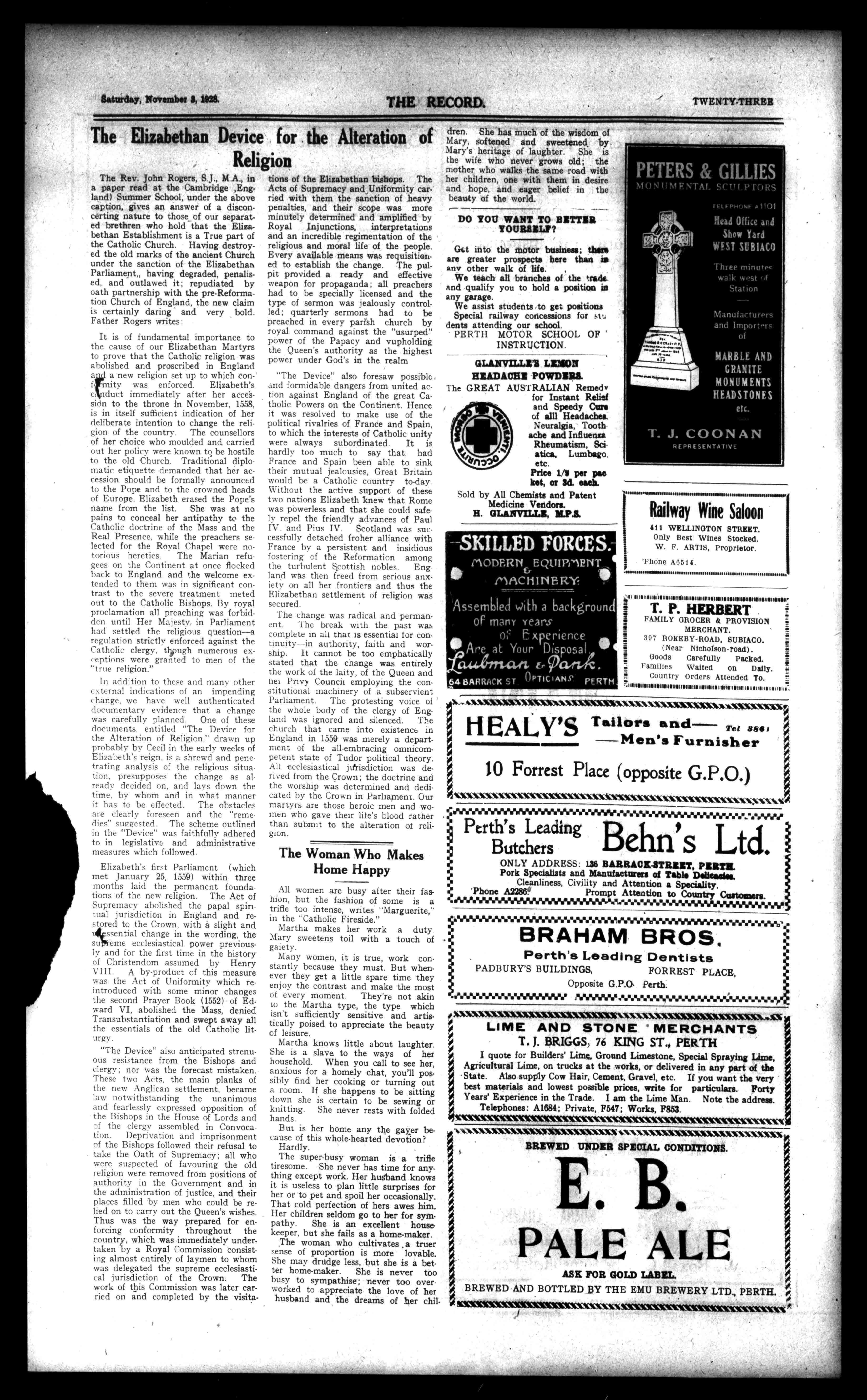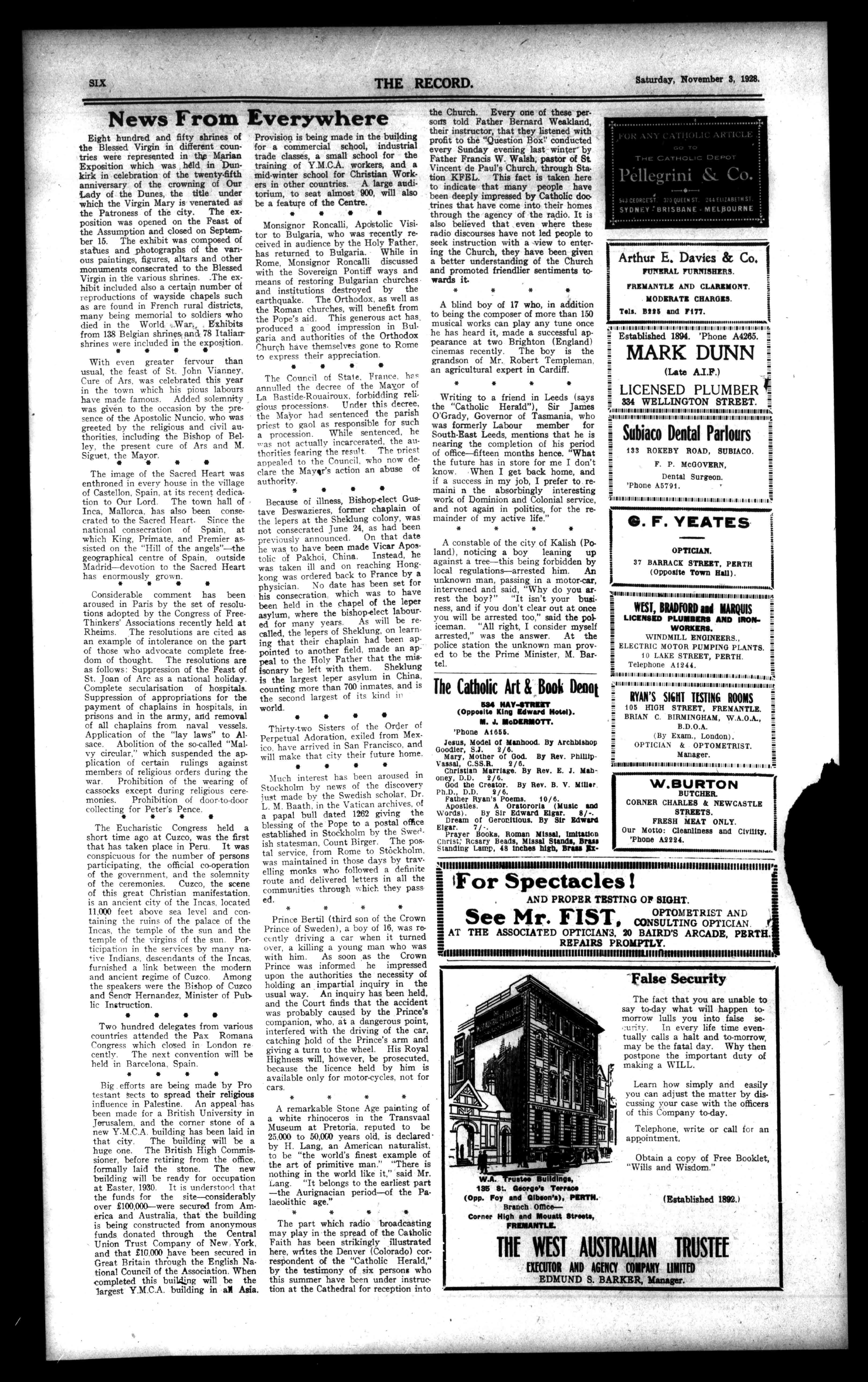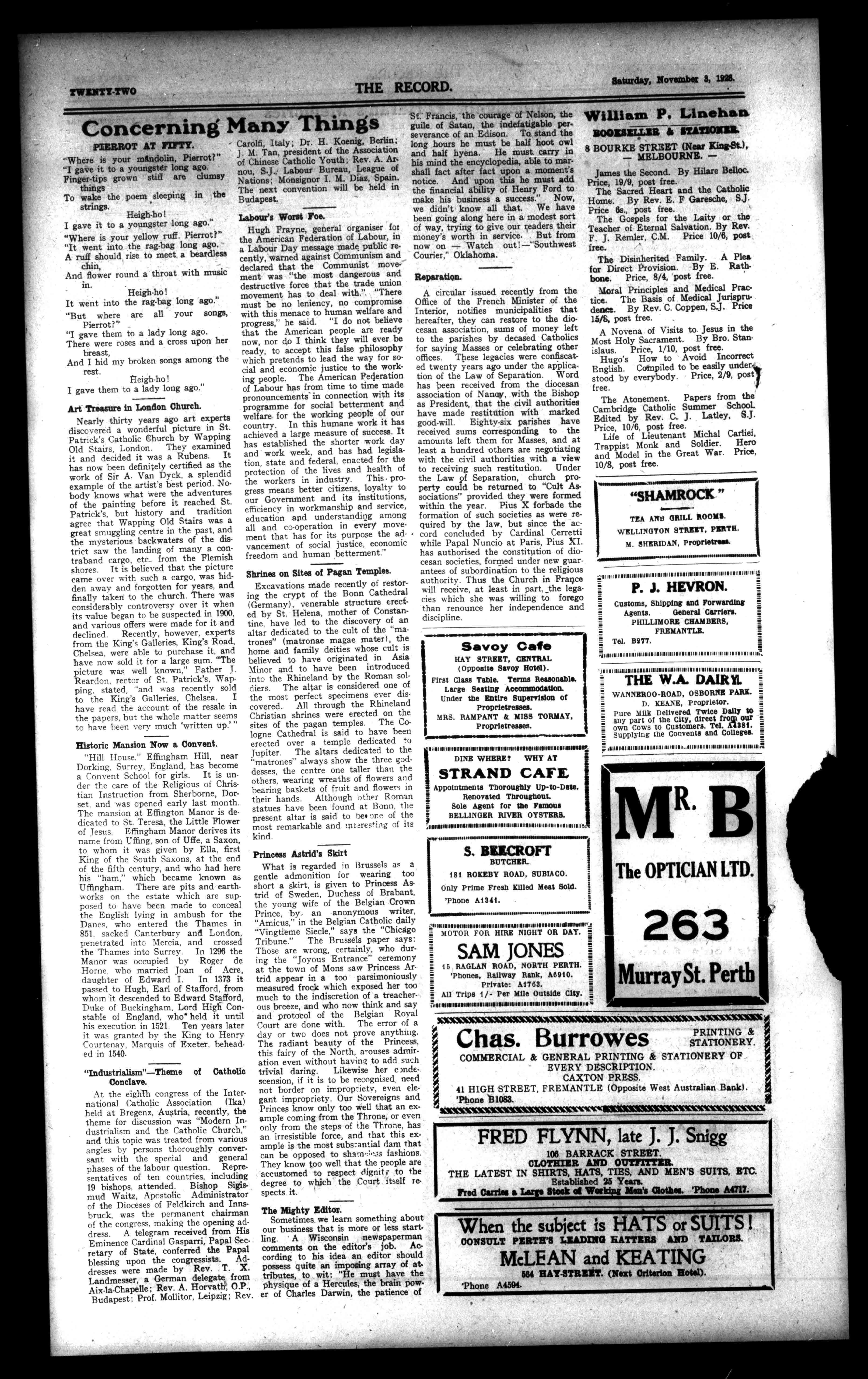 20ANGOVESTREET,NORTHPERTH. Tel.A2649. JAMESSTREET,GUILDFORD. Tel.M163. 'PhoneAl125. AMODEO'S CatholicEmporium 459HAYSTREET,PERTH. SupplierofReligiousandChurch Goods. FreshStocksConstantlyArriving. LargeStocksofBooksby CatholicandPopularAuthors. InspectionInvited. StateSavingsBankAgency. CountryOrdersPromptly Attendedto. FOR Flowers,SeedsandWreaths CONSULT WILSONandJOHNS 70BARRACKSTREET,PERTH. NURSERYMEN,SEIDMENANDFLORISTS. 'PhoneA3888. Established25Years. N, F F F F F WALLandFRANCE 'PhoneA3693. *PERTH'SQUALITY. TAILORS 578HAYSTREET(NearBonMarche). ONLYBESTMATERIALSSTOCKED. DRESSSUITSASPECIALTY. F F F F F %s.% N. }dViWeiWsWe ProcureYourDairyProducefrom MacFarlaneandCo,Ltd, BESTQUALITYBUTTER,BACON,CHEESE,EGGS,FISH, POULTRY,SMALLGOODS,Eta,atBEDROCKPRICES. RETAILSHOP:48MURRAYSTREET. HEADOFFICE&WHOLESALEDEPOT:48aMURRAYSTREET. Tele.:A1438,A3777,andA6109.