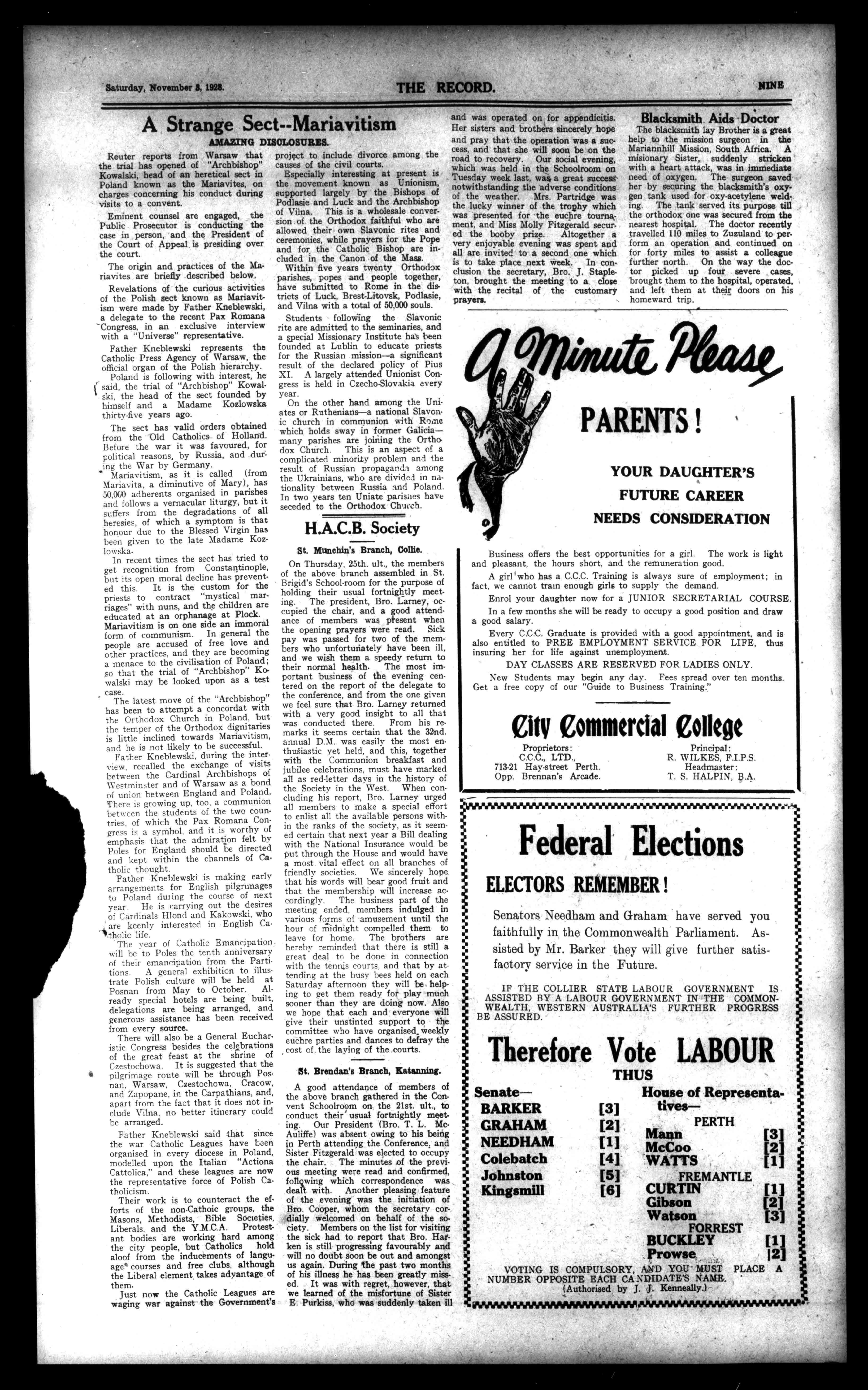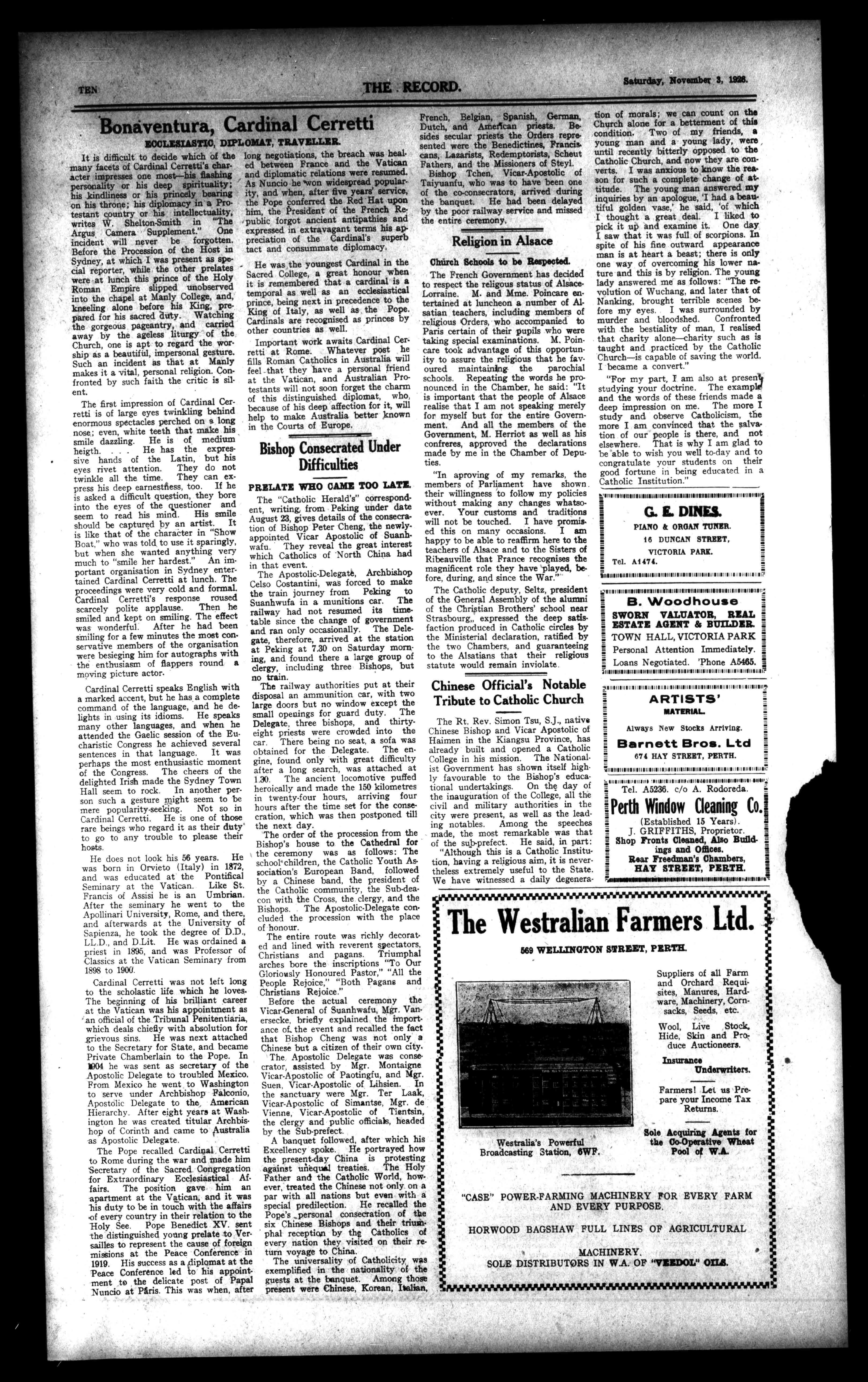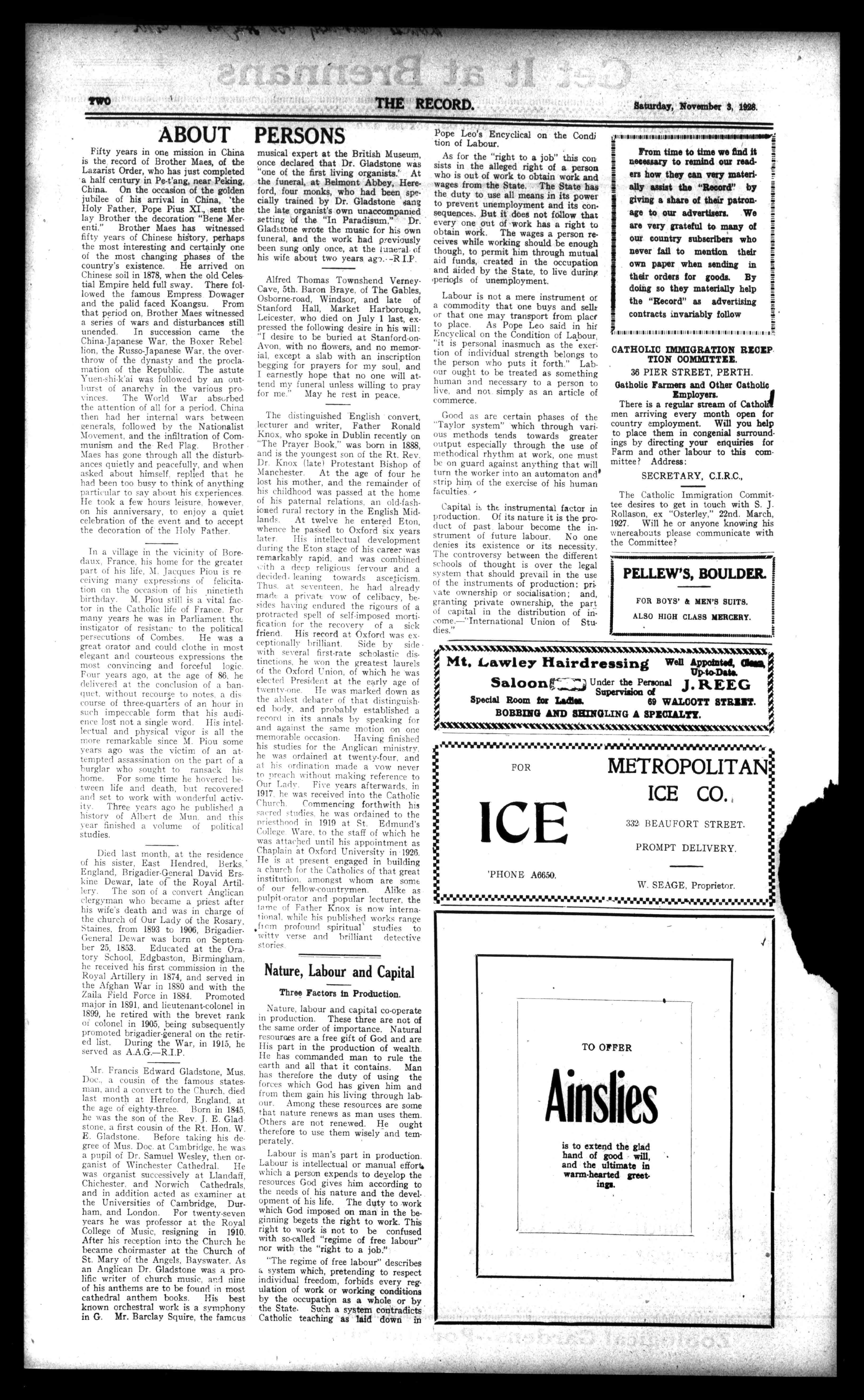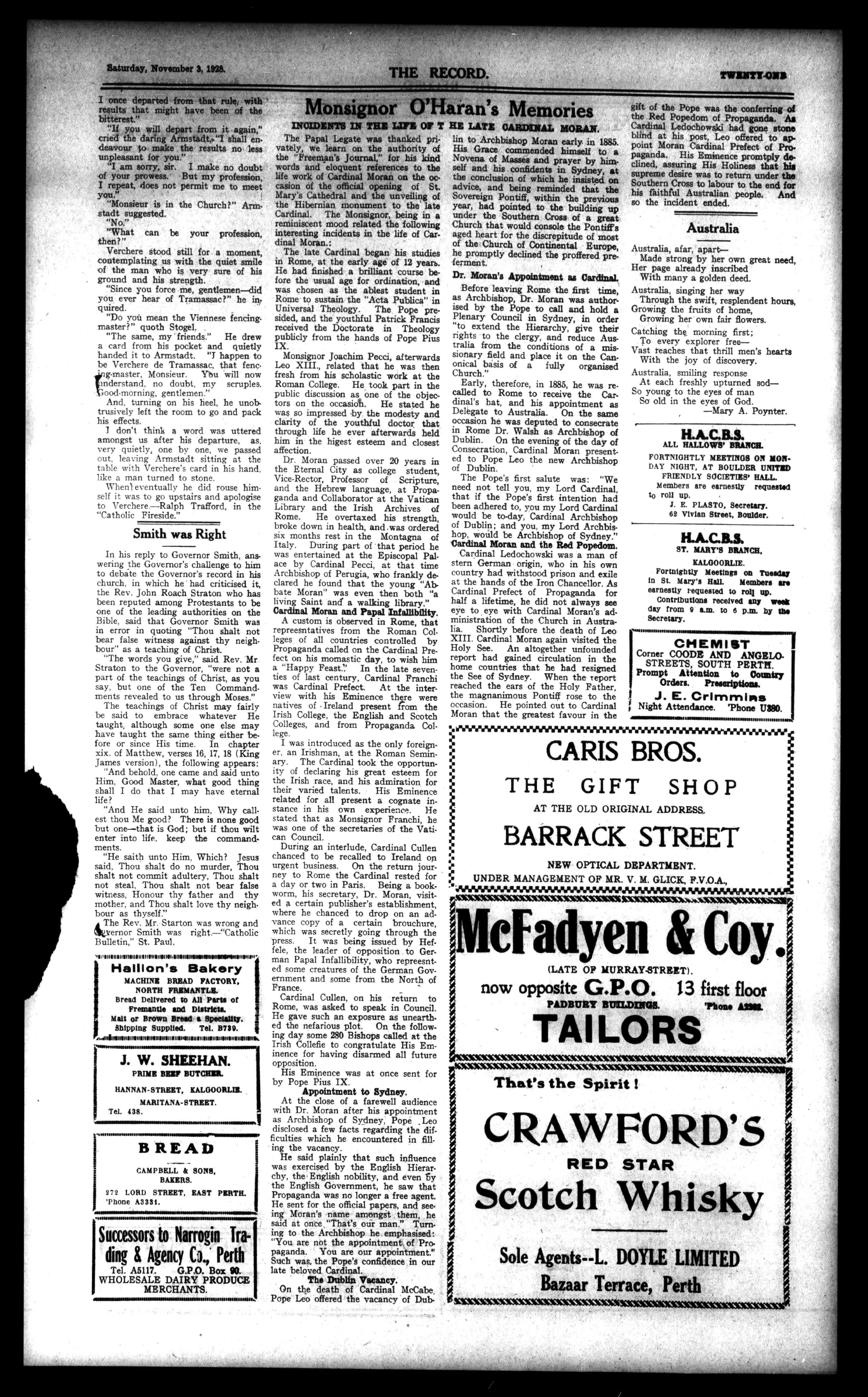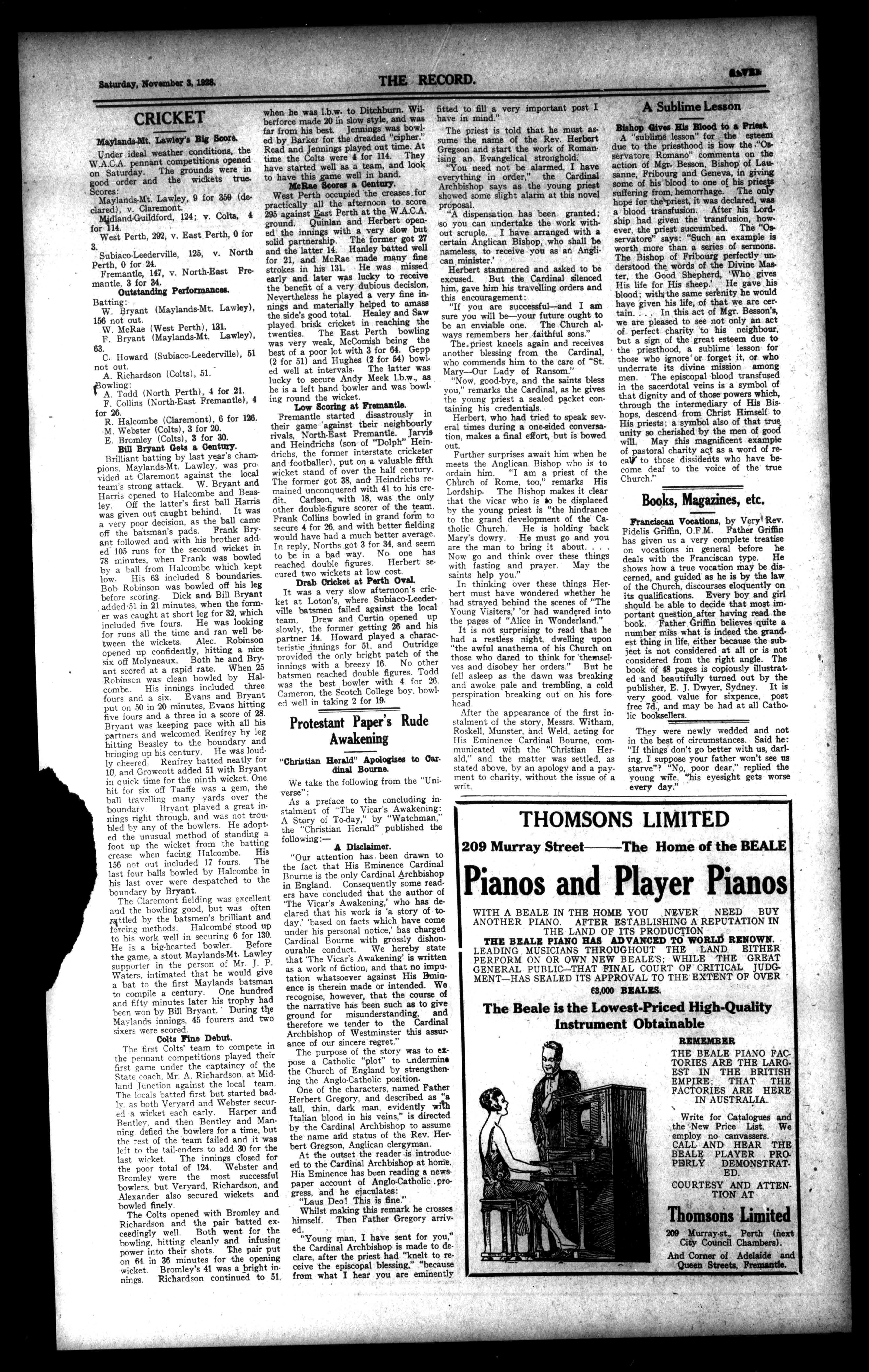 20ANGOVESTREET,NORTHPERTH. Tel.A2649. JAMESSTREET,GUILDFORD. Tel.M163. 'PhoneAl125. AMODEO'S CatholicEmporium 459HAYSTREET,PERTH. SupplierofReligiousandChurch Goods. FreshStocksConstantlyArriving. LargeStocksofBooksby CatholicandPopularAuthors. InspectionInvited. StateSavingsBankAgency. CountryOrdersPromptly Attendedto. FOR Flowers,SeedsandWreaths CONSULT WILSONandJOHNS 70BARRACKSTREET,PERTH. NURSERYMEN,SEIDMENANDFLORISTS. 'PhoneA3888. Established25Years. N, F F F F F WALLandFRANCE 'PhoneA3693. *PERTH'SQUALITY. TAILORS 578HAYSTREET(NearBonMarche). ONLYBESTMATERIALSSTOCKED. DRESSSUITSASPECIALTY. F F F F F %s.% N. }dViWeiWsWe ProcureYourDairyProducefrom MacFarlaneandCo,Ltd, BESTQUALITYBUTTER,BACON,CHEESE,EGGS,FISH, POULTRY,SMALLGOODS,Eta,atBEDROCKPRICES. RETAILSHOP:48MURRAYSTREET. HEADOFFICE&WHOLESALEDEPOT:48aMURRAYSTREET. Tele.:A1438,A3777,andA6109.