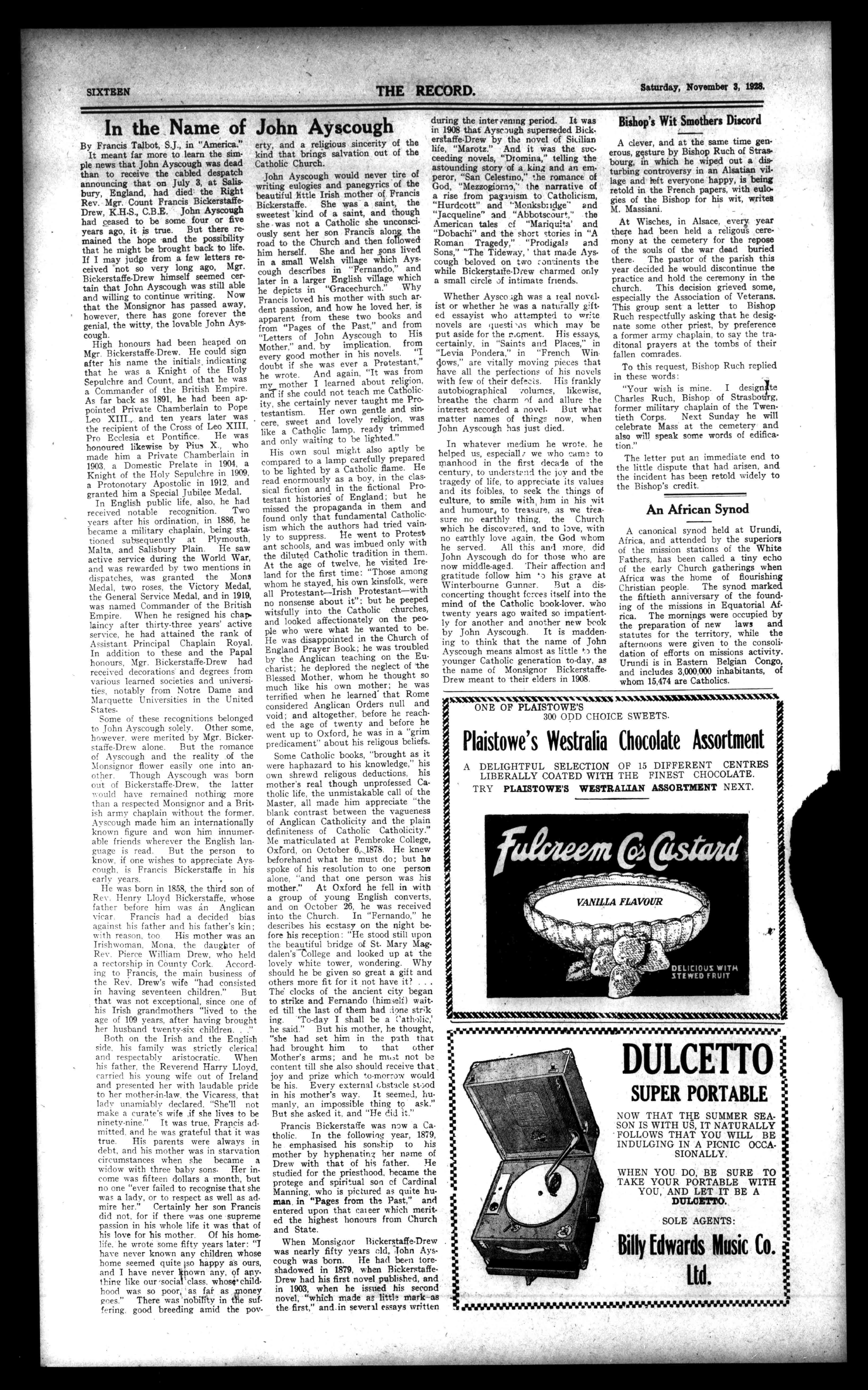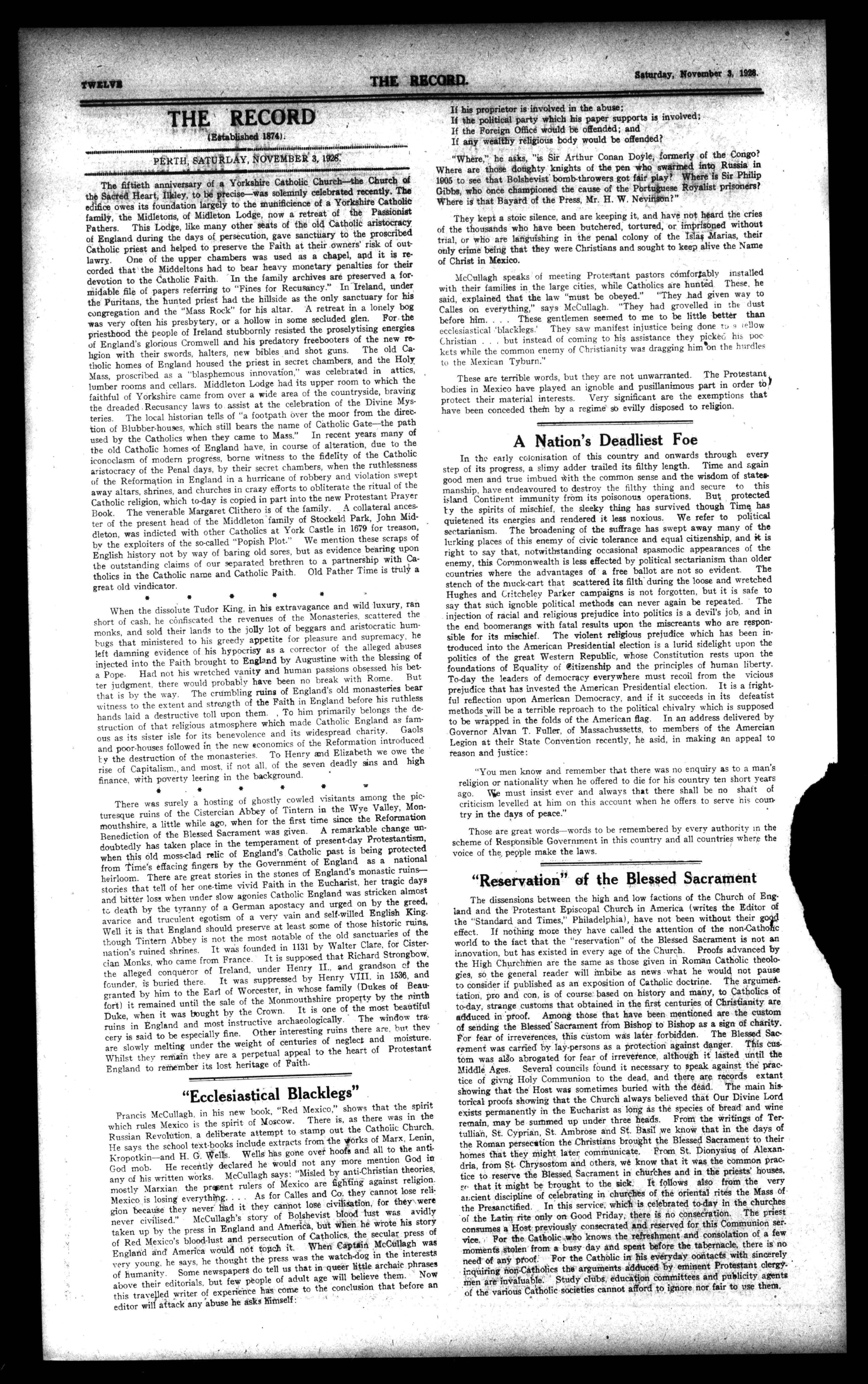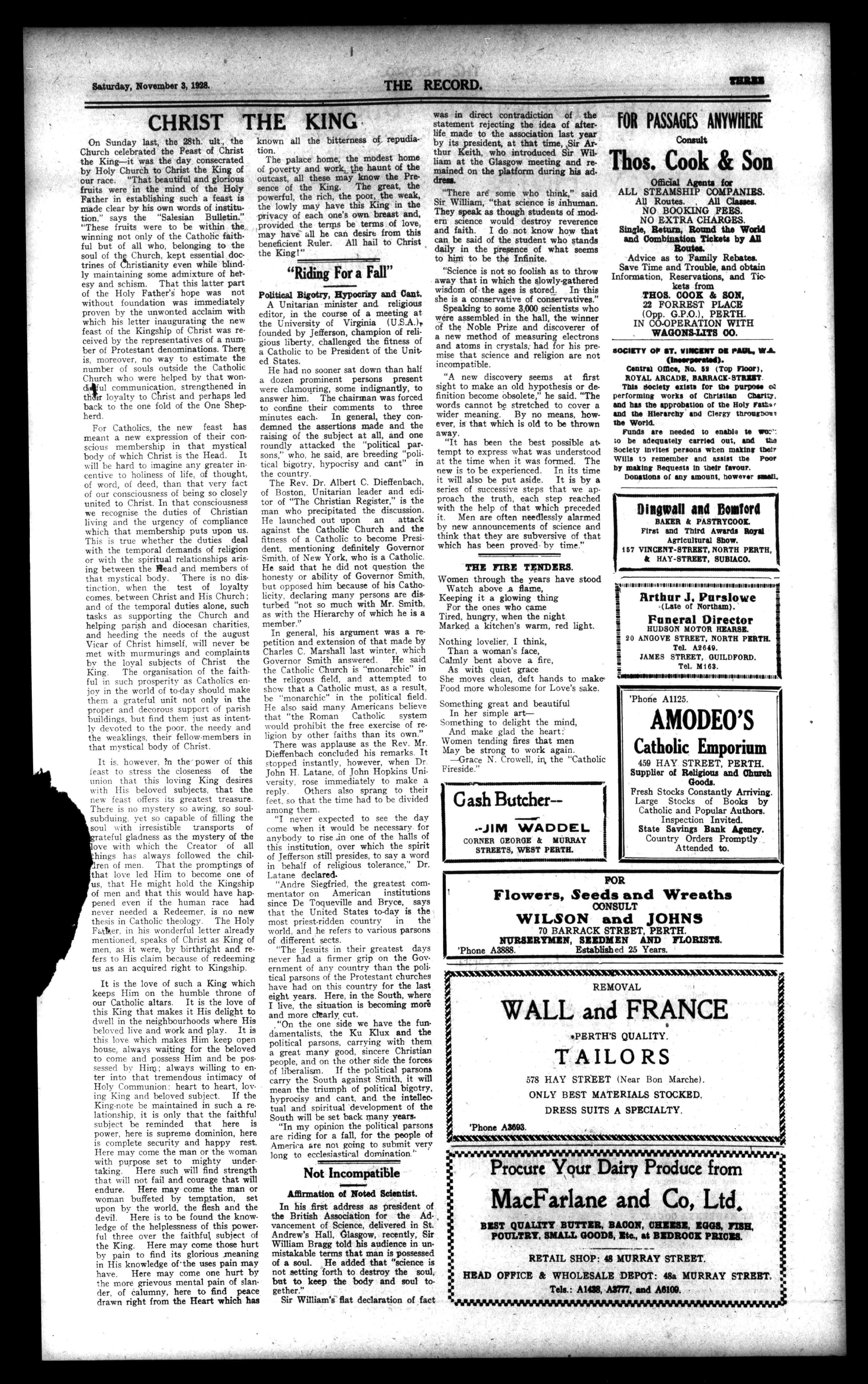 OnSundaylast,the28th.siltthe ChurchcelebratedtheFeastofChrist theKing-itwasthedayconsecrated byHolyChurchtoChristtheKingof ourrace."Thatbeautifulandglorious fruitswereinthemindoftheHoly Fatherinestablishingsuchafeastis madeclearbyhisownwordsofinstitution,"saysthe"SalesianBulletin." "Thesefruitsweretobewithinthe, winningnotonlyoftheCatholicfaith. fulbutofallwho,belongingtothe soulofthgChurch,keptessentialdoctrinesofChristianityevenwhileblindlymaintainingsomeadmixtureofhetesyandschism.Thatthislatterpart oftheHolyFather'ihopewasnot withoutfoundationwasimmediately provenbytheunwontedacclaimwith whichhisletterinauguratingthenew feastoftheKingshipofChristwasreceivedbytherepresentativesofanumberofProtestantdenominations.There is,moreover,nowaytoestimatethe numberofsoulsoutsidetheCatholic Churchwhowerehelpedbythatwondilfulcommunication,strengthenedin thFirloyaltytoChristandperhapsled backtotheonefoldoftheOneShepherd.