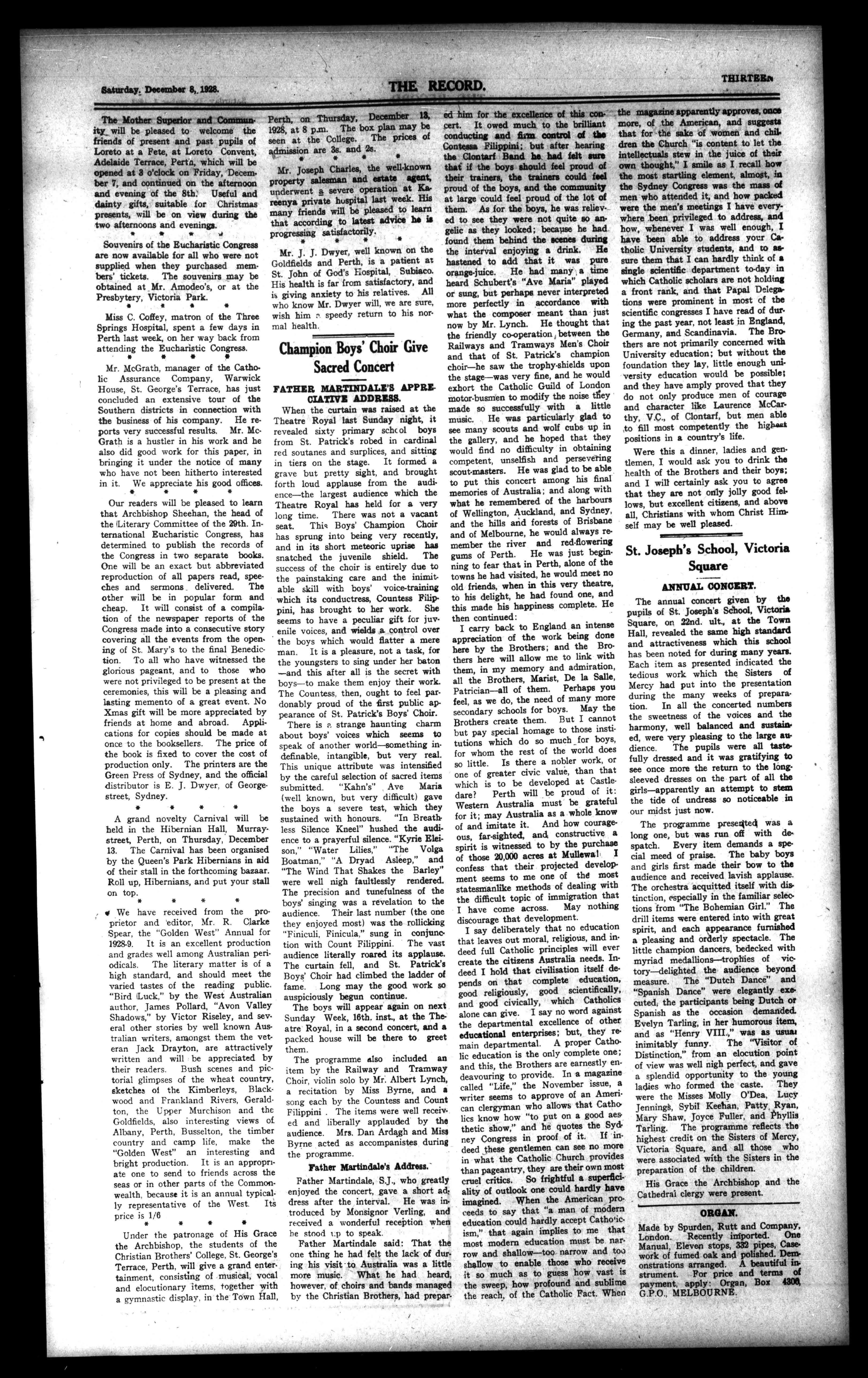 onSundaylast,andinresponseto manyrequests,ithasbeendecided toboldanotherconcertonSunday week,the16th.December,inthesame theatre.Thechoirwillbeassisted bytheW.A.OperaticCompany,under thedirectionofCountandContessa Filippini.Withsuchanarrayoftalentitissafetosaythatararetreatis instoreformusiclovers.Theconcertwillbeheldundertheauspices oftheSocietyofSt.VincentdePaul.