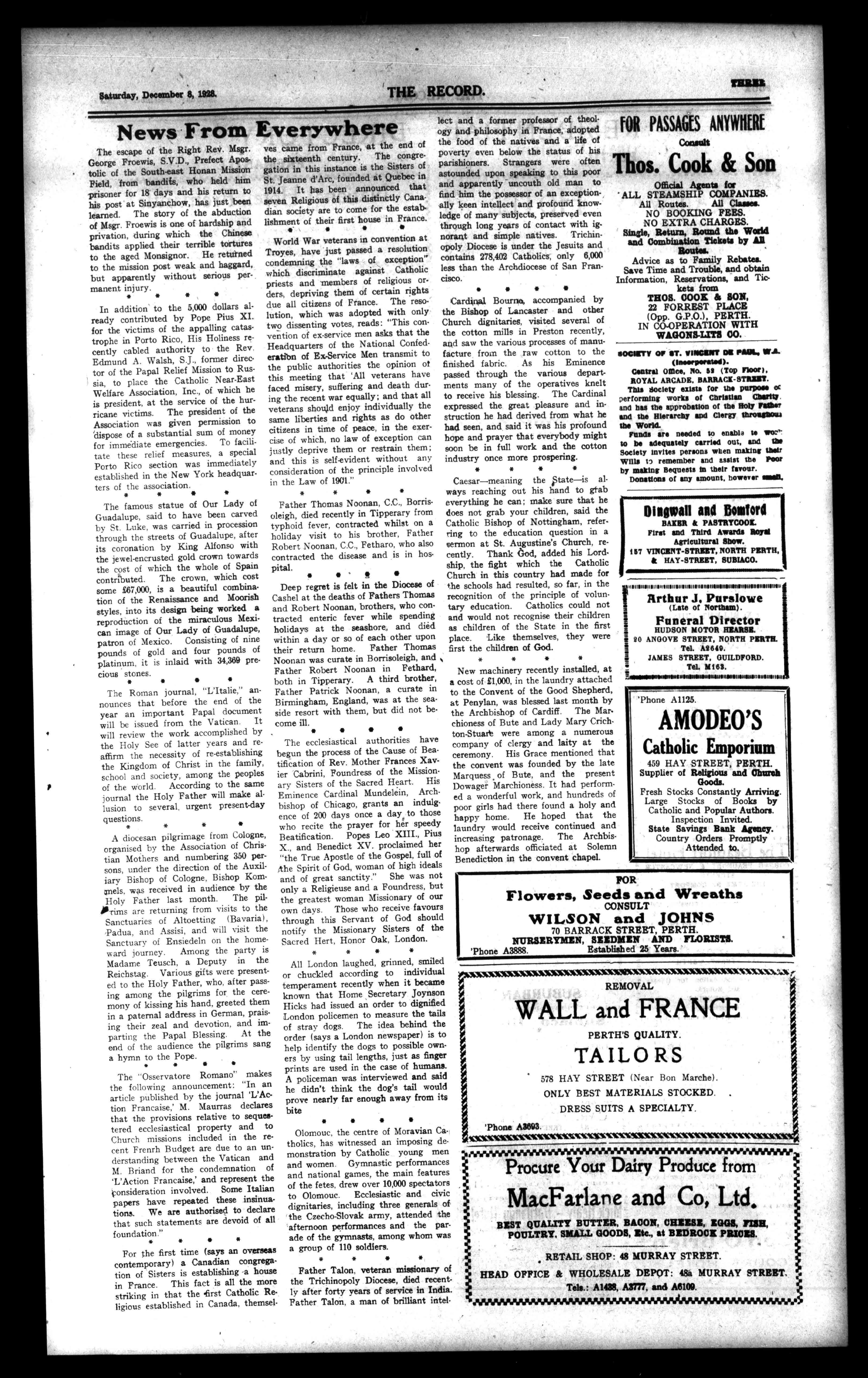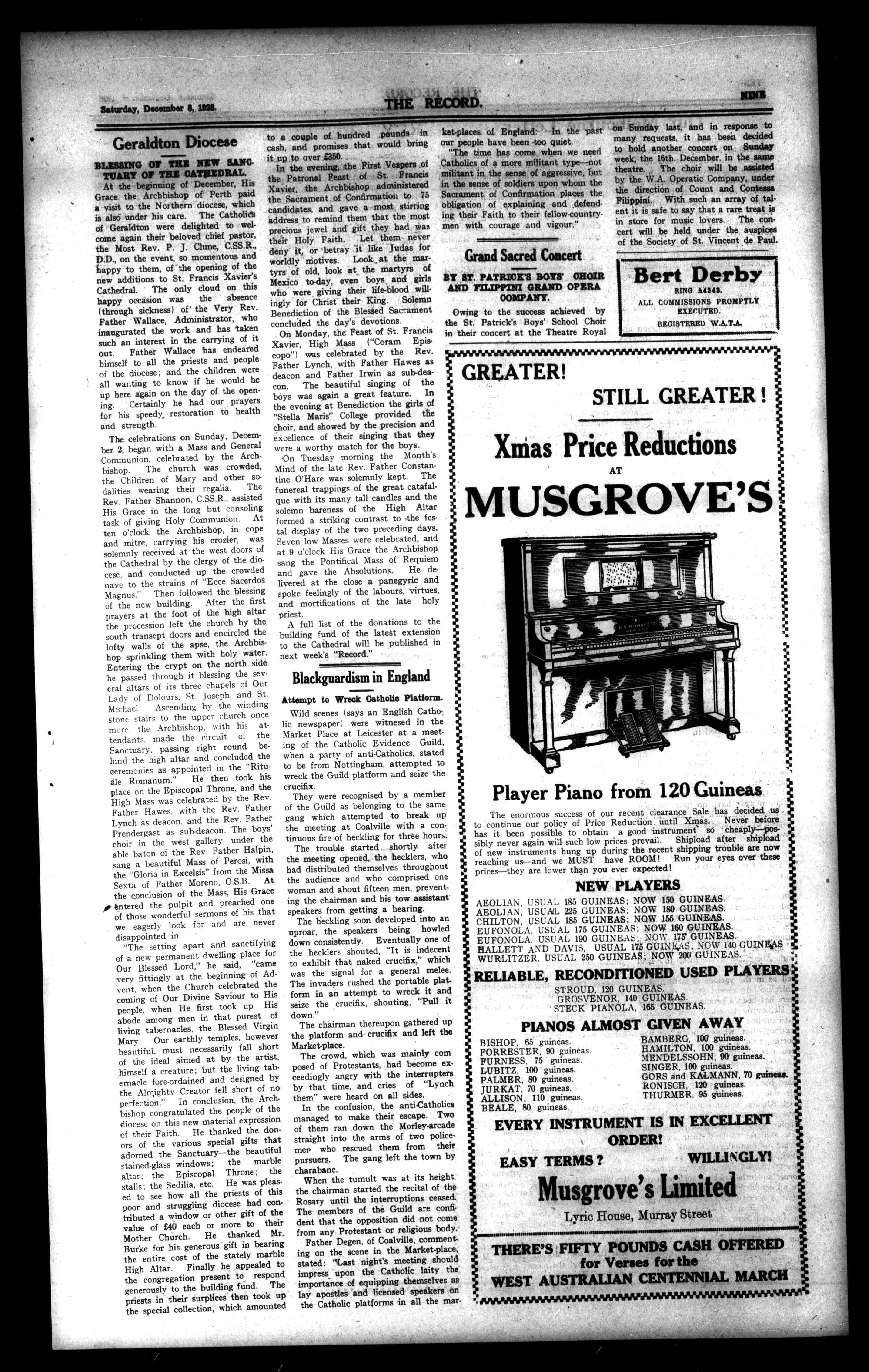 AtthebeginningofDecember,His GracetheArchbishopofPerthpaid avisittotheNortherndiocese,which isalsounderhiscare.TheCatholic's ofGeraldtonweredelightedtowelcomeagaintheirbelovedchiefpastor, theMostRev.P.J.Chine,C.SS.R., D.D.,ontheevent,somomentousand happytothem,oftheopeningofthe newadditionstoSt.FrancisXavier's Cathedral.Theonlycloudonthis happyoccasionwastheabsence (throughsickness)oftheVeryRev. FatherWallace,Administrator,who inauguratedtheworkandhastaken suchaninterestinthecarryingofit out.FatherWallacehasendeared himselftoallthepriestsandpeople ofthediocese;andthechildrenwere allwantingtoknowifhewouldbe uphereagainonthedayoftheopening.Certainlyhehadourprayers forhisspeedyrestorationtohealth andstrength.