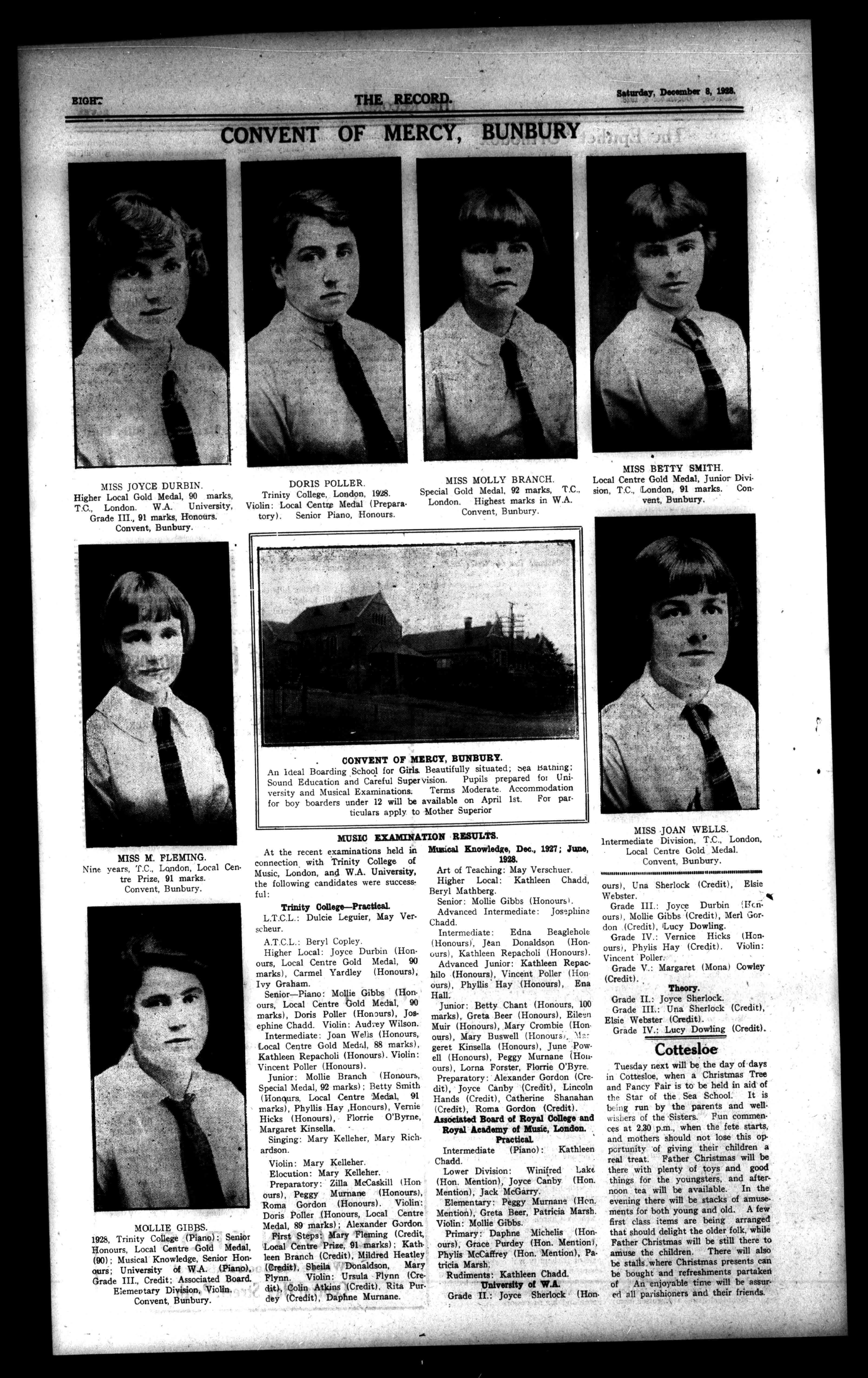 MISSM.FLEMING. Nineyears,T.C.,London,LocalCentrePrize,91marks. Convent,Bunbury.