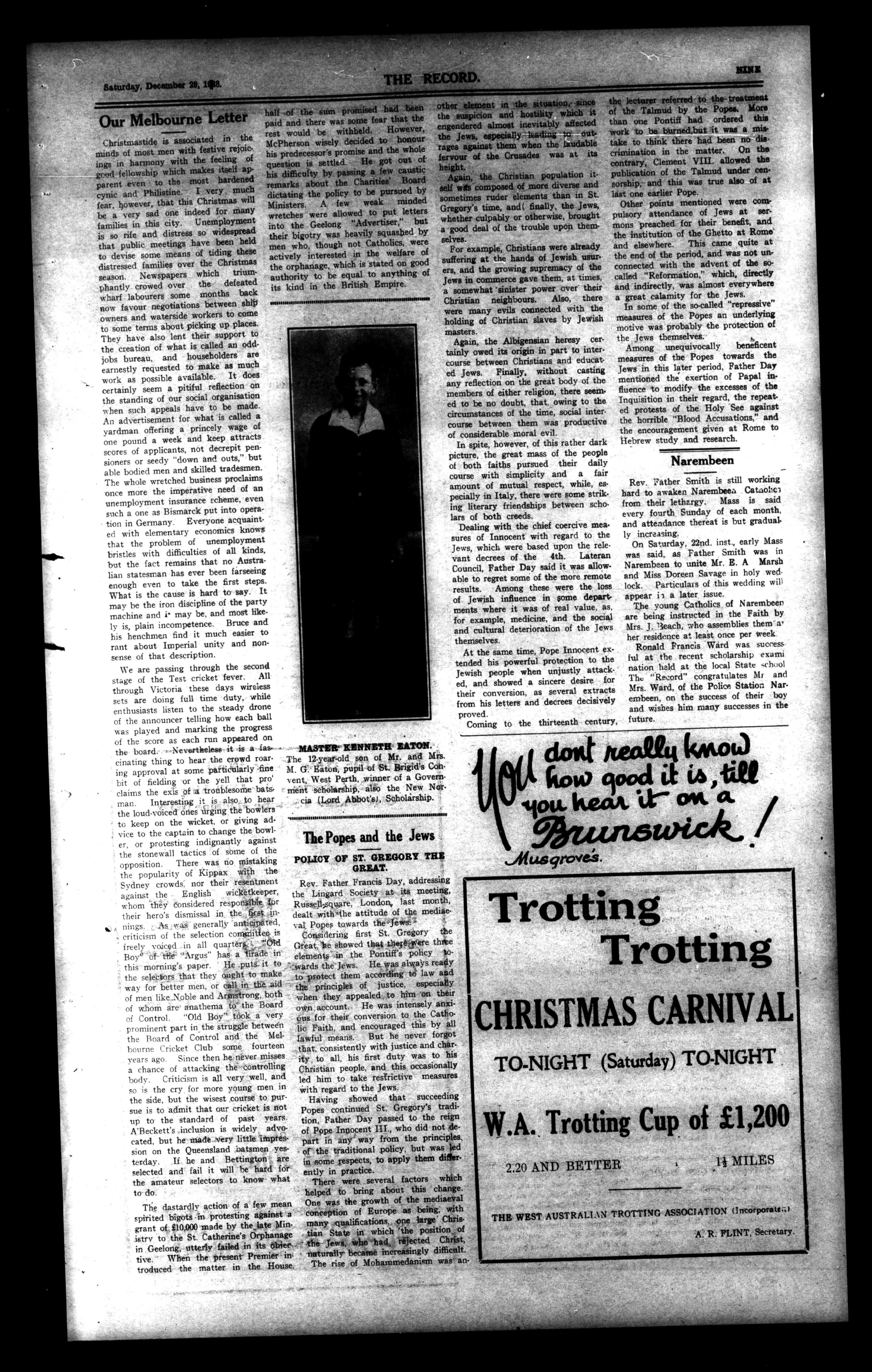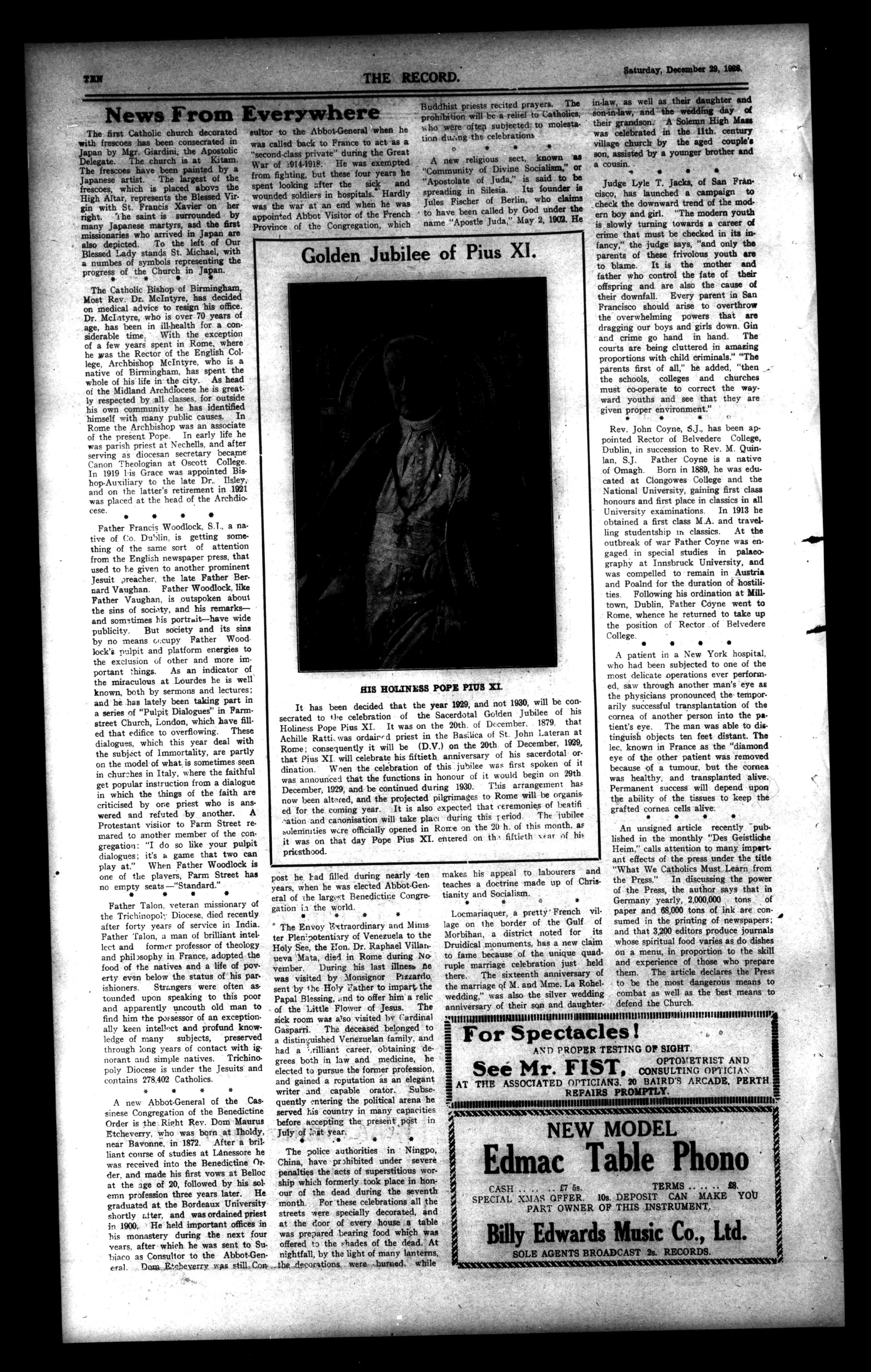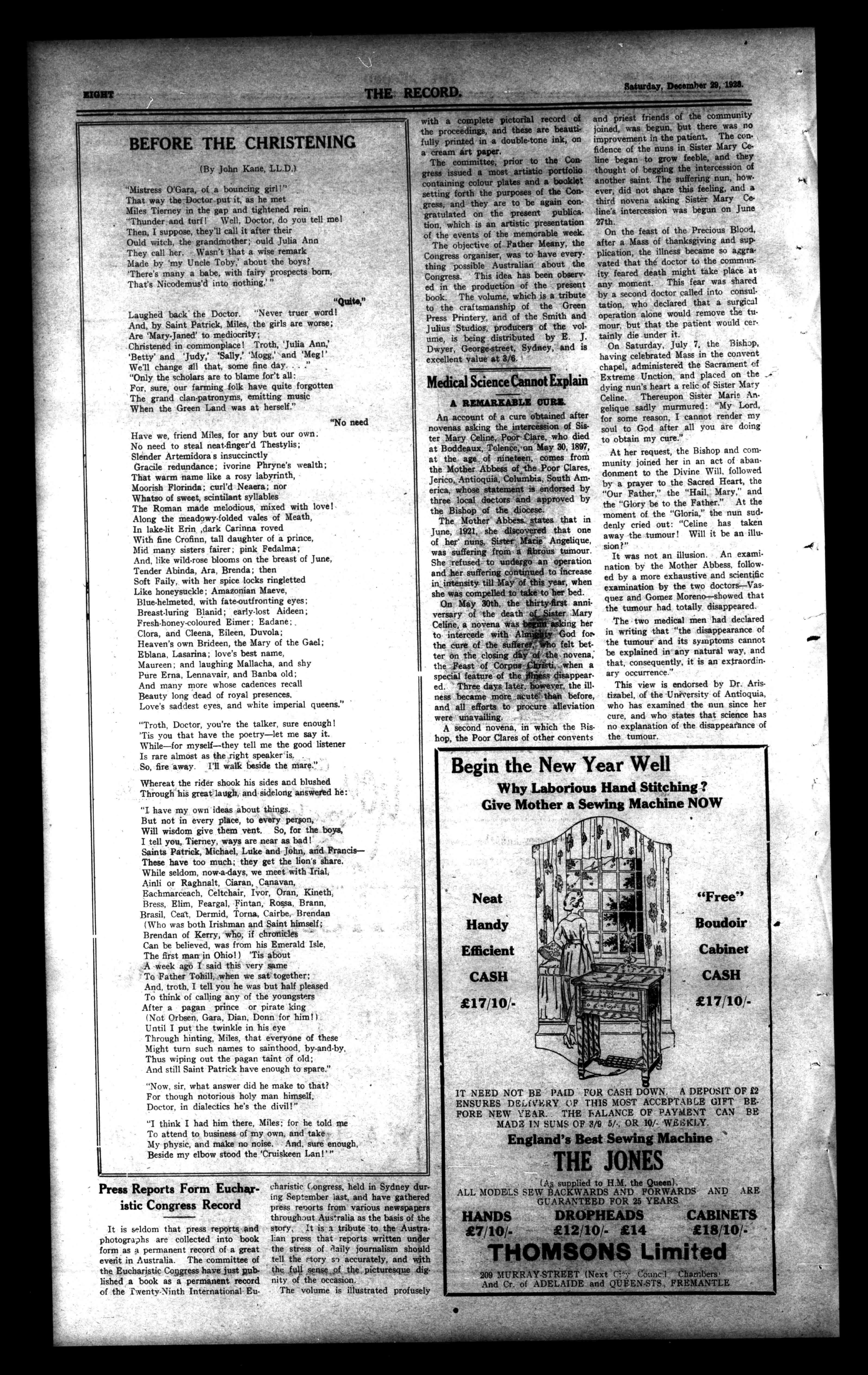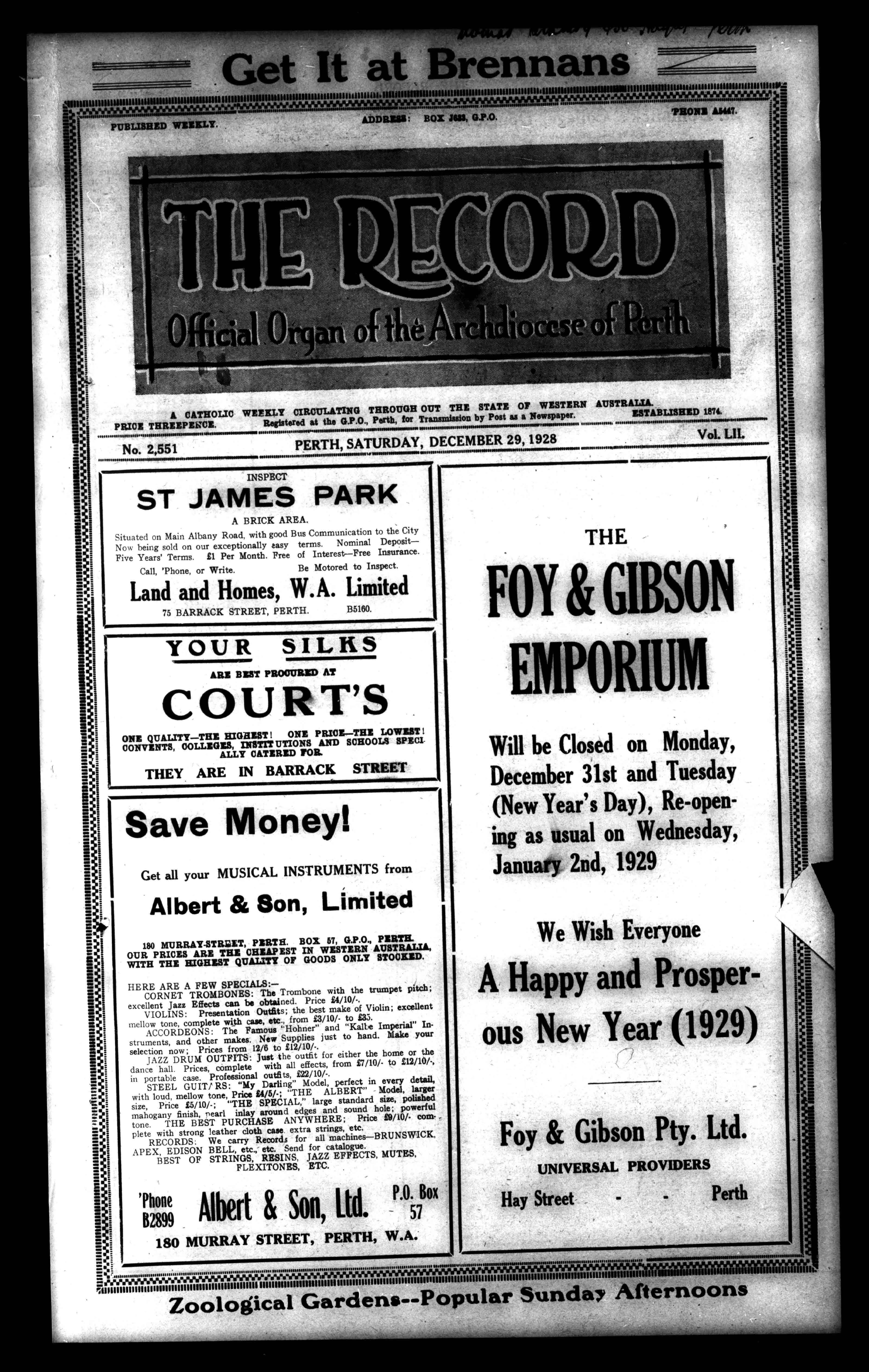 IFV GetItatBrennans B.,I WISIMIIMMIU4.101 /IMUNWSMUMMA/WMMN....11111M.8 iiiiiii01.10.110.10NSIOW PUBLISHEDWEEKLY. ADDRESS:BOX3633, 'PHONEA5447. ACATHOLICWEEKLYCIRCULATINGTHROUGHOUTTHESTATEOFWESTERNAUSTRALIA. PRICETHREEPEKCE. RegisteredattheG.P.O.,Perth,forTransmissionbyPostasaNewspaper. ESTABLISHED187L 3.1 No.2,551 3 110 X a 10 10 .0... PERTH,SATURDAY,DECEMBER29,1928 rot umlaanawynonmiumnrer.. Me. .11101.011/111111111.11.14111M11101.5 2.011.1. NORMS INSPECT STJAMESPARK ABRICKAREA. SituatedonMainAlbanyRoad,withgoodBusCommunicationtotheCity Nowbeingsoldonourexceptionallyeasyterms.NominalDeposit-FiveYears'Terms.£1PerMonth.FreeofInterest-FreeInsurance. Call,'Phone,orWrite. BeMotoredtoInspect. LandandHomes,W.A.Limited 75BARRACKSTREET,PERTH. B5160. YOURSILKS AREBESTPROCUREDAT COURT'S ONEQUALITY-THEHIGHEST!ONEPRICE-THELOWEST! CONVENTS,COLLEGE'S,INSTITUTIONSANDSCHOOLSSPECIALLYCATEREDFOR. THEYAREINBARRACKSTREET SaveMoney! GetallyourMUSICALINSTRUMENTSfrom Albert&Son,Limited 180MURRAY-STRZIT,PERTH.BOX67,G.P.O.,PERTH. OURPRICESARETHECHEAPESTINWESTERNAUSTRALIA, WITHTHEHIGHESTQUALITYOFGOODSONLYSTOCKED. HEREAREAFEWSPECIALS:CORNETTROMBONES:TheTrombonewiththetrumpetpitch; excellentJazzEffectscanbeobtained.Price£41101-. VIOLINS:PresentationOutfits;thebestmakeofViolin;excellent mellowtone,completewithcase,etc.,from£3/10/-to£33. ACCORDEONS:TheFamous"Hohner"and"KantImperial"Instruments,andothermakes.NewSuppliesjusttohand.Makeyour selectionnow;Pricesfrom12/6to£12/10/-. JAZZDRUMOUTFITS:Justtheoutfitforeitherthehomeorthe dancehall.Prices,completewithalleffects,from£7/10/-to£12/10/-, inportablecase.Professionaloutfits,£22/10/-. STEELGUIT!RS:"MyDarling"Model,perfectineverydetail, withloud,mellowtone,Price£4/5/-;"THEALBERT"Model,larger size,Price£51101-;"THESPECIAL,"largestandardsize,polished mahoganyfinish,',earlinlayaroundedgesandsoundhole;powerful tone.THEBESTPURCHASEANYWHERE;Price£9/10/-completewithstrongleatherclothcaseextrastrings,etc. RECORDS.WecarryRecordsforallmachines-BRUNSWICK, APEX,EDISONBELL,etc.,etc.Sendforcatalogue. BESTOFSTRINGS,RESINS,JAZZEFFECTS,MUTES, FLEXITONES,ETC. '62899 Phone Albert&Sonltd.5 PO.Box 7 180MURRAYSTREET,PERTH,W.A. Vol.LII. THE FOY&GIBSON EMPORIUM WillbeClosedonMonday, December31standTuesday (NewYear'sDay),Re-openingasusualonWednesday, January2nd,1929 WeWishEveryone AHappyandProsperousNewYear(1929) Foy&GibsonPty.Ltd. UNIVERSALPROVIDERS HayStreet Perth :::0"."."000.1VANVAPINVYANYWWWWW.P.WIIWWWYWNNWINVINIVAVV.V 111111111111111IIIIIIIIIRI1111111111MI:. r. E CZ e AIMP1N .Na ZoologicalGardens--PopularSundayAfternoons ",,