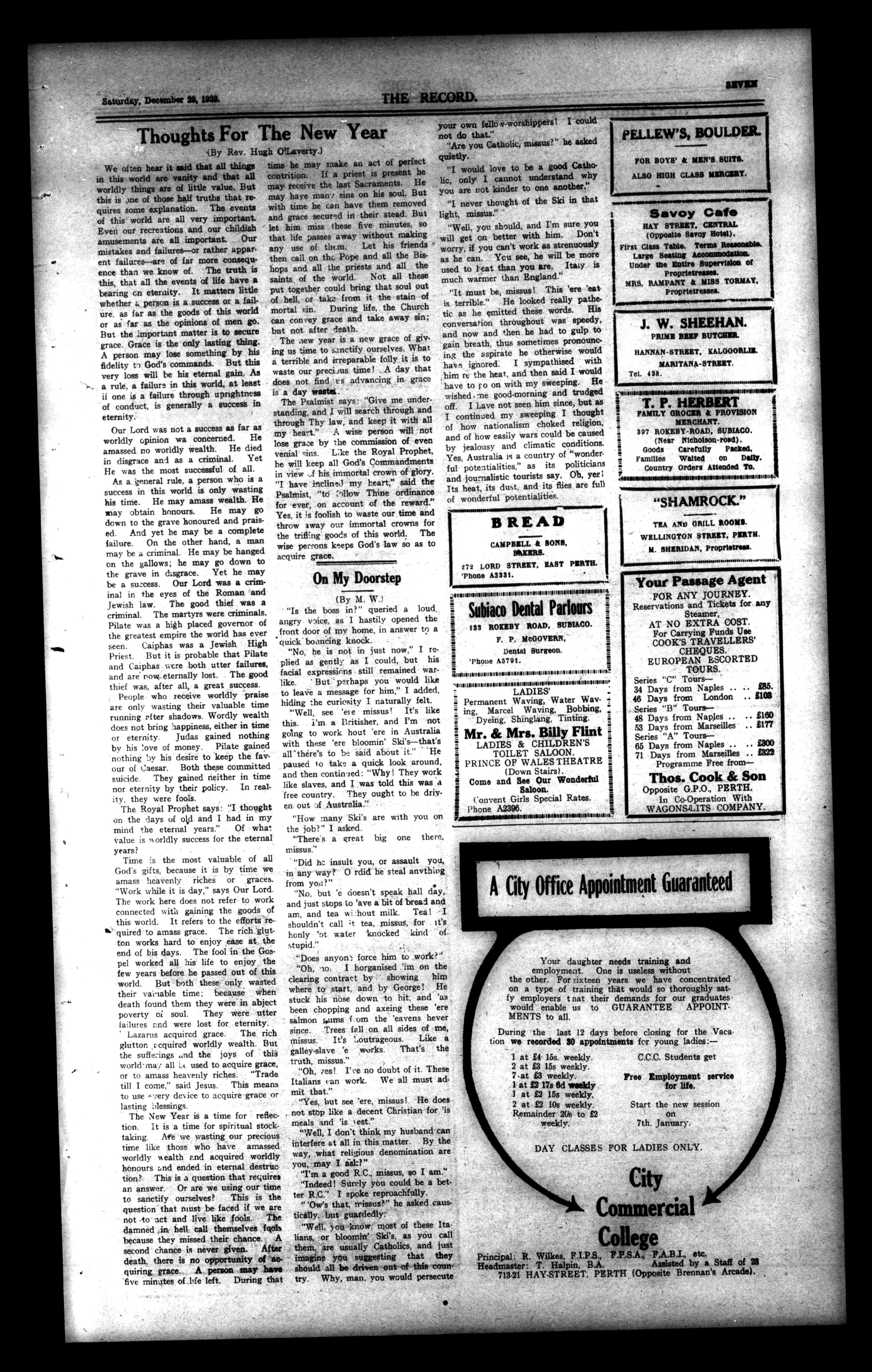 rwittruroxiii 1111RECORD. Saturday,December29,1929. NewHospital,ofSt.JohnofGod SUBIACO. SPLENDIDUP-TO-DATEACCOMMODATION. ClosetoSubiacoandLeedervilleRailwayStations. PalmateMaySelectTheirOwnMedicalAdvisers. TERMSMODERATE.PRIVATEROOMSAVAILABLE. OPENTOALLDENOMINATIONS.ForTermsApplytoRev.Mother. TheSistersalsoConductaSplendidlyEquippedHospitalatKalgoorlie. TheColonialMutualFireInsurance COMPANYLIMITED FIRE,MARINE,ACCIDENT,WORKERS'COMPENSATION, EMPLOYERS'LIABILITY. HAYSTACKS,GROWINGCROPS,ANDLIVESTOCK ASPECIALTY. E.MIDWOOD,Manager. BARRACKSTREET,PERTH. ApplicationsInvitedforAgenciesinDistrictsWhereNotAlready Represented. Ifyoucan'tget SwanBitter whereyougo, gowhereyouCANgetit! AskforSWANBITTERon Draught 'WOOL,SHEEPSKINS,HIDES,TALLOW,KANGAROOANDFUR SKINSBOUGHTINANYQUANTITYBYCHARLESHORMANN,FREMANTLE CONSIGNREGULARLY.PROMPTCASHONDELIVERY. NOCOMMISSIONCHARGED. BoxallandLynch Dentists NewPremises MOANACHAMBERS HayStreet,nearBarrackStreet Mr.W.BoxallCanbeConsultedPersonally OurLadyofMeicy'sCollege,VictoriaPark CONDUCTEDBYTM!'JOLTERSOFMERCY. LocationUnsurpassedforConvenors*,Healthfulness,andBeauty. BoardingandDaySchoolforYoungLadiesandLittleGirls. ForParticularsApplytrtheMotherSuperior. RESOLVED-THATFOR/iv. NEWYEAR Wewillbuyour GROCERIES WINES,ALEANDSPIRITS from CharlieCarter 3BIGSTORES HAYSTREET }PERTH BARRACKSTREET MARKETSTREET,FREMANTLE LTD, WoodSonsNewTea IsDistinctiveinQuality.OrderTo-day BLENDEDANDPACKEDINOURWAREHOUSE,FREMANTLE. ChristianBrothers'College,Perth BOARDINGANDDAYSCHOOL. BOYSAREADMITTEDATANYTIMEDURING THETERM. COMMERCIALWORKASPECIALTY. ForParticularsApplytoTHEPRINCIPAL. St.Ildephonsus'College NEWNOROLL CONDUCTEDBYTHEMARISTBRQTHERS. FORTERMSANDFULLPARTICULARS,APPLYTO THEBROTHERPRINCIPAL. NOTICETOPARENTS. ParentswishingtocommunicatewiththeBrothersduringtheholi. daysarerequestedtonotethatallcommunicationsbetween13th.December,1928and15th.January,1929,shouldbeaddressed:Brother Director,St.Ildephonsus'College,c/oTheMaristBrothers,Glenelg. SouthAustralia. BOWRA O'DEA,Undertakers GeneralFuneralFurnishers MOTORVEHICLES FUNERALSCONDUCTEDINANYPARTOFTHESTATE. NotetheAddress-195PierStreetPERTH 'Phone,A4308;Private'Phones:A2938andA3376. PrintedandPublishedfortheRomanCatholicArchbishopofPerth,byTHOMASSLATTERY,460Hay-street,Perth.
