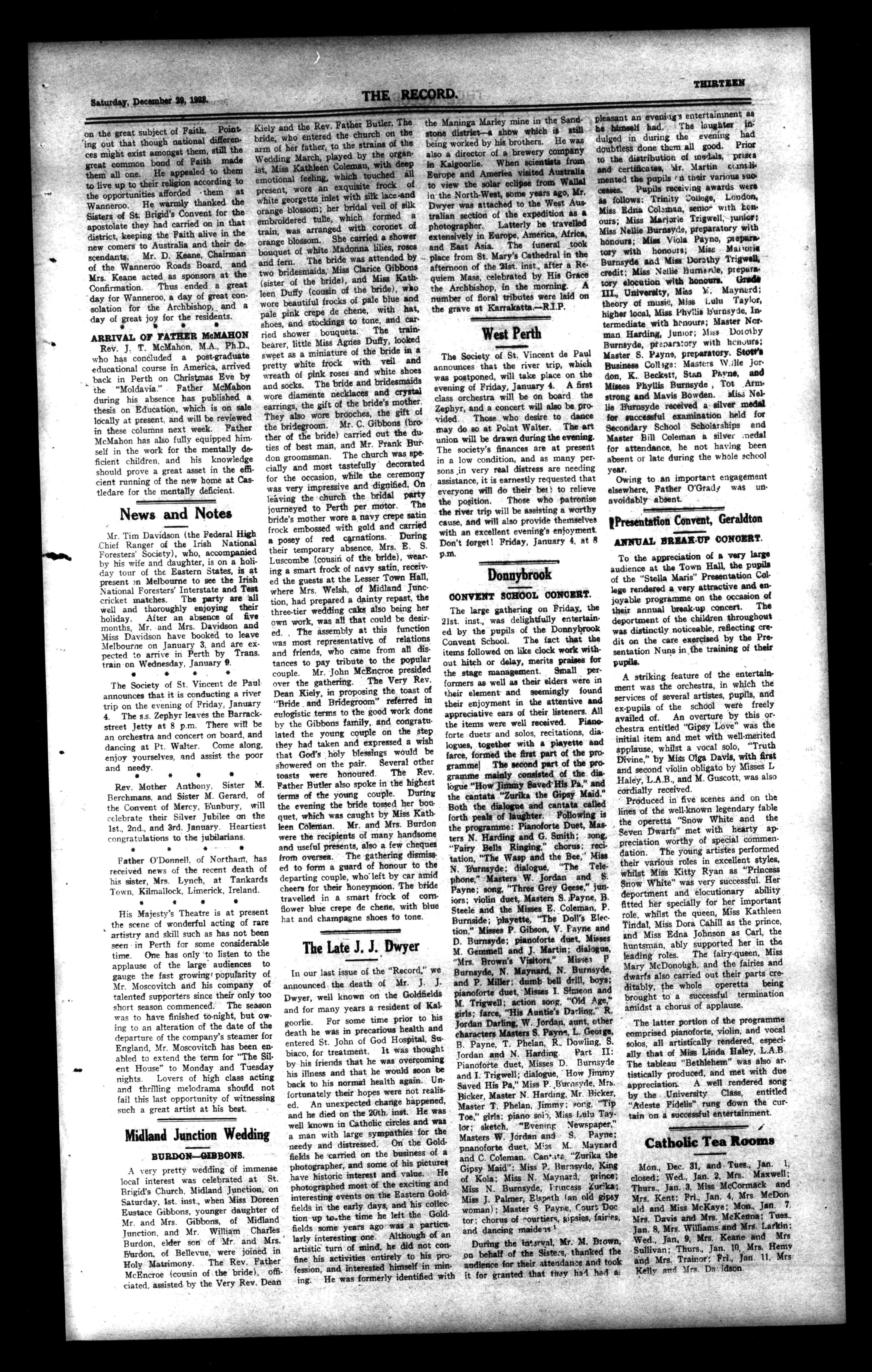 Theannualbreak-upofSt.Domin-.educationalinstitutionsoftheState. ids'sCollegetookplaceonThursday "Therearemanyimportantitemsin afternoon,December13,inthespaciousthisreporttowhichImightreferat RecreationRoom.Itwasofapri.greatlength,butthiswouldonlydevatenatureowingtotherecentsuds-tainyou.,needlesslylong.Thereis, dendeathofRev.FatherO'Hare.however,onepart.ofthereportwhich Nevertheless,severalparentsandinterestsmemorethantheothers, friendswerepresent.TheRev.FatherandthatiswhereintheSistersstate Harrisonpresided,andafterreadingthatthemoraltoneoftheCollegehas thereport.distributedtheprizesandteenmostsatisfactory.Inacertain certificates. 'sense,ImaysaythatIhavebeensent herebyHisGracetheArchbishopasa sortofspiritualdirectorofthisinstitution,and,therefore,anythingthat pertainstothereligiouswelfareofthe studentsisofthegreatestinterestand importancetomeandmysuperiors. IamanAustralianmyself,andknow agooddealaboutAustralianstudents,andIhavemetthechildrenof Catholicschoolsinotherpartsofthe world,inRome,England,Franceand Ireland,andIcansay,withoutany mentalreservationwhatever,thatthe childrenofSt.Dominick'sCollegewill comparefavourablywithanywhomI havemetelsewhere.Iattributethis, notonlytothereligiousatmosphere withwhichthesestudentsaresurroundedatthemostimpressionable periodoftheirlives,butalsotothe factthattheyareundertheguidance ofsuchafinebodyofteachersasthe DominicanNuns,womenwhoseculture,refinement,andattainments,as wellastheirself-sacrificeinthegreat causeofreligionandeducation,have wonsuchmeritedrenowninvarious partsoftheworld.