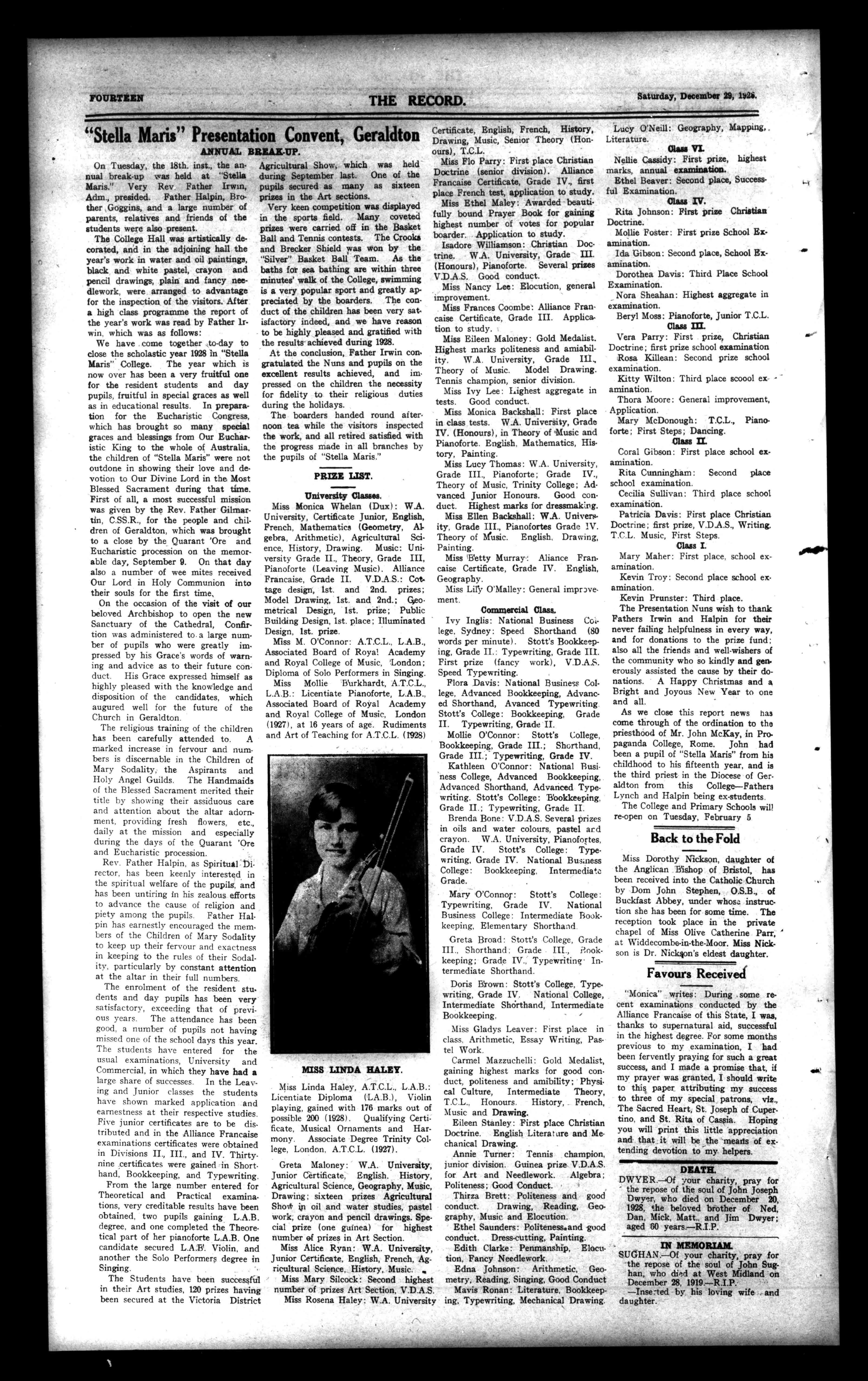 Elocution:MissIvyBingham. figures,butthefactsandfiguresin Sport-Seniors:MissAgnesLamthisreportspeakforthemselves,andpard.Juniors:-MissEdithMcQuil- arecertainlybeyondcontradiction.Ian. 'Toconfirmthis,youhave_onlyto ChallengeCupforSportsFormsII, lookaroundyouandseetheevidencesandIII.combinedteam. ofthefineworkdonebythestudents DeportmentandPhysicalCulture: duringtheyear.Successofthiskind MissIvyBingham. cannotfailtowintherespectandad- Politeness:MissSylviaWatson. mirationoftheparentsinthecountry GoldChallengeMedal,Orderand districtsandelsewhere,especiallyGeneralProficiencyMissDollyWells. thosewhofullyrealisethegreatad- PunctualityandFullYear'sAttendvantageswhicharetobegainedinaante:Silvermedal,MissMaryFoley, collegeofthiskind.OnemaysayPrizes:_MissesJeanThomas,,Sylvia withtruth,andwithoutundueoptim-Watson,AlmaLyons,VeraSaggers, ism,that,incourseoftime,astheMollySheahan,EileenSheahan. countrydevelops.St.Dominick'sCol- GoodConduct:Goldmedalist,Miss legewillbecomeoneoftheleadingMaryLynch. 1-4*'"