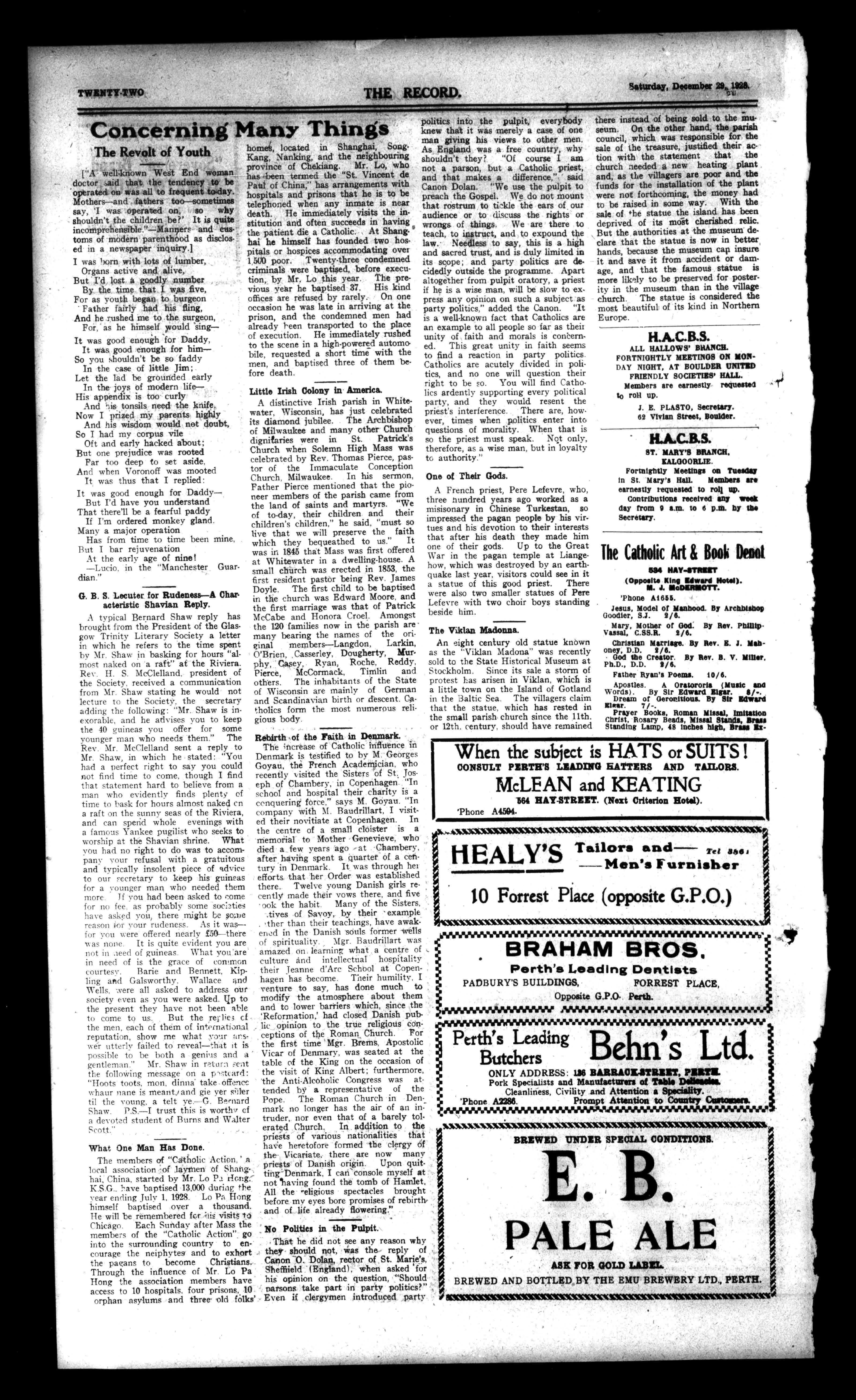 2/6. FatherRyan'sPoems.10/6. Apostles. AOratororis(Musicand Words). BySirEdwardEiger.5/-. DreamofOerocitious.BySirEdward Rorer. T/-. PrayerBooks,RomanMissal,Imitation Christ,RosaryBeads,MissalStands,Brass StandingLamp,48Incheshigh,BrasstsWhenthesubjectis CONSULTPERTH'SLEADING McLEANand 164HAY-STREET. 'PhoneA4594. HATSorSUITS! FLATTERSANDTAILORS. KEATING (NextCriterionHotel). HEALY'STailorsand-Telsee ---Men'sFurnisher 10ForrestPlace(oppositeG.P.O.) IMAWANWAWAPABWAIWWWWW.10 BRAHAMBROS.? Perth'sLeadingDentists PADBURY'SBUILDINGS, FORRESTPLACE, OppositeG.P.O.Perth. ANW6WWWWWWAMAMI' 'L. Perth'sLeadingT1hn Butchers Destd / / / / / // / ONLYADDRESS.116BARRACL$TRIIT,MUM PorkSpecialistsandManufacturersofTableDella-u Cleanliness,CivilityandAttentionaSpeciality. 'PhoneA2286. APAWMAANYVVIWAY1WWWWWANVANWAWANIAW PromptAttentiontoCountryCustoms's. 74.10NYLWMICW6.110004.10.11iWZIMICILIMM144=3004=3COVIOWCWIZICS BREWEDUNDERSPECIALCONDITIONS. E.B. PALEALE / / / / // / / / / / / / / ASHFORGOLDLABEL / BREWEDANDBOTTLEDBYTHEEMUBREWERYLTD.,PERTH.6 ILIMICIEWOKIMMILIOCIMMICIMIZIMCKILLN5