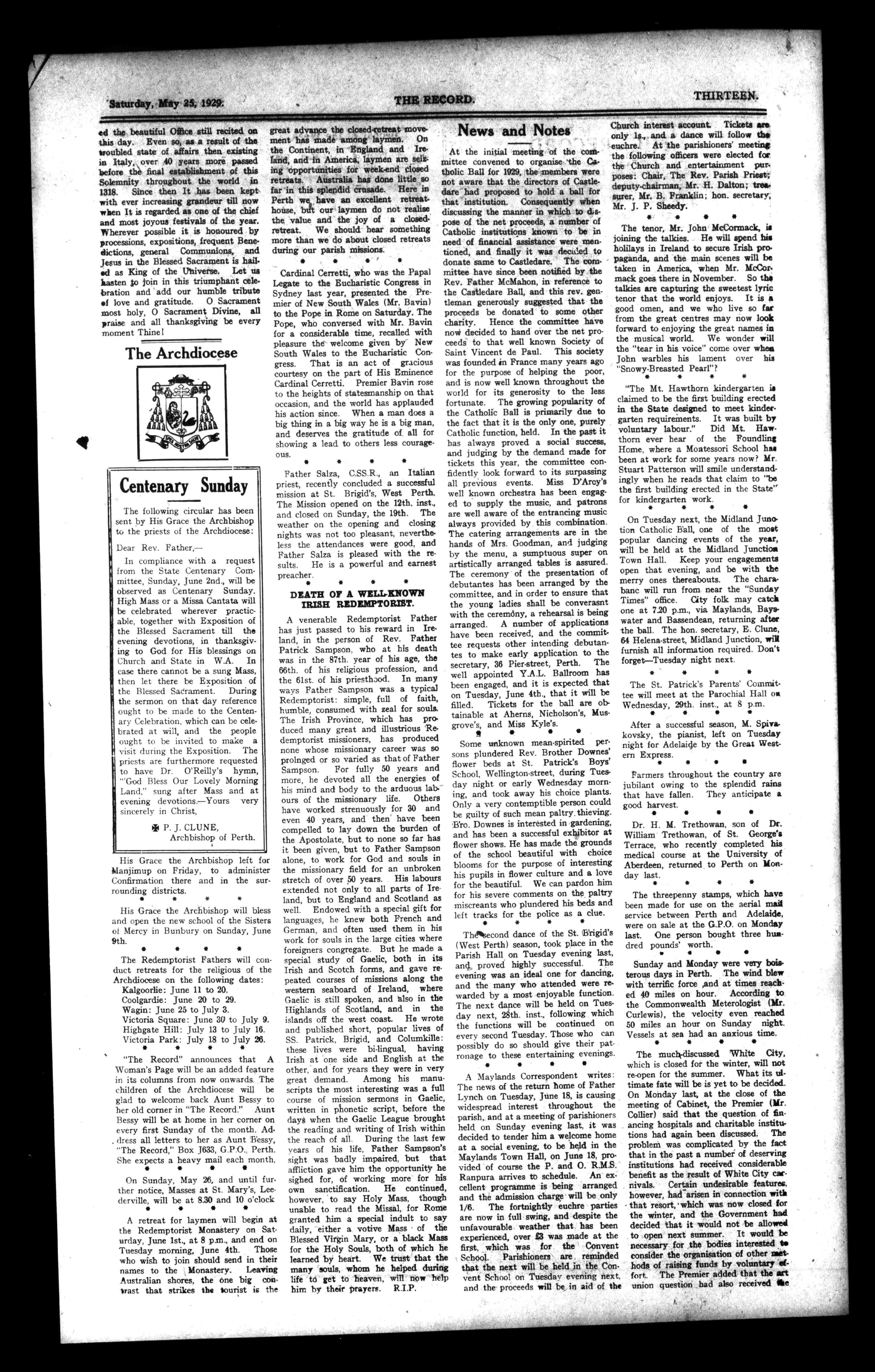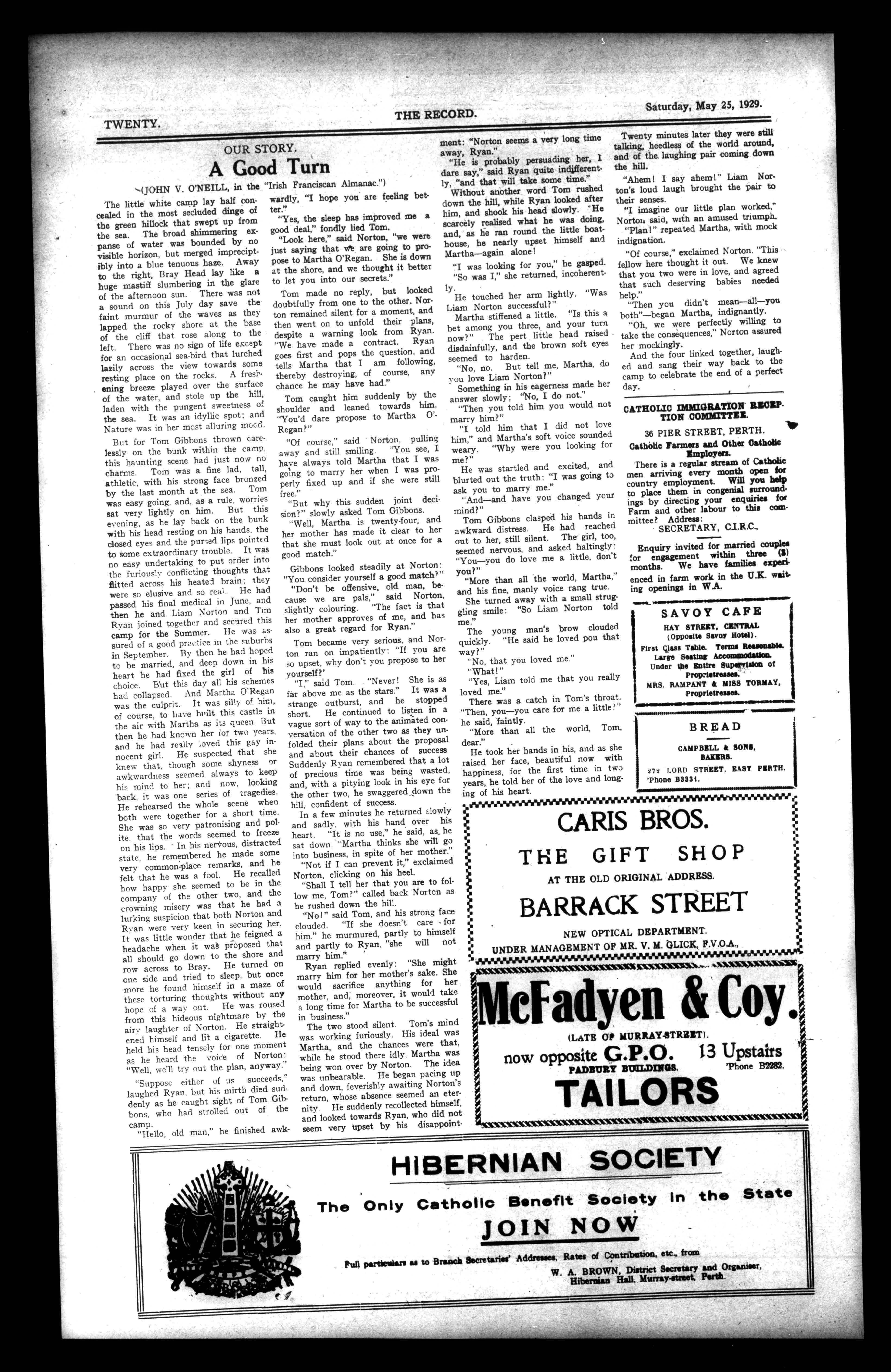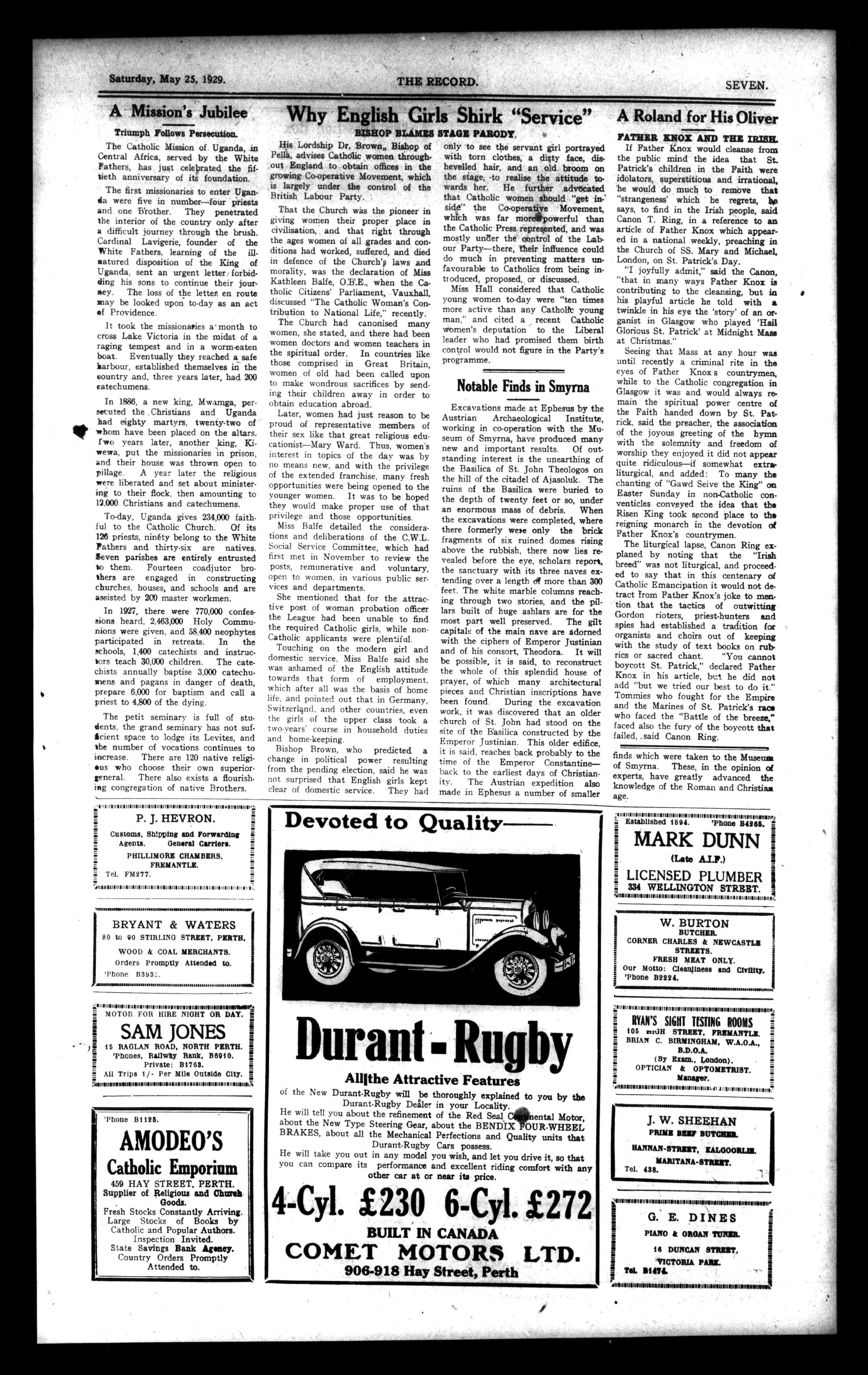 TWENTY-FOOk. 1111111.1 tibitt,CoRD. on: NewHospital;ofSt.JohnofGod SUBIA00. SPLENDIDUP-TO.DATEACCOMMODATION. Oboesto&MaceandLeedervineRailwayStatioos. PeihatsMNMintnitsOwaMEWadvissra. TEEMSMODERATE.PRIVATEROOMSAVAILABLE. OPENTOALLDENOMINATIONS.ForTermsApplytoRev.Mother. TheSiftersalsoConductaSplendidlyEquippedHospitalatKalgoorlie. TheColonialMutualFireInsurance COMPANYLINLITED FIRE,MARINE,ACCIDENT,WORKERS'COMPENSATION, EMPLOYERS'LIABILITY. HAYSTACKS,GROWINGCROPS,ANDLIVESTOCK ASPECIALTY. E.MIDWOOD,Manager. BARRACKSTREET,PERTH. AppEsationsInvitedforAgenciesinDistrictsWhereNotAlready Represeated. Ifyoucan'tget SwanBitter whereyougo, gowhereyouCANgetit! AskforSWANBITTERon Draught WOOL,SHEEPSKINS,HIDES,TALLOW,KANGAROOANDFUR SKINS BOUGHT IN ANYQUANTITYBY CHARLESHORMANN,FREMANTLE CONSIGNRtGULARLY.PROMPTCASHONDELIVERY. NOCOMMISSIONCHARGED. BoxallandLynchDentists NewPremises MOANACHAMBERS HayStreet,nearBarrackStreet Mr.W.BoxallCanbeConsultedPersonally Saturday,May25,1929. OurLadyofMercy'sCollege,VictoriaPark CONDUCTEDBYTHERISTERSOFMERCY. LocationUnsurpassedforConvenience,Healthfulness,andBeauty. BoardingandDaySchoolforYoungLadiesandLittleGirls. ForParticularsApplytotheMotherSuperior. *men dailyshopat-Everydaythousandsofdiscriminatingwomen ineverypartoftheStatebuytheirfoodfrom CharlieCarter'sbypost,by'phone,andinper- son-andthere'sareason.Itisthateveryon, preferstoshopwherethebestoffoodsofde lightfulfreshnessaresoldatthelowprices madepossiblebythehugescalebuyingofthis greatGroceryOrganisation. CHARLIECARTERLTD. 558HAYSTREET.111BARRACKSTREET,ADELADESTREET. FREMANTLE, 11111111=.. ChristianBrothers'College,Perth ABOARDINGANDDAYSCHOOL. BOYSAREADMITTEDATANYTIMEDURING THETERM. COMMERCIALWORKASPECIALTY. ForParticularsApplytoTHEPRINCIPAL. St.Ildephonsus'College. NEWNOROIA. CONDUCTEDBYTHEMARISTBROTHERS. FORTERMSANDFULLPARTICULARS,APPLYTO THEBROTHERPRINCIPAL. BREWEDUNDERSPECIALCONDITIONS. E.B. PALEALE ASEFORGOLDLABEL. BREWEDANDBOTTLEDBYTHEEMUBREWERYLTD.,PERTH BOWRA O'DEA)Undertakers GeneralFuneralfurnishers MOTORVEHICLES FUNERALSCONDUCTEDINANYPARTOFTHESTATE. NotetheAddress-195PierStreetPERTH 'Phone,B4308;Private'Phones:B2938andB3376. PrintedandPublishedfortheRawsonCatholicArchbishopofPerth,byTHOMASSLATTERY,450Hay-street,1-erth.
