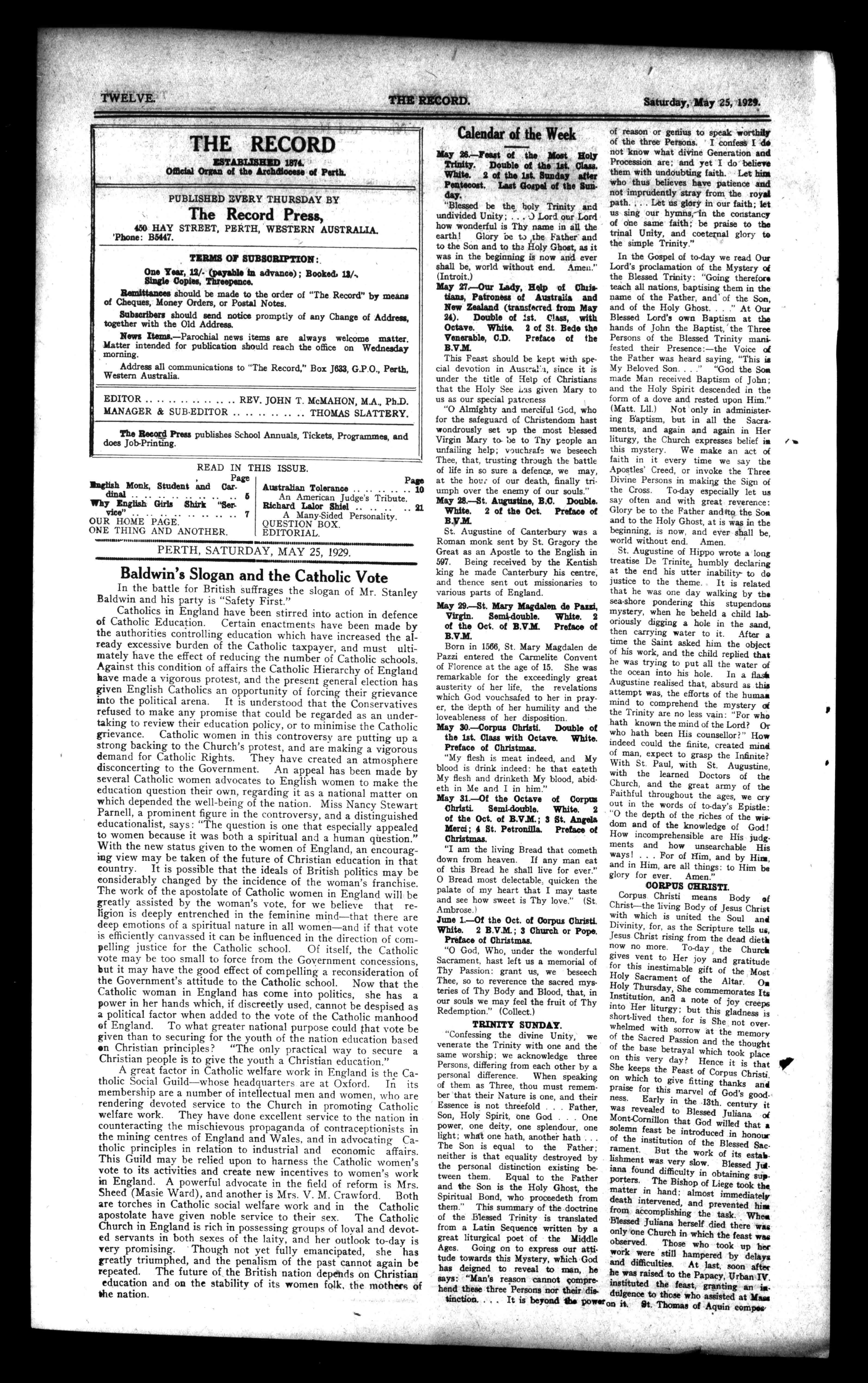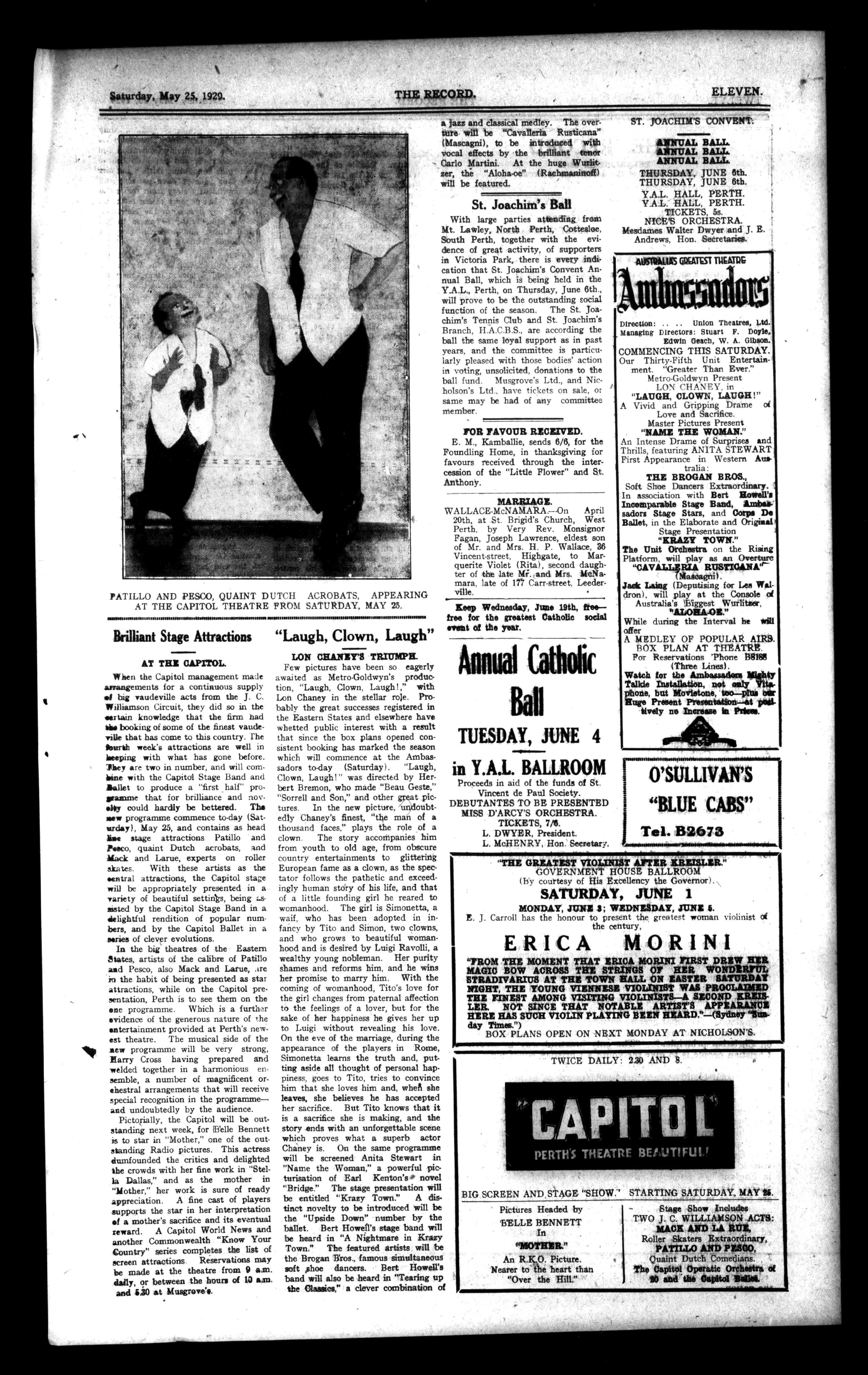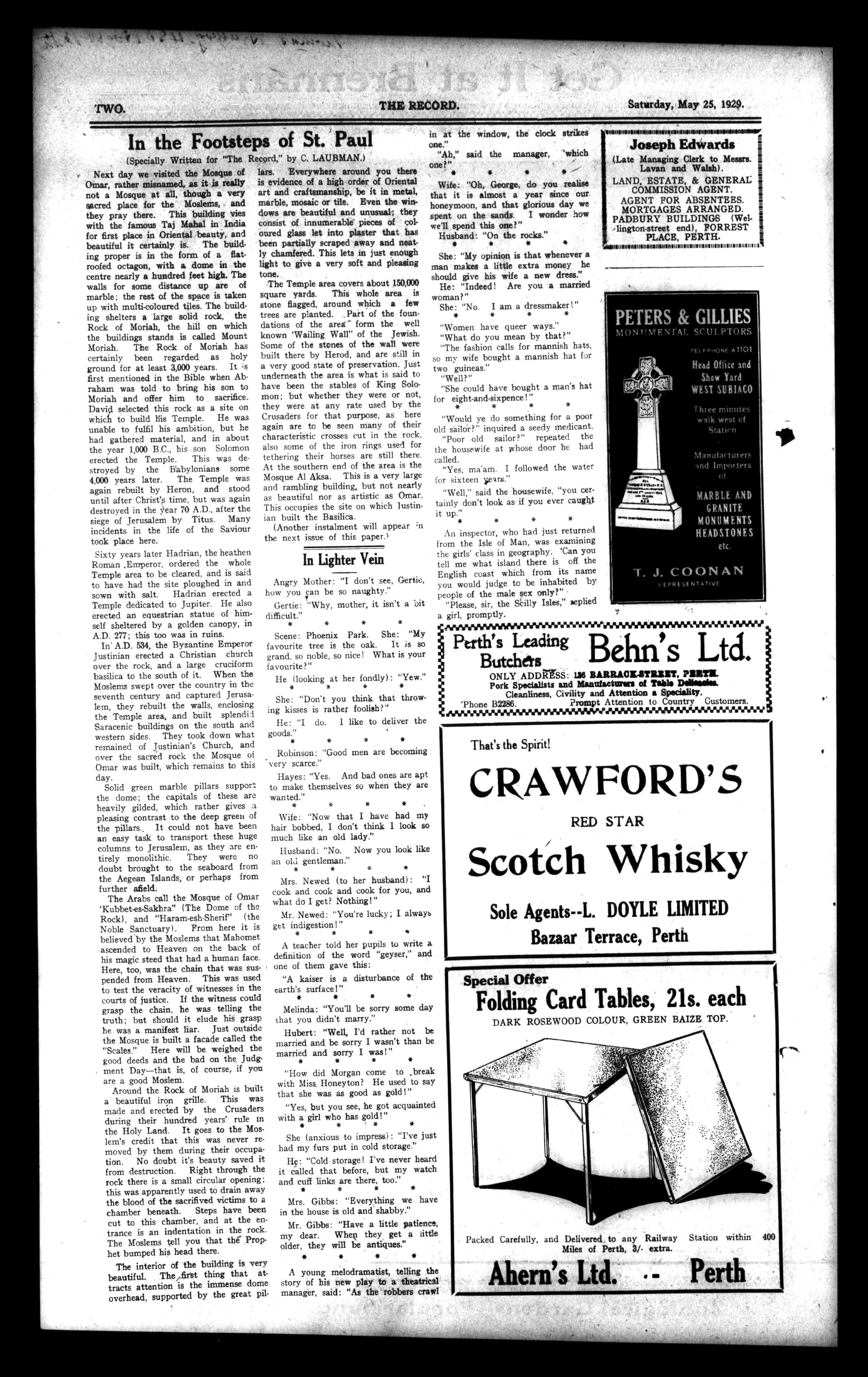 TWENTY-FOOk. 1111111.1 tibitt,CoRD. on: NewHospital;ofSt.JohnofGod SUBIA00. SPLENDIDUP-TO.DATEACCOMMODATION. Oboesto&MaceandLeedervineRailwayStatioos. PeihatsMNMintnitsOwaMEWadvissra. TEEMSMODERATE.PRIVATEROOMSAVAILABLE. OPENTOALLDENOMINATIONS.ForTermsApplytoRev.Mother. TheSiftersalsoConductaSplendidlyEquippedHospitalatKalgoorlie. TheColonialMutualFireInsurance COMPANYLINLITED FIRE,MARINE,ACCIDENT,WORKERS'COMPENSATION, EMPLOYERS'LIABILITY. HAYSTACKS,GROWINGCROPS,ANDLIVESTOCK ASPECIALTY. E.MIDWOOD,Manager. BARRACKSTREET,PERTH. AppEsationsInvitedforAgenciesinDistrictsWhereNotAlready Represeated. Ifyoucan'tget SwanBitter whereyougo, gowhereyouCANgetit! AskforSWANBITTERon Draught WOOL,SHEEPSKINS,HIDES,TALLOW,KANGAROOANDFUR SKINS BOUGHT IN ANYQUANTITYBY CHARLESHORMANN,FREMANTLE CONSIGNRtGULARLY.PROMPTCASHONDELIVERY. NOCOMMISSIONCHARGED. BoxallandLynchDentists NewPremises MOANACHAMBERS HayStreet,nearBarrackStreet Mr.W.BoxallCanbeConsultedPersonally Saturday,May25,1929. OurLadyofMercy'sCollege,VictoriaPark CONDUCTEDBYTHERISTERSOFMERCY. LocationUnsurpassedforConvenience,Healthfulness,andBeauty. BoardingandDaySchoolforYoungLadiesandLittleGirls. ForParticularsApplytotheMotherSuperior. *men dailyshopat-Everydaythousandsofdiscriminatingwomen ineverypartoftheStatebuytheirfoodfrom CharlieCarter'sbypost,by'phone,andinper- son-andthere'sareason.Itisthateveryon, preferstoshopwherethebestoffoodsofde lightfulfreshnessaresoldatthelowprices madepossiblebythehugescalebuyingofthis greatGroceryOrganisation. CHARLIECARTERLTD. 558HAYSTREET.111BARRACKSTREET,ADELADESTREET. FREMANTLE, 11111111=.. ChristianBrothers'College,Perth ABOARDINGANDDAYSCHOOL. BOYSAREADMITTEDATANYTIMEDURING THETERM. COMMERCIALWORKASPECIALTY. ForParticularsApplytoTHEPRINCIPAL. St.Ildephonsus'College. NEWNOROIA. CONDUCTEDBYTHEMARISTBROTHERS. FORTERMSANDFULLPARTICULARS,APPLYTO THEBROTHERPRINCIPAL. BREWEDUNDERSPECIALCONDITIONS. E.B. PALEALE ASEFORGOLDLABEL. BREWEDANDBOTTLEDBYTHEEMUBREWERYLTD.,PERTH BOWRA O'DEA)Undertakers GeneralFuneralfurnishers MOTORVEHICLES FUNERALSCONDUCTEDINANYPARTOFTHESTATE. NotetheAddress-195PierStreetPERTH 'Phone,B4308;Private'Phones:B2938andB3376. PrintedandPublishedfortheRawsonCatholicArchbishopofPerth,byTHOMASSLATTERY,450Hay-street,1-erth.
