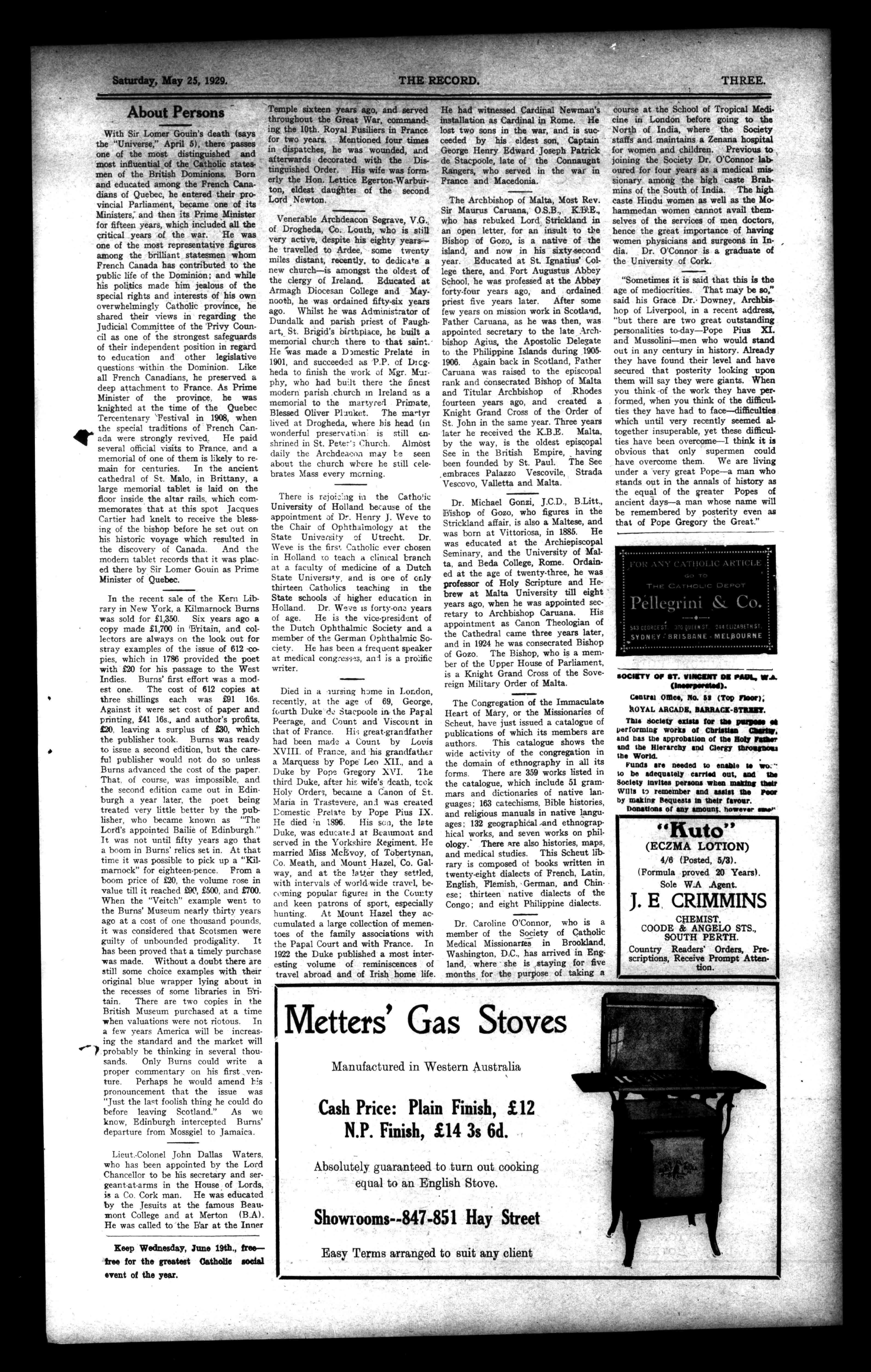 TheArchbishopofMalta,MostRev. SirMaurusCaruana,O.S.B., whohasrebukedLordStricklandin anopenletter,foraninsulttothe BishopofGozo,isanativeofthe island,andnowinhissixty-second year.EducatedatSt.Ignatius'Collegethere,andFortAugustusAbbey School.bewasprofessedattheAbbey forty-fouryearsago,andordained priestfiveyearslater.Aftersome fewyearsonmissionworkinScotland, FatherCaruana,ashewasthen,was appointedsecretarytothelateArchbishopAgius,theApostolicDelegate tothePhilippineIslandsduring19061906.AgainbackinScotland,Father Caruanawasraisedtotheepiscopal rankandconsecratedBishopofMalta andTitularArchbishopofRhodes fourteenyearsago,andcreateda KnightGrandCrossoftheOrderof St.Johninthesameyear.Threeyears laterhereceivedtheK.B.E.Malta, bytheway,istheoldestepiscopal SeeintheBritishEmpire,having beenfoundedbySt.Paul.TheSee ,embracesPalazzoVescovile,Strada Vescovo,VallettaandMalta.
