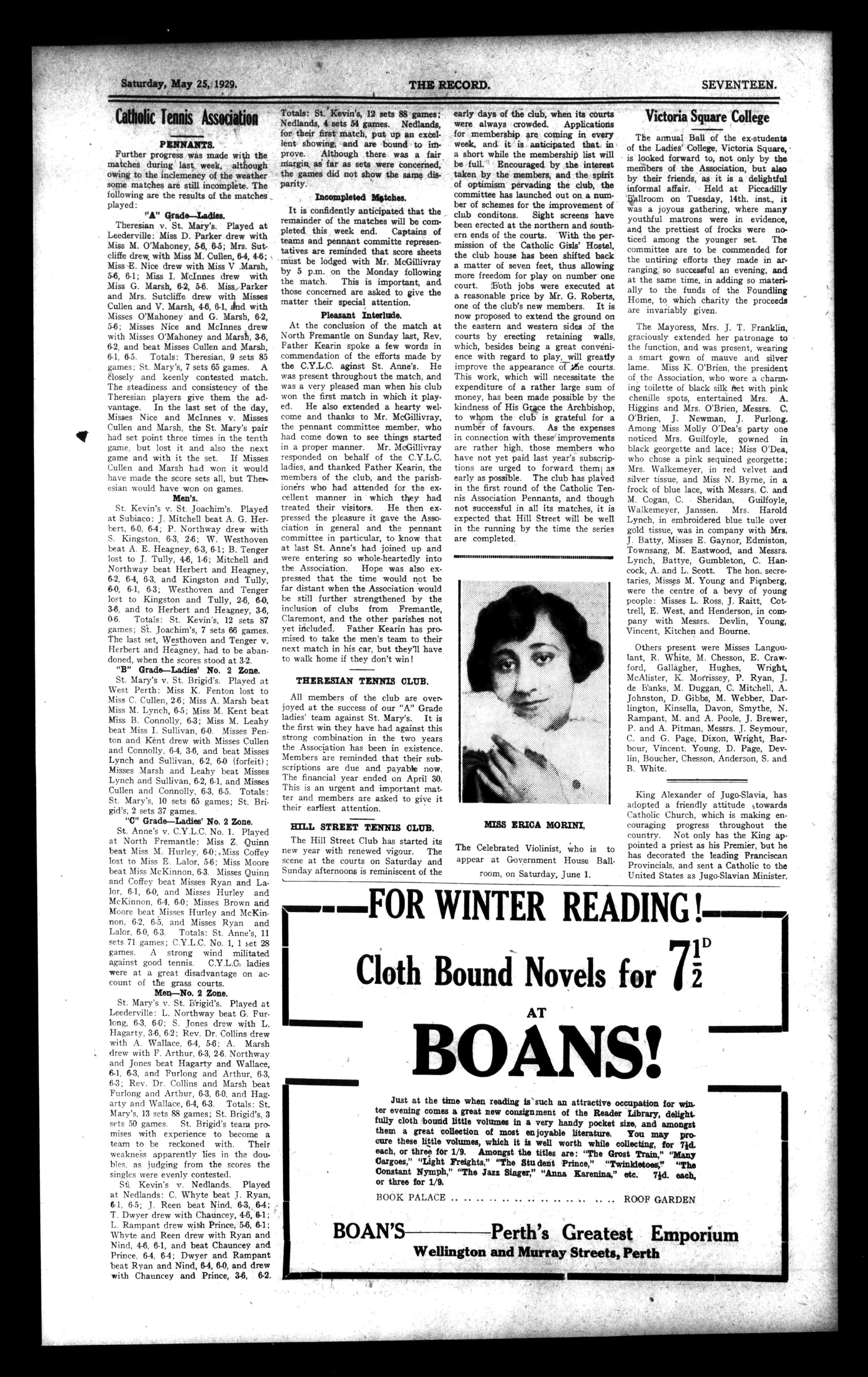 /Imre GetItatBrennang 4im ummeovwememme.........wfle3 2 NI 01 000 PUBLISHEDWEEKLY. ADDRESS:BOX416SAG.PA). 'PHONEA6447. CATHOLICWEEKLYCIRCULATINGTHROUGHOUTTHESTATEOFWESTERNAUSTRALIA. PRICETHREEPENCE. RegisteredattheG.P.O.,Perth,forTransmissionbyPostasaNewspaper. ESTABLISHED1874. No.2,572 NONNINTNINDI PERTH,SATURDAY,MAY25,1929 ONIONI0011000.0NNIDIMINIONNIMIIIONIP11111101I11111NONNIONIDIONNI INVOINNIN=osoo ST,JAMESPARK ABRICKAREA. SituatedonMainAlbanyRoad,withgoodBusCommunicationtotheCity Nowbeingsoldonourexceptionallyeasyterms.NominalDeposit-FiveYears'Terms.£1PerMonth.FreeofInterest-FreeInsurance Call,'Phone,orWrite. BeMotoredtoInspect. LandandHomes,W.A.Limited 75BARRACKSTREET,PERTH. B5160. YOURSILKS AREBESTPROCUREDAT COURT'S ONEQUALITY-THEHIGHEST!ONEPRICE-THELOWEST! CONVENTS,OOLLIGILINSITITTIONSANDSCHOOLSSPECIALLYCATEREDFOR. THEYAREINBARRACKSTREET QualityProvisions TheGoodsatthePrice-CommandtheBusiness. Letsentimentplayitspart,butbeFAIRtoYOURSELF. CheckuptheCostofProvisioningYourHome. BesureyouarebuyingfromthemanufacturerwithonlyOne CostofHandling. Ifunabletoshoppersonally,POSTYOURORDERS. EveryHundredthOrderFree Thereisnocatch;itissimplyadvertisingthatpays. AlreadynearlyninetyorderssuppliedFree.Duringthelast weekFREEORDERShavegoneto:Mrs.Rutherford,6Elizabeth-street,NorthPerth,£1/1917. Mrs.Wright,Rose-avenue,SouthPerth,value£1/4/9: 'Mr.J.Thomson,Pithara,value£6/4/6. POSTATRIALORDERTO-DAY. JohnWills&Co.Ltd. PERTH'SLEADINGPROVISIONSTORES. WillsgoodHouse Wellington-street, PERTH. :-....".".V.WWWWWWW1WWWW.Weed~ In'mum2)nYitiie SIOINIIINIINIIII=10111=======s Vol.LIII. ADO ION INNONNIONINIIINNOINIMPINDIONININ00 CommencingWednesday, May22 ANDCONTINUINGFORONEWEEK Mid-Winter Attractions AT FOY&GIBSON'S WatchDailyPapersfor SavingsonSeasonable Wants--Andthesevere Wintermonthshaveyet tocome. Foy&GibsonPty.Ltd. UniversalProviders,HayStreet,Perth 1=1 I=1 II= I= OD INIIIIIINNONNI=NOINIIIIIIONSOMPOINNNINNO0111111 ZoologicalGardens-PopularSundayAfternoons