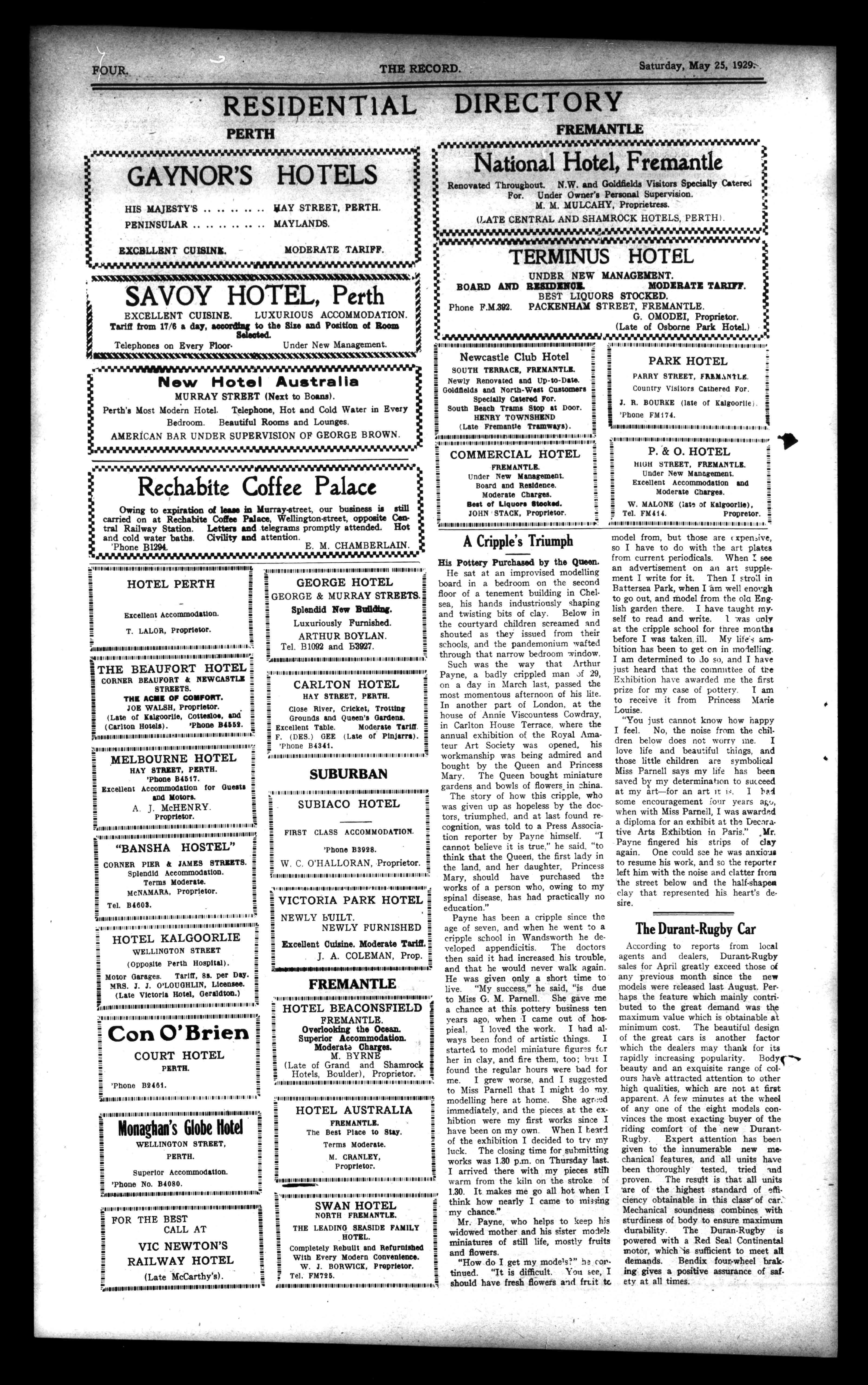 GENERAL COMMISSIONAGENT. AGENTFORABSENTEES. r; MORTGAGESARRANGED. PADBURYBUILDINGS(Wellington-streetend),FORREST PLACE,PERTH. PETERS&GILLIES NIONIvENIAT,SCULPTORS rElP,40AIFA1101 HeadOfficeand ShowYard WESTSUBIACO Threeminutes walkwestof Station Manufarturer Importers of MARBLEAND GRANITE MONUMENTS HEADSTONES etc. T.J.COONAN PRISENTATIVI AdViANWAINWPANW.%%%INVANyvewwwwiwitswwiewee Perth'sLeadingB Butch'sehn'sLtd . ONLYADDS:136BARRACK/MUMPM& PorkSpecialistsandMa.nufacturersofTableDellualles, Cleanliness,CivilityandAttentionaSpeciality. 'PhoneB2286. PromptAttentiontoCountryCustomers IM Customers. eipiaWNWANNWANWAVANMANWW.W.WWWV That'stheSpirit! CRAWFORD'S REDSTAR ScotchWhisky SoleAgents--L.DOYLELIMITED BazaarTerrace,Perth SpecialOffer FoldingCardTables,21s.each DARKROSEWOODCOLOUR,GREENBAIZETOP. PackedCarefully,andDeliveredtoanyRailwayStationwithin400 MilesofPerth,3/-extra. Ahern'sLtd.-Perth