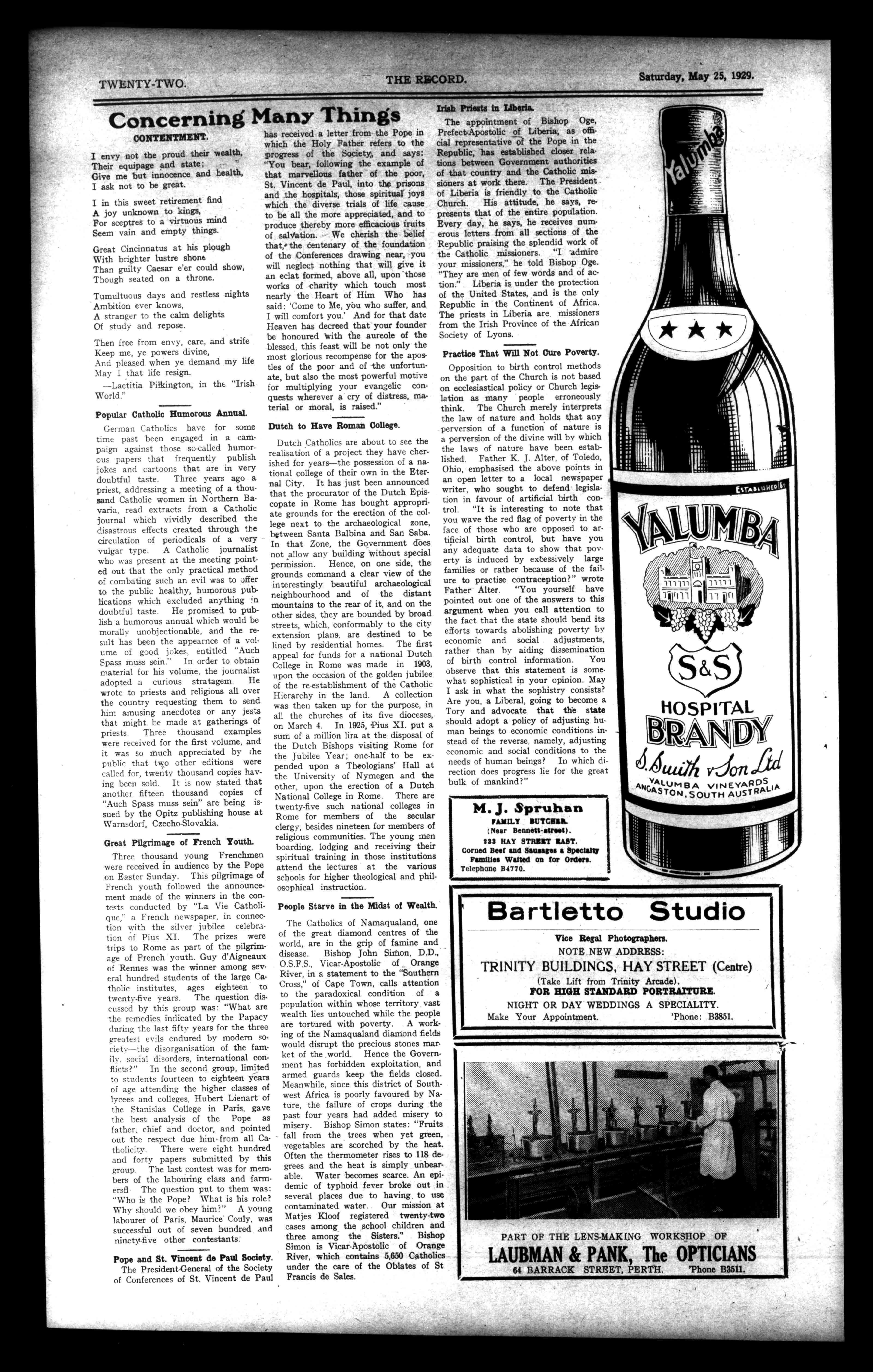 TheappointmentofBishopOge, Prefect-ApostolicofLiberia,asofficialrepresentativeofthePopeinthe Republic,hasestablishedcloserrelationsbetweenGovernmentauthorities ofthatcountryandtheCatholicmissionersatworkthere.ThePresident ofLiberiaisfriendlytotheCatholic Church.Hisattitude,hesays,representsthatoftheentirepopulation. Everyday,hesays,hereceivesnumerouslettersfromallsectionsofthe Republicpraisingthesplendidworkof theCatholicmissioners."Iadmire yourmissioners,"hetoldBishopOge. "Theyaremenoffewwordsandofaction."Liberiaisundertheprotection oftheUnitedStates,andistheonly RepublicintheContinentofAfrica. ThepriestsinLiberiaare.missioners fromtheIrishProvinceoftheAfrican SocietyofLyons.