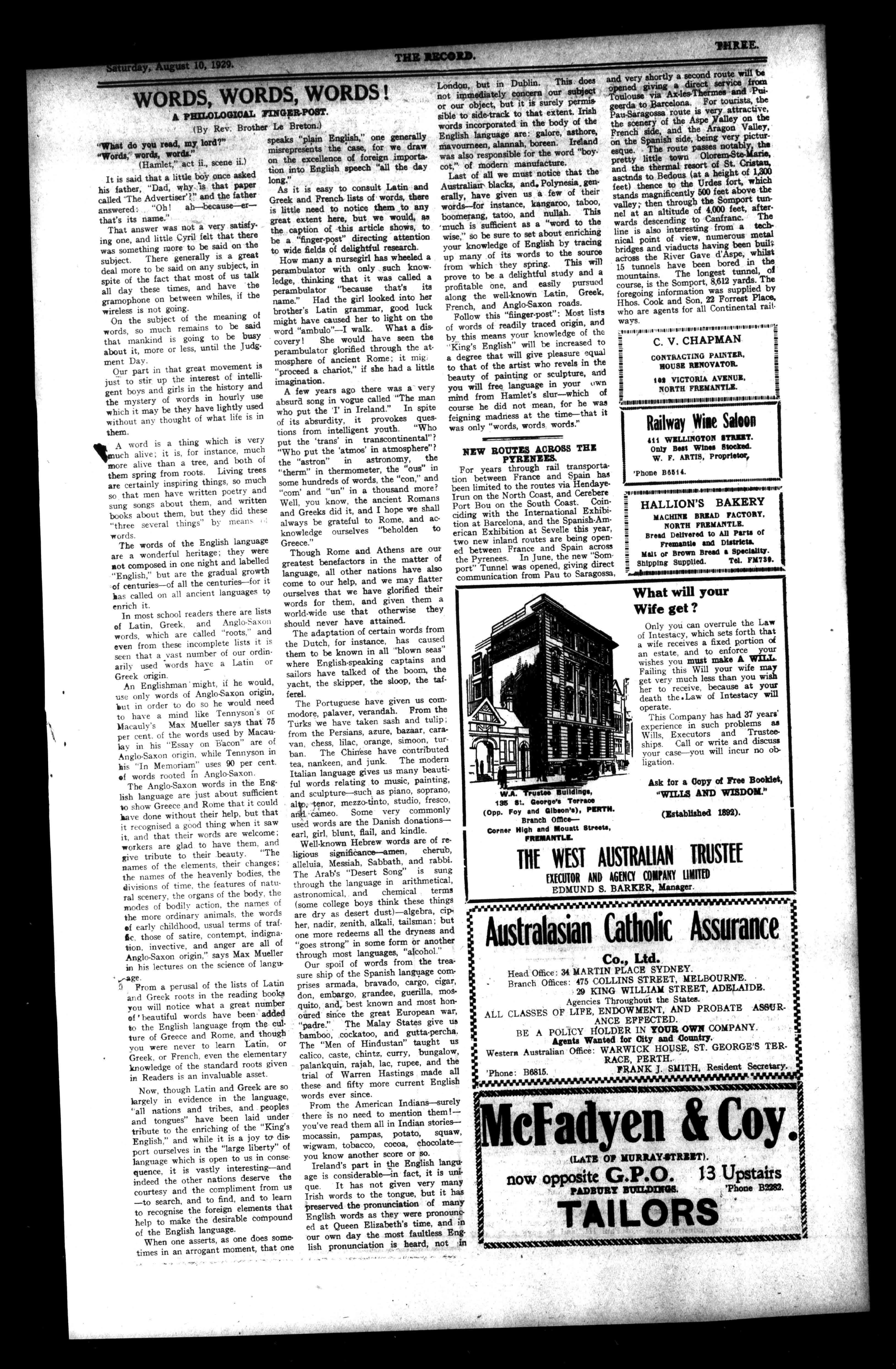THEW.A.DAIRY. WANNEROO-ROAD,OSBORNEPARE. D.KEANE,Proprietor. PureMilkDeliveredTwiceDailyto anypartoftheCity,directfromour ownCowstoCustomers.Tel.B4381.gSupplyingtheConventsandColleges. FREDFLYNN,lateJ.J.Snigg 106BARRACKSTREET. CLOTHIERANDOUTFITTER. THELATESTINSHIRTS,HATS,TIES,ANDMEN'SSUITS,ETC. Established25Years. FredCarriesaLargeStookWerldngMen'sClothes.'PhoneA4717. Vld'AilleierWer5AireeMeeiteiNeVifWAViihrilie%1WWWWWV.V.PearvPerth'sLeadingBehntsLtd. Butchers ONLYADDRESS:116321.01C4711217,PorkSpecialistsandManufacturersoftabDdleades. Cleanliness,CivilityandAttentionaSpeciality. 'PhoneB2286. PromptAttentiontoCountryCustomers. isoweemejwAismusiMANYWAYAMANWROVIAAJ BartlettoStudio ViceRegalPhotographers. NOTENEWADDRESS: TRINITYBUILDINGS,HAYSTREET(Centre) (TakeLiftfromTrinityArcade). FORHIGHSTANDARDPORTRAITURE. NIGHTORDAYWEDDINGSASPECIALITY. MakeYourAppointment. 'Phone:B3851. . S. '11, %%NO.....%. %, 15.15.11053131.352616163135353a136.1611351106.310431i3116 DUFF'S LiqueurWhisky ALWAYSTHESAME 'SA %'4, %%%%% % N. / / // / / / %N, \
