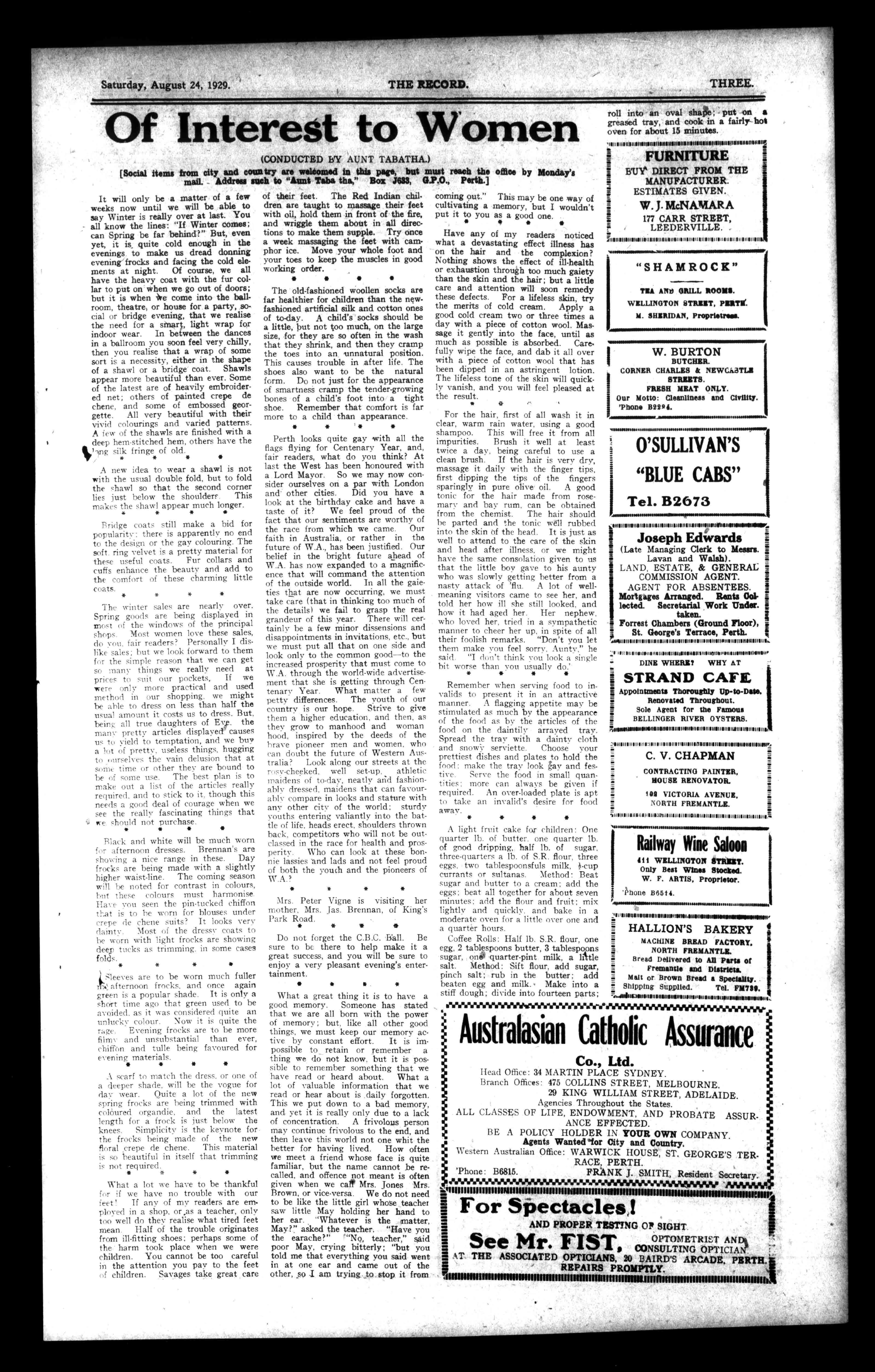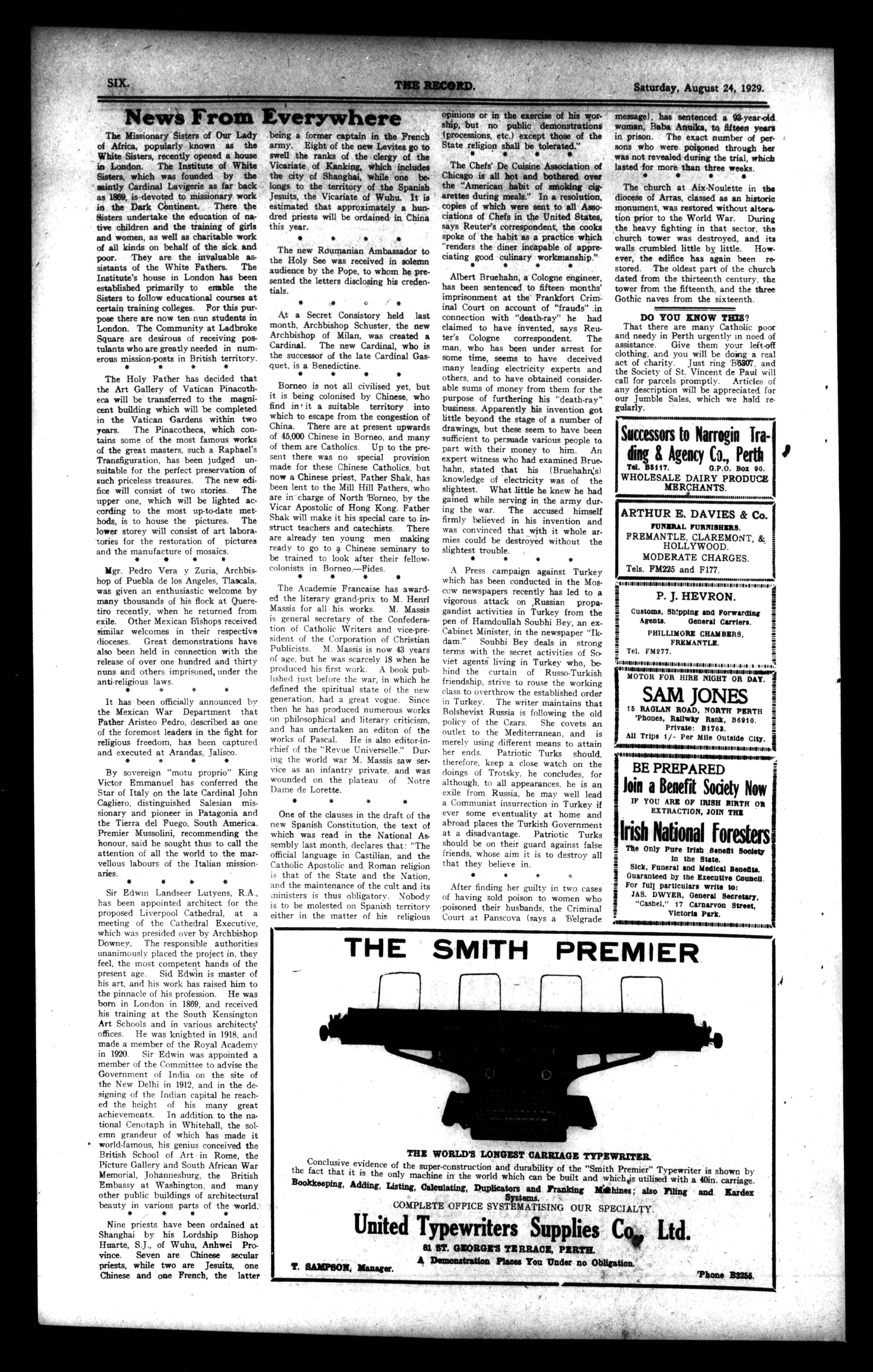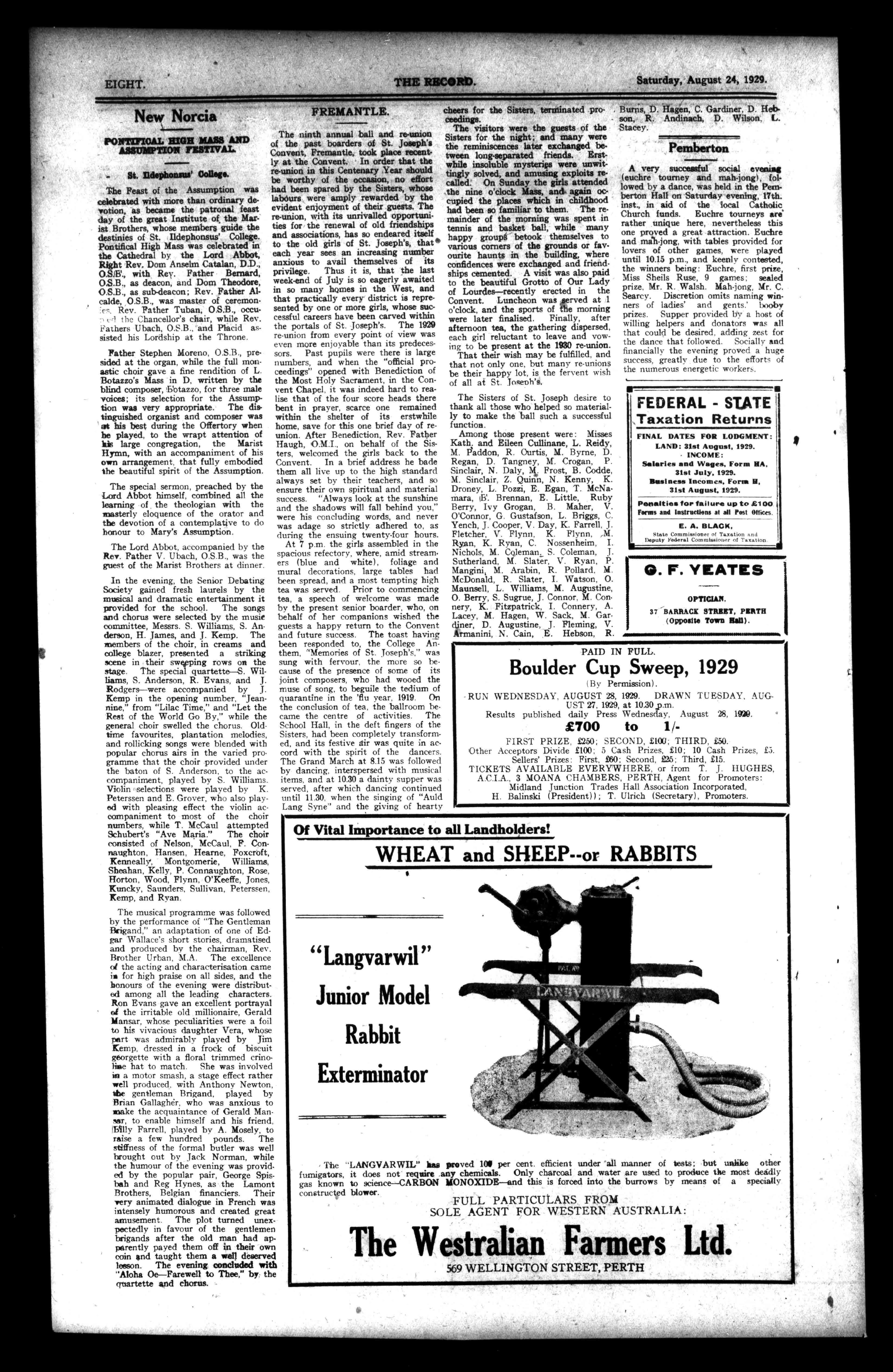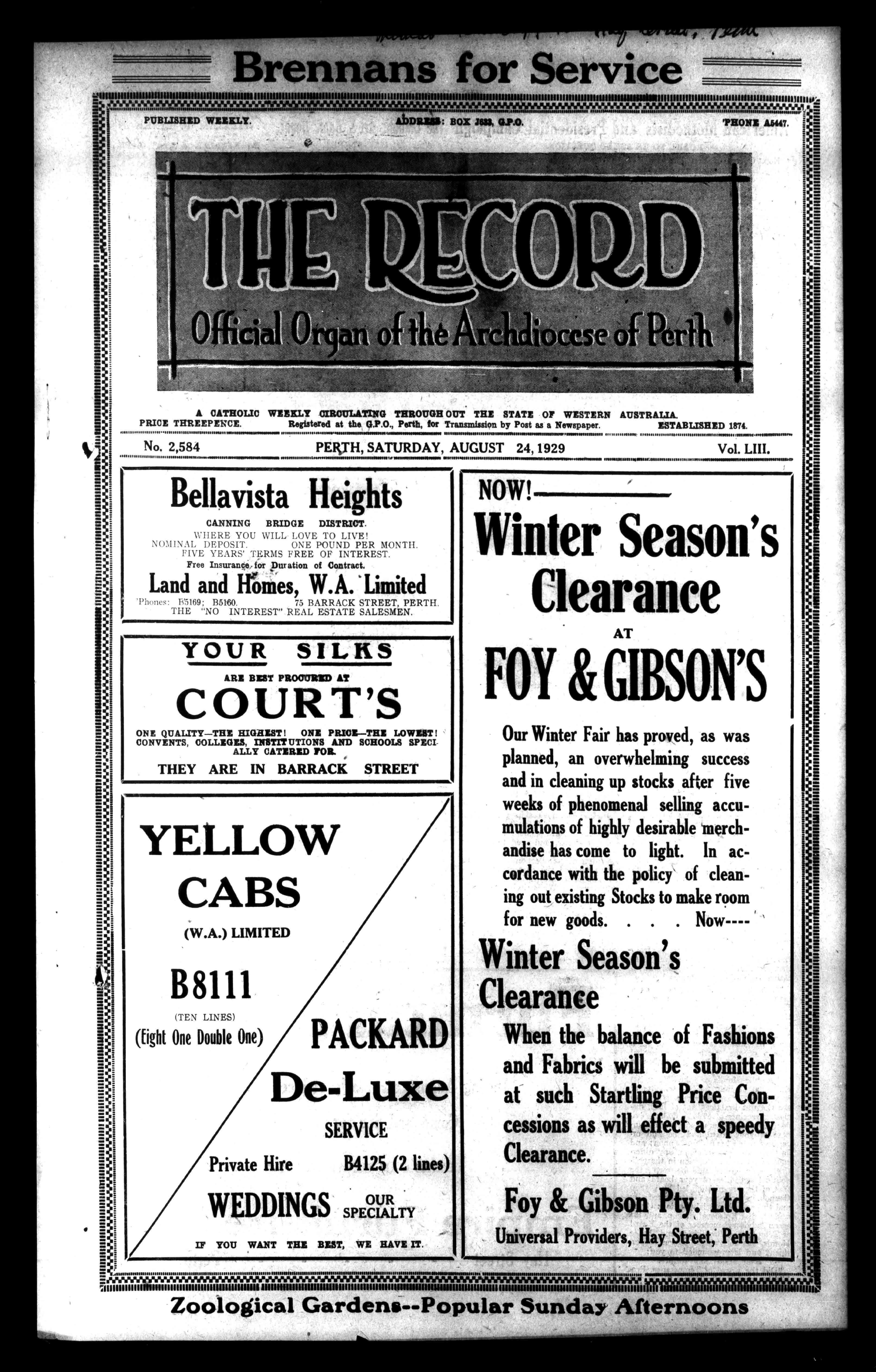 U. JI 40r//1 BrennansforService OP ON MO Mff lee 11111111.111111111111111111111110.. Pe.Woo MUMMIININ e1 1 PUBLISHEDWEEKLY. AbDREIMi:BOXJ633,G.P.O. 'PHONEAb447. ACATHOLICWEEKLYCIRCULATINGTHROUGHOUTTHESTATEOFWESTERNAUSTRALIA. PRICETHREEPENCE. RegisteredattheG.P.O.,Perth,forTransmissionbyPostasaNewspaper. ESTABLISHED1874. nesemmenammone No.2,584 _INN.If.1.11111.11111,11111111.01IIH.HHHH 1.111. PERTH,SATURDAY,AUGUST24,1929 NainNele weanOnnNIMMIMenemmm. nelenleanIONSPININNIONNen nHN1.MININNUMMINeemMeneeneenMental N1 MMNININNINIININMINNIMNIMILM NNMInMinnMINIMS BellavistaHeights CANNINGBRIDGEDISTRICT. WHEREYOUWILLLOVETOLIVE! NOMINALDEPOSIT. ONEPOUNDPERMONTH. FIVEYEARS'TERMSFREEOFINTEREST. FreeInsuranCe-forDurationofContract. LandandMines,W.A.'Limited '1)11,11es:F5169;B5160. 75BARRACKSTREET,PERTH. THE"NOINTEREST"REALESTATESALESMEN. YOURSILKS AREBESTPROCUREDAT COURT'S ONEQUALITY-THEHIGHEST!ONEPRICE-THELOWEST! CONVENTS,COLLEGES,INSTITUTIONSANDSCHOOLSSPECI ALLYCATEREDFOR. THEYAREINBARRACKSTREET YELLOW CABS (W.A.)LIMITED B8111 FENLINES) (EightOneDoubleOne) PACKARD De-Luxe PrivateHire SERVICE B4125(2lines) WEDDINGS OUR SPECIALTY IFYOUWANTTHEBEST,WEHAVEIT. NI Vol. NOW! WinterSeason's Clearance AT FOY&GIBSON'S OurWinterFairhasproved,aswas planned,anoverwhelmingsuccess andincleaningupstocksafterfive weeksofphenomenalsellingaccumulationsofhighlydesirablemerchandisehascometolight.InaccordancewiththepolicyofcleaningoutexistingStockstomakeroom fornewgoods. Now---WinterSeason's Clearance WhenthebalanceofFashions andFabricswillbesubmitted atsuchStartlingPriceConcessionsaswilleffectaspeedy Clearance. Foy&GibsonPty.Ltd. UniversalProviders,HayStreet,Perth NANNINIMMNIIIIntNOMINNUMIll I-42===linifiniiiiimmumiiiiimmiummuummuummumumiumiummilmiumnumugummim ZoologicalGardens-PopularSundayAfternoons NMI len len