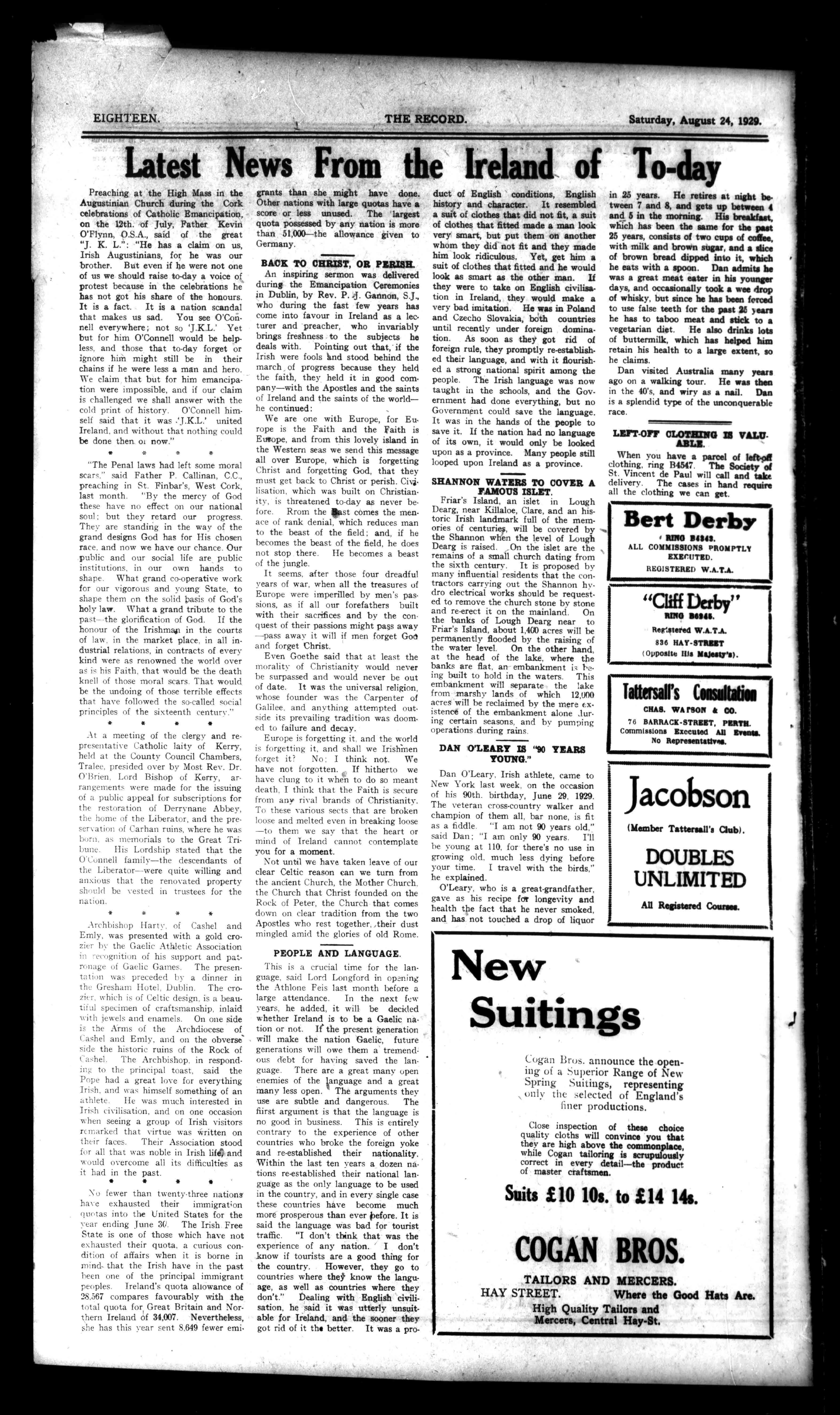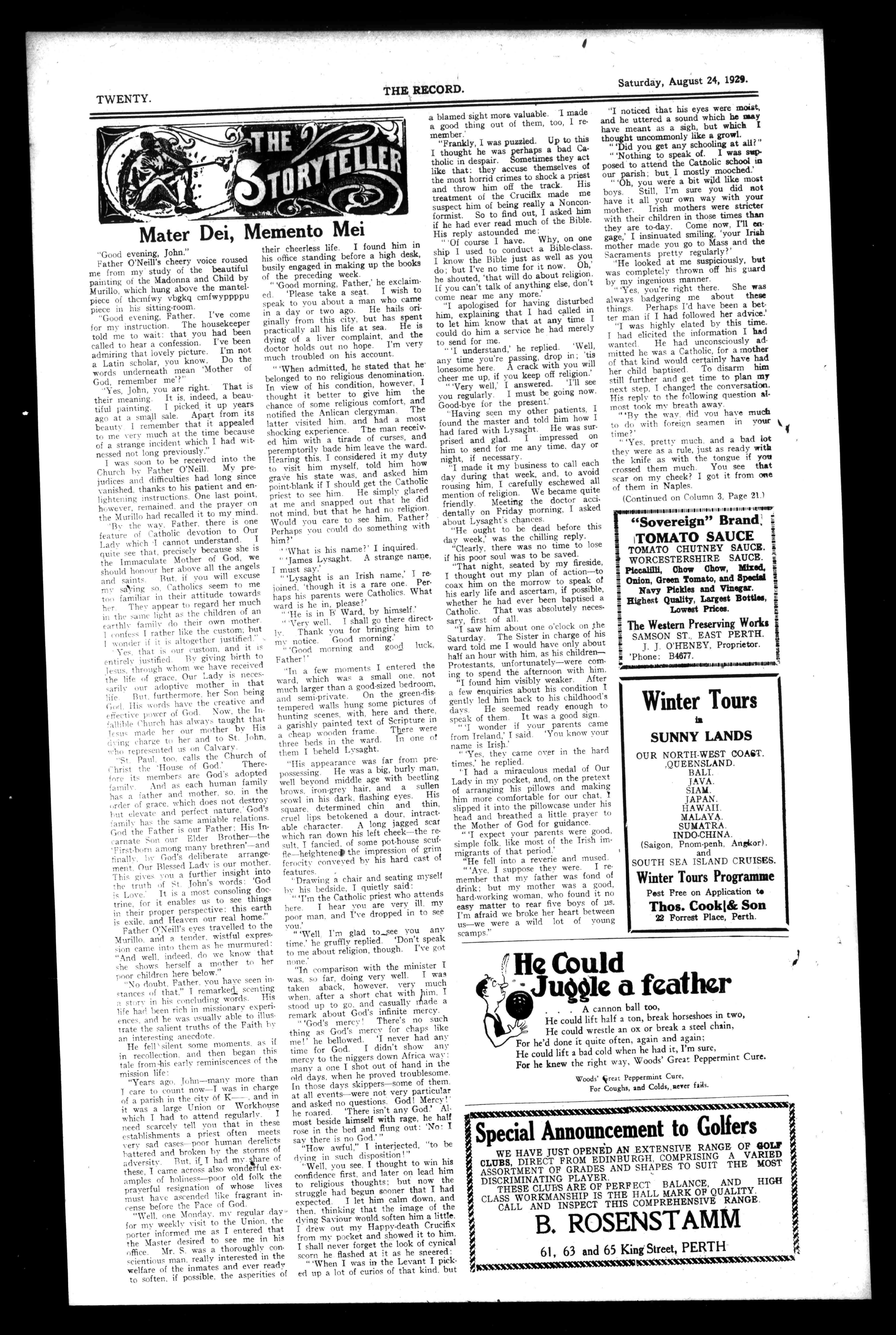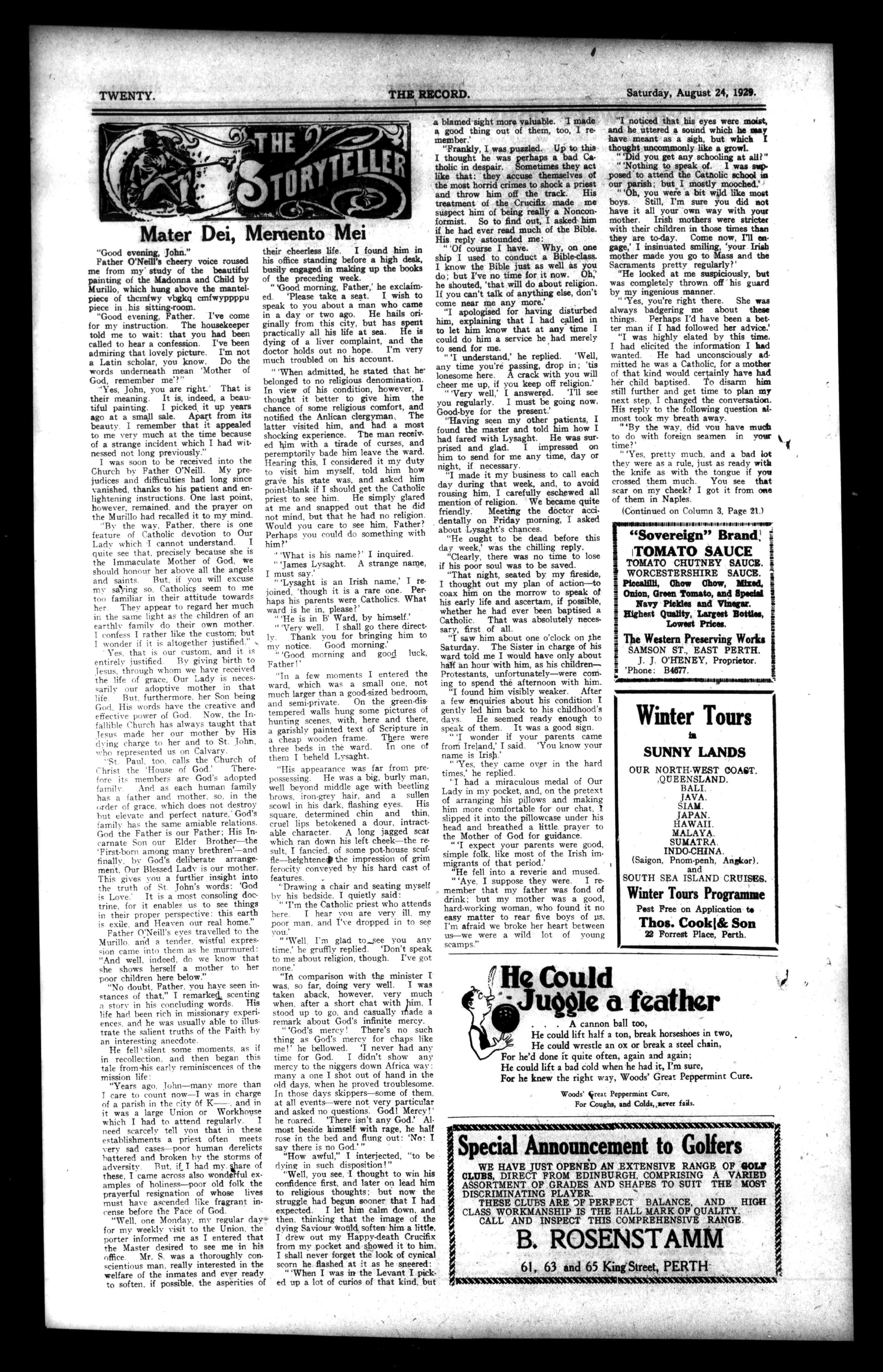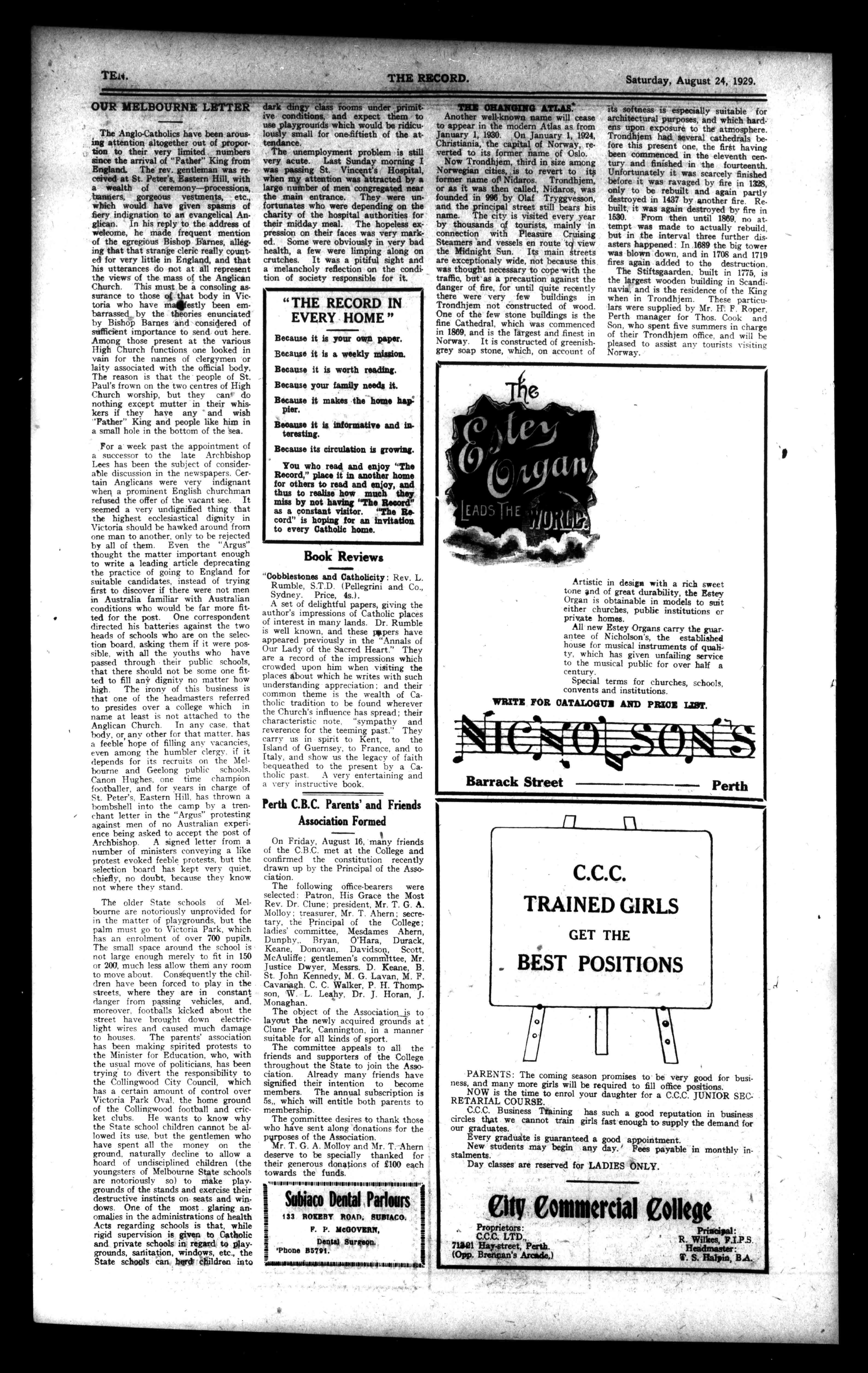 U. JI 40r//1 BrennansforService OP ON MO Mff lee 11111111.111111111111111111111110.. Pe.Woo MUMMIININ e1 1 PUBLISHEDWEEKLY. AbDREIMi:BOXJ633,G.P.O. 'PHONEAb447. ACATHOLICWEEKLYCIRCULATINGTHROUGHOUTTHESTATEOFWESTERNAUSTRALIA. PRICETHREEPENCE. RegisteredattheG.P.O.,Perth,forTransmissionbyPostasaNewspaper. ESTABLISHED1874. nesemmenammone No.2,584 _INN.If.1.11111.11111,11111111.01IIH.HHHH 1.111. PERTH,SATURDAY,AUGUST24,1929 NainNele weanOnnNIMMIMenemmm. nelenleanIONSPININNIONNen nHN1.MININNUMMINeemMeneeneenMental N1 MMNININNINIININMINNIMNIMILM NNMInMinnMINIMS BellavistaHeights CANNINGBRIDGEDISTRICT. WHEREYOUWILLLOVETOLIVE! NOMINALDEPOSIT. ONEPOUNDPERMONTH. FIVEYEARS'TERMSFREEOFINTEREST. FreeInsuranCe-forDurationofContract. LandandMines,W.A.'Limited '1)11,11es:F5169;B5160. 75BARRACKSTREET,PERTH. THE"NOINTEREST"REALESTATESALESMEN. YOURSILKS AREBESTPROCUREDAT COURT'S ONEQUALITY-THEHIGHEST!ONEPRICE-THELOWEST! CONVENTS,COLLEGES,INSTITUTIONSANDSCHOOLSSPECI ALLYCATEREDFOR. THEYAREINBARRACKSTREET YELLOW CABS (W.A.)LIMITED B8111 FENLINES) (EightOneDoubleOne) PACKARD De-Luxe PrivateHire SERVICE B4125(2lines) WEDDINGS OUR SPECIALTY IFYOUWANTTHEBEST,WEHAVEIT. NI Vol. NOW! WinterSeason's Clearance AT FOY&GIBSON'S OurWinterFairhasproved,aswas planned,anoverwhelmingsuccess andincleaningupstocksafterfive weeksofphenomenalsellingaccumulationsofhighlydesirablemerchandisehascometolight.InaccordancewiththepolicyofcleaningoutexistingStockstomakeroom fornewgoods. Now---WinterSeason's Clearance WhenthebalanceofFashions andFabricswillbesubmitted atsuchStartlingPriceConcessionsaswilleffectaspeedy Clearance. Foy&GibsonPty.Ltd. UniversalProviders,HayStreet,Perth NANNINIMMNIIIIntNOMINNUMIll I-42===linifiniiiiimmumiiiiimmiummuummuummumumiumiummilmiumnumugummim ZoologicalGardens-PopularSundayAfternoons NMI len len