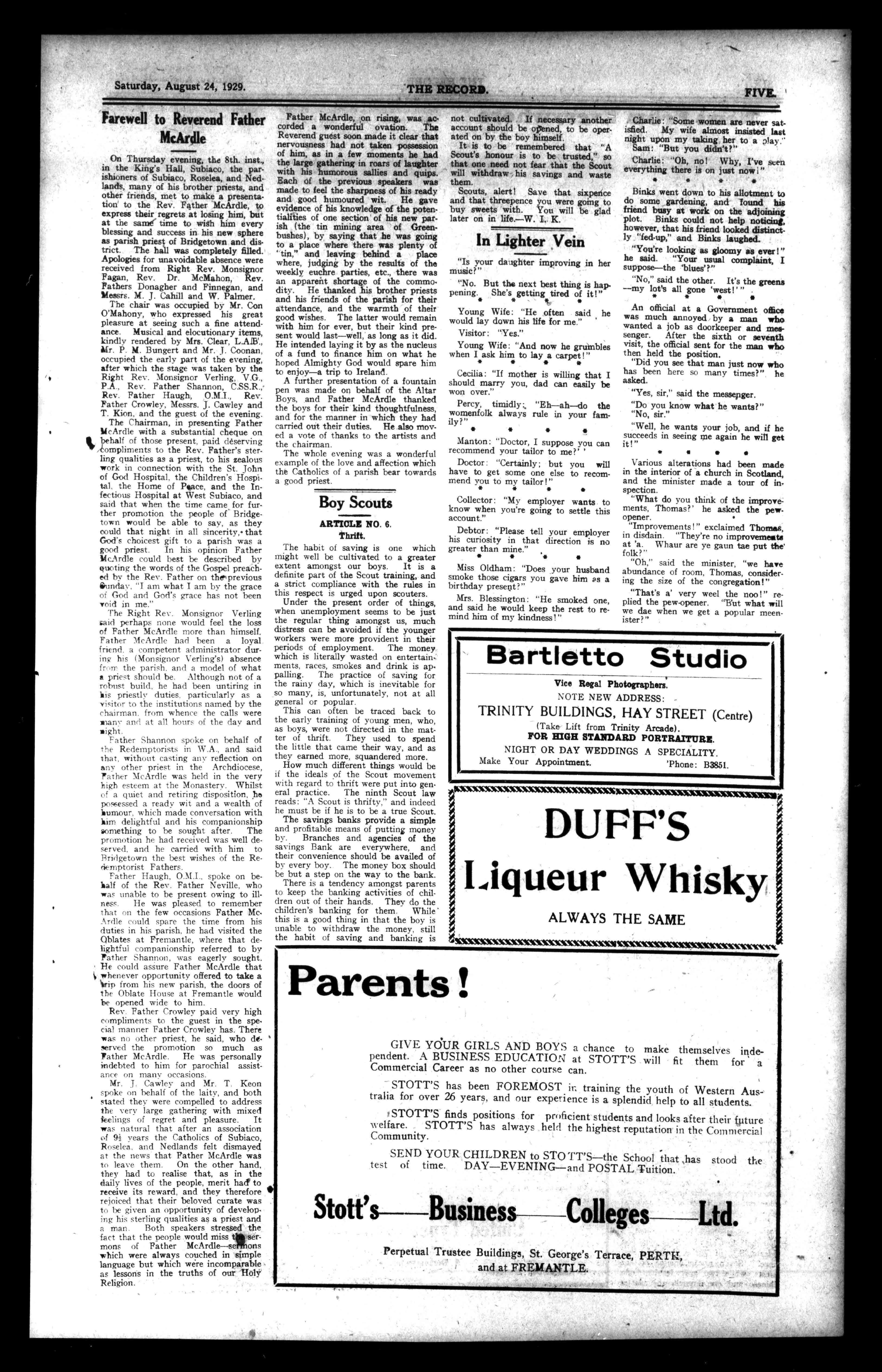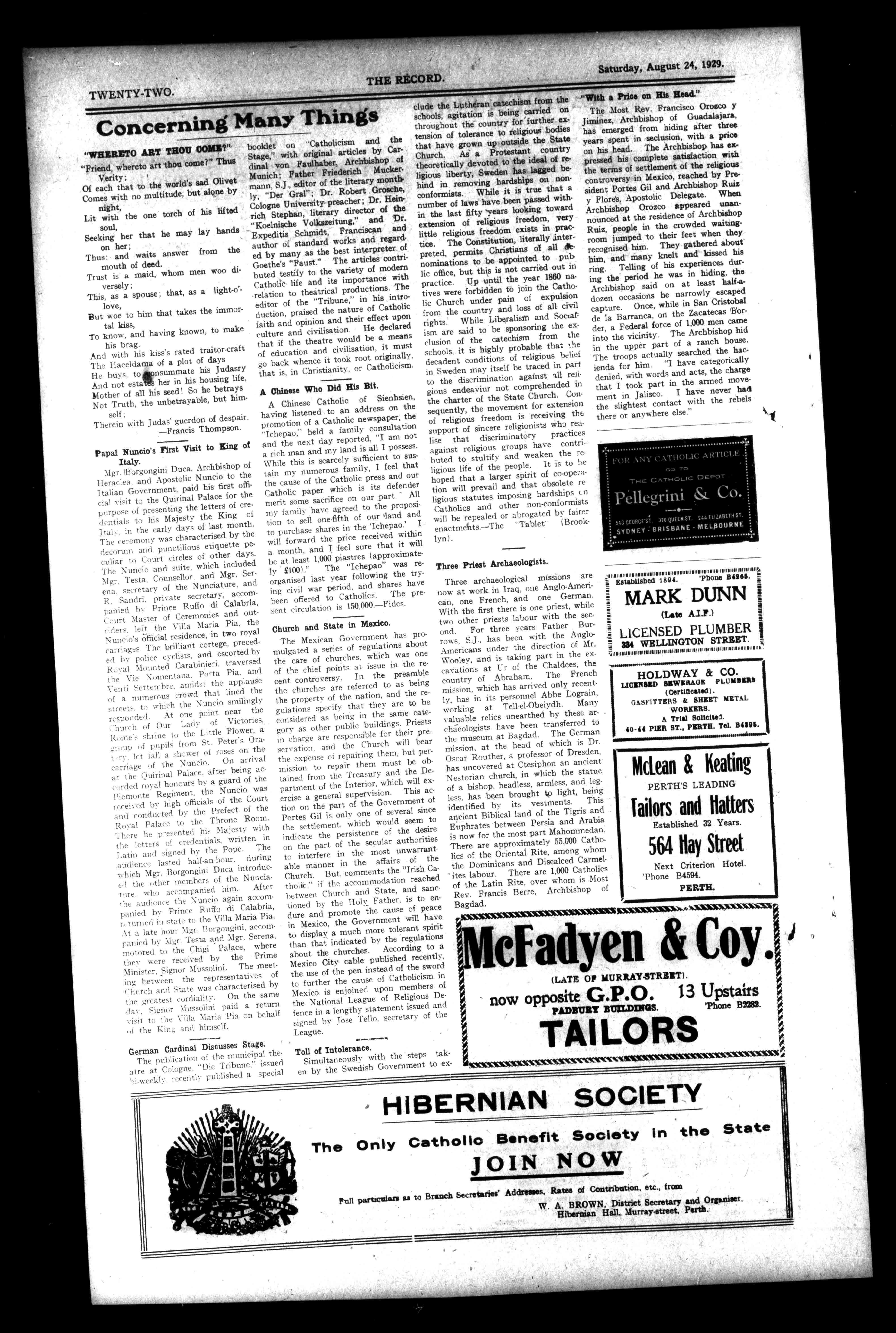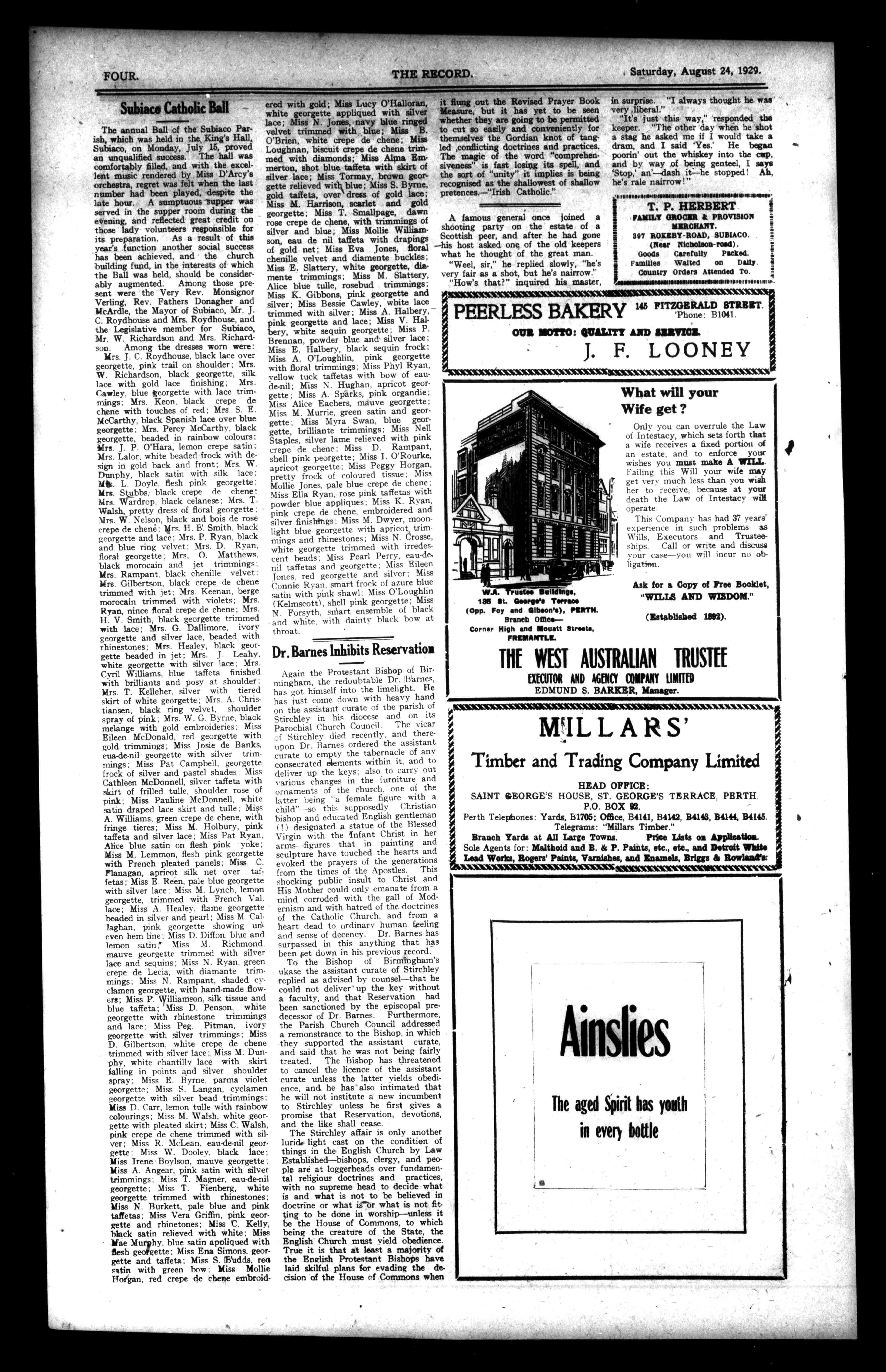 FORANYCATHOLICARTICLE GOTO THECATHOLICDEPOT Pellegrini&Co. -4111-543CEORCEST 370QUEENST244sLABETHST SYDNEY:BRISBANE-MELBOURNE 1111.11111.111111111111901111.11111111111HOWIWOHOUI.1111411kkIEstablished1894. 'Mae54165. 5 MARKDUNN (LateAl,?.) LICENSEDPLUMBERI ;.=6- 334WELLINGTONSTREET. ;:usulusmovsususuinenstionsumlininsosactononehohmulnif .11110....=1/1.1101IMI.I.III. HOLDWAY&CO. LICENSEDSEWBRAUSPLUMBERS (CertItleatad). GASFITTERSkSHEETMETAL WORKERS. ATrialSolleltei. 40-44PIERST.,PERTH.Tel.B4896. McLean&Keating PERTH'SLEADING TailorsandHatters Established32Years. 564HayStreet NextCriterionHotel. 'PhoneB4594. PERTH. MVSYCYZIZESZIata,V001006,1063006.113676 cfadyen&Coy. (LATEOPMURRAYSTRUT nowoppositeG.P.O.13Upstairs PADBURYBUILDINGS. 'PhoneB2282. TAILORS viciamacxxxvocitwoomoorcvarvorvremweimewoncimecicaml HIBERNIANSOCIETY TheOnlyCatholicBenefitSocietyintheState JOINNOW PullparticularsastoBranchSecretaries'Addresses,RatesofContribution,etc.,from W.A.BROWN,DistrictSecretaryandOrganiser, HibernianHall,Murray-street,Perth.