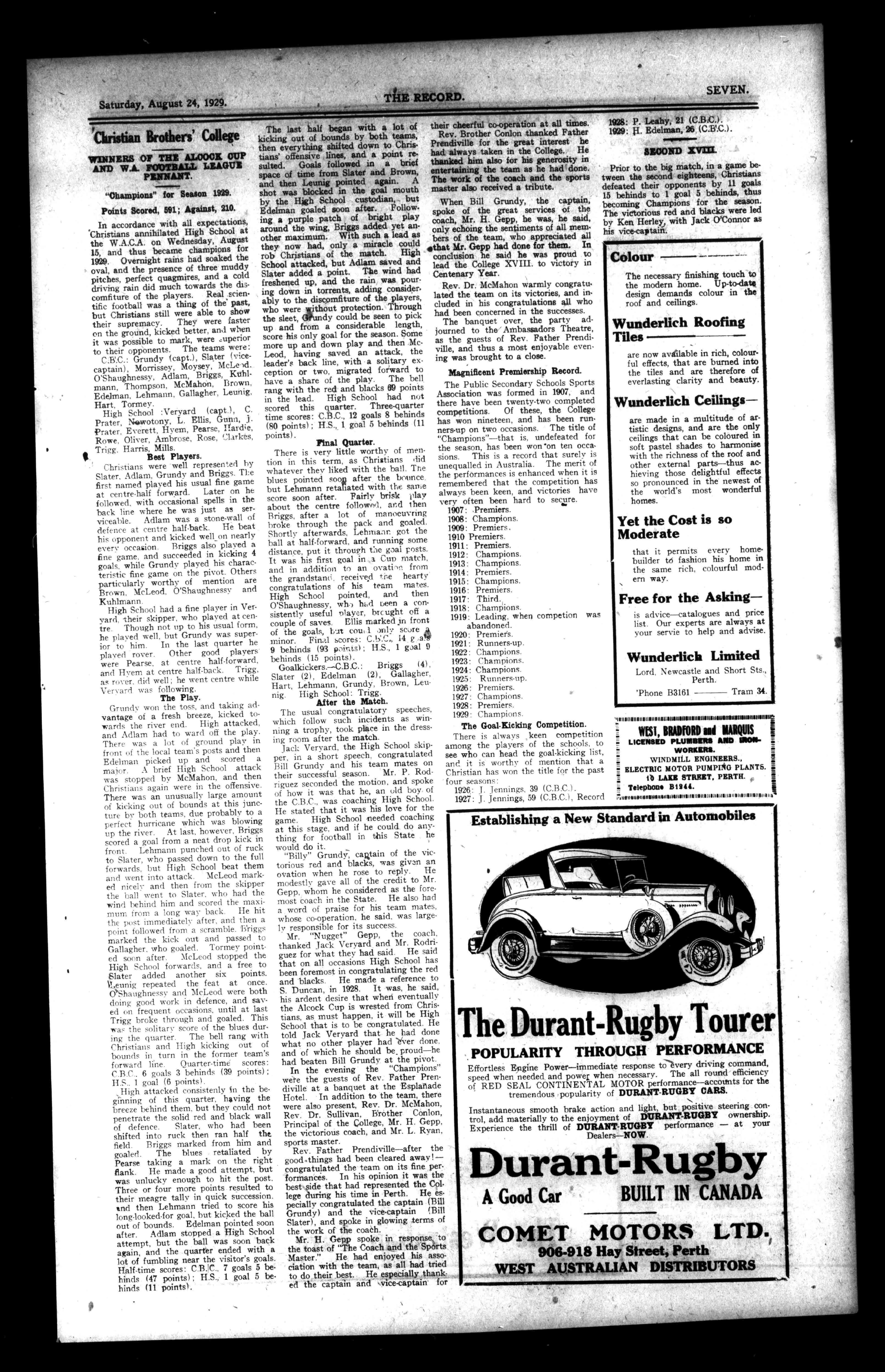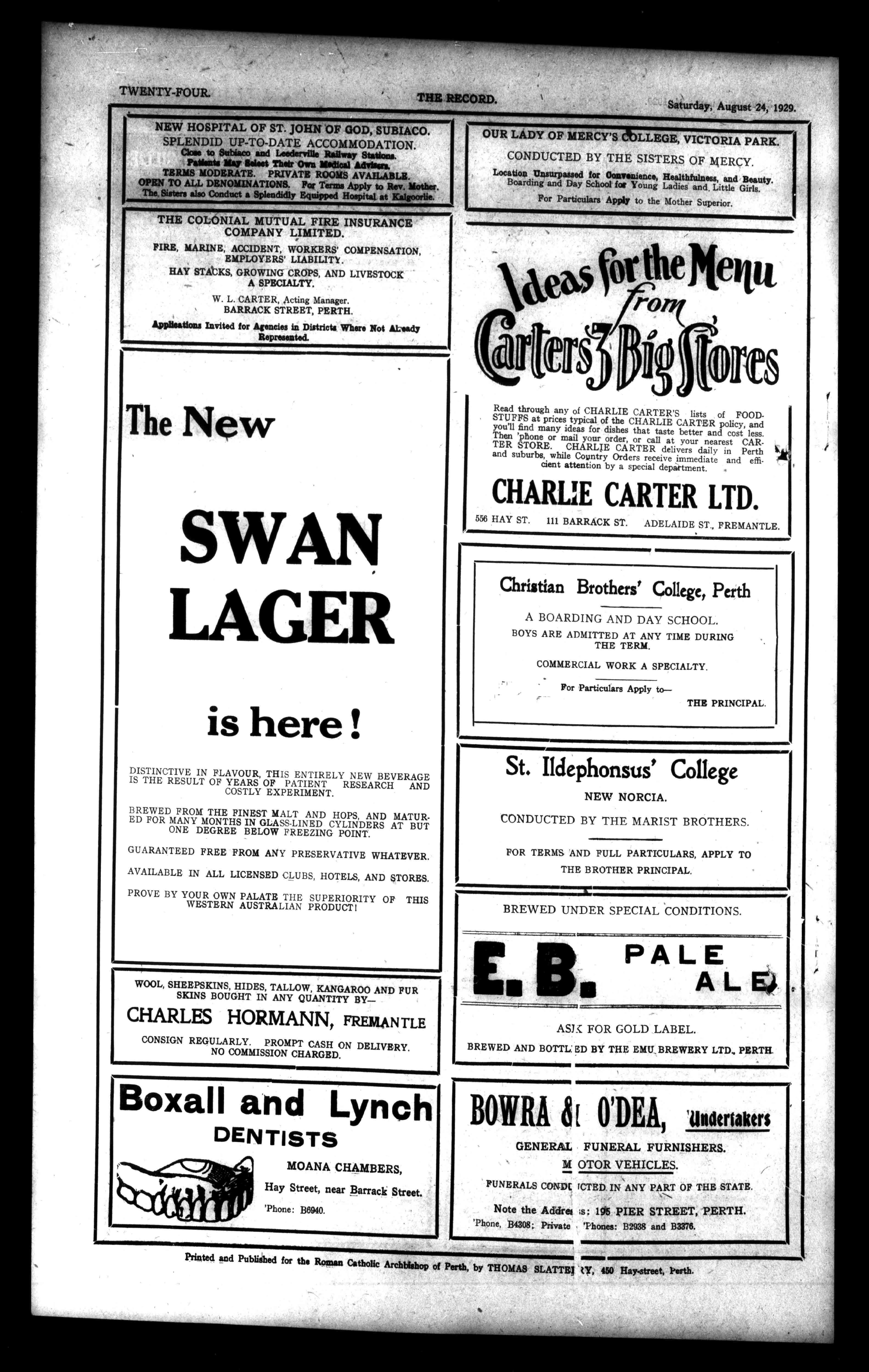rrl°11 ksirtelis3pig ReadthroughanyofCHARLIECARTER'SlistsofFOOD- STUFFSatpricestypicaloftheCHARLIECARTERpolicy,and you'llfindmanyideasfordishesthattastebetterandcostless. Then'phoneormailyourorder,orcallatyournearestCAR- TERSTORE.CHARLIECARTERdeliversdailyinPerth andsuburbs,whileCountryOrdersreceiveimmediateandeffi- cientattentionbyaspecialdepartment. CHARLIECARTERLTD. 556HAYST. 111BARRACKST. ADELAIDEST..FREMANTLE. ChristianBrothers'College,Perth ABOARDINGANDDAYSCHOOL. BOYSAREADMITTEDATANYTIMEDURING THETERM. COMMERCIALWORKASPECIALTY. ForParticularsApplytoTHEPRINCIPAL. St.Ildephonsus'College NEWNORCIA. CONDUCTEDBYTHEMARISTBROTHERS. FORTERMSANDFULLPARTICULARS,APPLYTO THEBROTHERPRINCIPAL. BREWEDUNDERSPECIALCONDITIONS. E.EL PALE ALE; ASIKFORGOLDLABEL. BREWEDANDBOTTL:EDBYTHEEMUBREWERYLTD..PERTH. BOWRAStO'DEA'Undertakers GENERALFUNERALFURNISHERS. MOTORVEHICLES. FUNERALSCONDOICTEDINANYPARTOFTHESTATE. NotetheAddret.s:195PIERSTREET,PERTH. 'Phone,B4308;Private'Phones:B2938andB3376. PrintedandPublishedfortheRomanCatholicArchbishopofPerth,byTHOMASSLATTE!tY,450Hay-street,Perth.