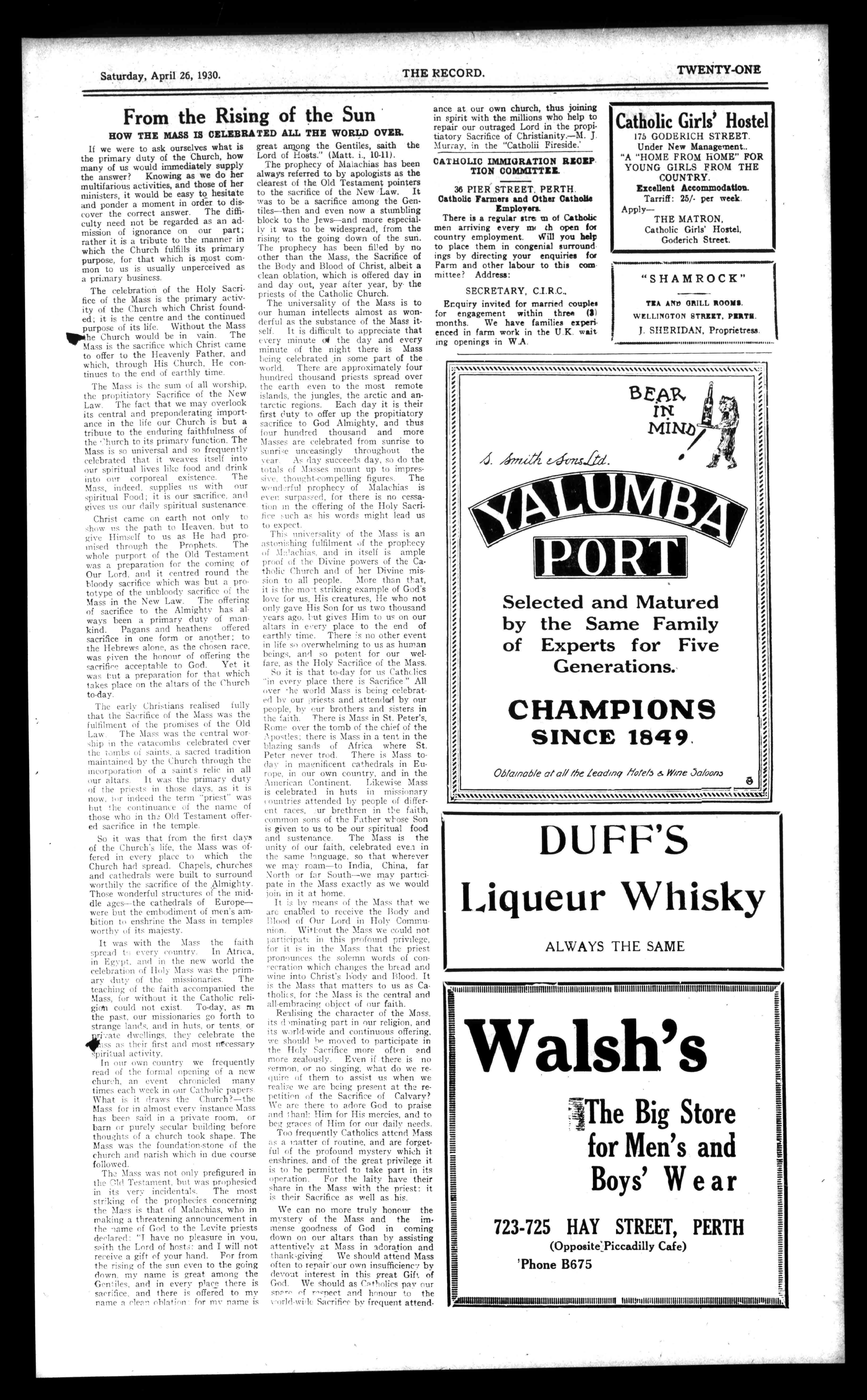 !visor"' 517-114-1M,eat& Brennan'sCeylonTea,1/11lb. 4110-00.44. MNMNNM4.--00-00-4100-4.0-41. VIM PUBLISHIDWEEKLY. ADDRESS:BOX111,11,G.P8S. CATHOLICWEEKLYCIRCULATINGTHROUGHOUTTHESTATEOrWESTERN PRICETHREEPENCE. RegisteredattheG.P.O.,Perth,forTransmissionbyPostasaNewspaper. onuMMITIN0010.0000=10001, No.2,617 INAINIOMIONWAIMIK 1111111111111.1111111,1111111MIIMB ..101410110M1101=11.11MINI MINIM1.1101111111011111==11MONUMINININO11140101M PERTH,SATURDAY,APRIL26,1930 AUSTRALIA. BartlettoStudio ViceRegalPhotographers. NOTENEWADDRESS: TRINITYBUILDINGS,HAYSTREET(Centre) (TakeLiftfromTrinityArcade). FORHIGHSTANDARDPORTRAITURE. NIGHTORDAYWEDDINGSASPECIALITY. MakeYourAppointment. 'Phone:133851. YOURSILKS AREBESTPROCUREDAT COURT'S ONEQUALITY-THEHIGHEST!ONEPRICE-THELOWEST! CONVENTS,COLLEGES,I1$TITUTIONSANDSCHOOLSSPEC1 ALLYCATEREDTOE THEYAREINBARRACKSTREET bcLYKut:sgI's ONE;000' DEED A DAY JOHNWILLSFOREVERYTHING[ATARI 'PHONEA51647. ESTABLISHED1574. Vol.LIV SeethisGreatArrayof NewSeason'sColours andWeaves DRESS FABRIC WEEK AT FOY&GIBSON'S SelectNowtheFabrics foryourAutumnand WinterFrocks---Many NewDesigns---Allat SpecialPrices FOY&GIBSON PTY.,LTD. UniversalProviders,HaySt.,Perth .110-.0--414,-.4.4,-.....-04.-11,410.N411.-.1.MM41140-4110.-41141. 44.-411.111.M.04.-04.41141. -4114. 00. .0.-0.00.01 ZoologicalGardens--PopularSundayAfternoons