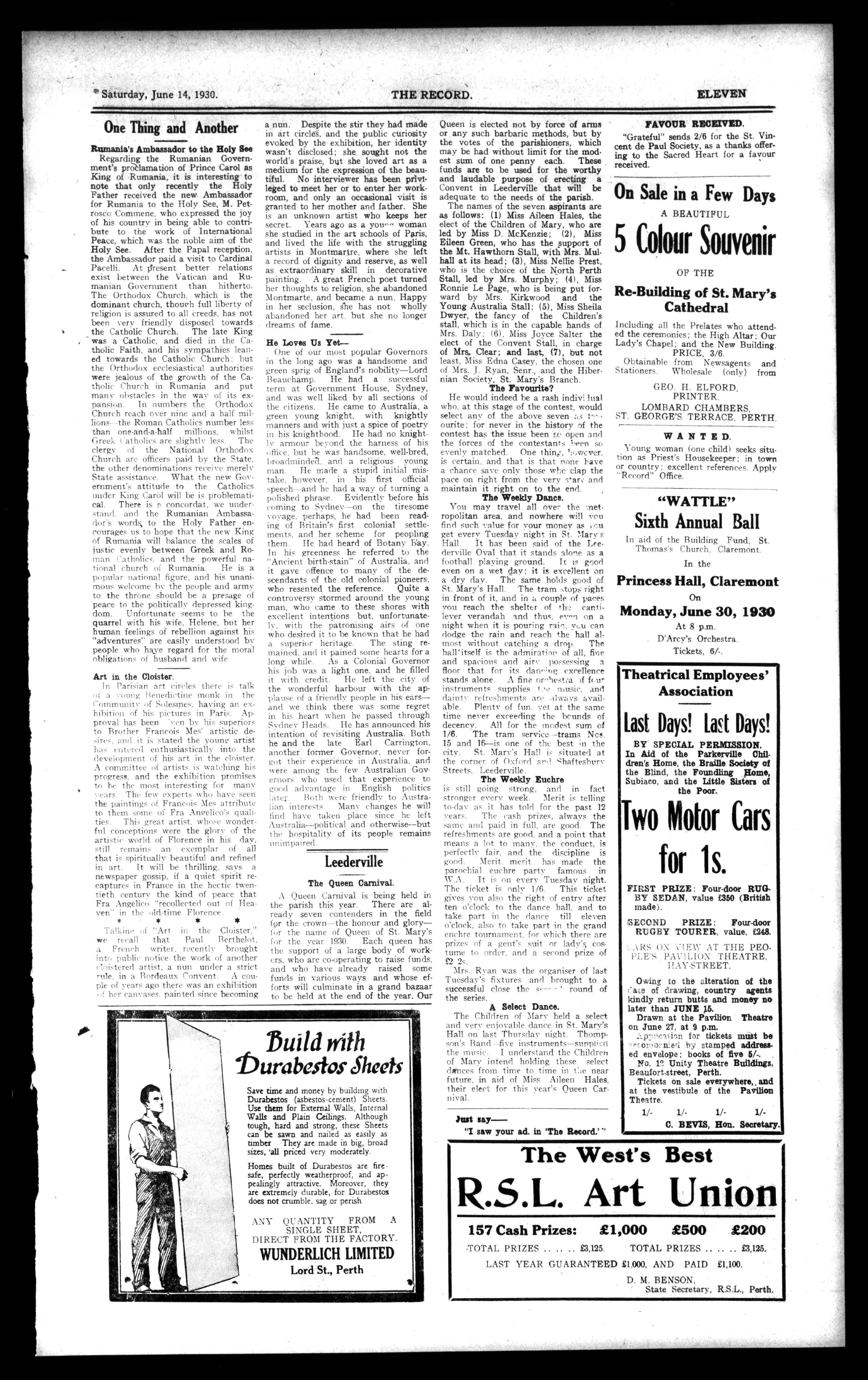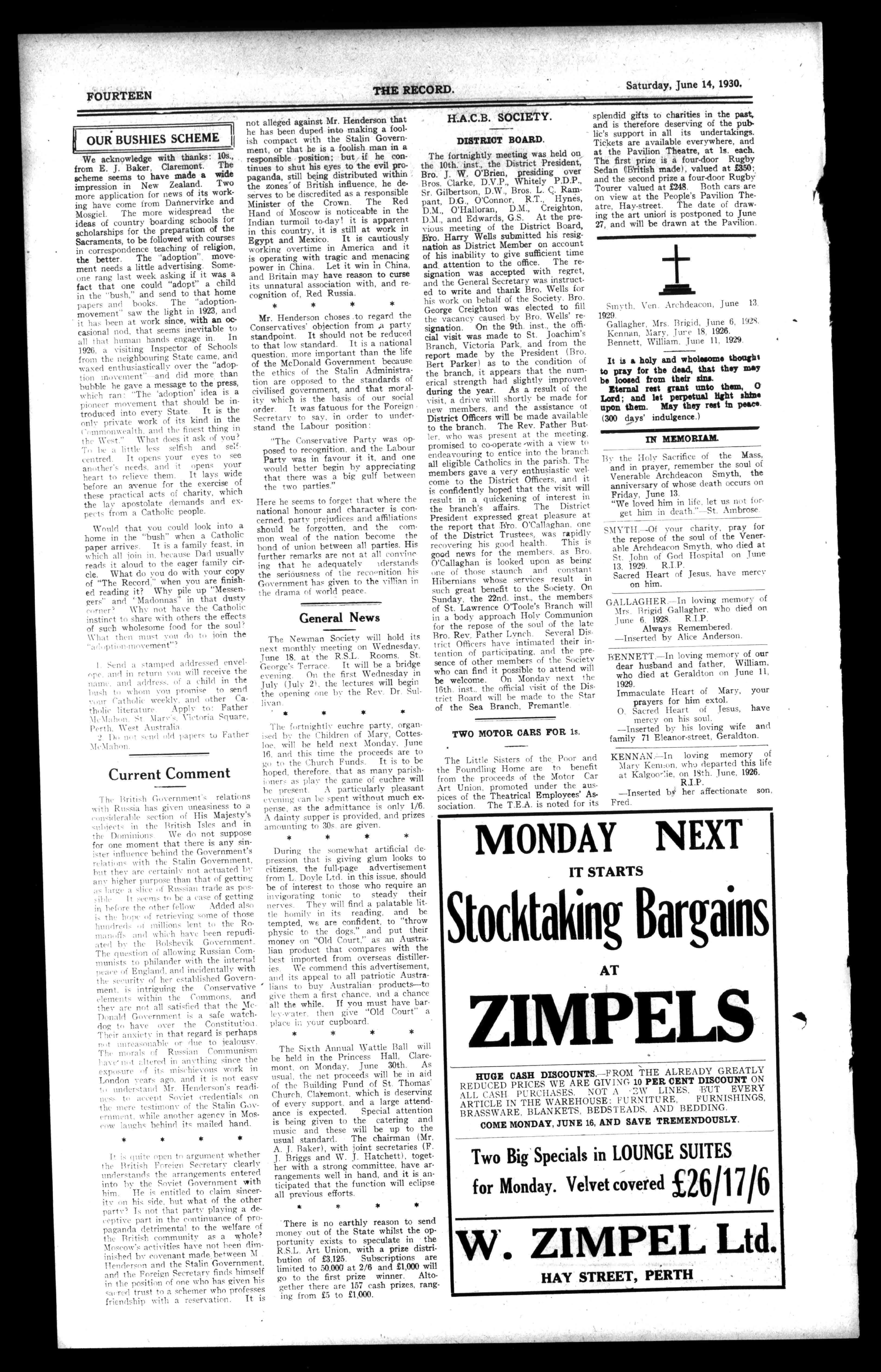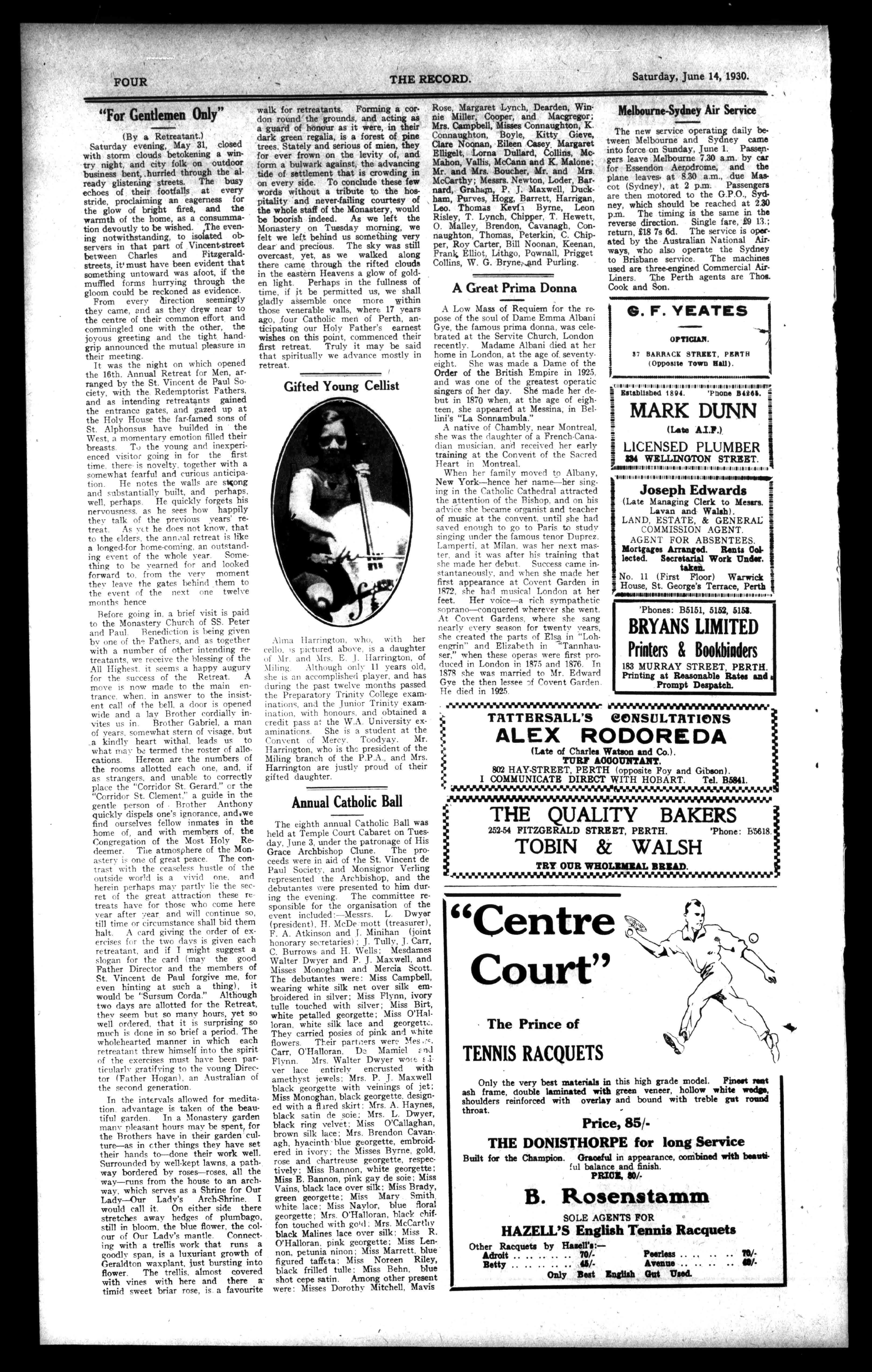 /rw/ q-,'1477T'Avit Brennan'sCeylonTea,1/1112-lb. 3.......-.00-4.4.41.4mp.1.......-041,-..,.10-41141.N.41.-410-414.-414,40.4141.41.410.HNN-4141.-10-4140-400.-4140-.411.-01-0141.w01MN 4.p-imp-go...0.... A,.N.. PUBLISHEDWEEKLY. ADDRESS:BOXJ633,G.P.O. 'PHONEB5447. ......................................................................................,........MJ... AIM....ALM1=1./.11WuAM. ,./...../1.4.A. As. A. .....A.L..... $ $ $ $ PRICETHREEPENCE. ACATHOLICWEEKLYCIRCULATINGTHROUGHOUTTHESTATEOFWESTERNAUSTRALIA. RegisteredattheG.P.O.,Perth,forTransmissionbyPostasaNewspaper. ESTABLISHED1874. No.2,624 PERTH,SATURDAY,JUNE14,1930 VoLLIV. BartlettoStudio ViceRegalPhotographers. NOTENEWADDRESS: TRINITYBUILDINGS,HAYSTREET(Centre) (TakeLiftfromTrinityArcade). FORHIGHSTANDARDPORTRAITURE. NIGHTORDAYWEDDINGSASPECIALITY. MakeYourAppointment. 'Phone:B3851. CARISBROS. THEGIFTSHOP ATTHEOLDORIGINALADDRESS. BARRACKSTREET NEWOPTICALDEPARTMENT. UNDERMANAGEMENTOFMR.V.MGLICK,F.V.0A., BUYEMPIREGOODS! Durant-Rugby FOURANDSIXCYLINDERMODELS. BUILTINCANADA tMFORT-Theelementinmotoringessentialtofullestenjoyment. DURANT-RUGBYCARSareCOMFORTABLE Deep,commodiouscushions,appropriatelyupholstered,areinvitingly restful. Scientificallydeveloped,springsuspensionandshockabsorbingsystemensuredelightfulridingqualities.These-andasenseofsafety impartedthroughtheassuranceofcompletecarcontrol-permit physicalandmentalrelaxationunderalldrivingconditions. COMETMOTORSLTD. 906-918HayStreet,Perth WestAustralianDiatrubtorsDurant-RugbyCarsandTrucks. =BARGAINPRICESPREVAILING ontheseCosyCardigans,etc.1 atFOY&GIBSON'S
