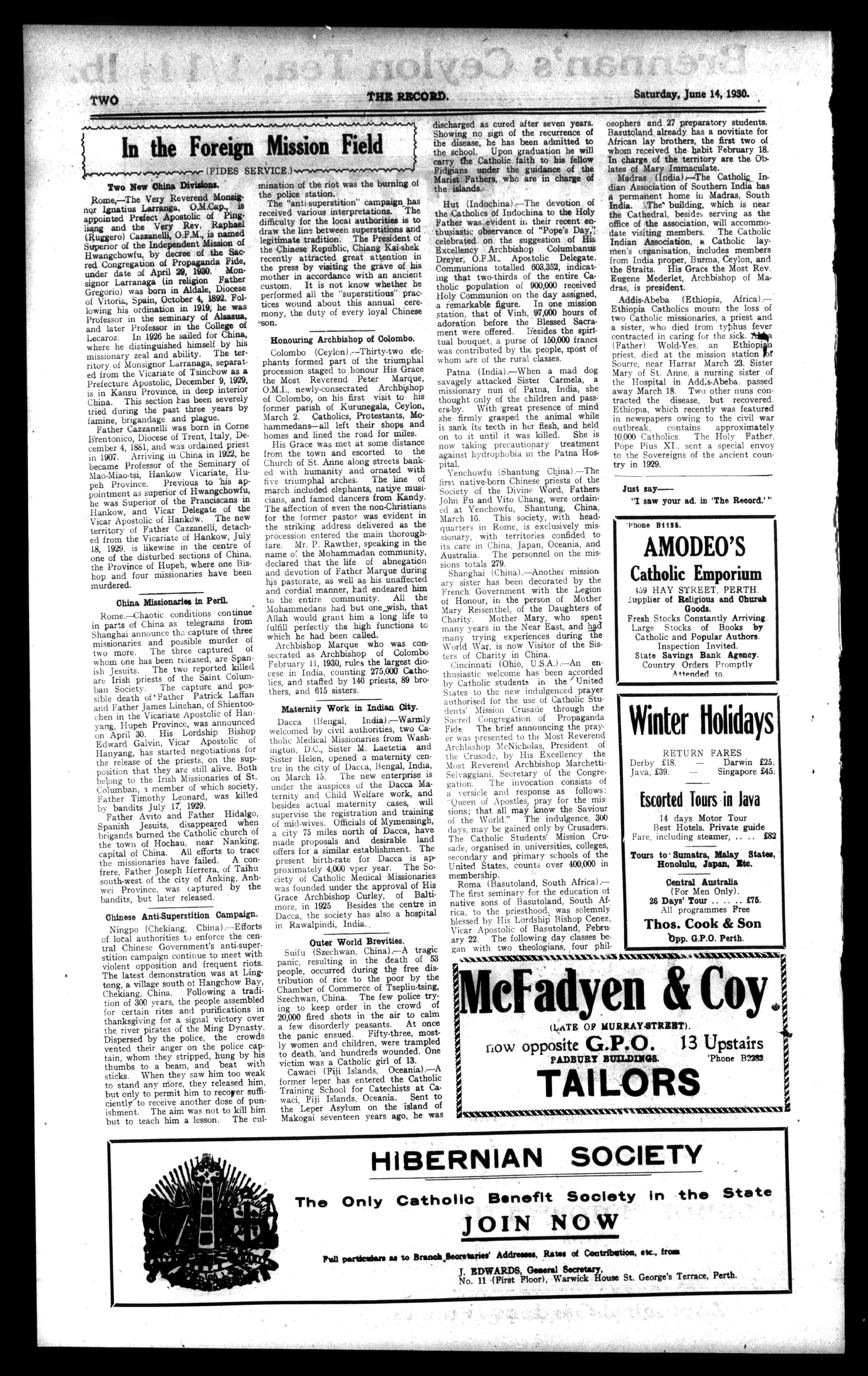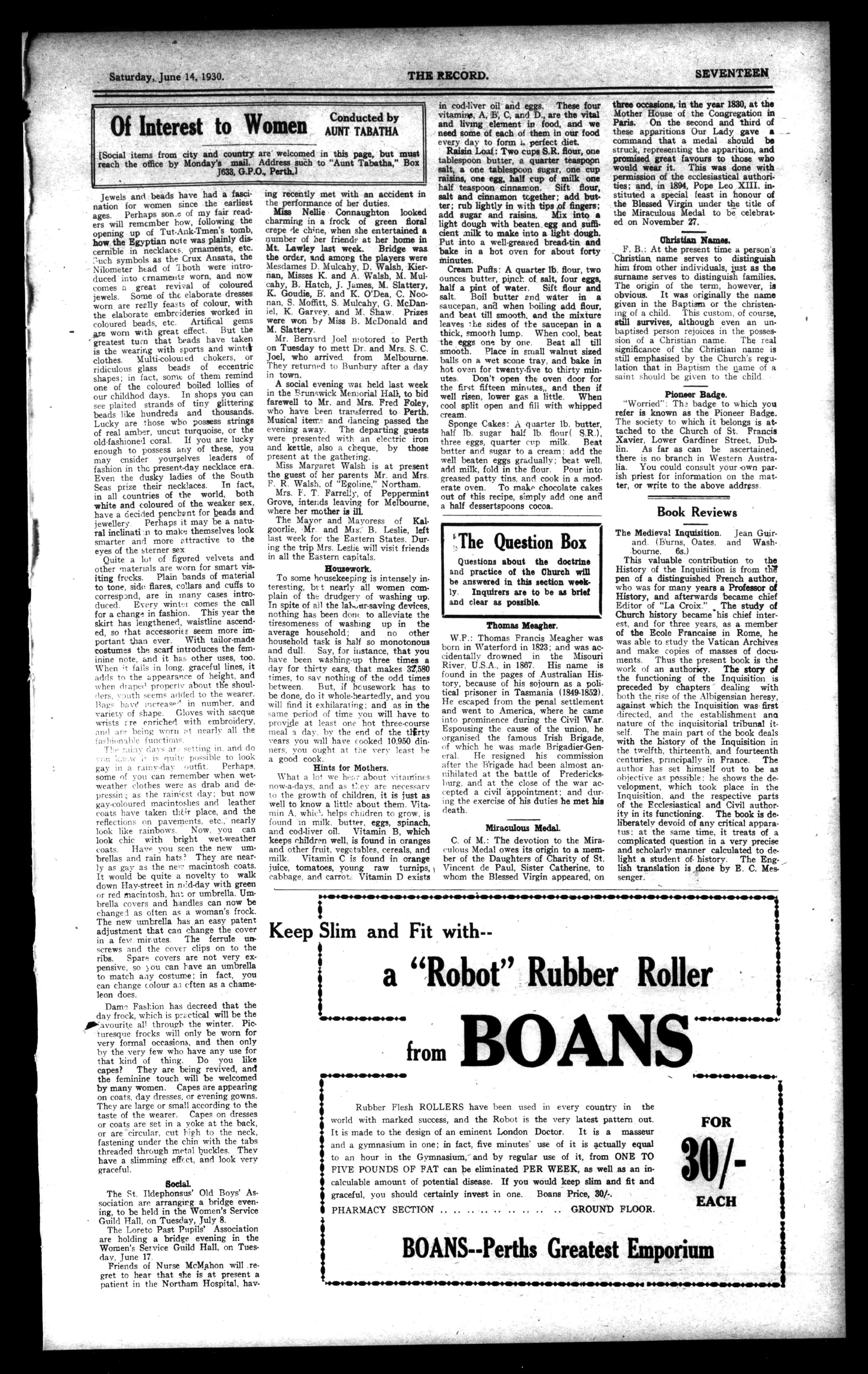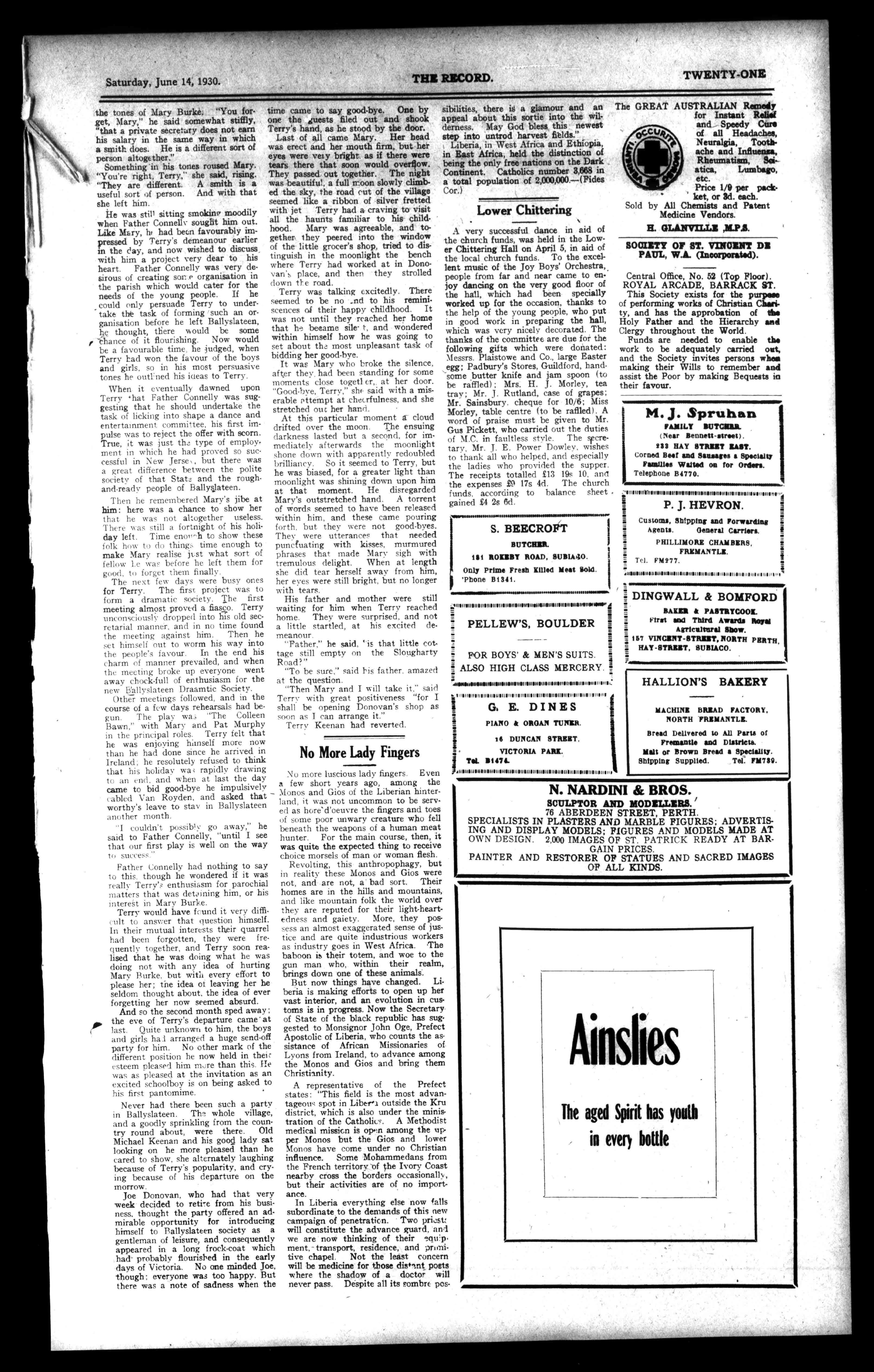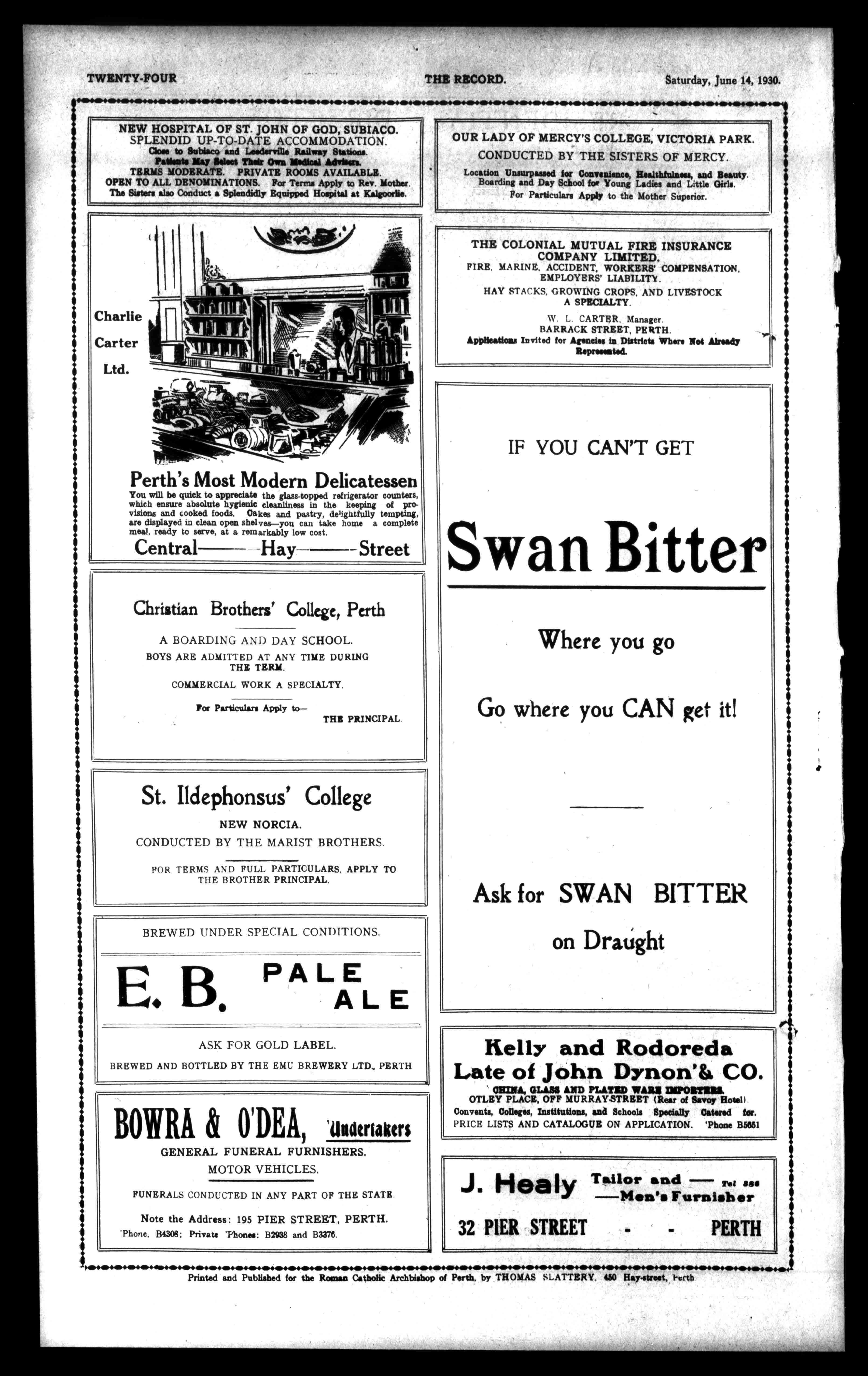 TO THEBROTHERPRINCIPAL. BREWEDUNDERSPECIALCONDITIONS. 13. PALE ALE ASKFORGOLDLABEL. BREWEDANDBOTTLEDBYTHEEMUBREWERYLTDPERTH BOWRA O'DEAUndertakers GENERALFUNERALFURNISHERS. MOTORVEHICLES. FUNERALSCONDUCTEDINANYPARTOFTHESTATE. NotetheAddress:195PIERSTREET,PERTH. 'Phone,B4308;Private'Phones:B2938andB3376. OURLADYOFMERCY'SCOLLEGE,VICTORIAPARK. CONDUCTEDBYTHESISTERSOFMERCY. LocationUnsurpassedforConvenience,Healthfulness,andBeauty. BoardingandDaySchoolforYoungLadiesandLittleGirls. ForParticularsApplytotheMotherSuperior. THECOLONIALMUTUALFIREINSURANCE COMPANYLIMITED. FIRE,MARINE,ACCIDENT,WORKERS'COMPENSATION, EMPLOYERS'LIABILITY. HAYSTACKS,GROWINGCROPS,ANDLIVESTOCK ASPECIALTY. W.L.CARTER,Manager. BARRACKSTREET,PERTH. ApplicationsInvitedforAgenciesinDistrictsWhereNotAlready Represented. IFYOUCAN'TGET SwanBitter Whereyougo GowhereyouCANgetit! AskforSWANBITTER onDratight KellyandRodoreda LateofJohnDynon'&CO. OffiNA,GLANSANDPLATEDWARE=PORTIERE OTLEYPLACE,OFFMURRAY-STREET(RearofSavoyHotel) Convents,Colleges,Institutions,andSchoolsSpeciallyCateredfor. PRICELISTSANDCATALOGUEONAPPLICATION.'PhoneB5851 J.HealyTailorand-Tel*00 -Men'sFurnisher 32PIERSTREET - PERTH PrintedandPublishedfortheRomanCatholicArchbishopofPerth,byTHOMASSLATTERY,450Hay-street,l-erth