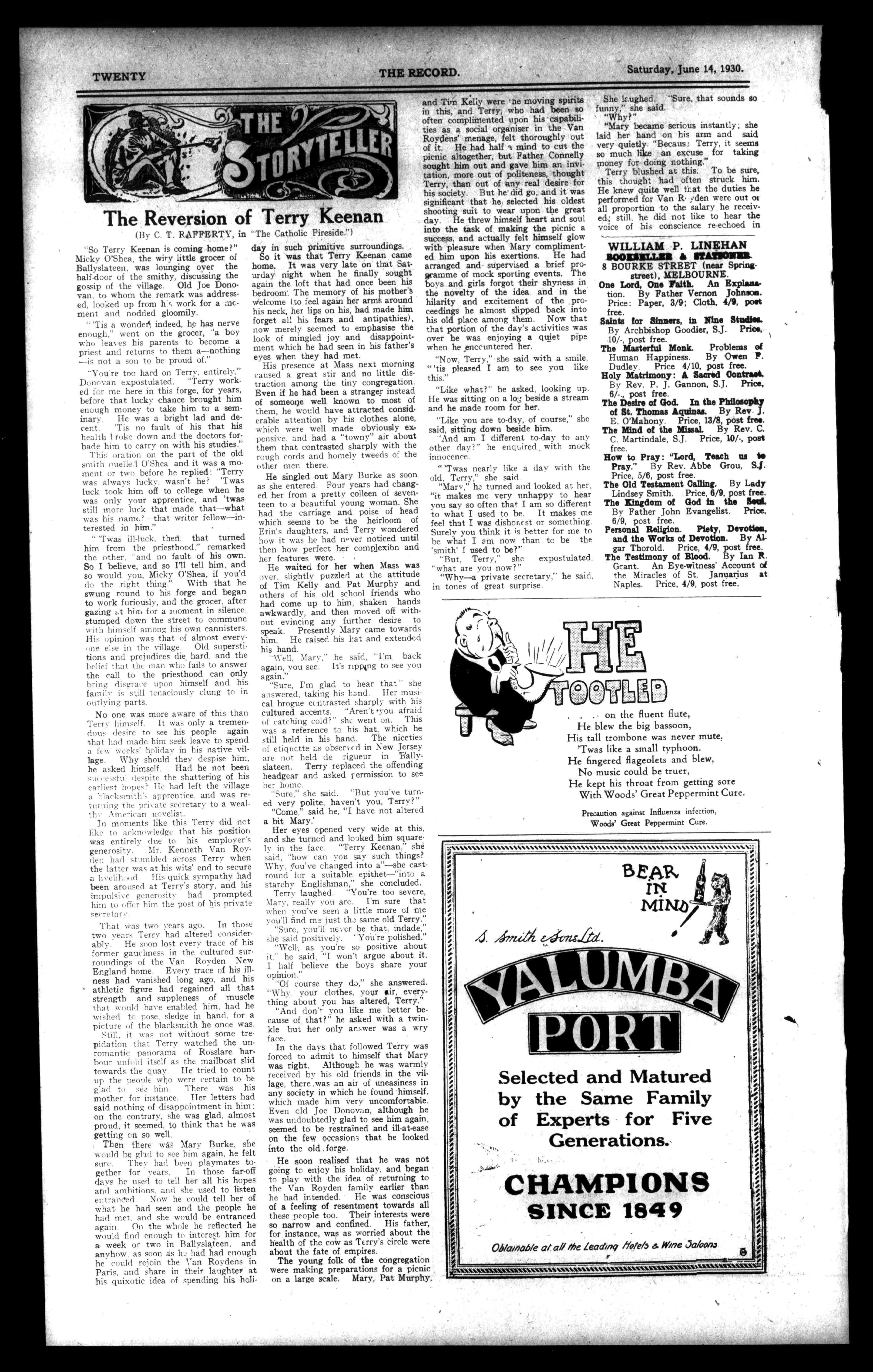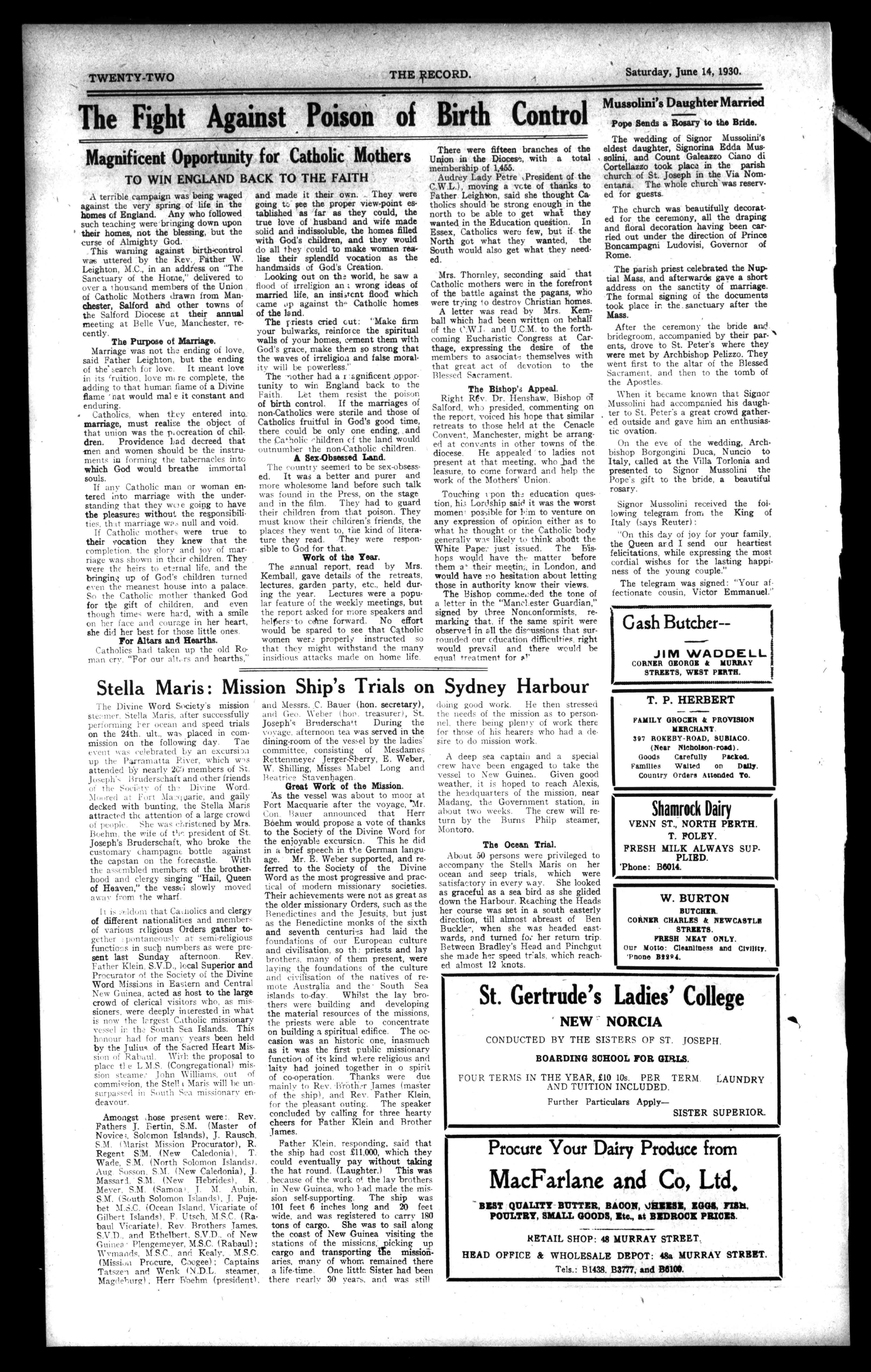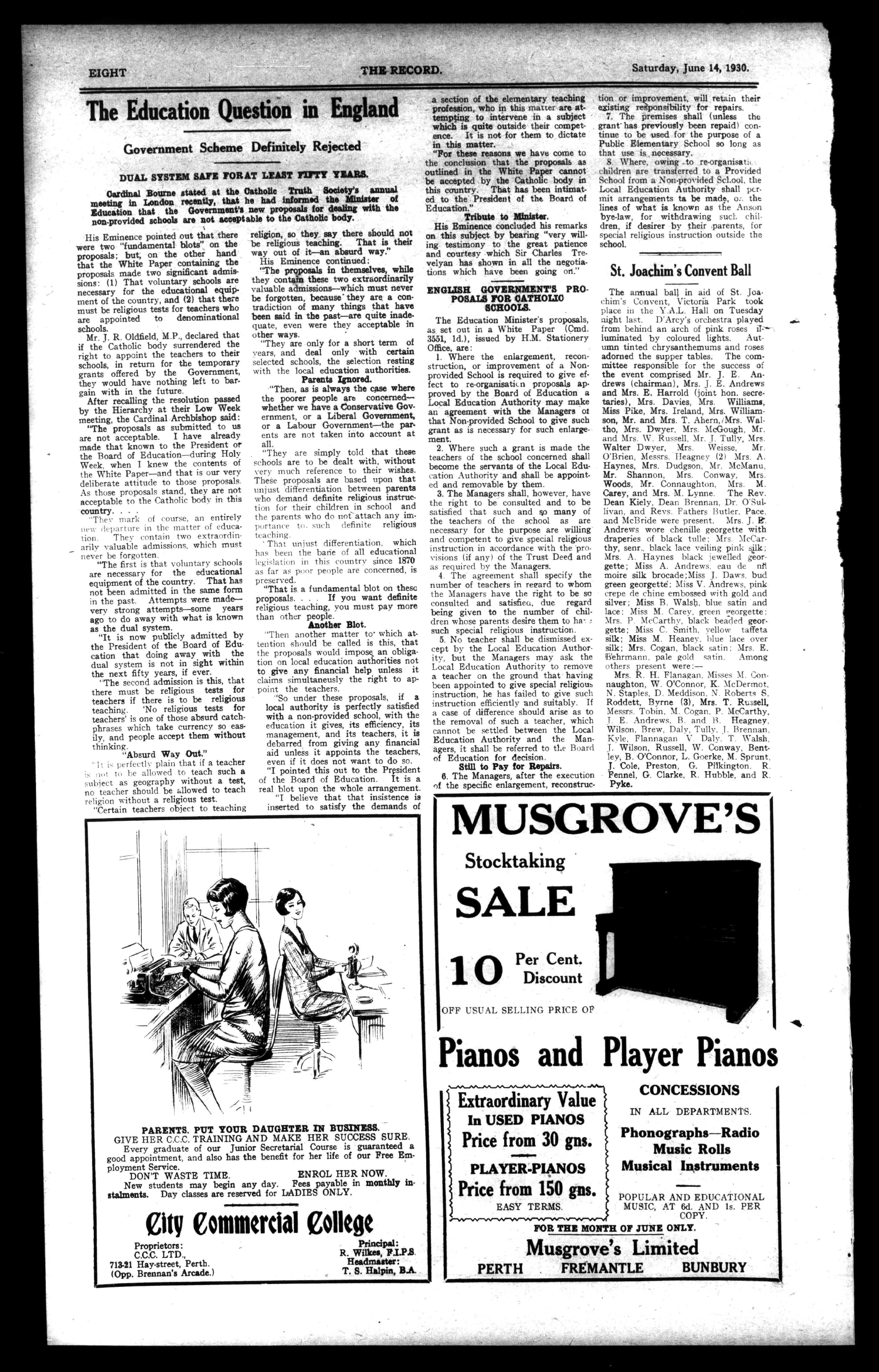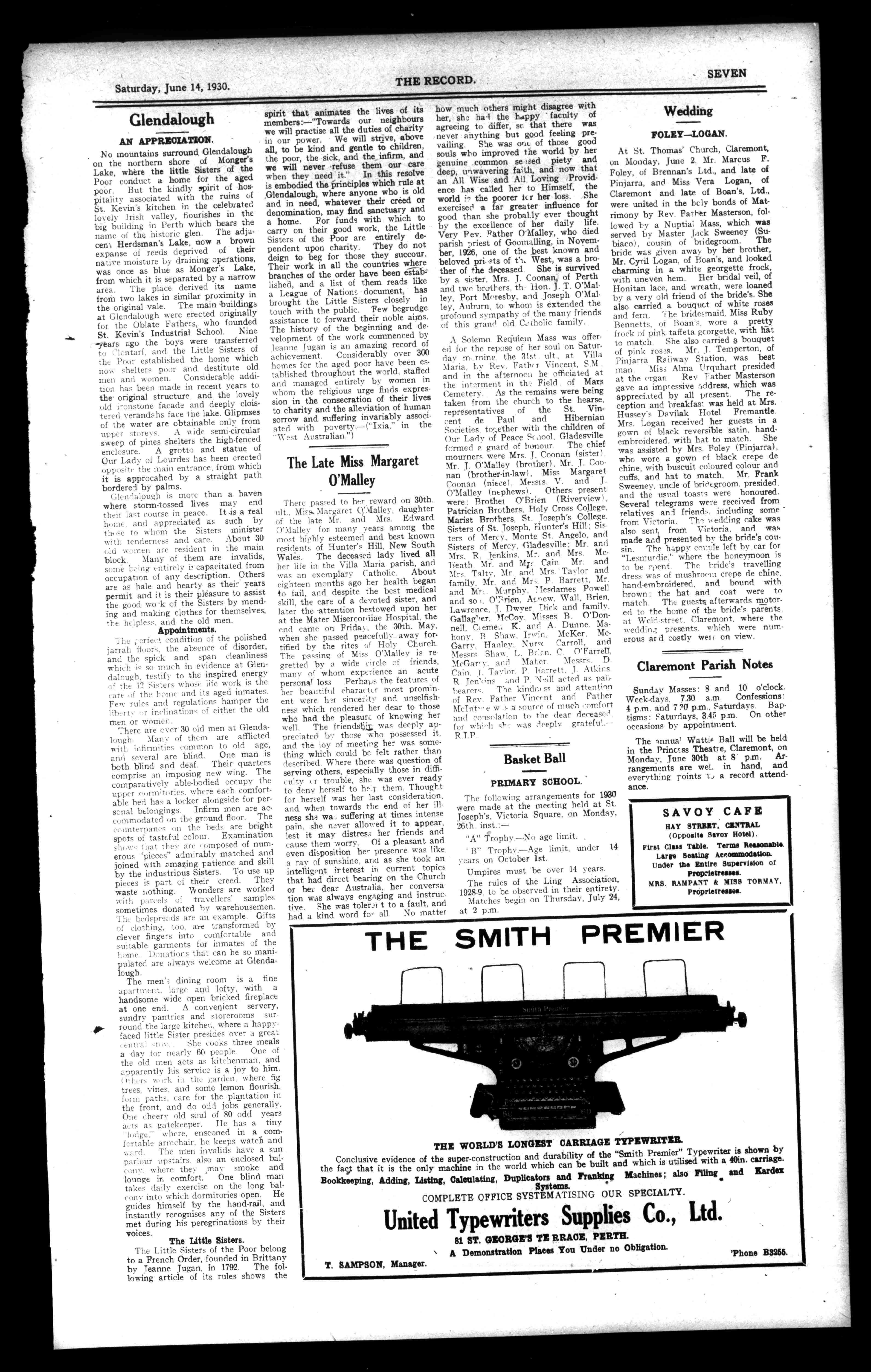 TO THEBROTHERPRINCIPAL. BREWEDUNDERSPECIALCONDITIONS. 13. PALE ALE ASKFORGOLDLABEL. BREWEDANDBOTTLEDBYTHEEMUBREWERYLTDPERTH BOWRA O'DEAUndertakers GENERALFUNERALFURNISHERS. MOTORVEHICLES. FUNERALSCONDUCTEDINANYPARTOFTHESTATE. NotetheAddress:195PIERSTREET,PERTH. 'Phone,B4308;Private'Phones:B2938andB3376. OURLADYOFMERCY'SCOLLEGE,VICTORIAPARK. CONDUCTEDBYTHESISTERSOFMERCY. LocationUnsurpassedforConvenience,Healthfulness,andBeauty. BoardingandDaySchoolforYoungLadiesandLittleGirls. ForParticularsApplytotheMotherSuperior. THECOLONIALMUTUALFIREINSURANCE COMPANYLIMITED. FIRE,MARINE,ACCIDENT,WORKERS'COMPENSATION, EMPLOYERS'LIABILITY. HAYSTACKS,GROWINGCROPS,ANDLIVESTOCK ASPECIALTY. W.L.CARTER,Manager. BARRACKSTREET,PERTH. ApplicationsInvitedforAgenciesinDistrictsWhereNotAlready Represented. IFYOUCAN'TGET SwanBitter Whereyougo GowhereyouCANgetit! AskforSWANBITTER onDratight KellyandRodoreda LateofJohnDynon'&CO. OffiNA,GLANSANDPLATEDWARE=PORTIERE OTLEYPLACE,OFFMURRAY-STREET(RearofSavoyHotel) Convents,Colleges,Institutions,andSchoolsSpeciallyCateredfor. PRICELISTSANDCATALOGUEONAPPLICATION.'PhoneB5851 J.HealyTailorand-Tel*00 -Men'sFurnisher 32PIERSTREET - PERTH PrintedandPublishedfortheRomanCatholicArchbishopofPerth,byTHOMASSLATTERY,450Hay-street,l-erth