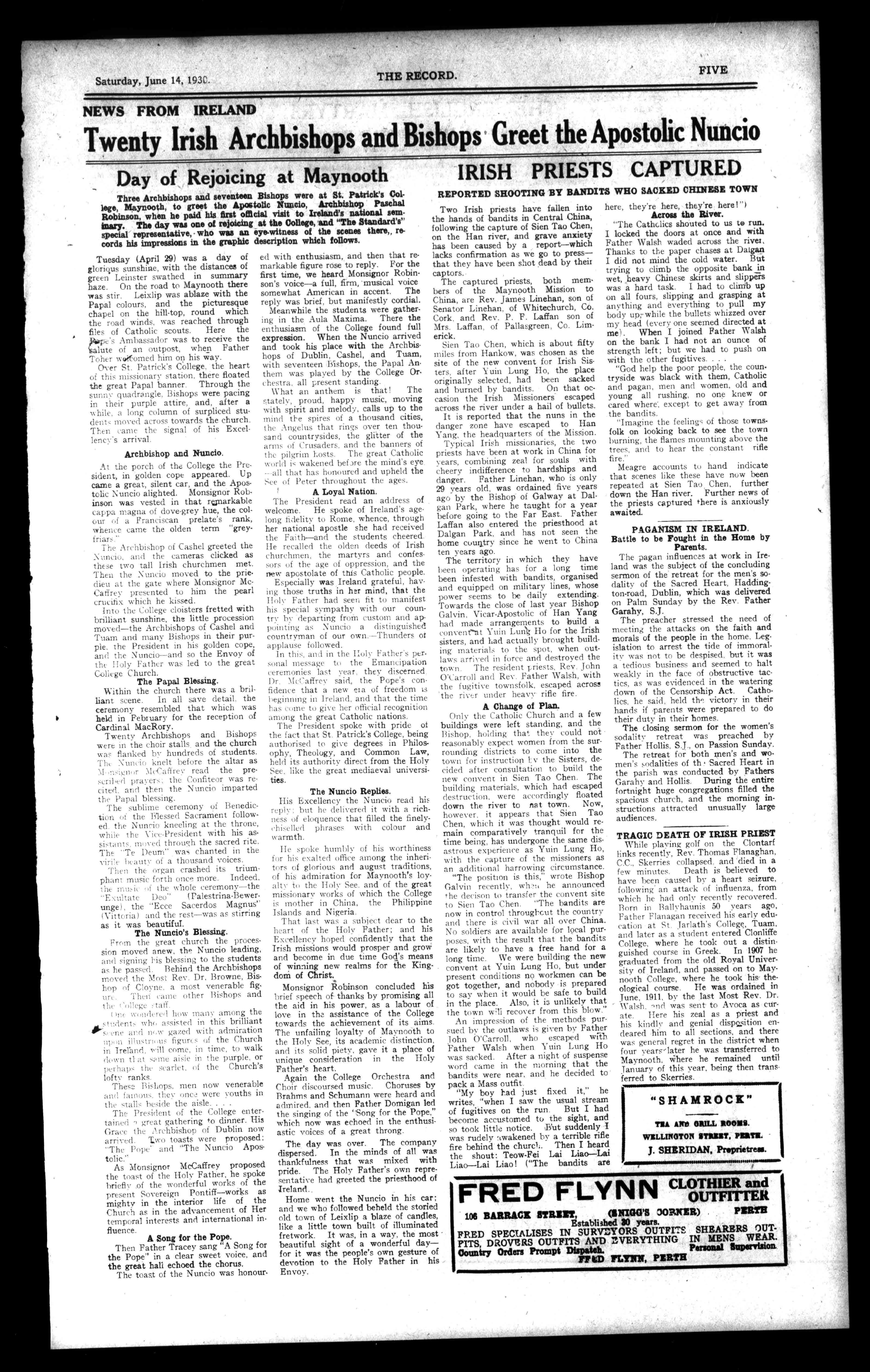 Rome.-Chaoticconditionscontinue inpartsofChinaastelegramsfrom Shanghaiannouncethiscaptureofthree missionariesandpossiblemurderof twomore.Thethreecapturedof whomonehasbeenreleased,areSpanishJesuits.Thetworeportedkilled areIrishpriestsoftheSaintColumbanSociety.ThecaptureandpossibledeathofFatherPatrickLaffan andFatherJamesLinehan,ofShientoochenintheVicariateApostolicofHanyang,HupehProvince'wasannounced onApril30.HisLordshipBishop EdwardGalvin,VicarApostolicof Hanyang,hasstartednegotiationsfor thereleaseofthepriests,onthesuppositionthattheyarestillalive.Both belongtotheIrishMissionariesofSt. Columban,3memberofwhichsociety, FatherTimothyLeonard,waskilled bybanditsJuly1/,1929.